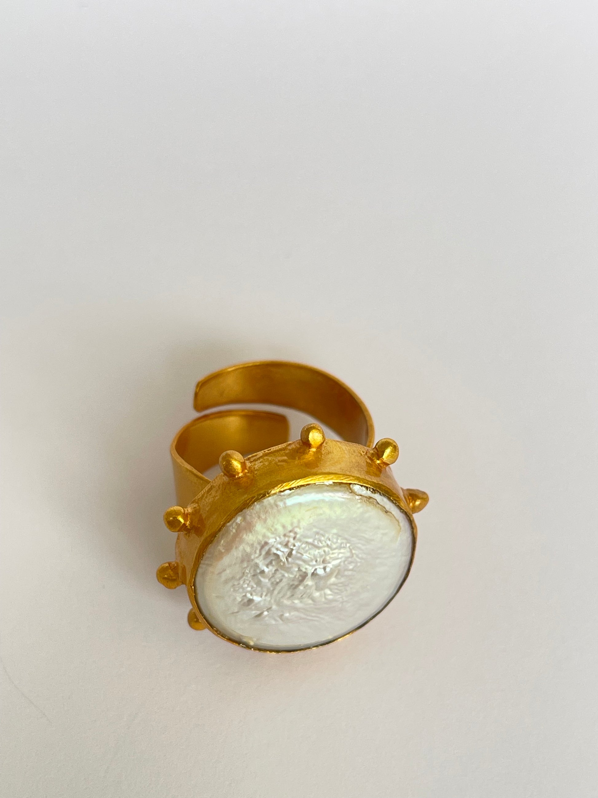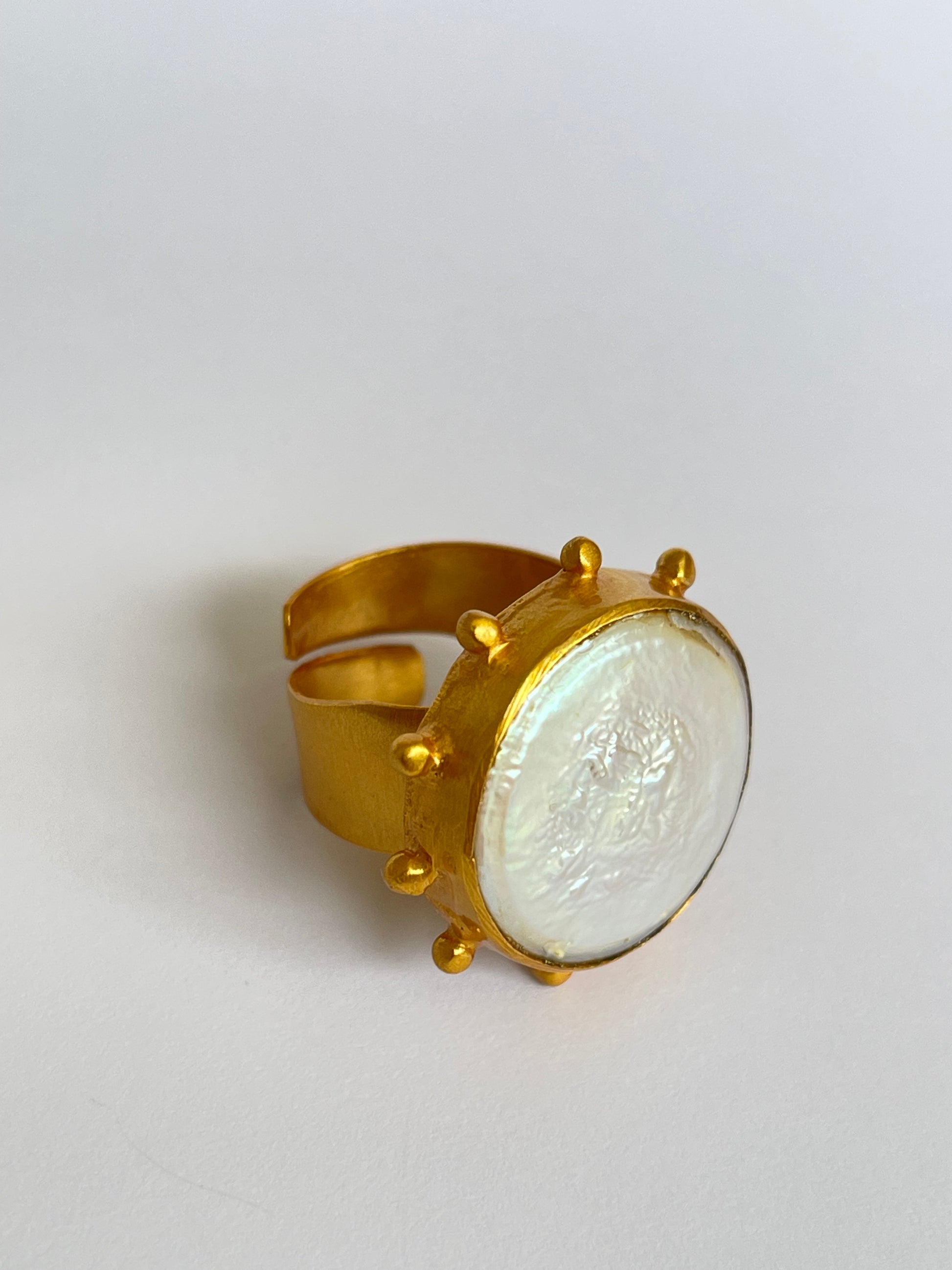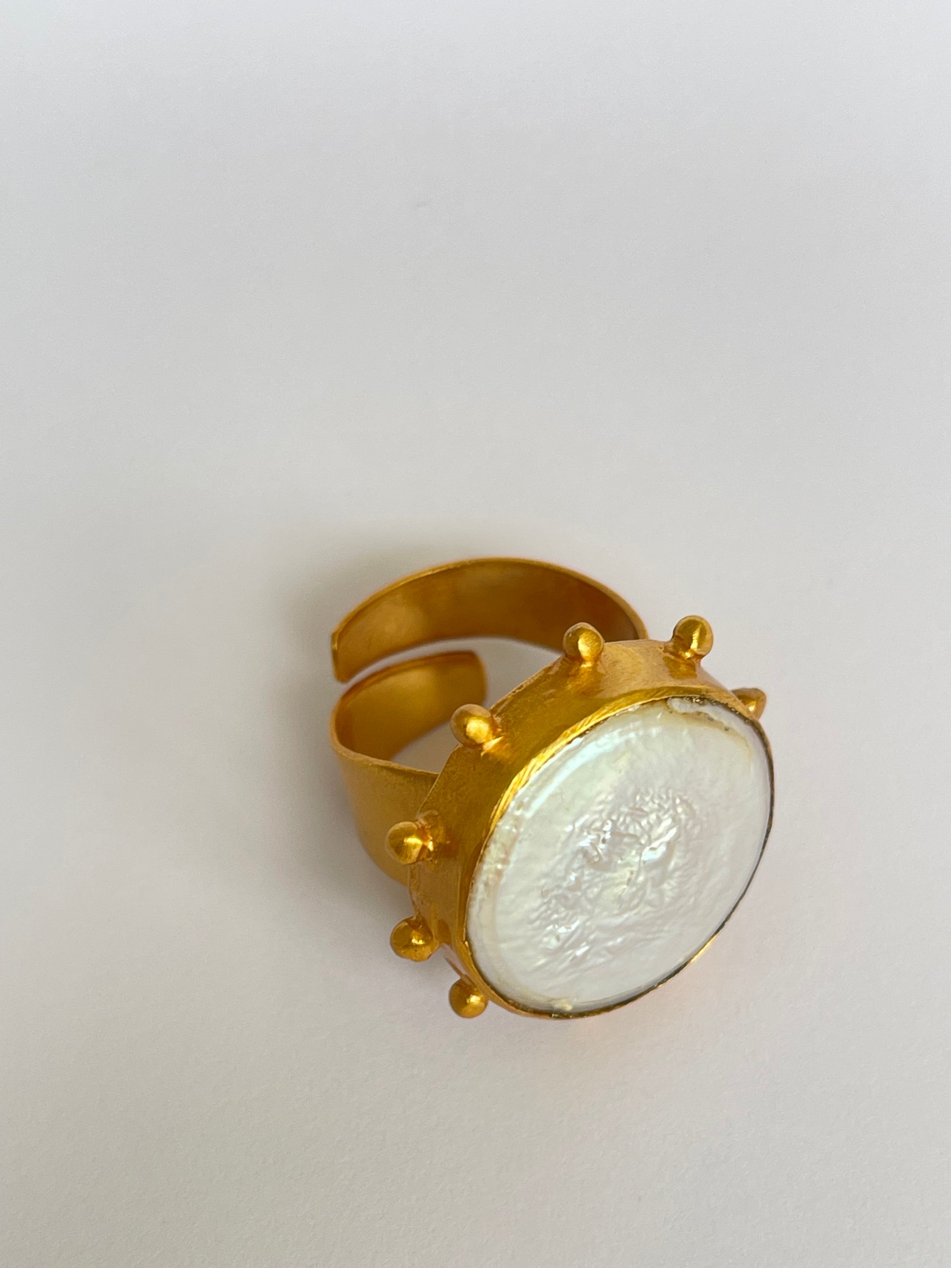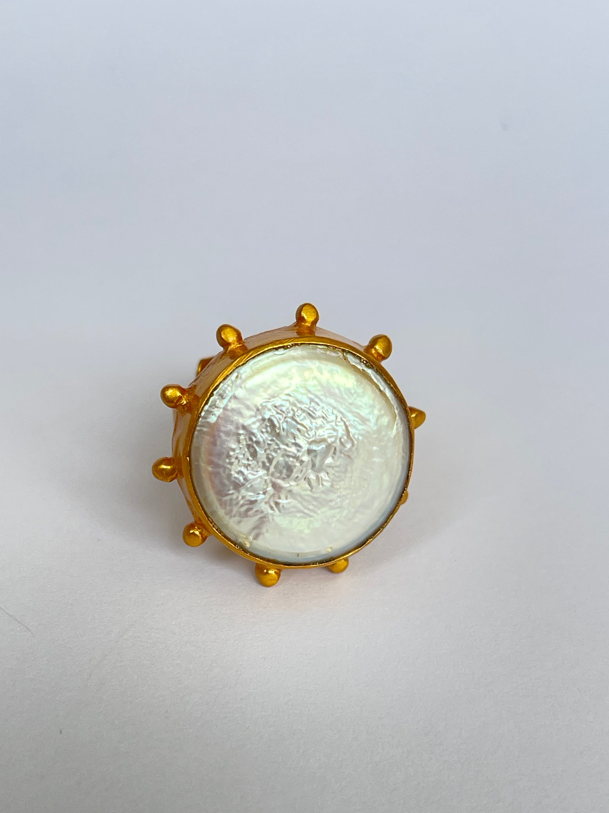 Crafted with a luminous mother of pearl gemstone, this ring radiates timeless elegance. The round, iridescent gem is framed in an 18k gold-plated brass sunburst setting, creating a bold yet refined design that captures light from every angle.