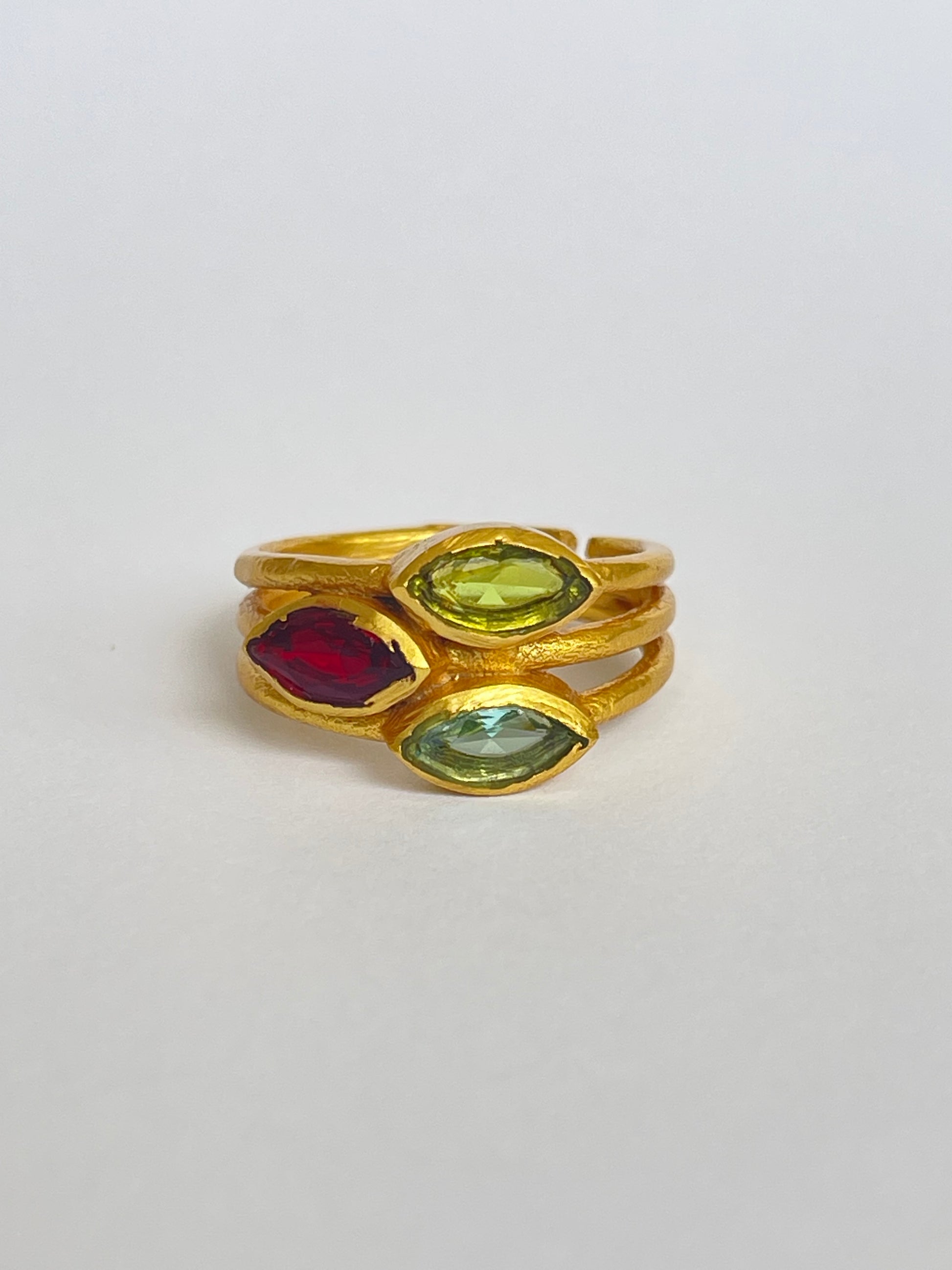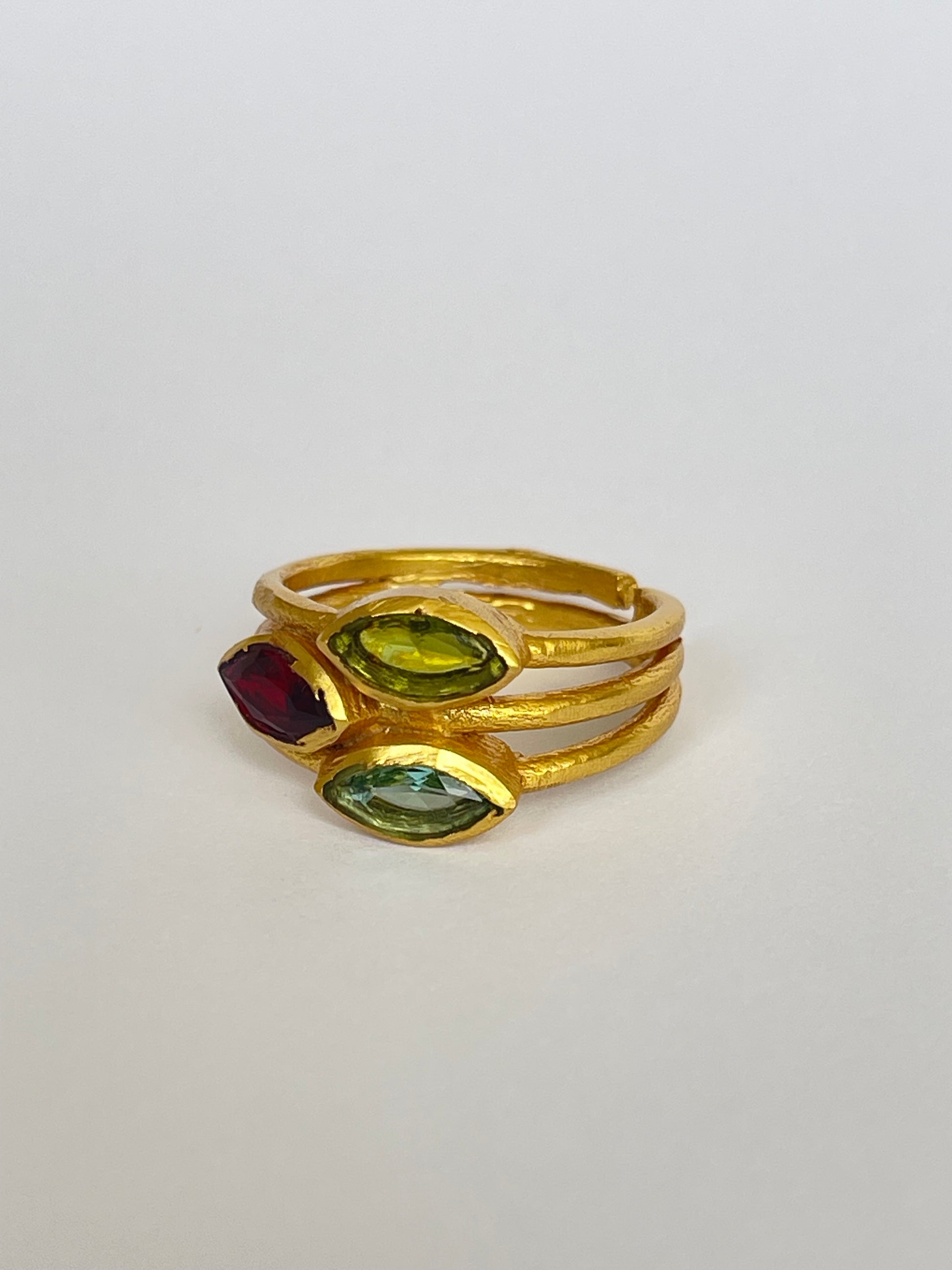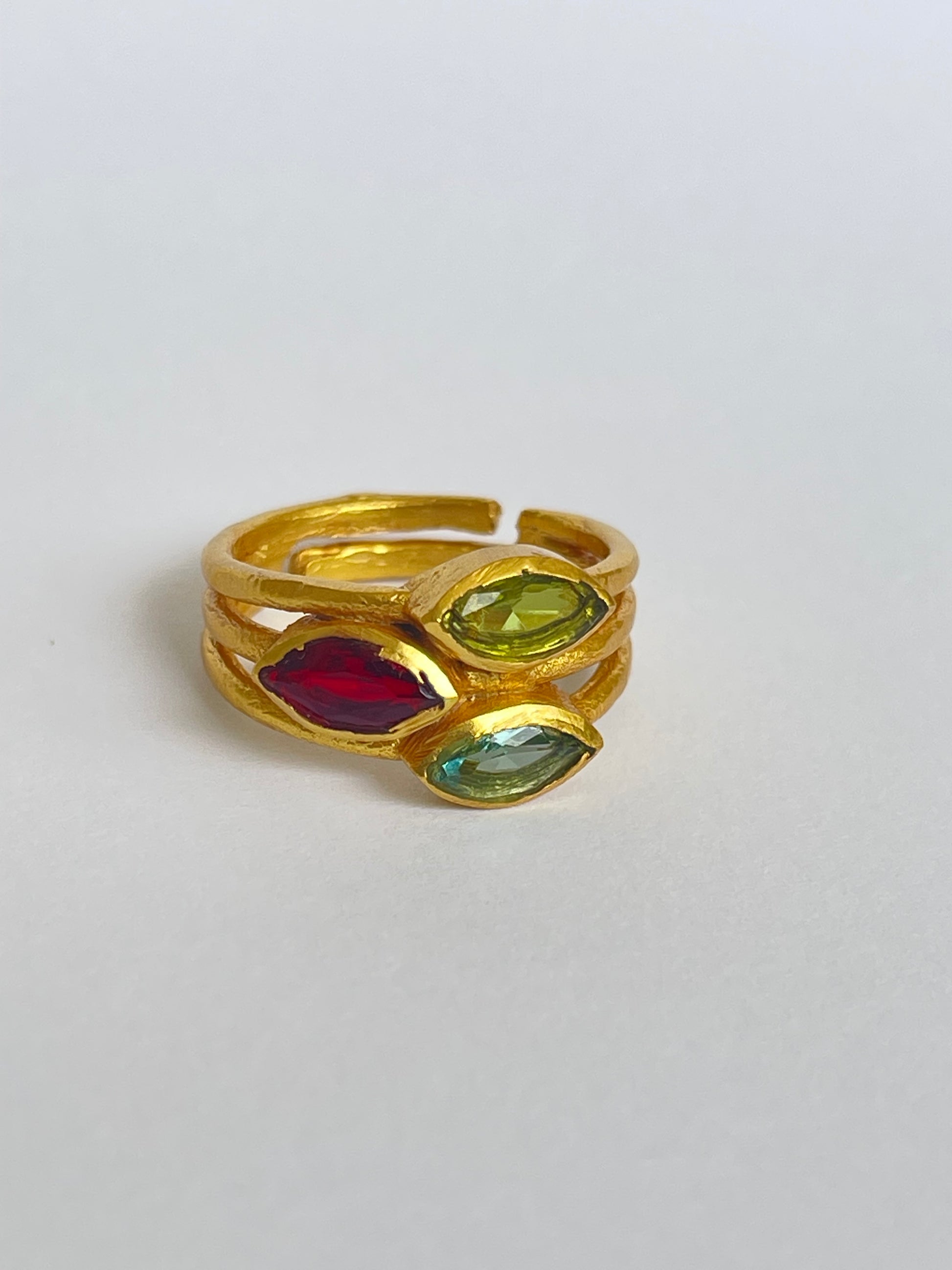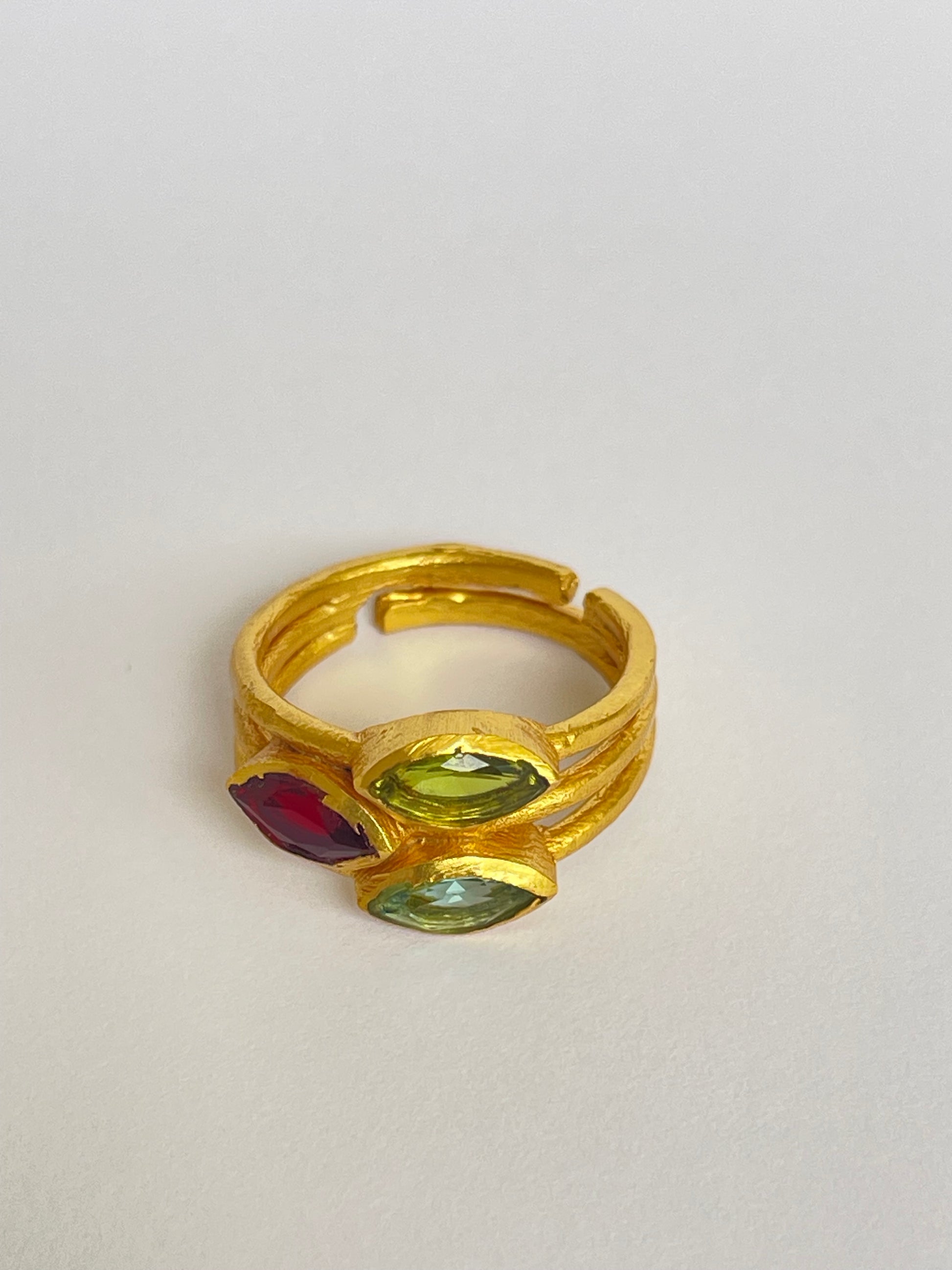The Mitsuba Ring features three faceted marquise-cut gemstones gracefully stacked on a golden band. The layered design makes it bold yet wearable, perfect for both everyday styling and special occasions. With its adjustable fit, it ensures comfort and versatility for every hand.