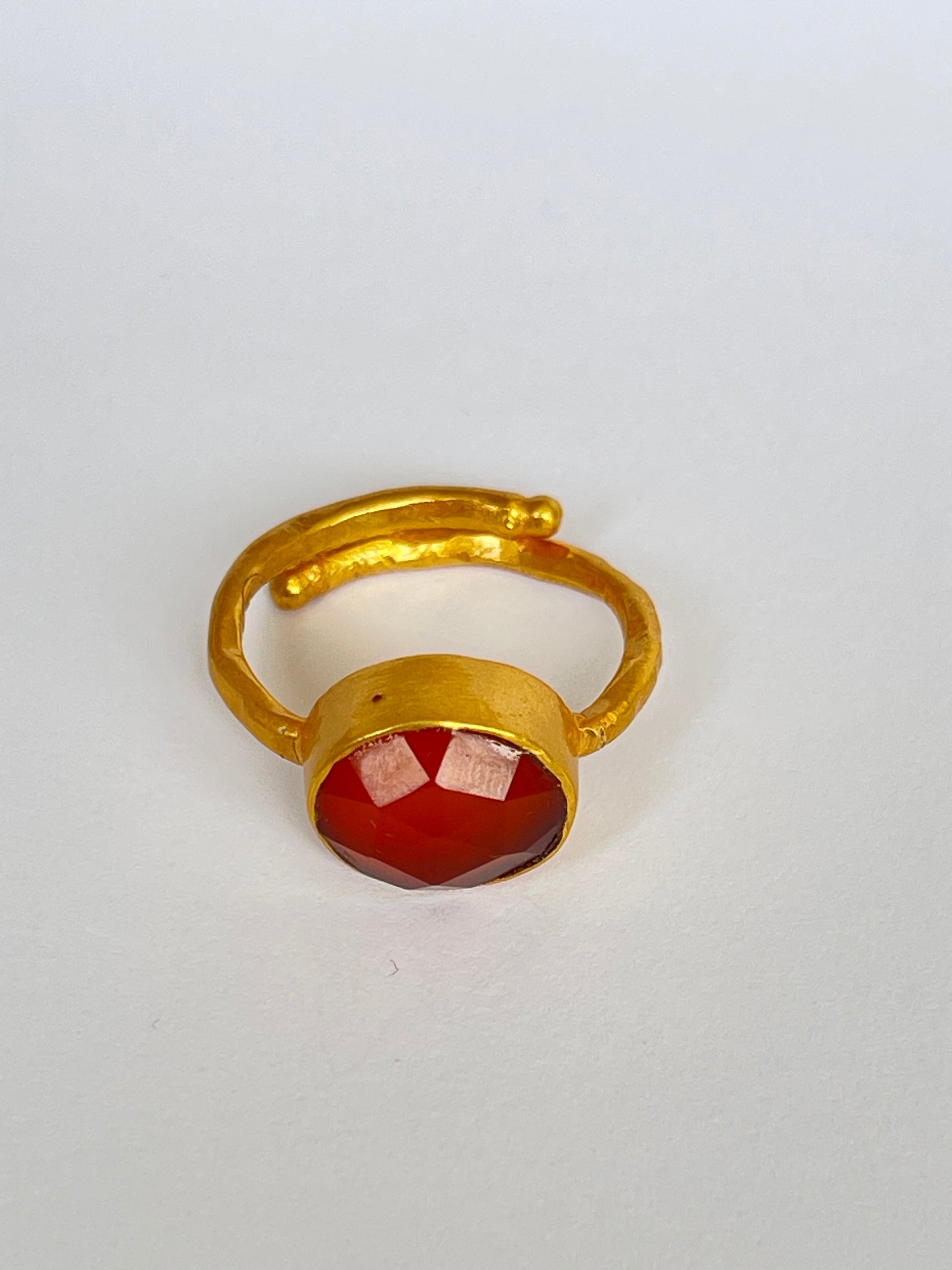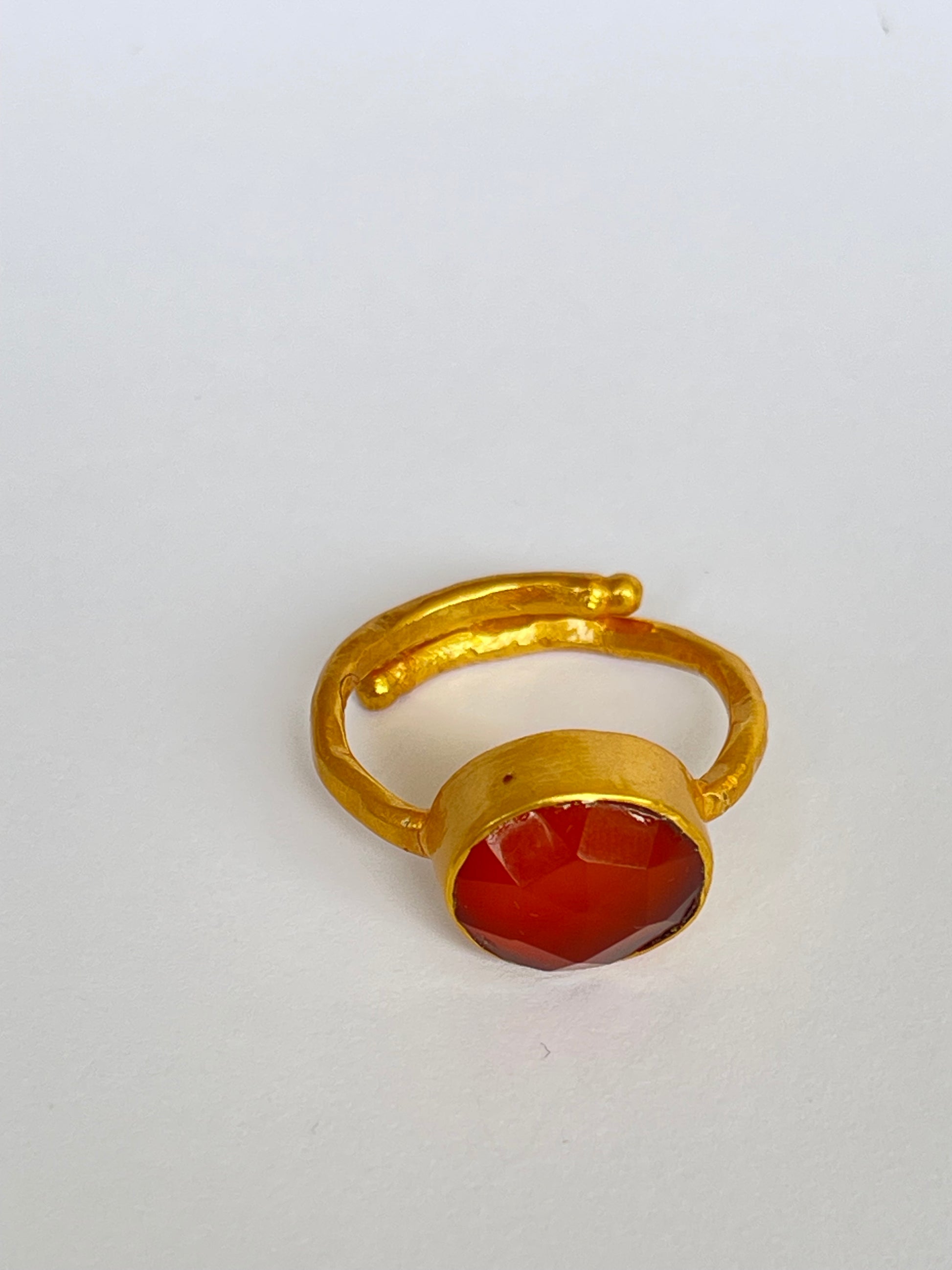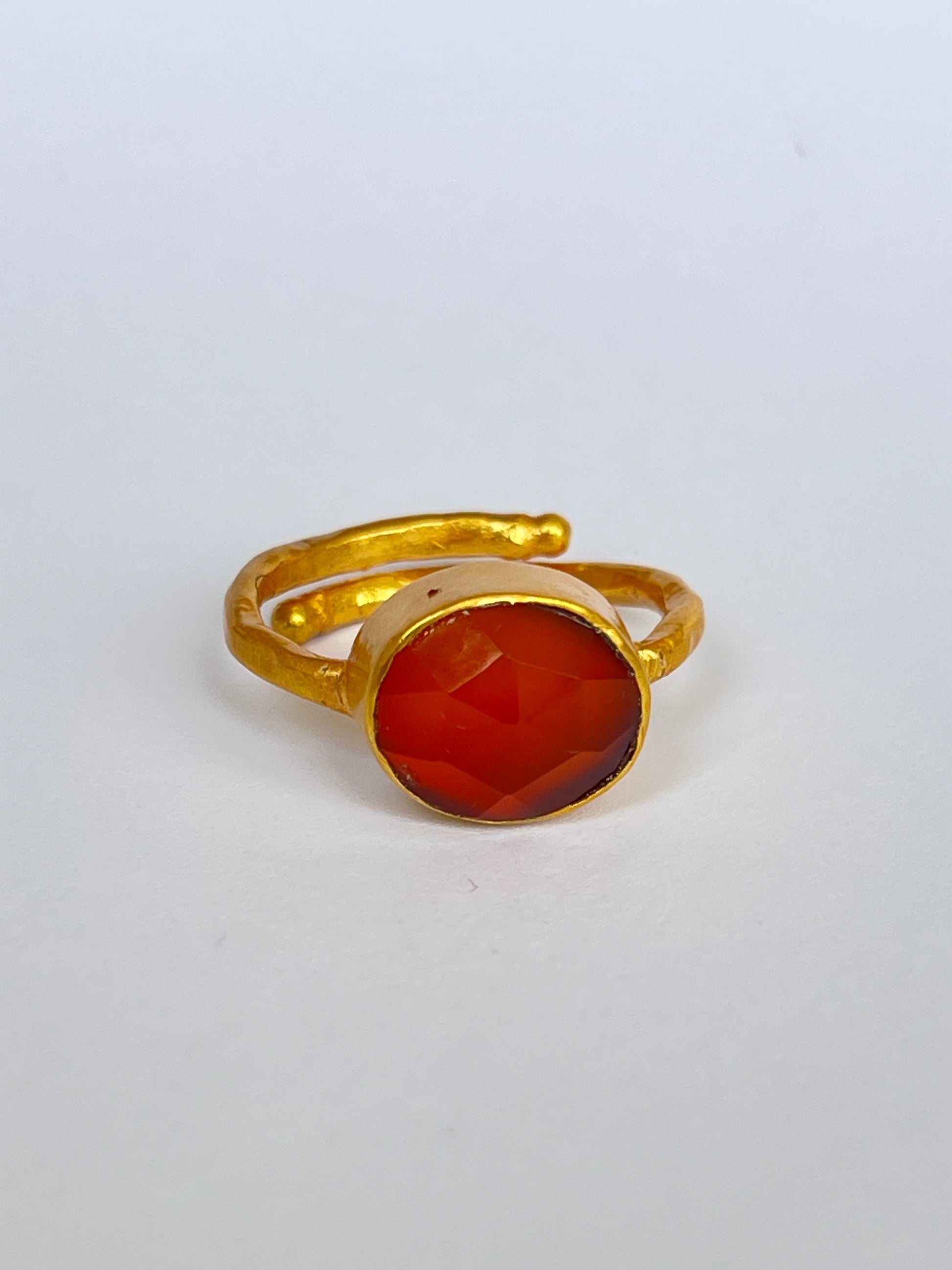 The Enseki Ring captures the fire of the earth with its rich carnelian gemstone, glowing in deep shades of red and orange. Its faceted cut reflects the light beautifully, while the warm 18k gold-plated brass setting enhances the stone’s natural vibrancy.
