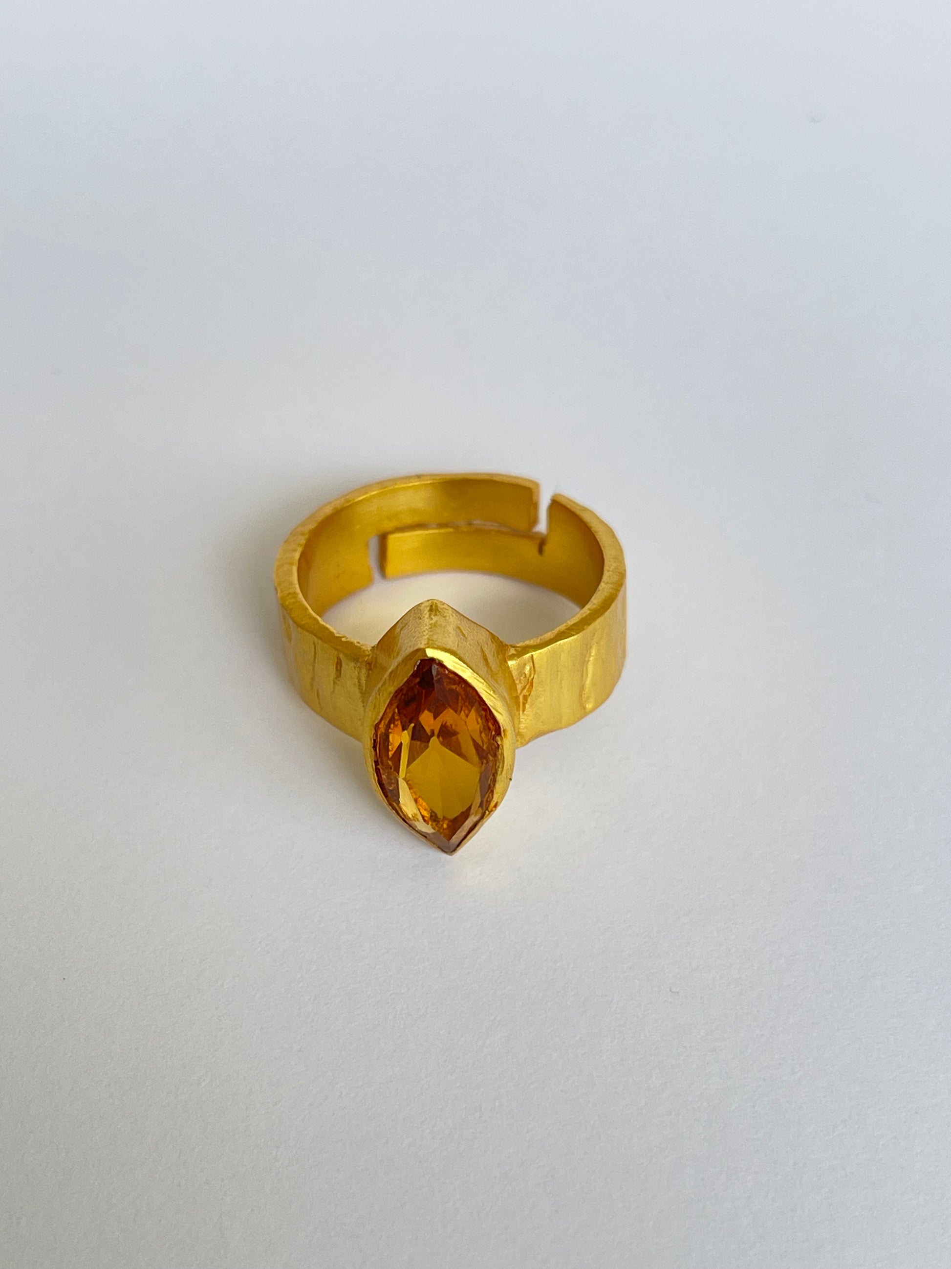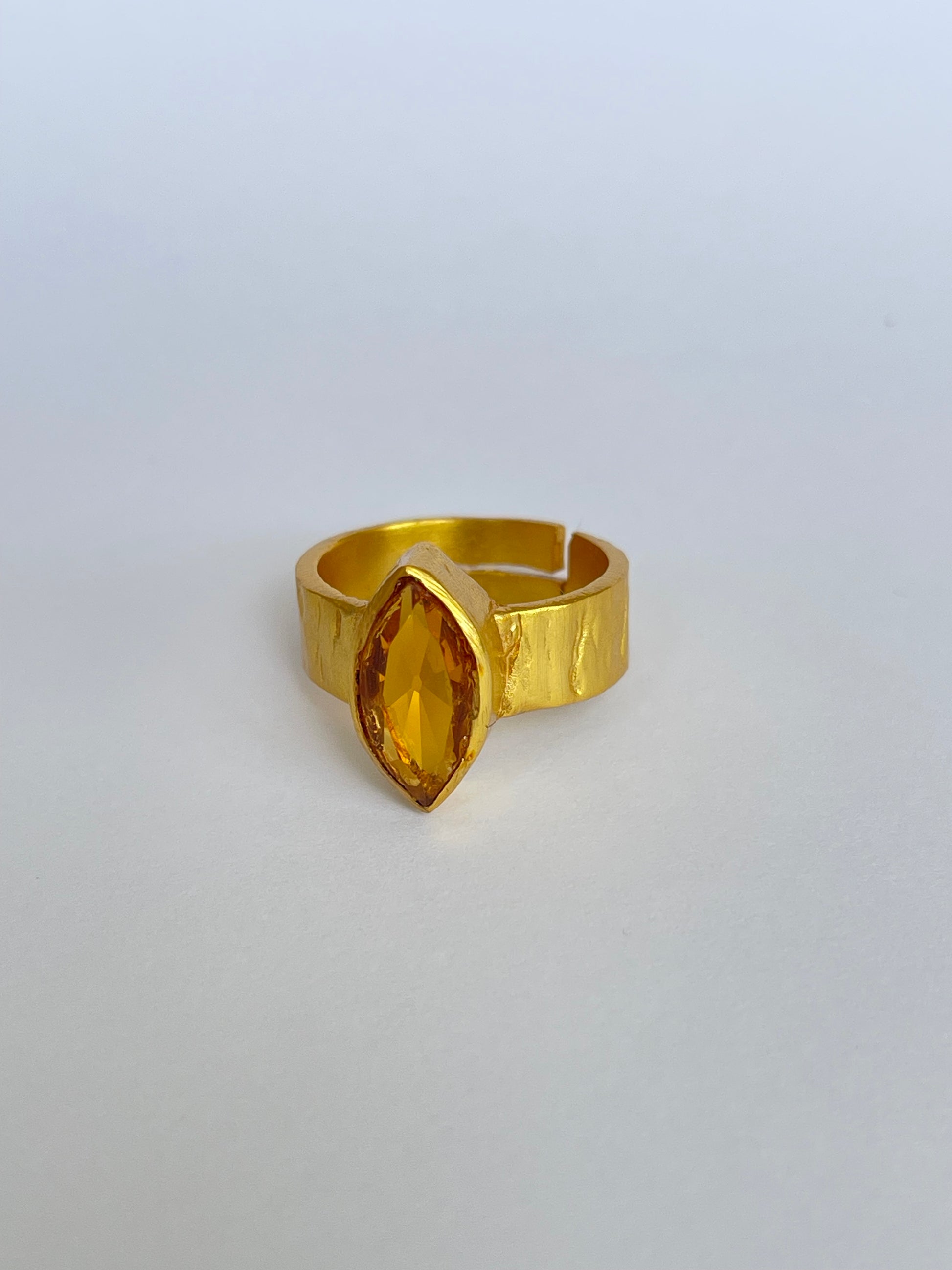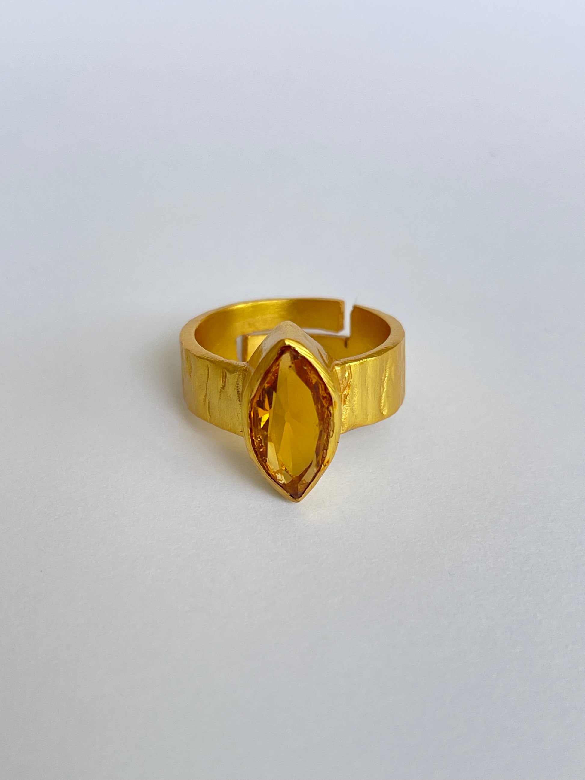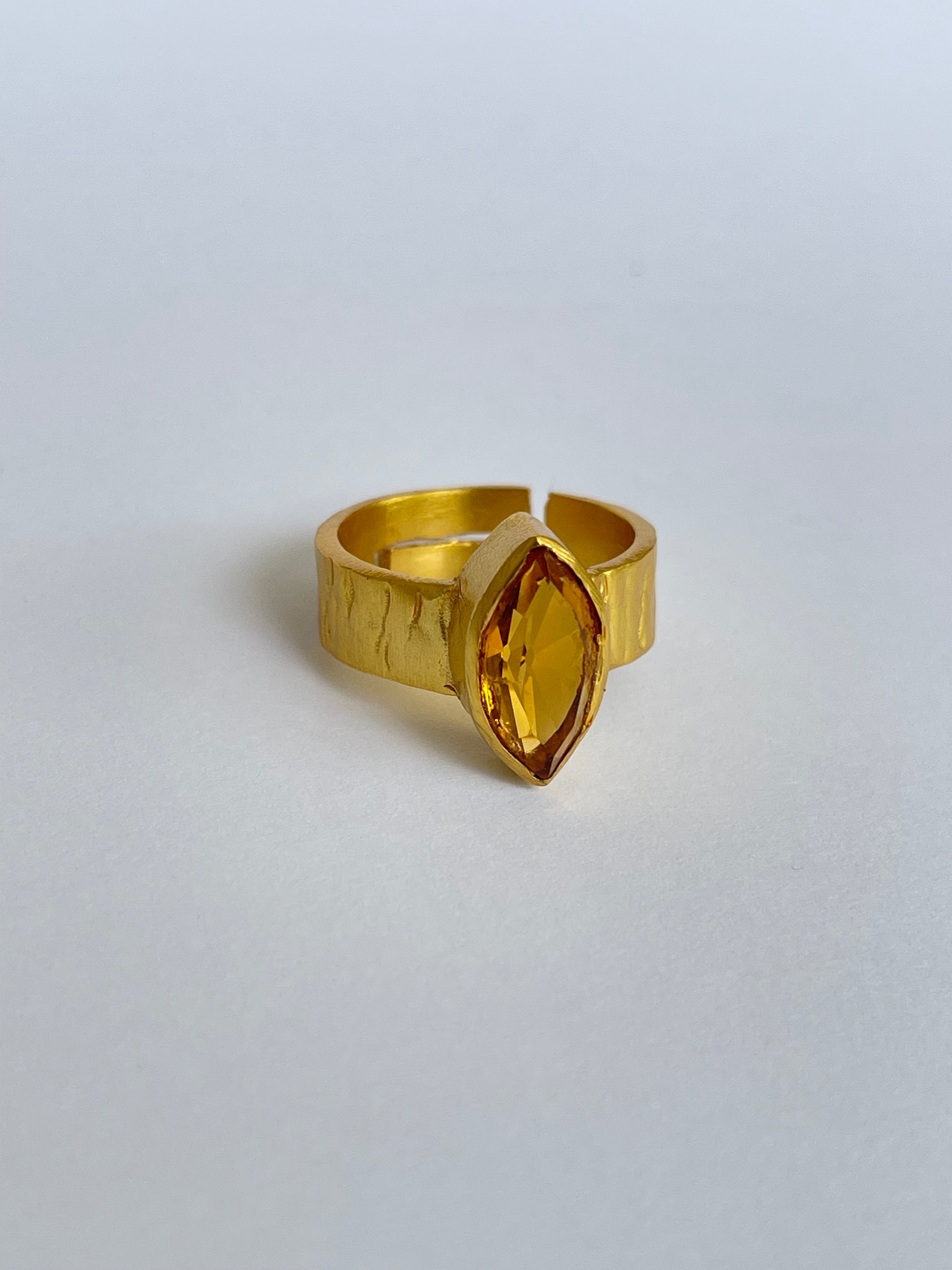 The Hinata Ring features a faceted marquise-cut gemstone set vertically on a hammered gold band. Its textured finish gives it a modern artisanal feel, while the bold silhouette makes it a standout accessory. With an adjustable fit, it’s as versatile as it is stylish.
