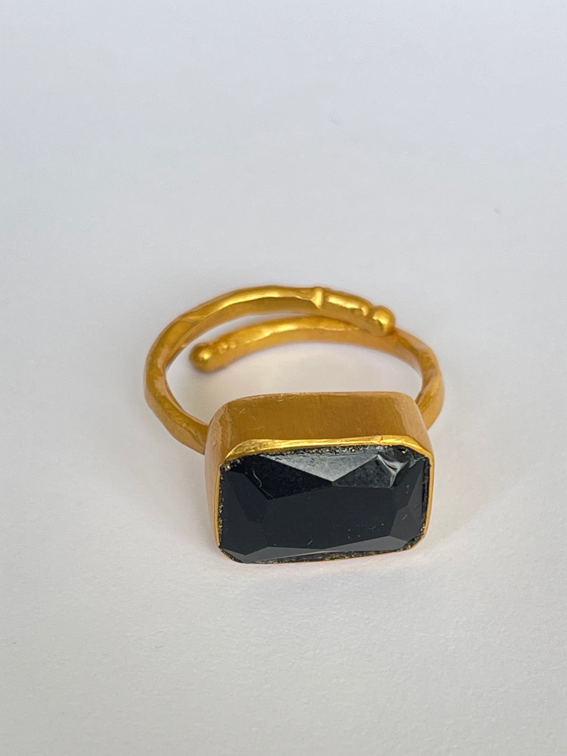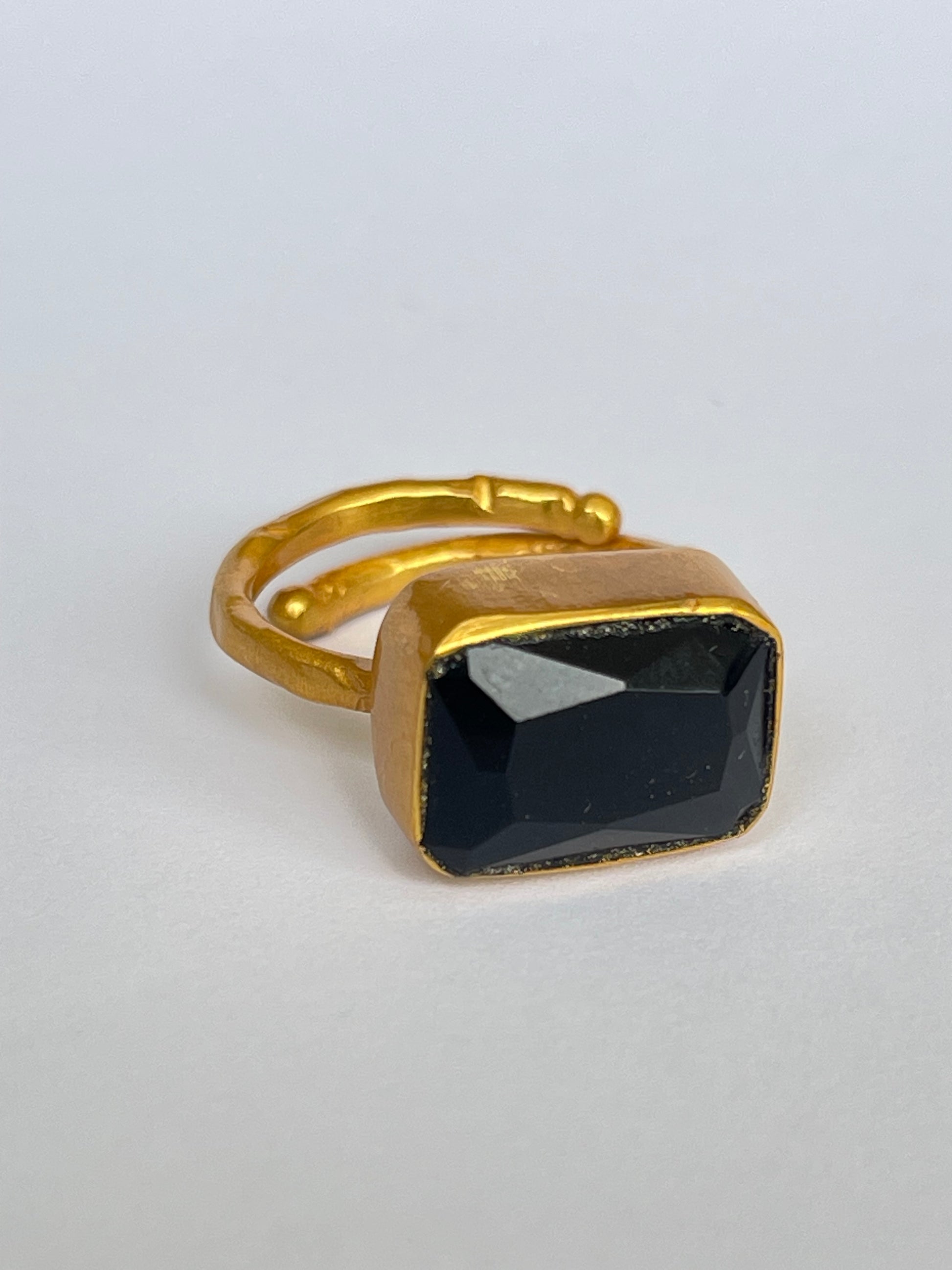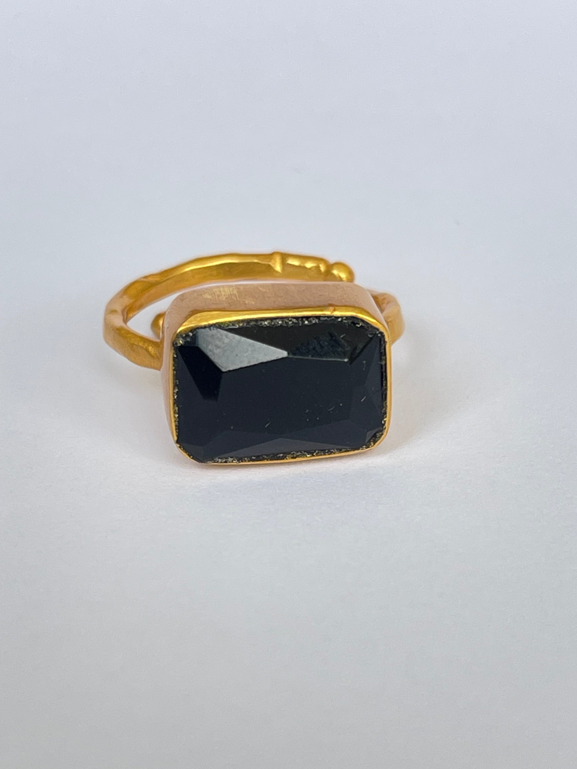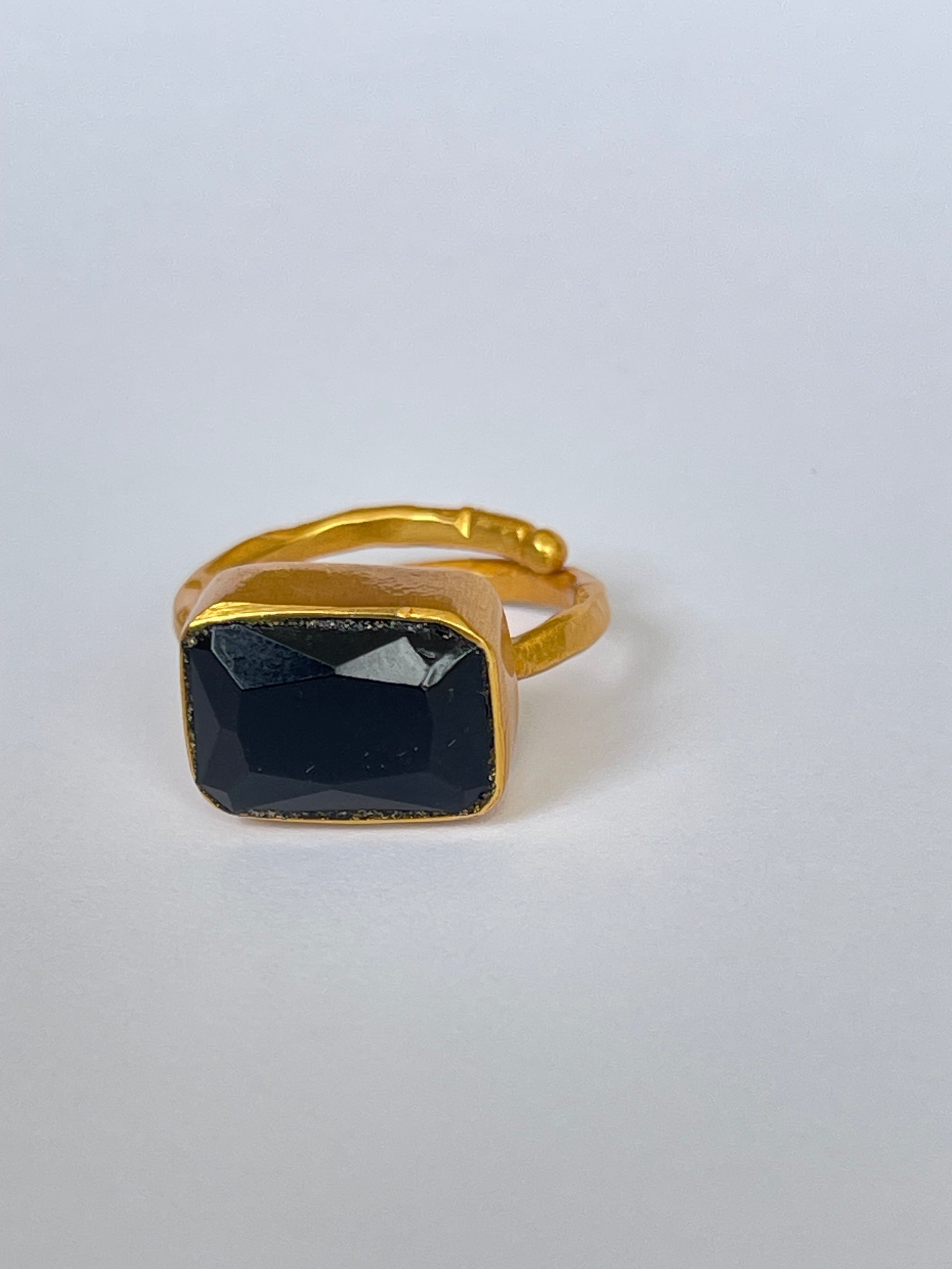 The Kage-ishi Ring embodies bold sophistication, featuring a sleek rectangular-cut black onyx gemstone set in 18k gold-plated brass. Its deep black surface exudes timeless elegance, creating a powerful statement for both minimalist and maximalist styles.