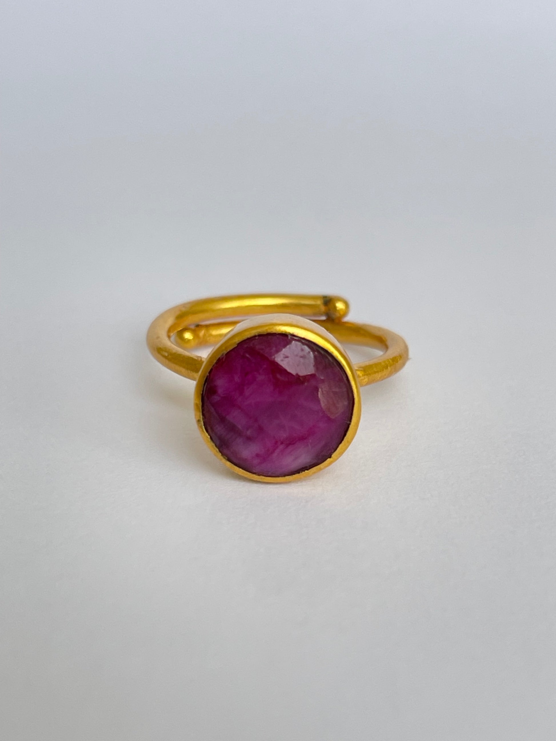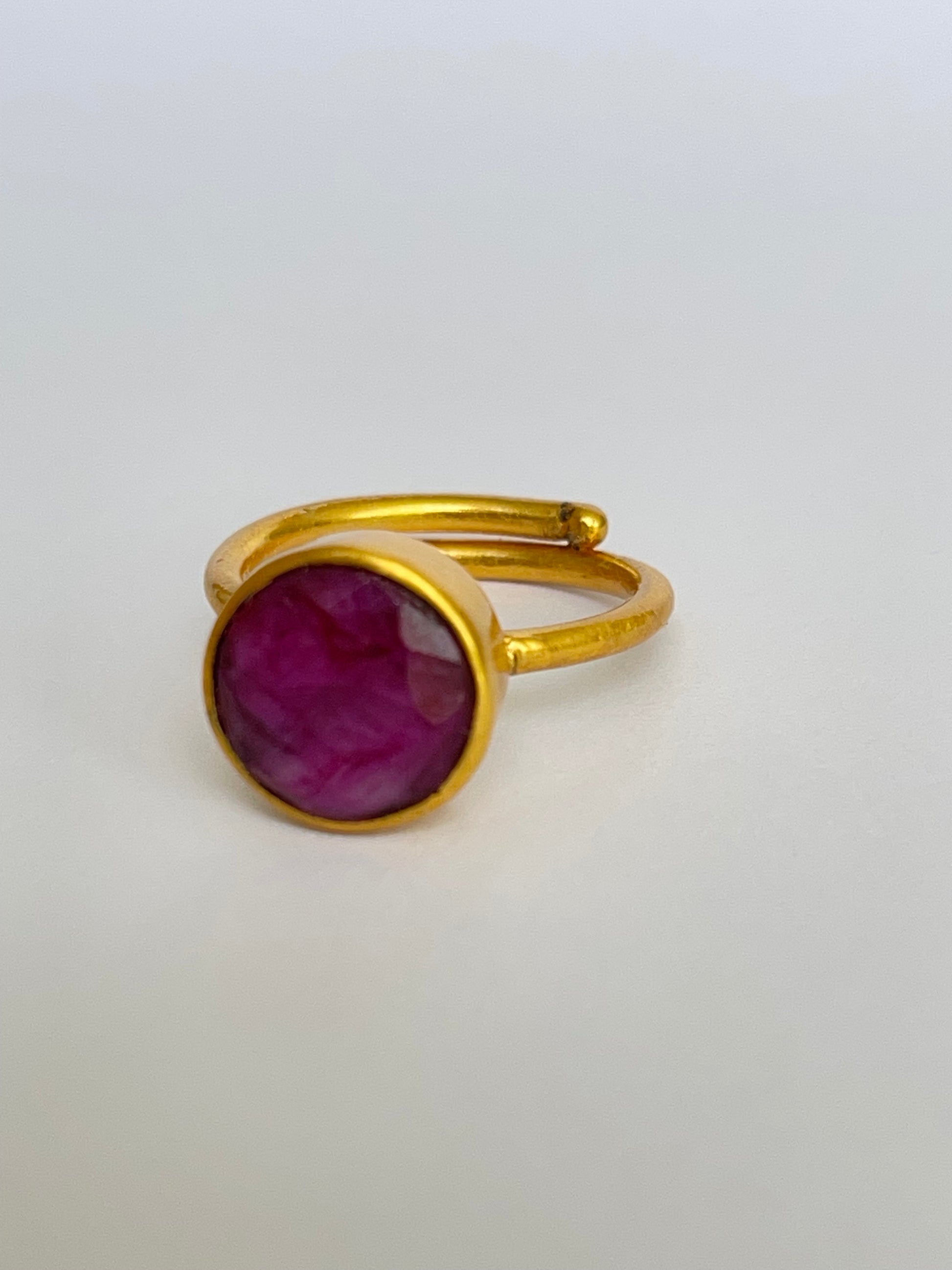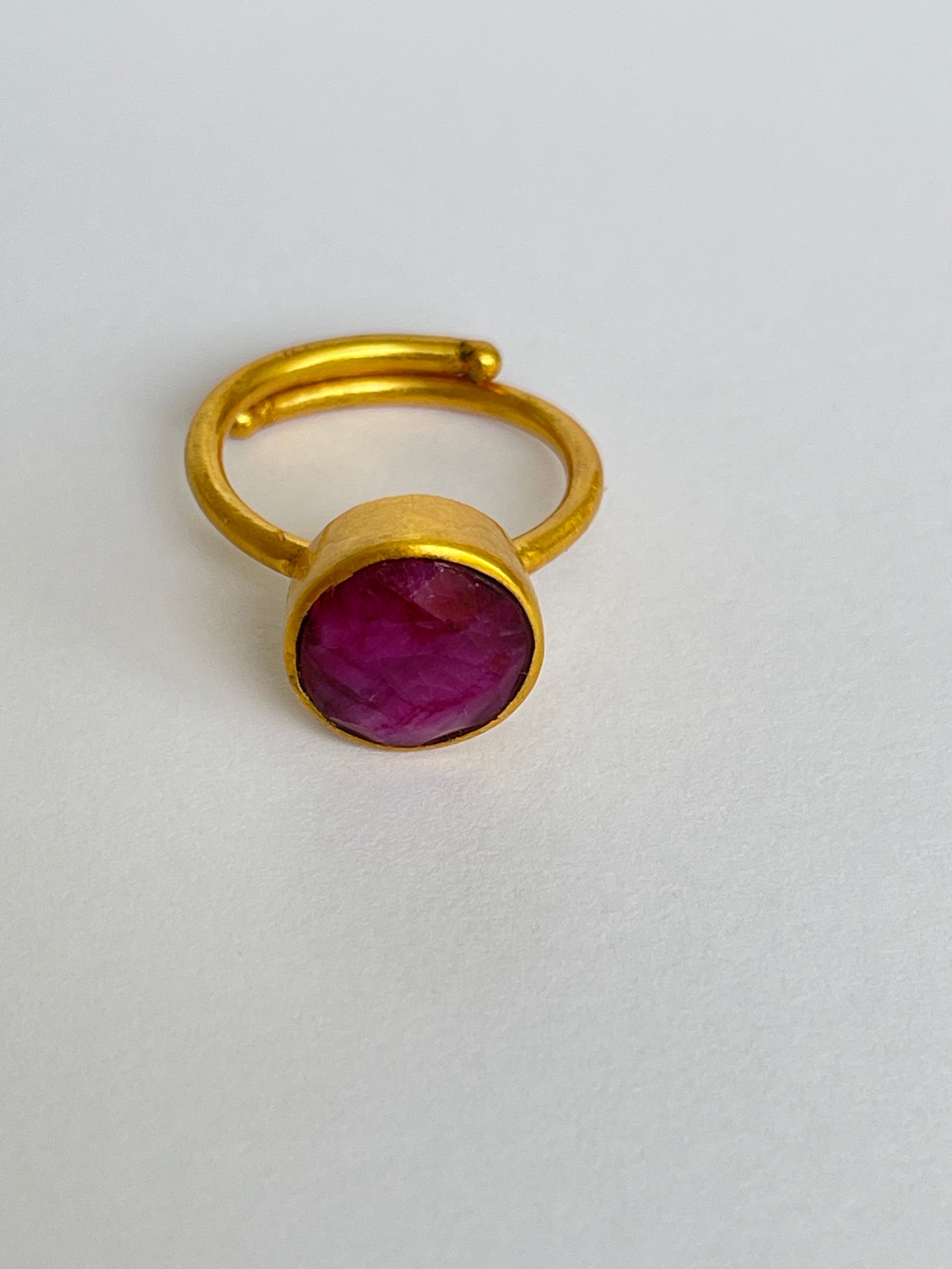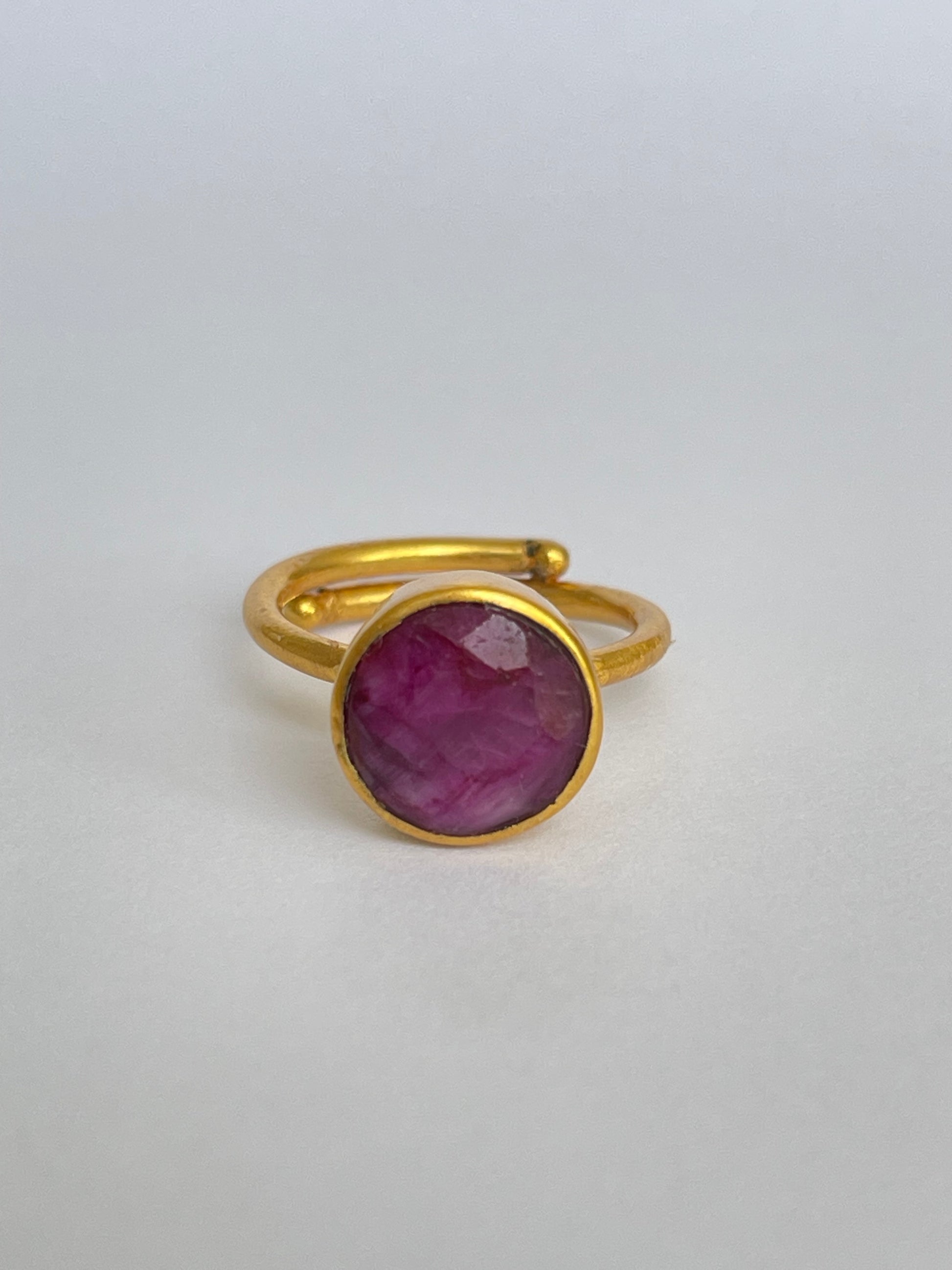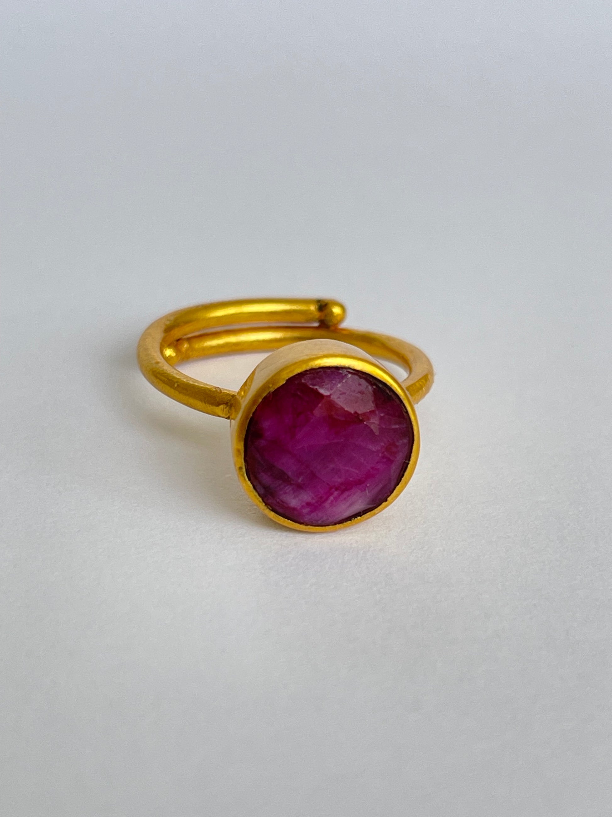 The Guren Ring burns with quiet intensity — a faceted ruby gemstone cradled in 18k gold-plated brass. Its rich crimson hue reflects passion, vitality, and courage, glowing like a secret flame against the skin.