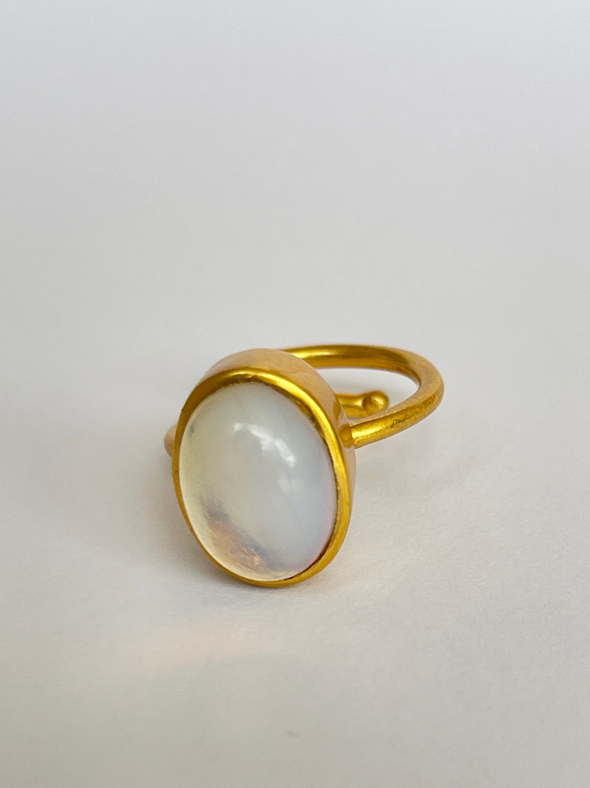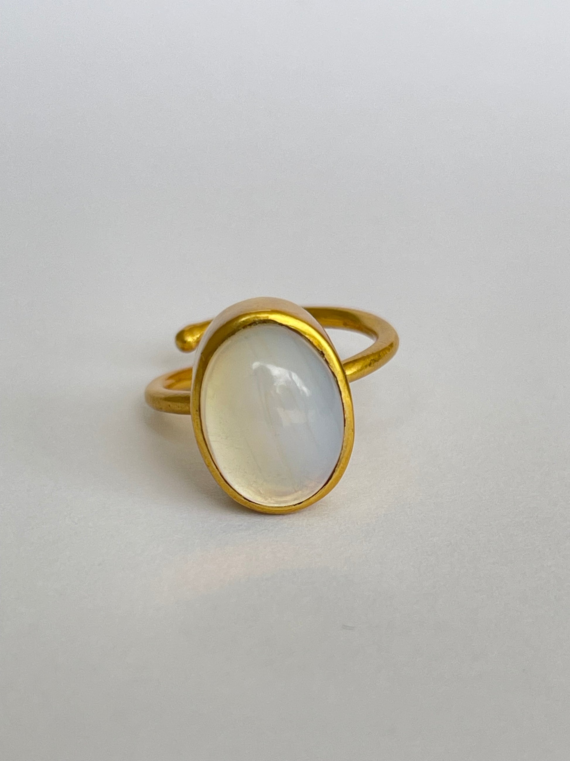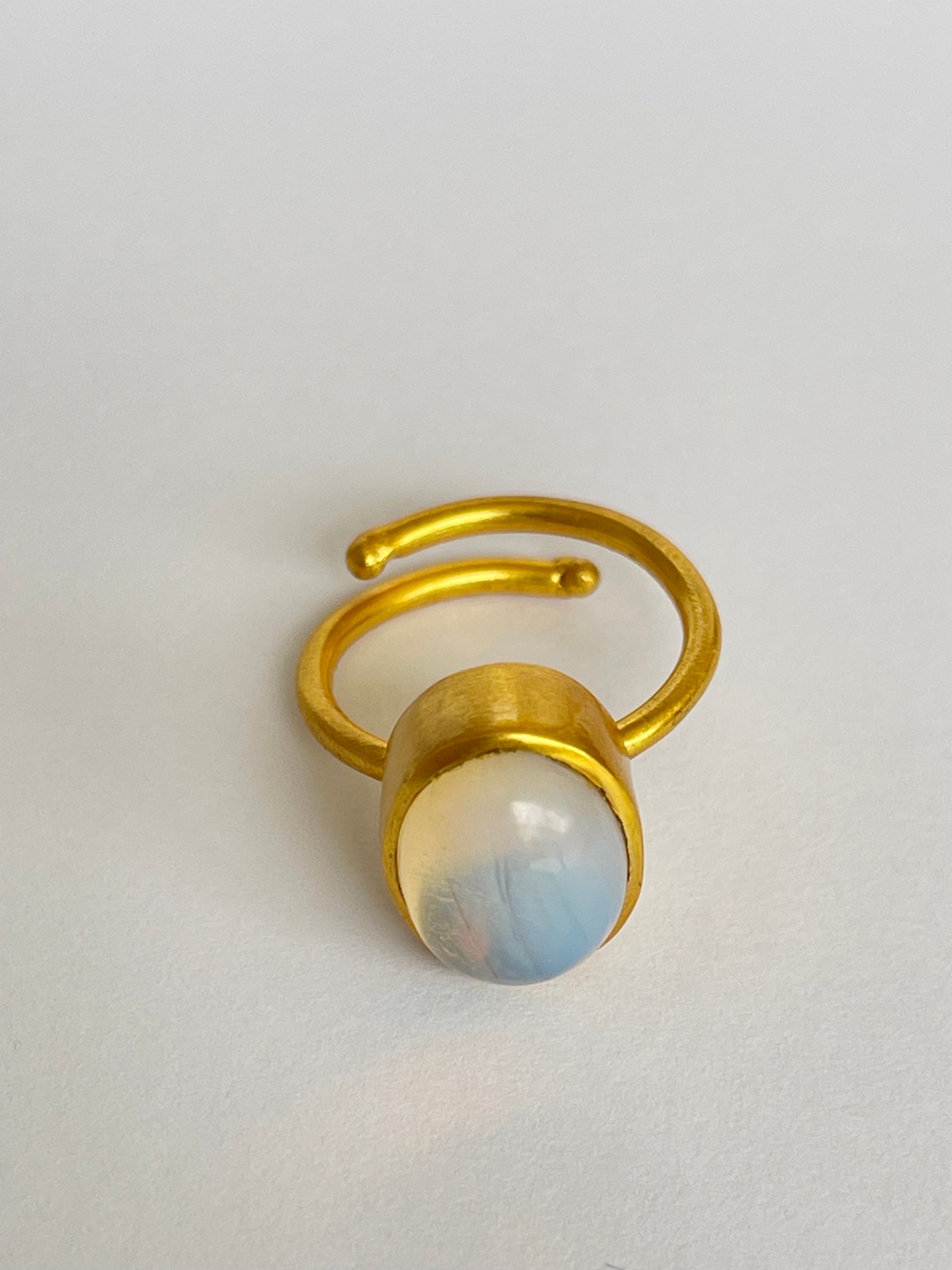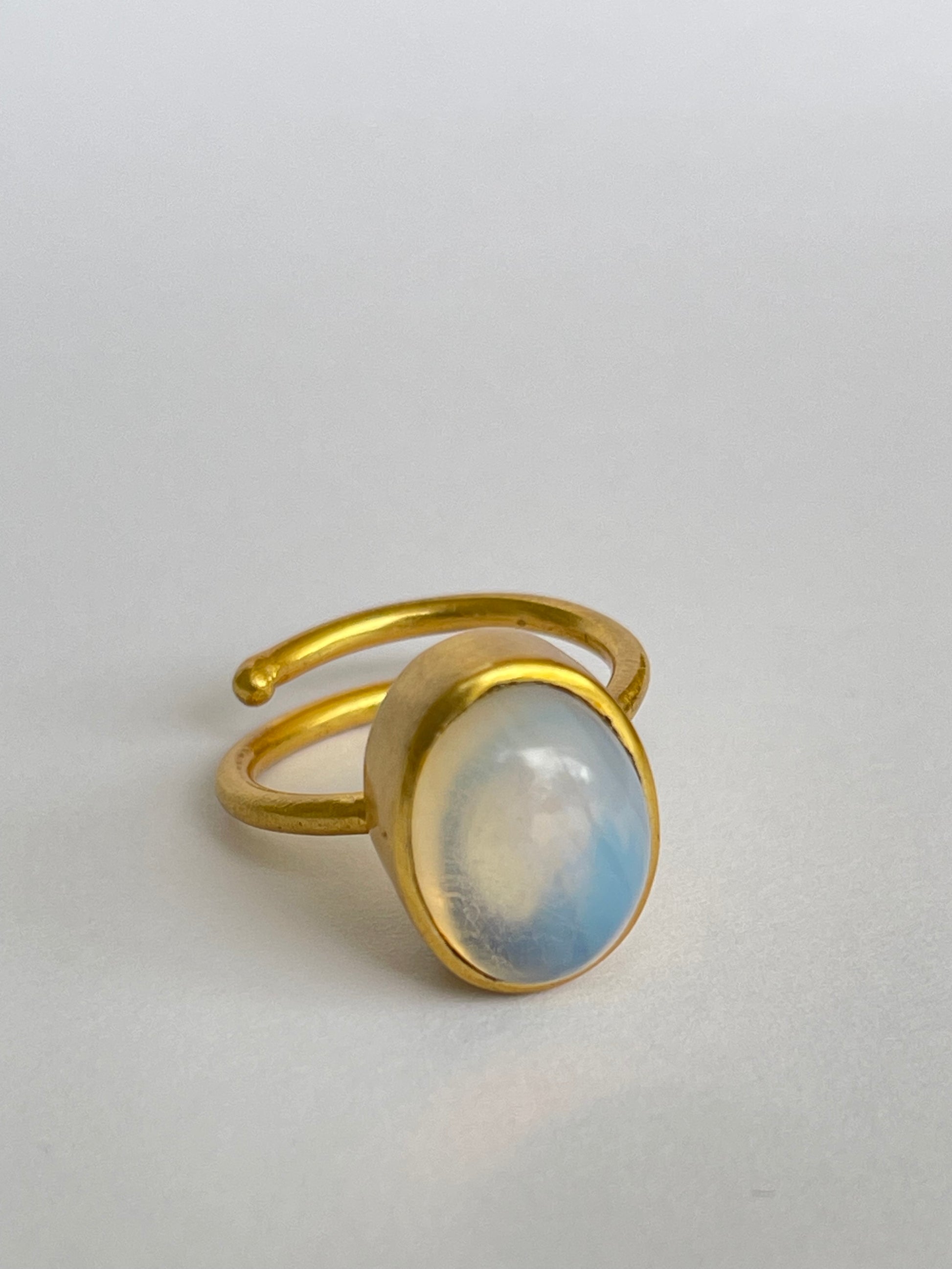 The Hakuro Ring glimmers like morning dew beneath soft light — an oval moonstone framed in radiant 18k gold-plated brass. Its gentle iridescence reveals a veil of blue and silver that shifts with every movement, echoing the rhythm of the moon.