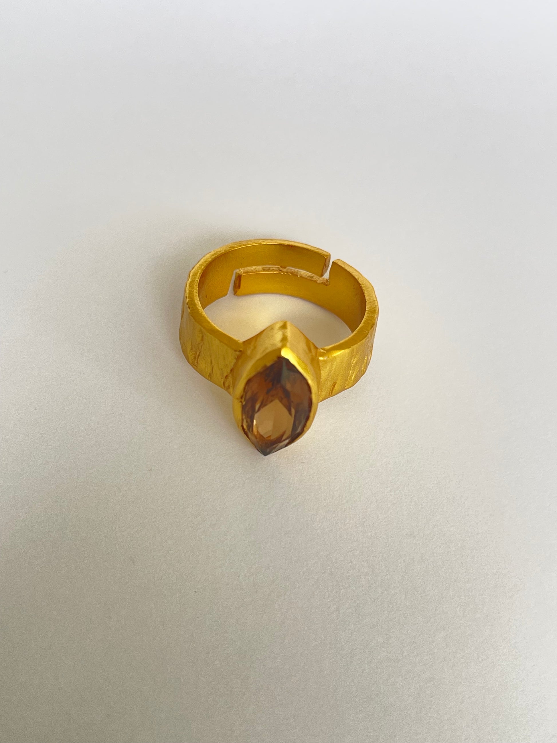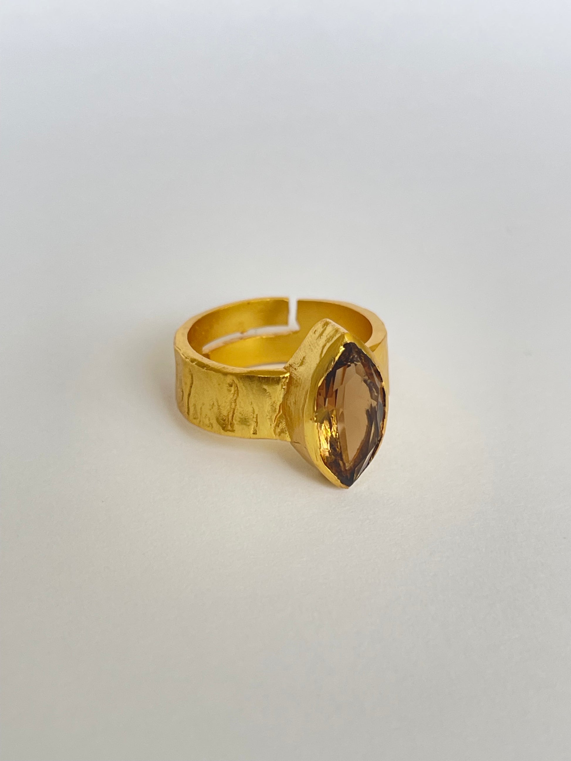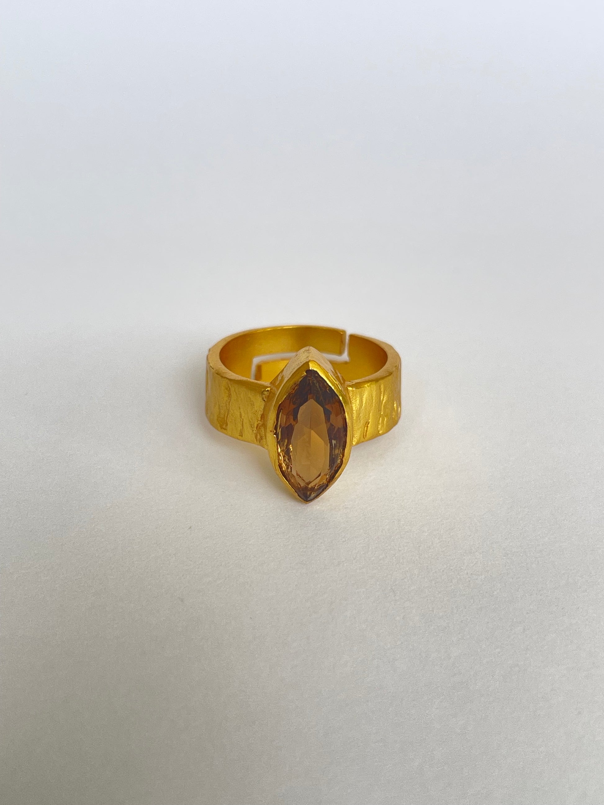 The Hinata Ring features a faceted marquise-cut gemstone set vertically on a hammered gold band. Its textured finish gives it a modern artisanal feel, while the bold silhouette makes it a standout accessory. With an adjustable fit, it’s as versatile as it is stylish.
