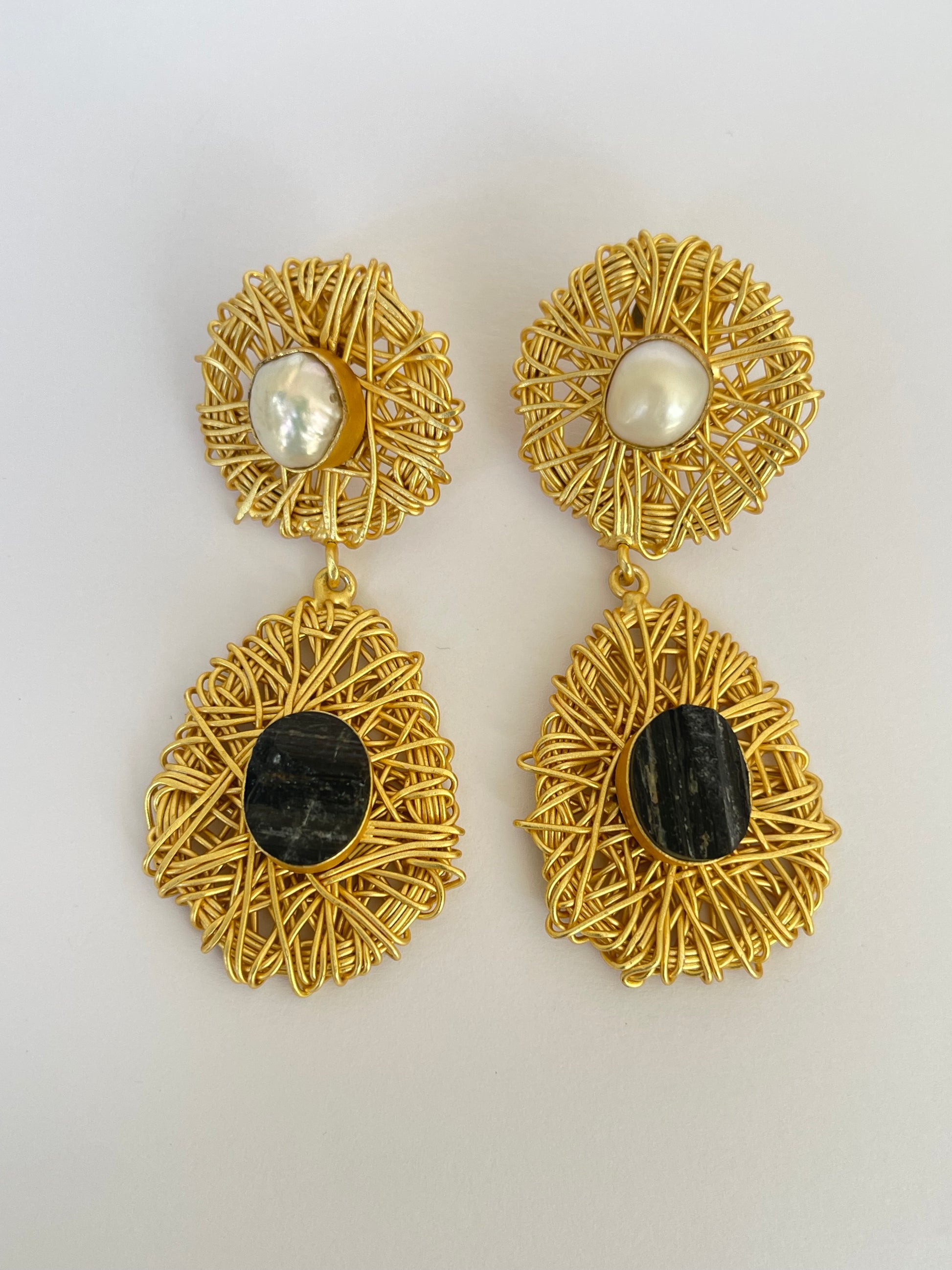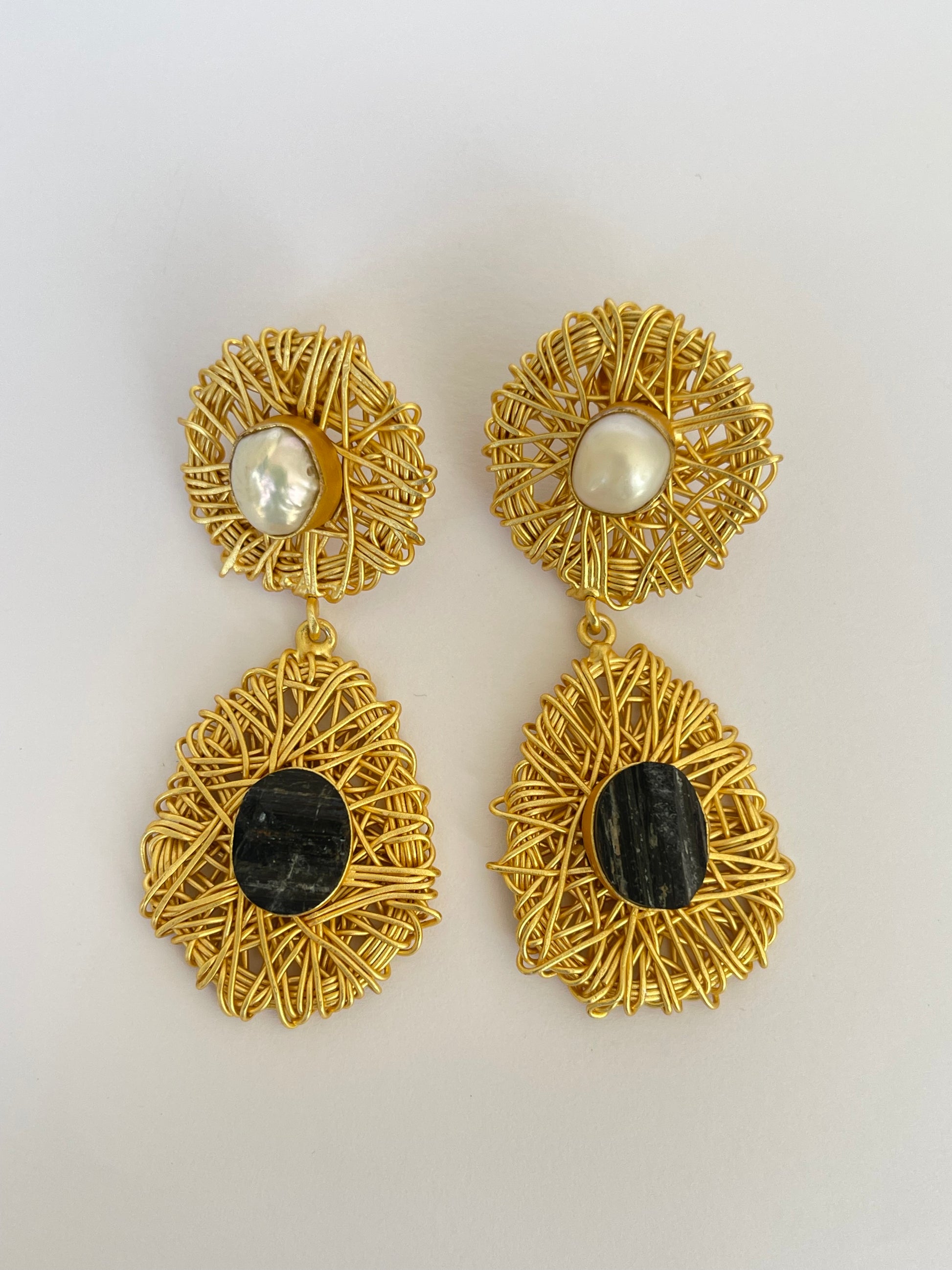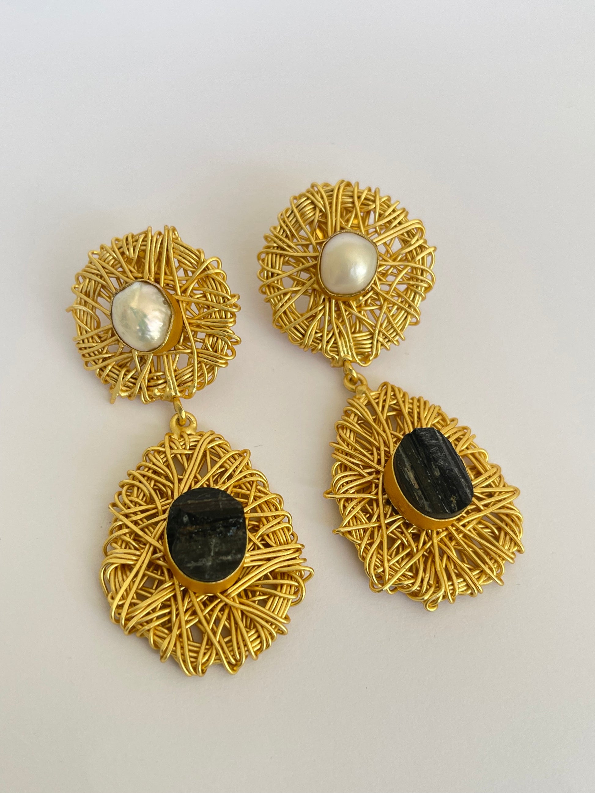 The Kage Earrings embody sculptural elegance through intricate gold wirework that frames the natural contrast of luminous freshwater pearls and grounding black tourmaline. Handcrafted in 18k gold-plated brass, this design celebrates duality — light and shadow, softness and strength.