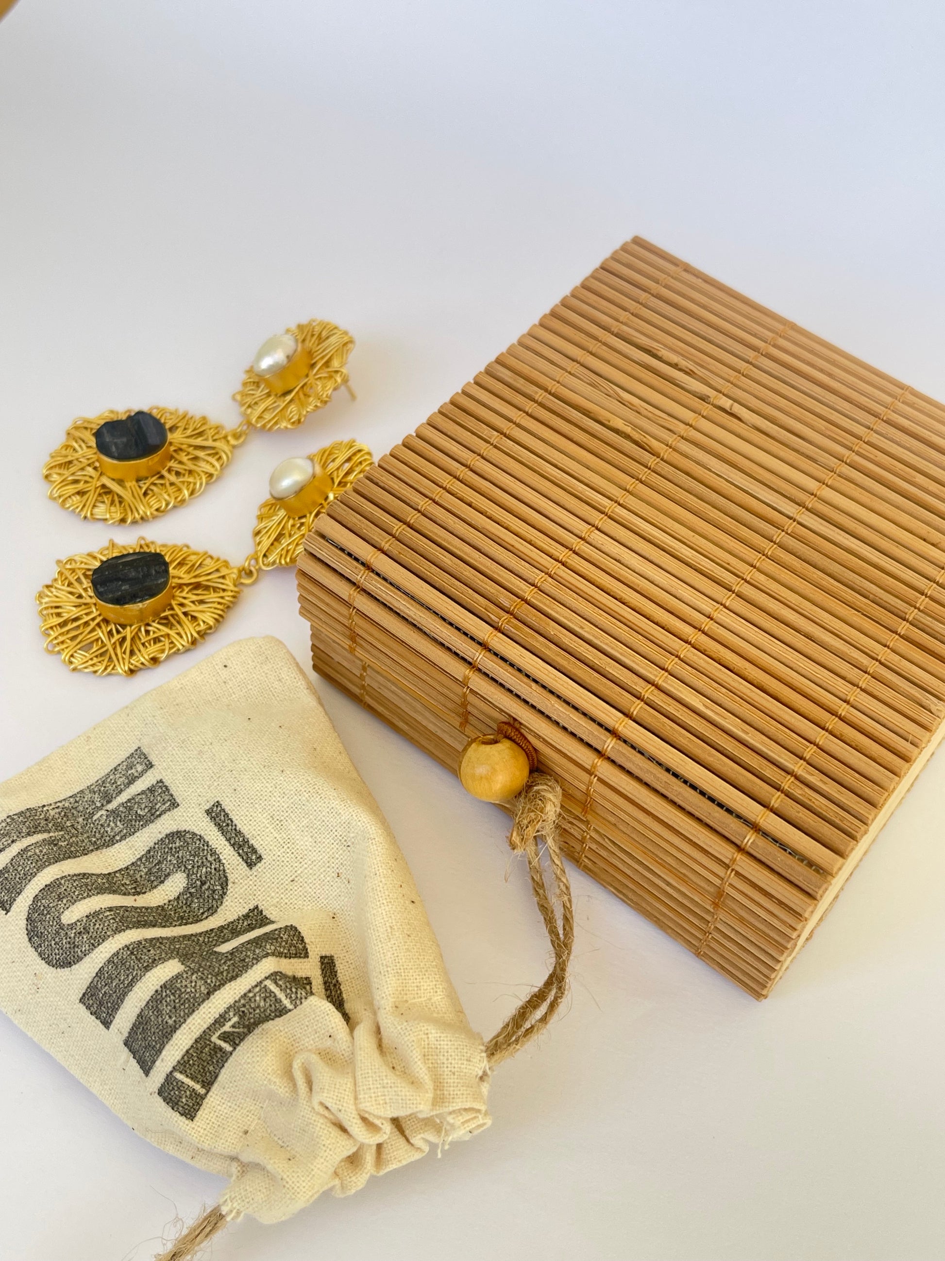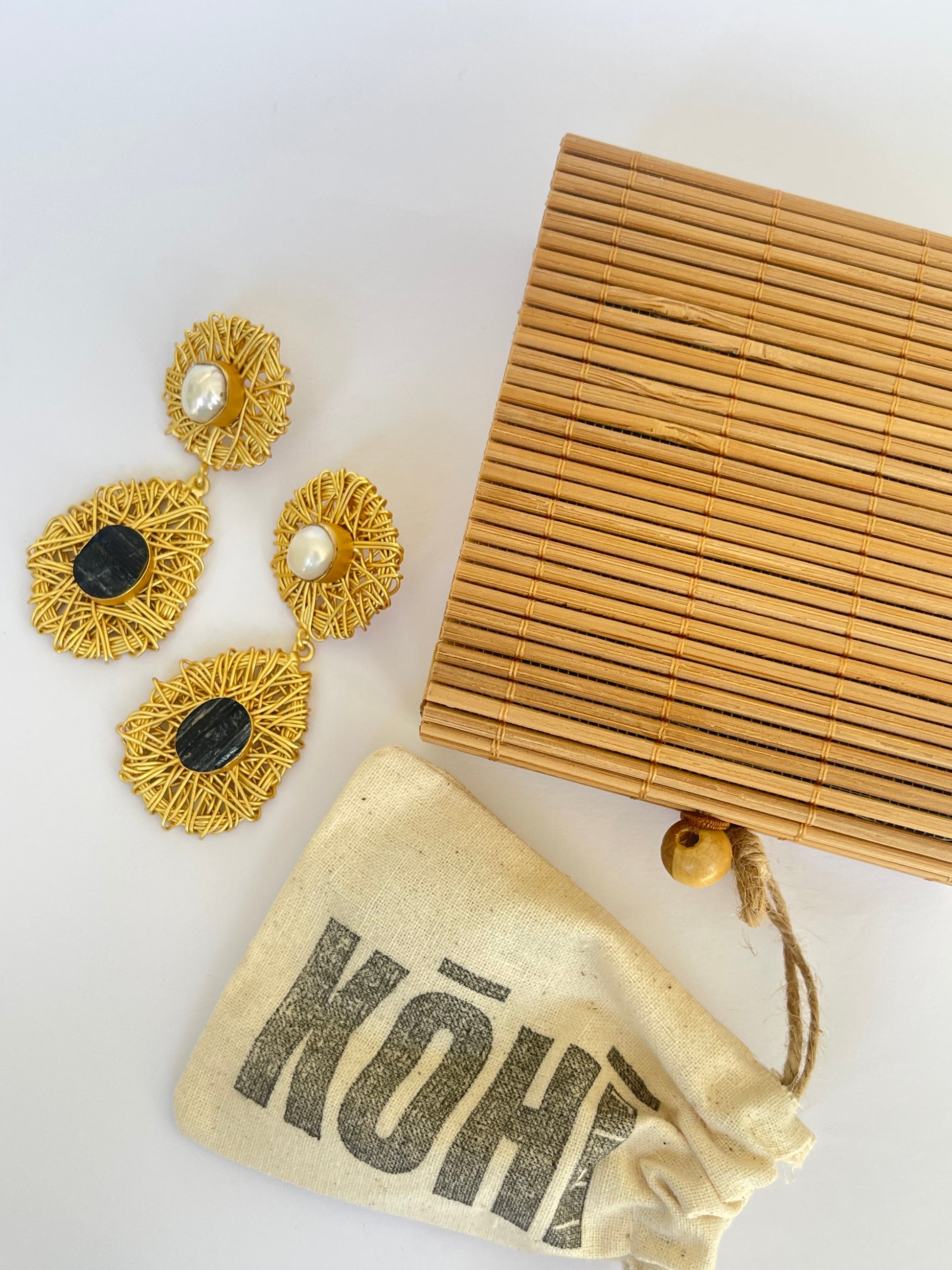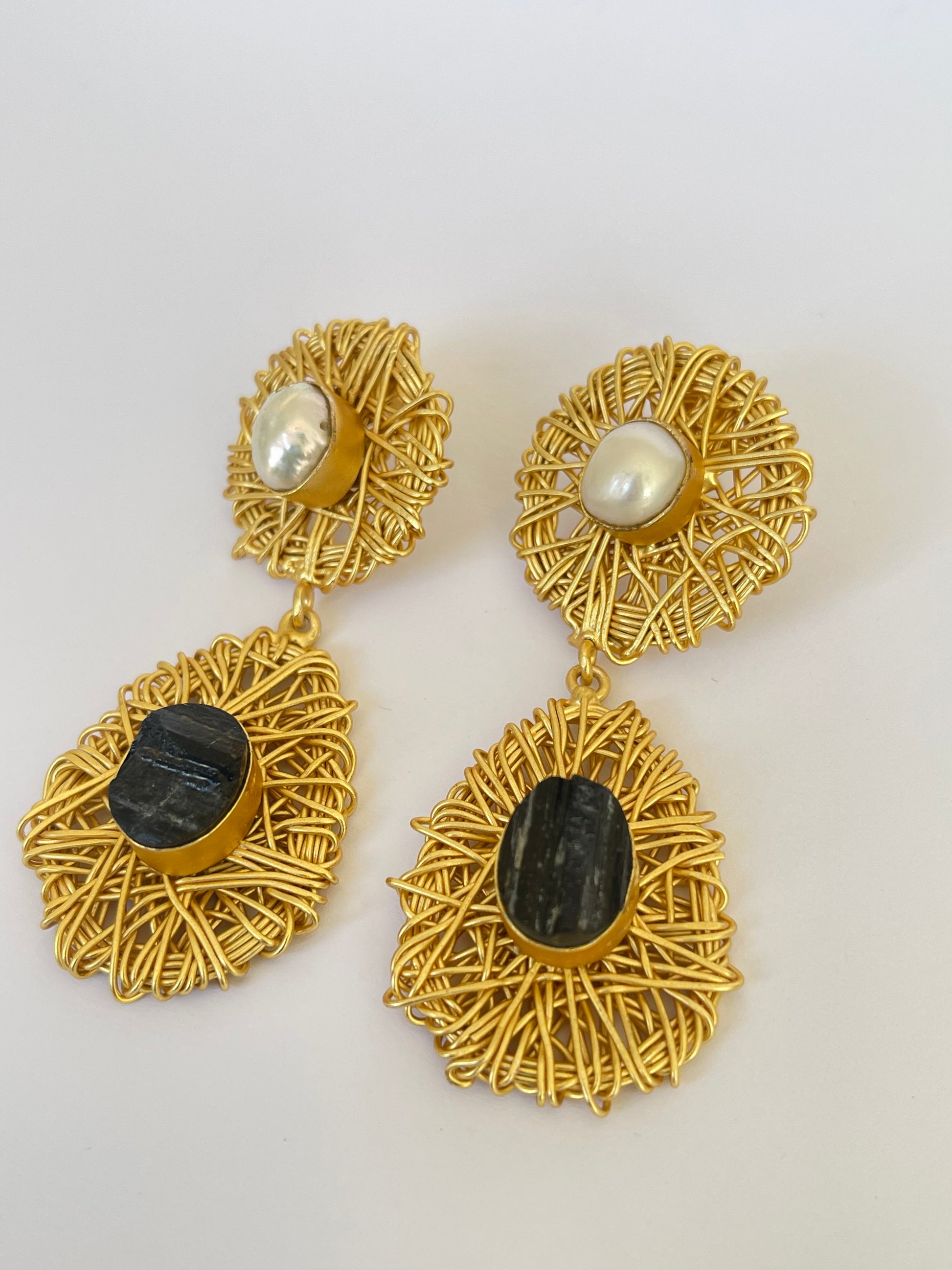 The Kage Earrings embody sculptural elegance through intricate gold wirework that frames the natural contrast of luminous freshwater pearls and grounding black tourmaline. Handcrafted in 18k gold-plated brass, this design celebrates duality — light and shadow, softness and strength.