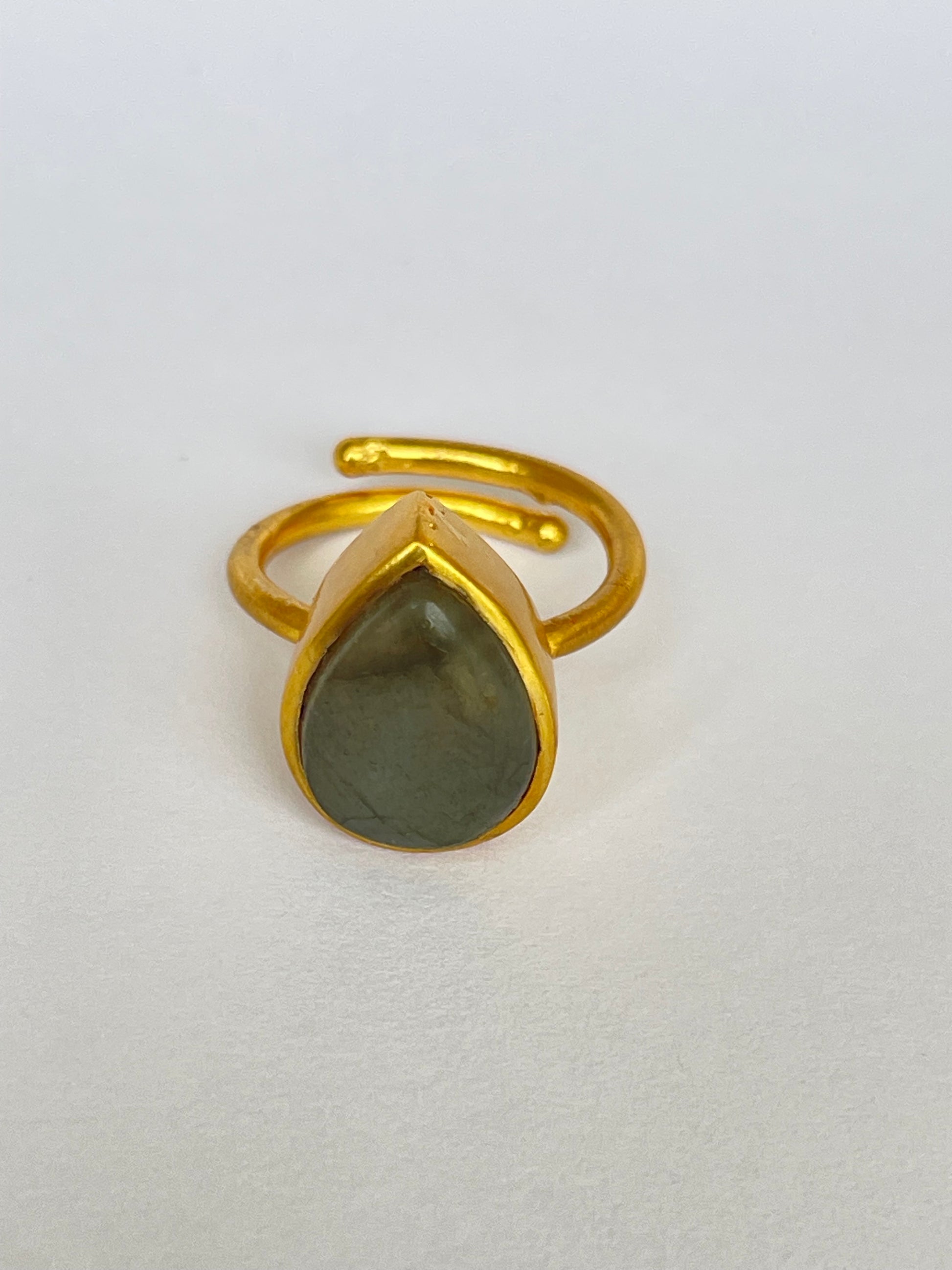 The Kiriishi Ring captures the quiet mystique of shifting light. Featuring a smooth labradorite teardrop framed in 18k gold-plated brass, its subtle iridescence reveals hues of grey, blue, and green — like mist catching the dawn.