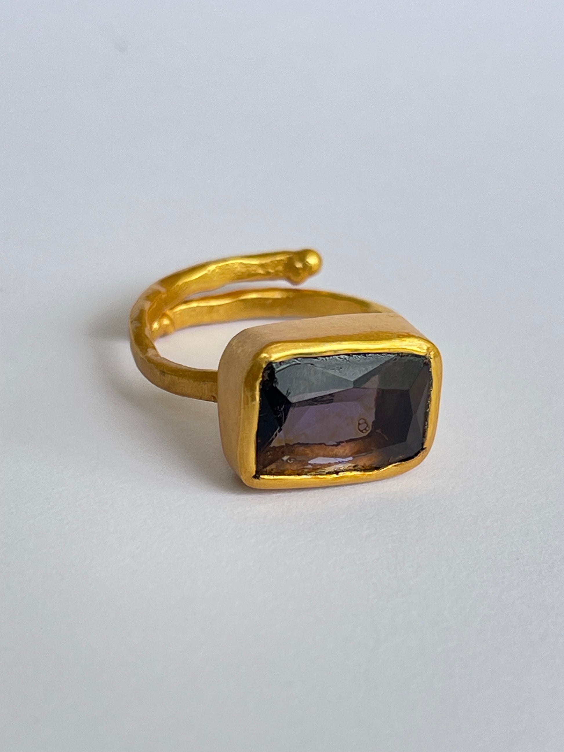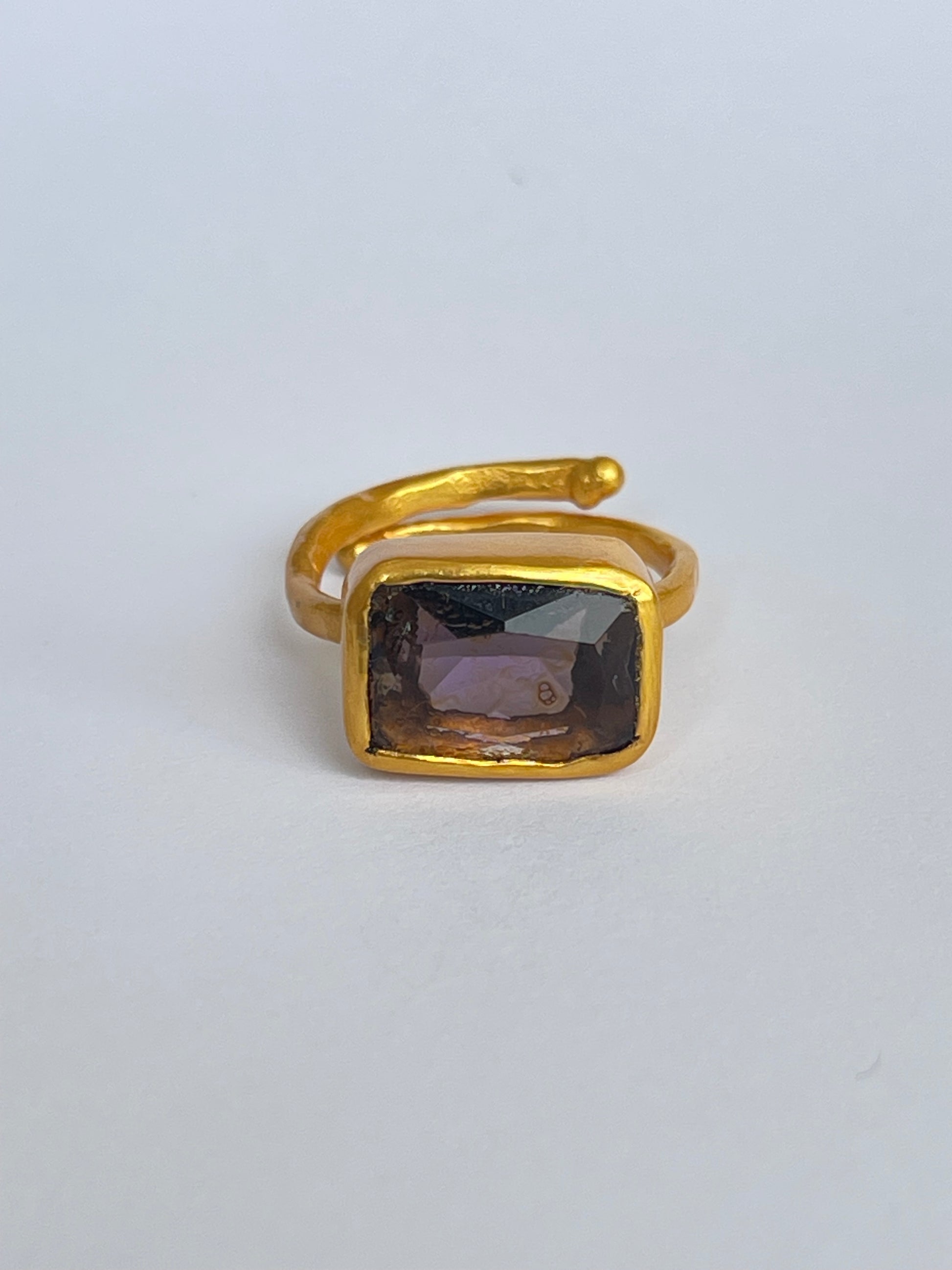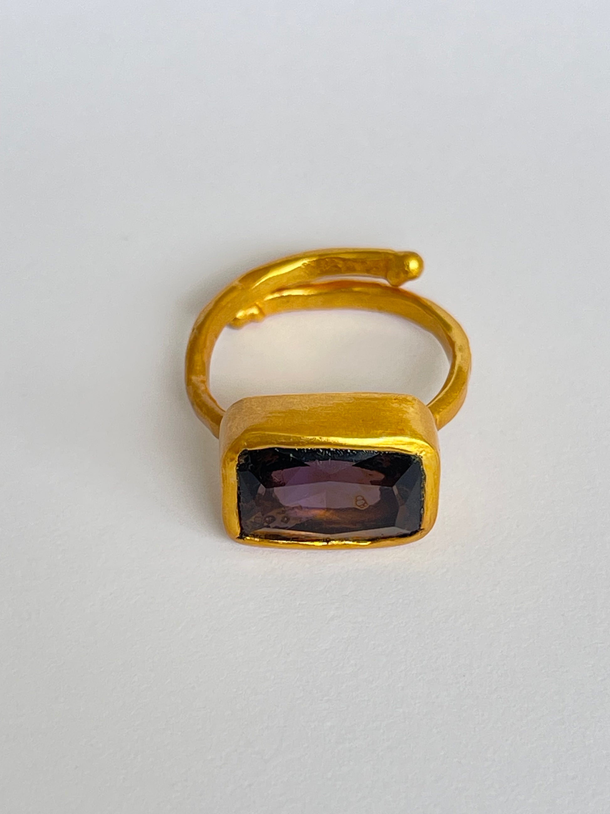 The Kemuri-ishi Ring embodies quiet strength and elegance, featuring a striking rectangular-cut smoky quartz gemstone set in 18k gold-plated brass. With its deep, mysterious tones, this piece carries a refined minimalism that feels both modern and timeless.