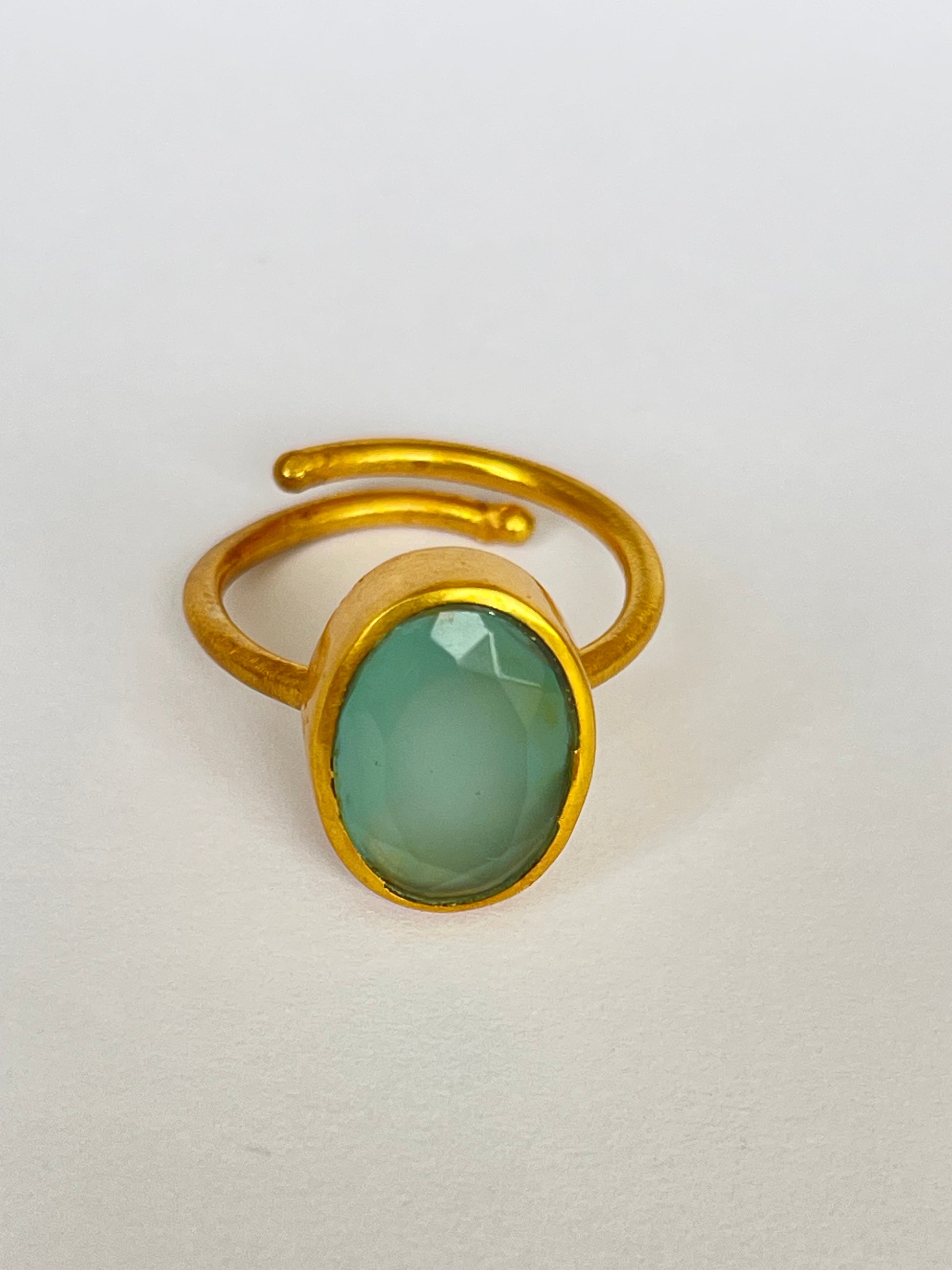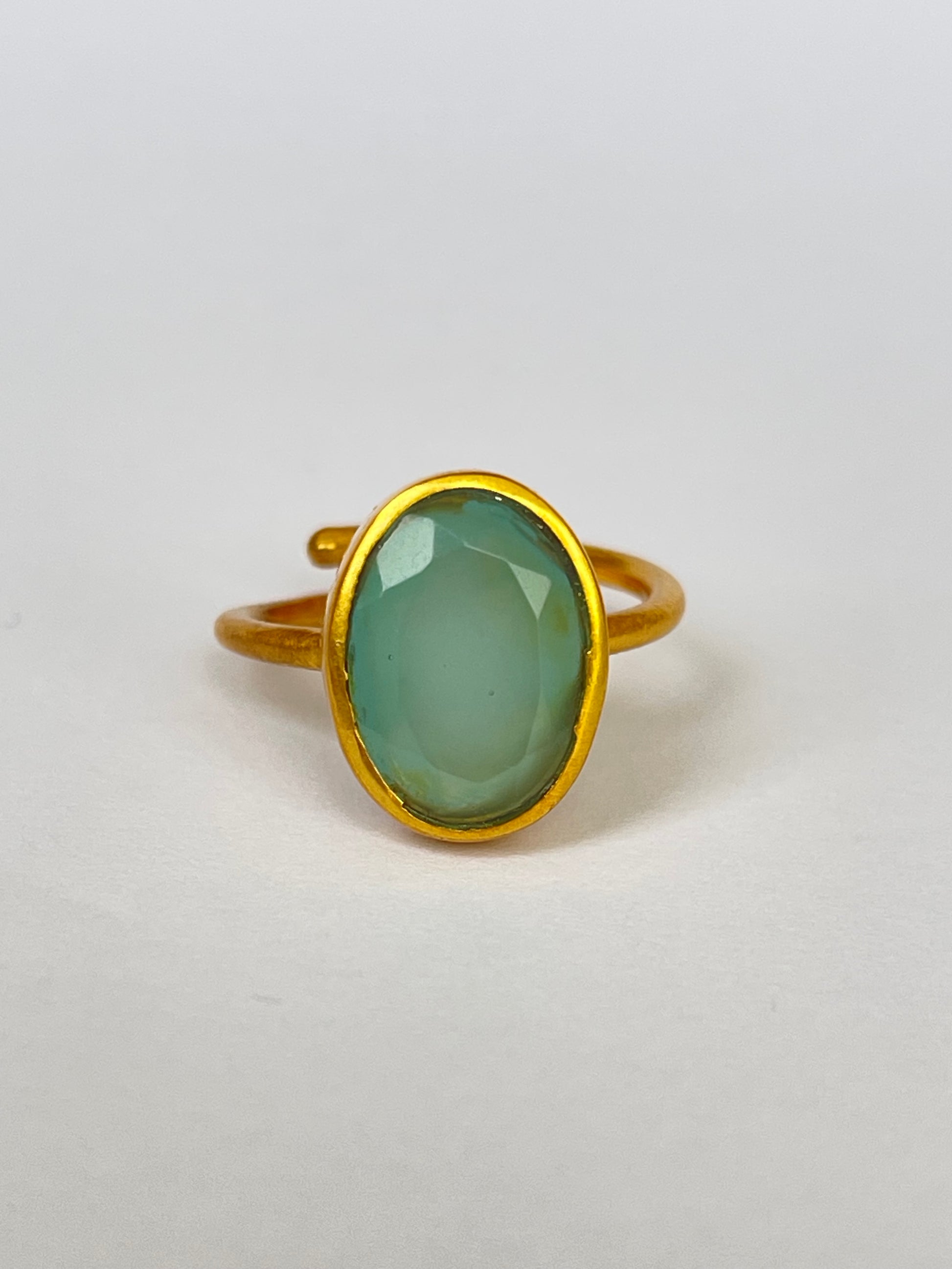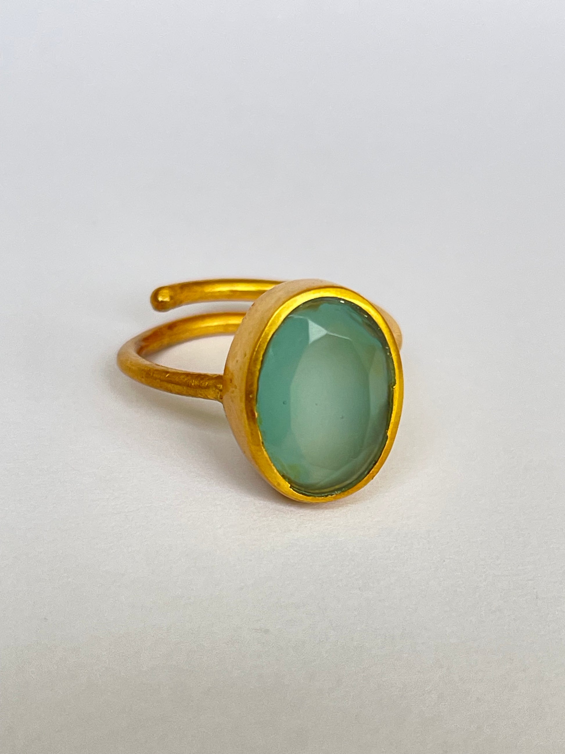 The Suika Ring embodies calm confidence with its smooth green onyx gemstone, delicately faceted and set in an 18k gold-plated frame. Its soft, luminous hue captures the essence of quiet strength and refined minimalism.