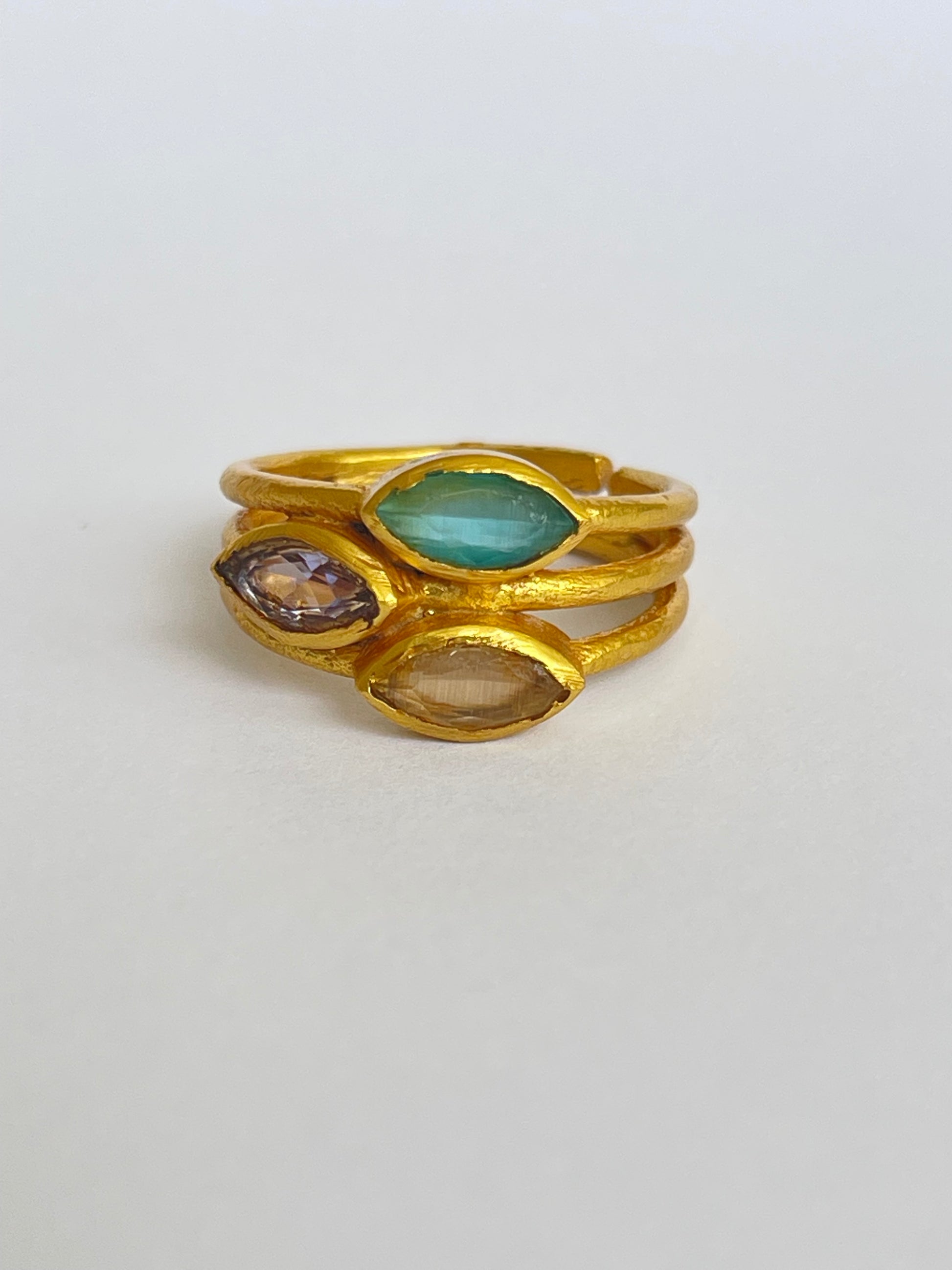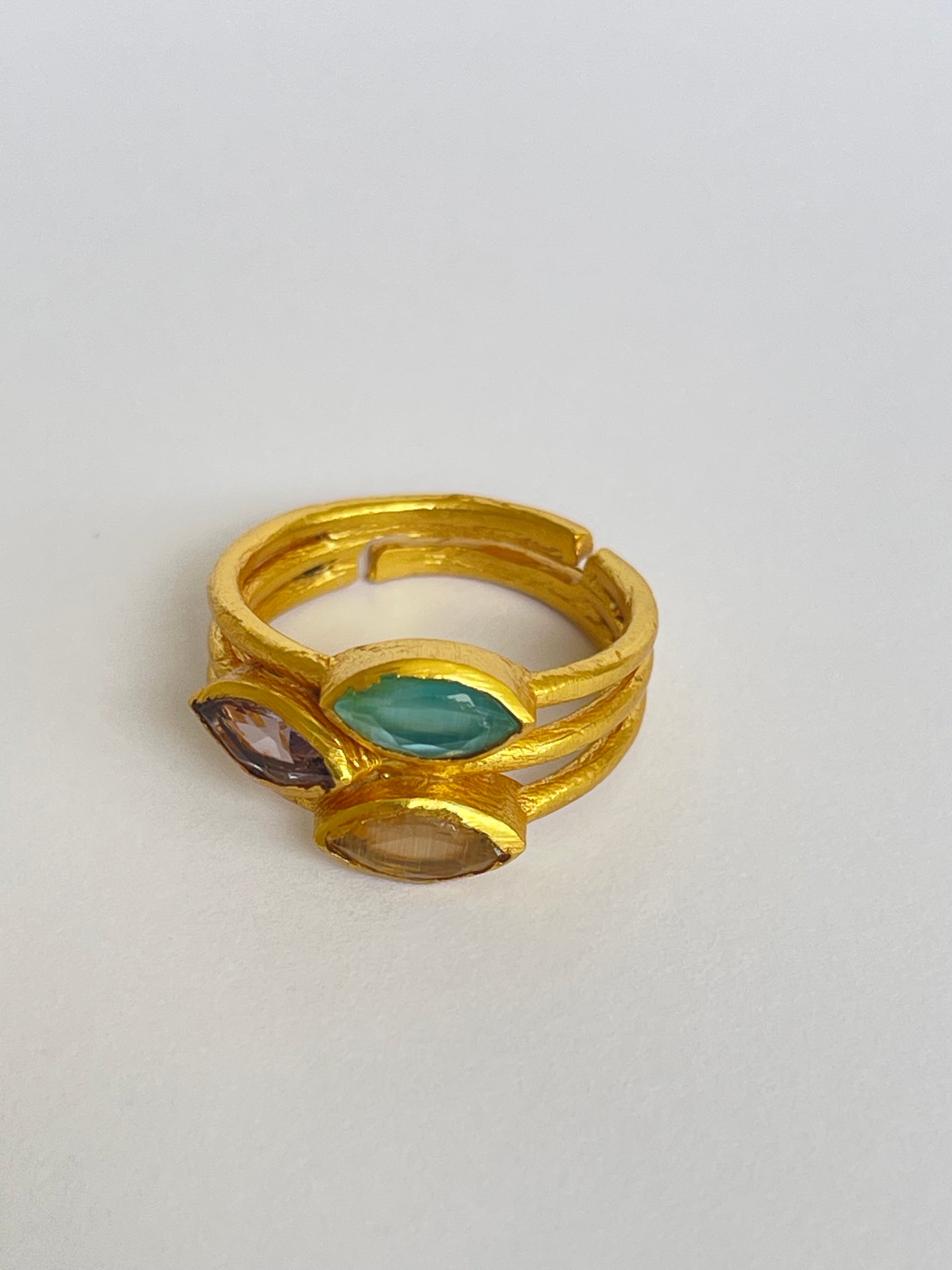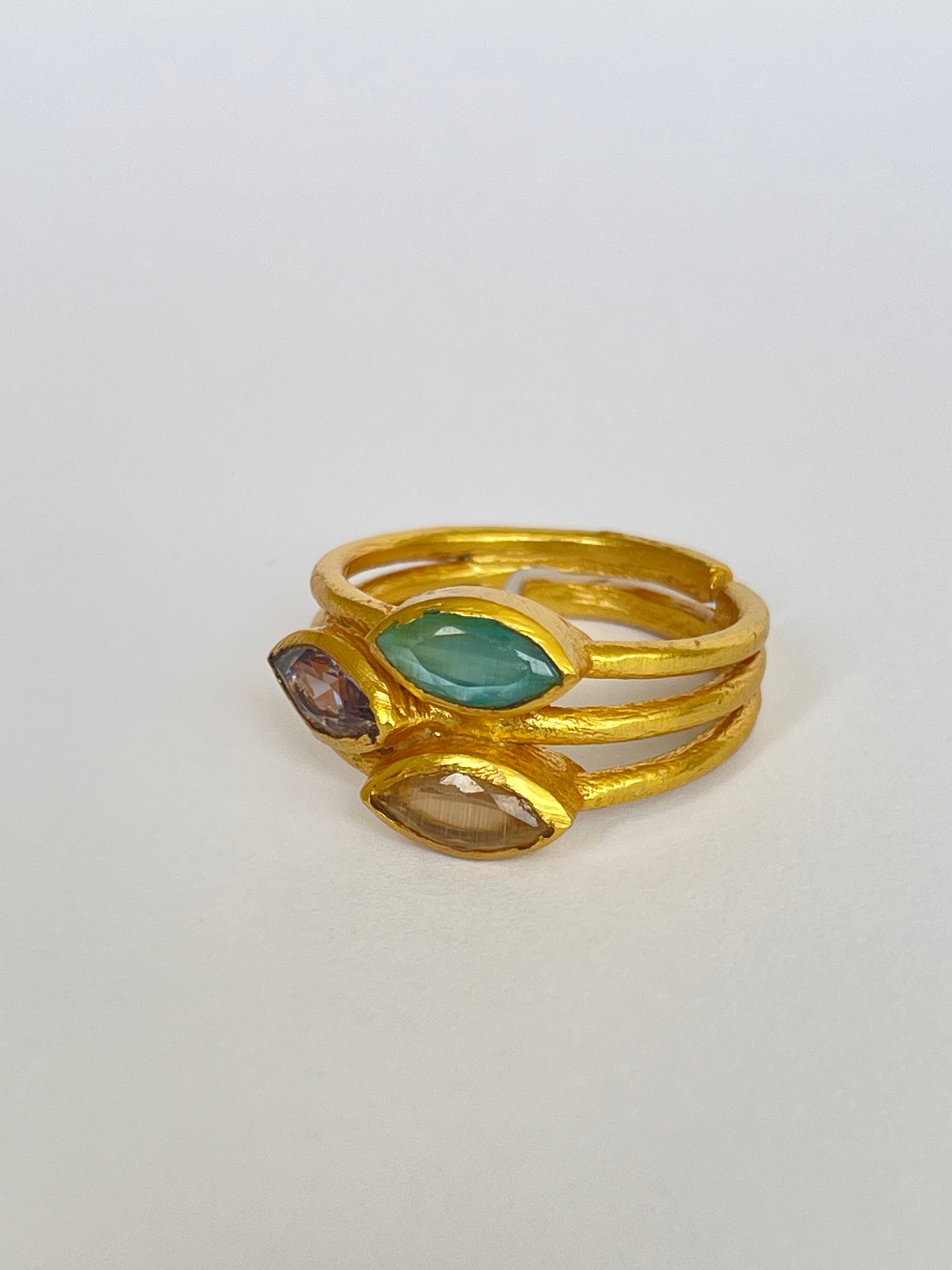 The Mitsuba Ring features three faceted marquise-cut gemstones gracefully stacked on a golden band. The layered design makes it bold yet wearable, perfect for both everyday styling and special occasions. With its adjustable fit, it ensures comfort and versatility for every hand.