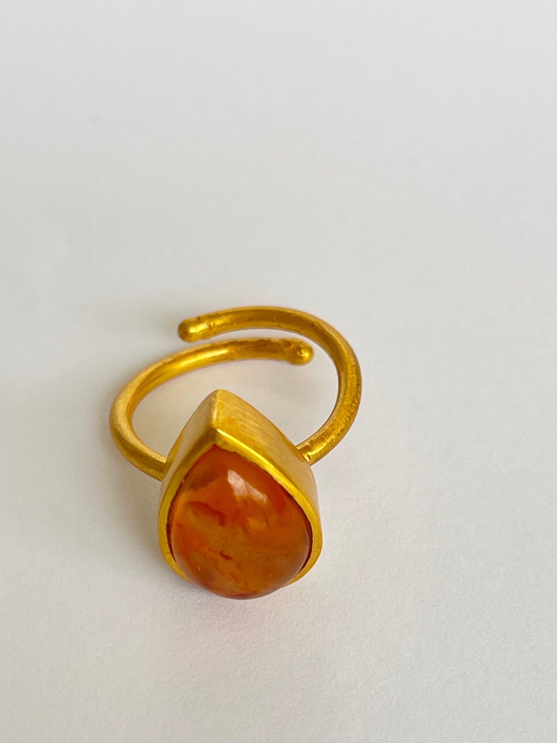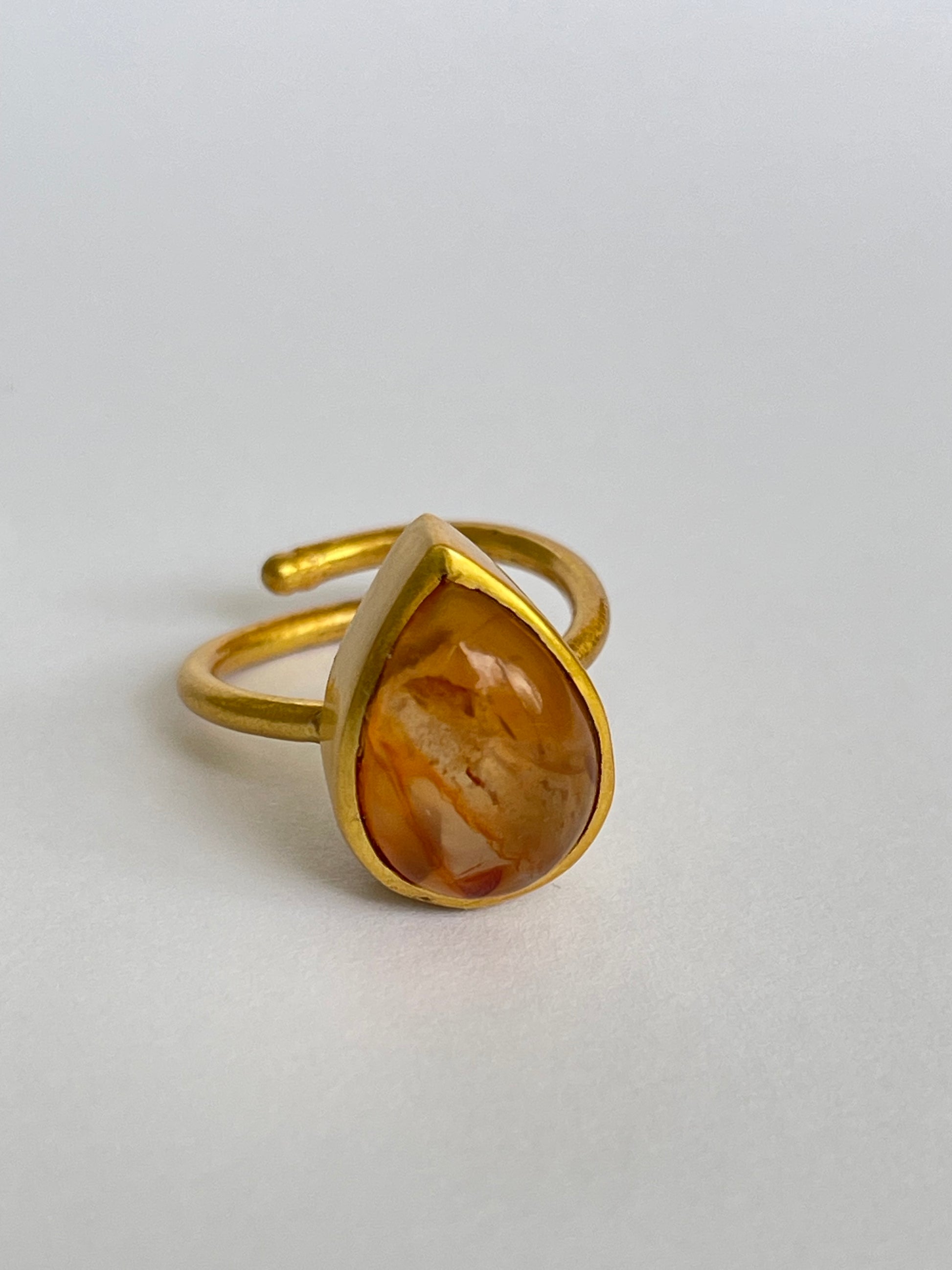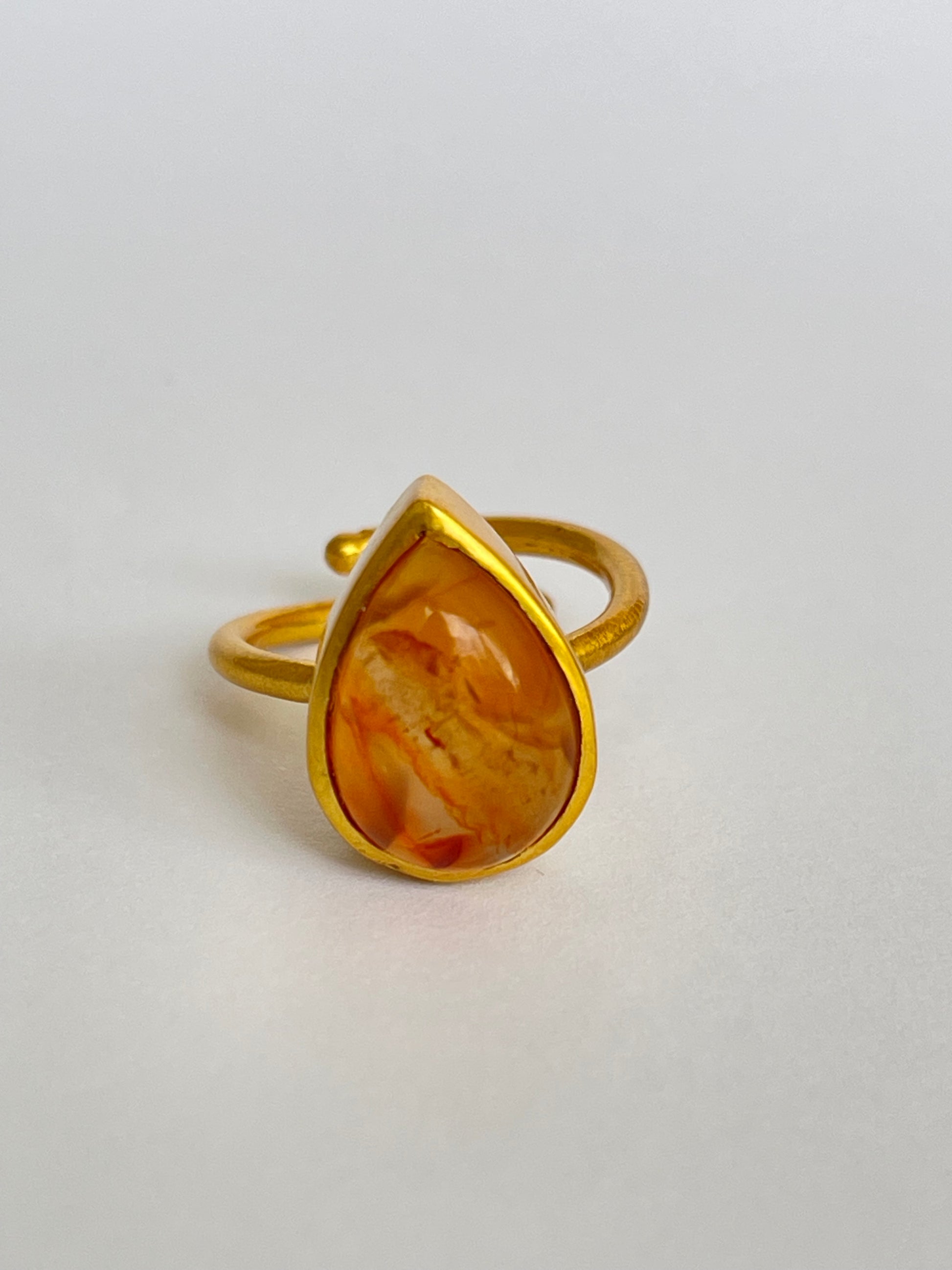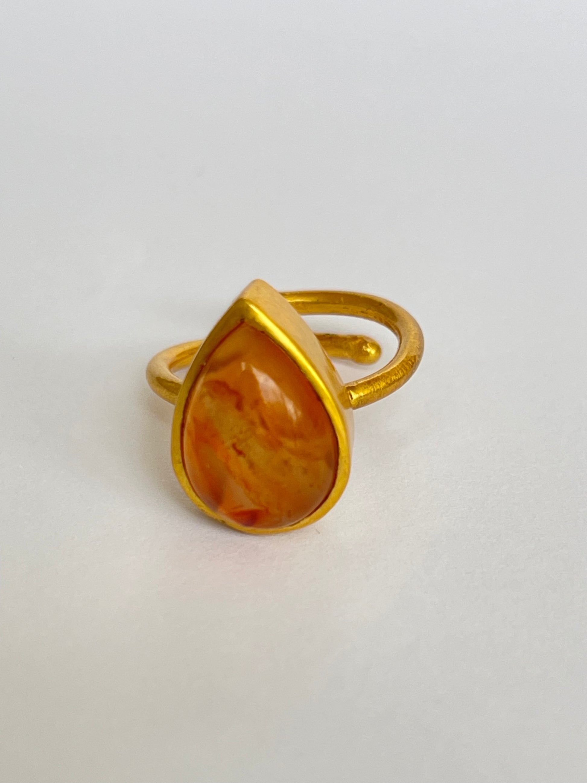 The Kouka Ring glows like the sky at sunset — a teardrop of orange agate framed in radiant 18k gold-plated brass. Its swirling amber tones mirror the dance of light and fire, a symbol of vitality and creative energy.