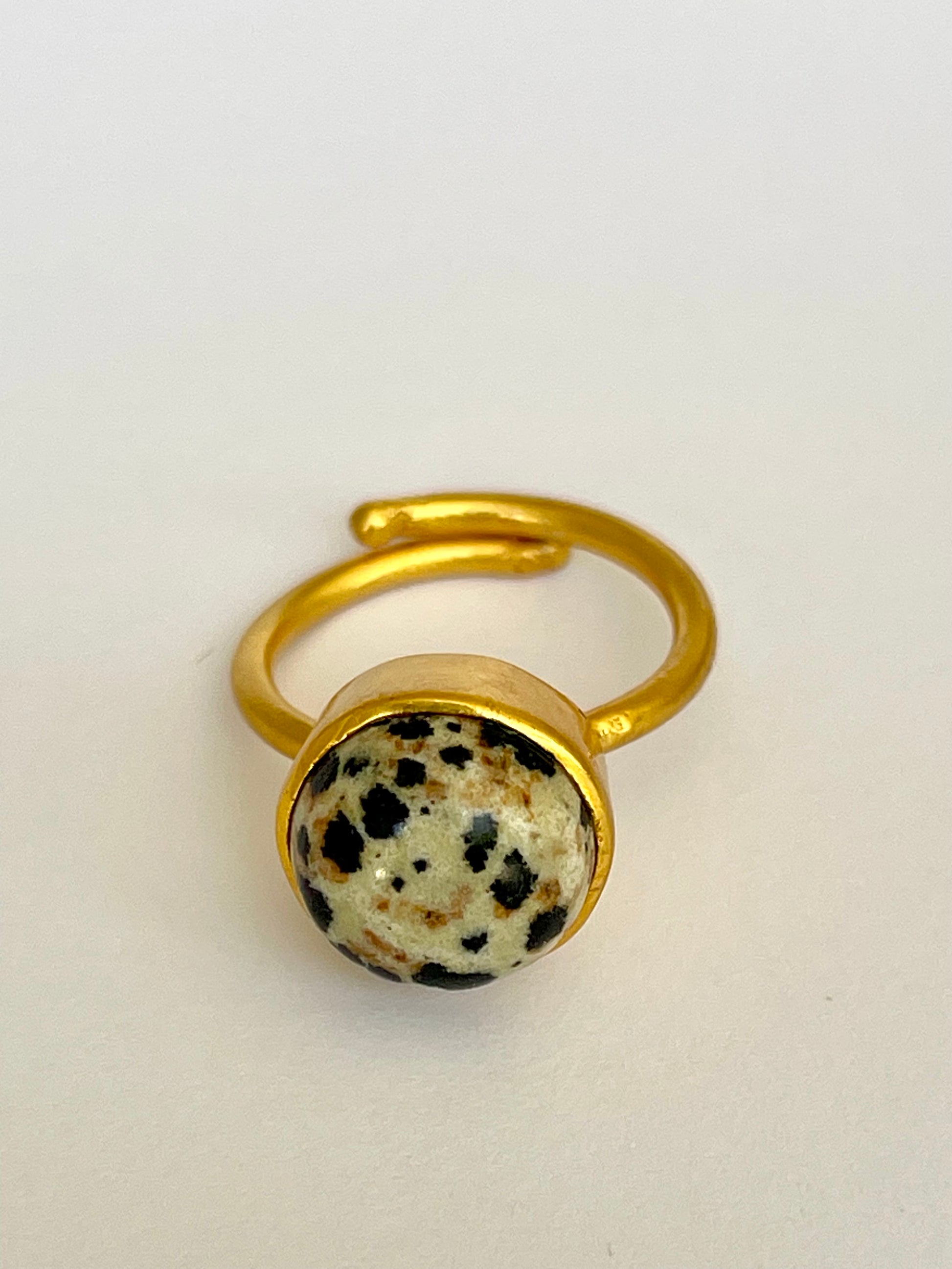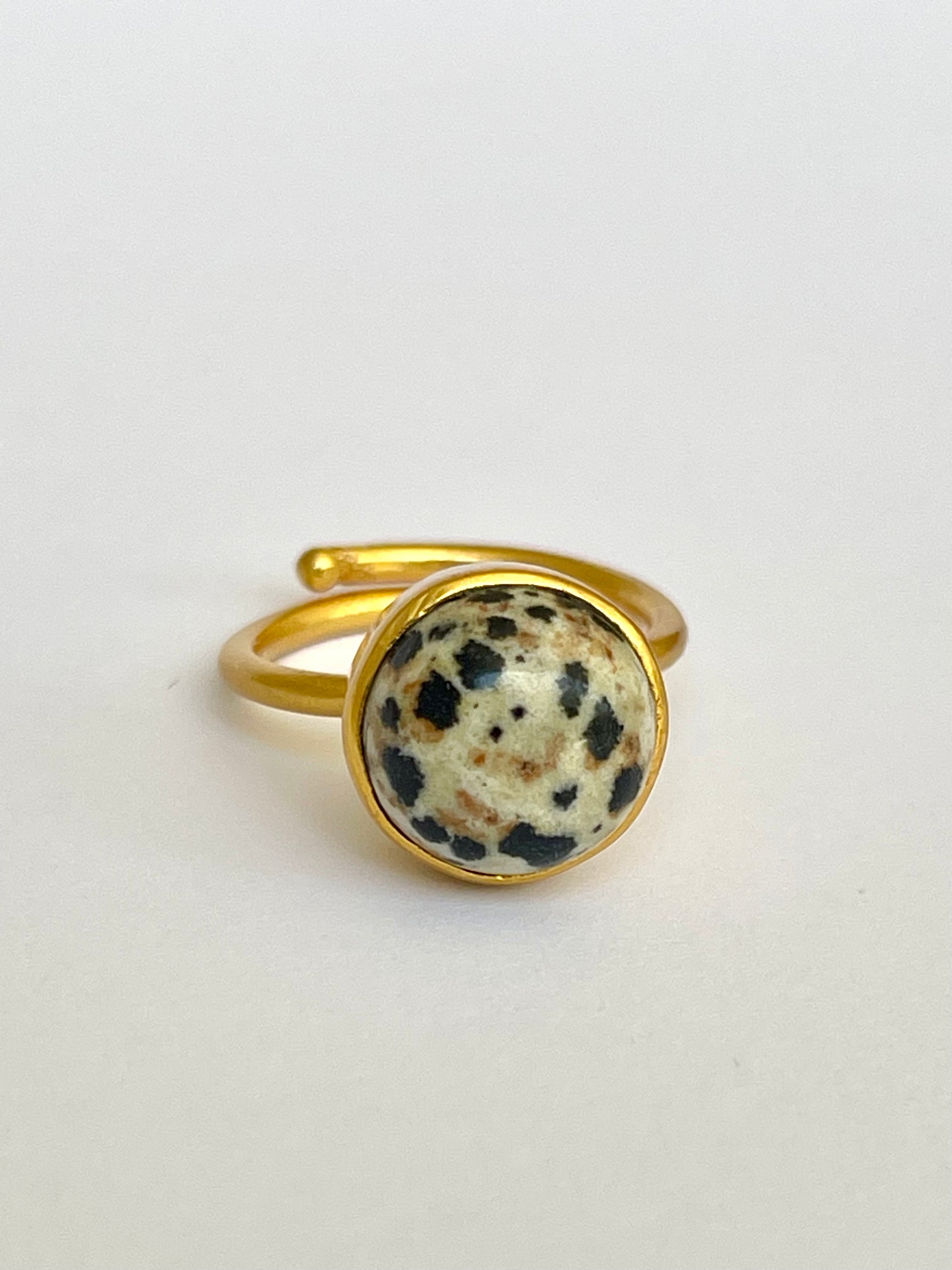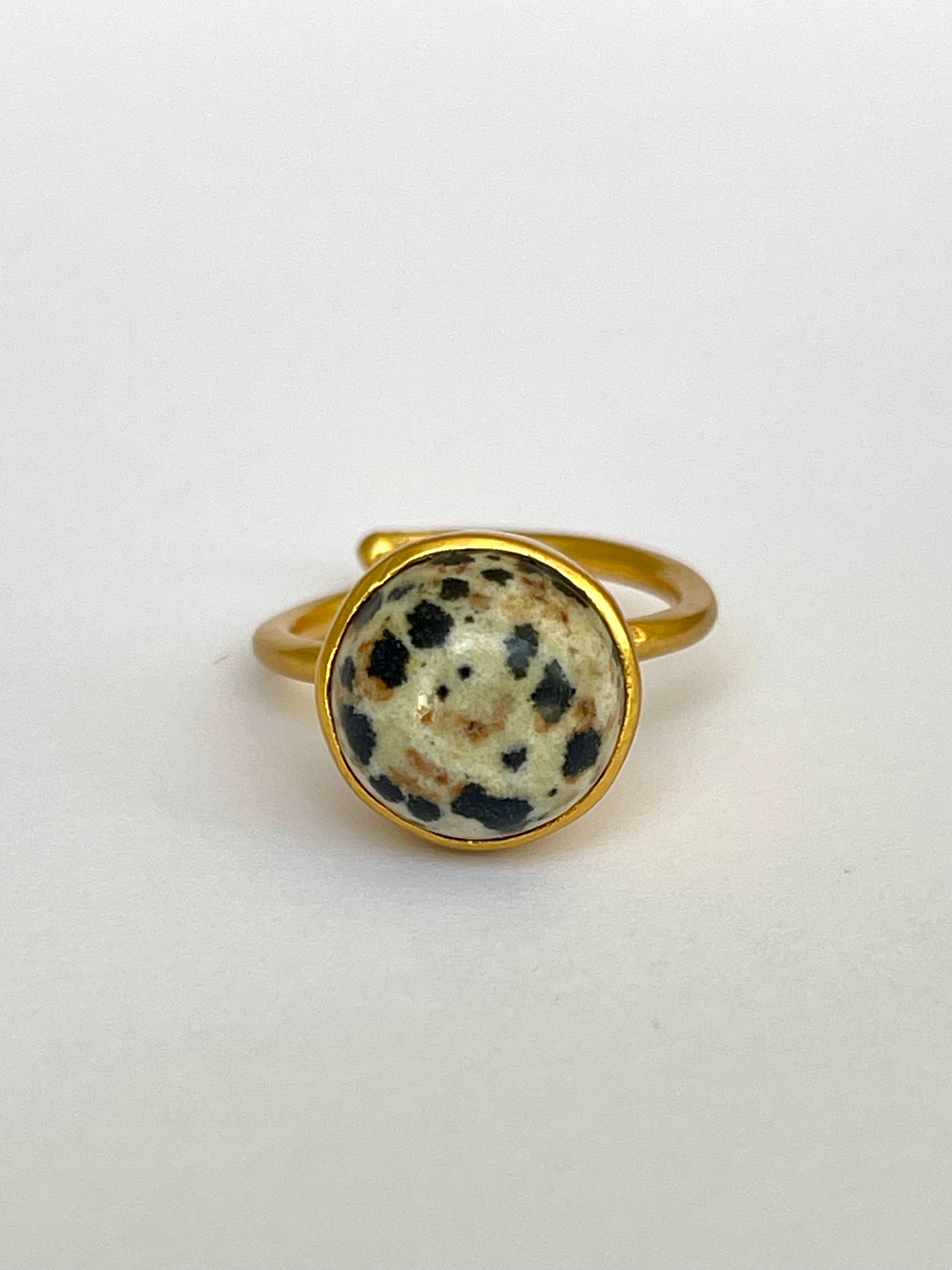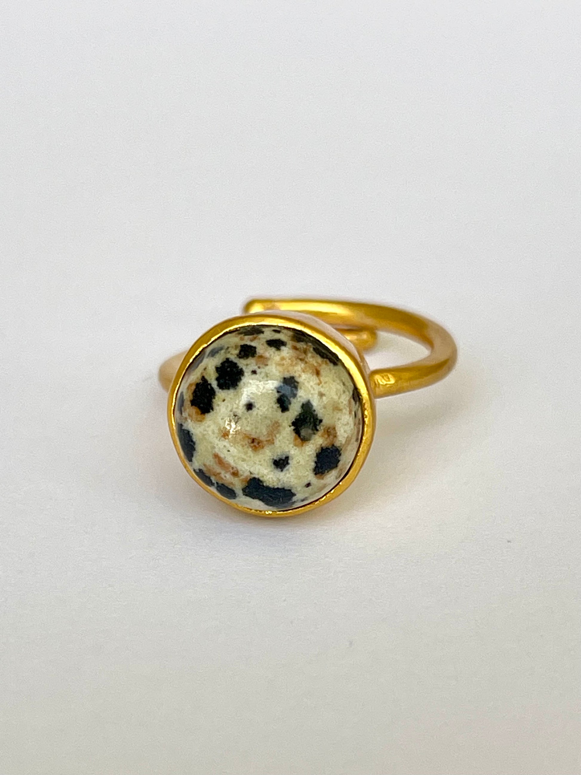 The Marumanten Ring features a smooth round cabochon of dalmatian jasper, set in 18k gold-plated brass. With its natural cream base and distinctive black-and-brown spots, this gemstone carries a unique character in every piece.