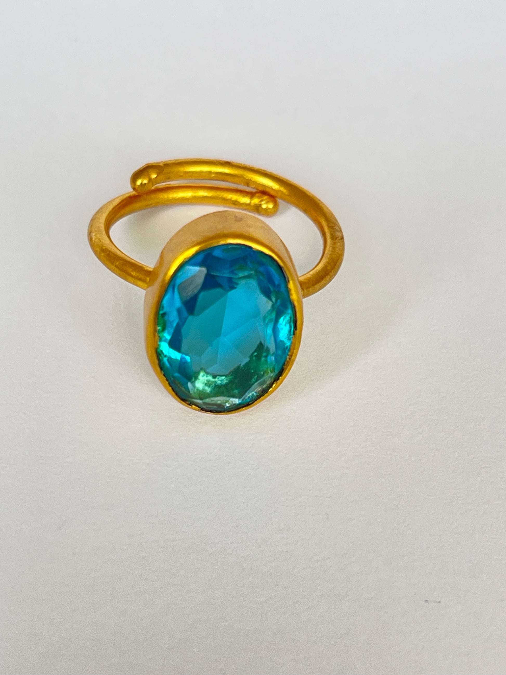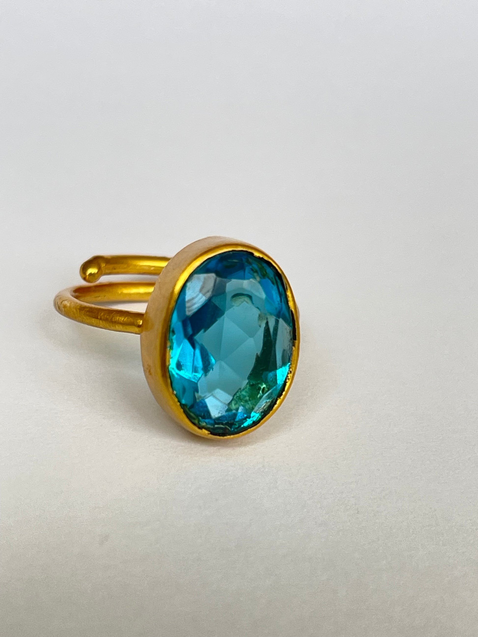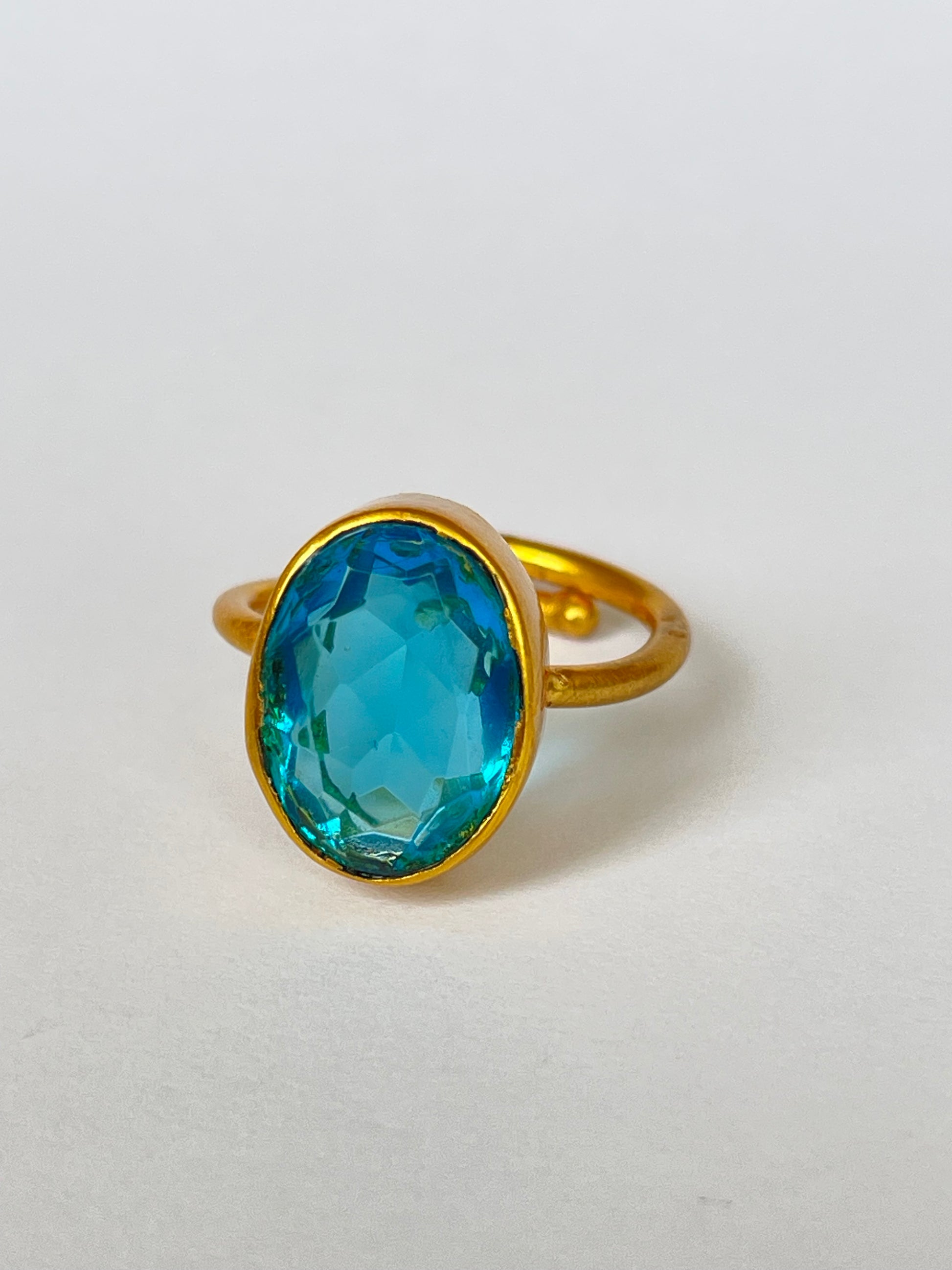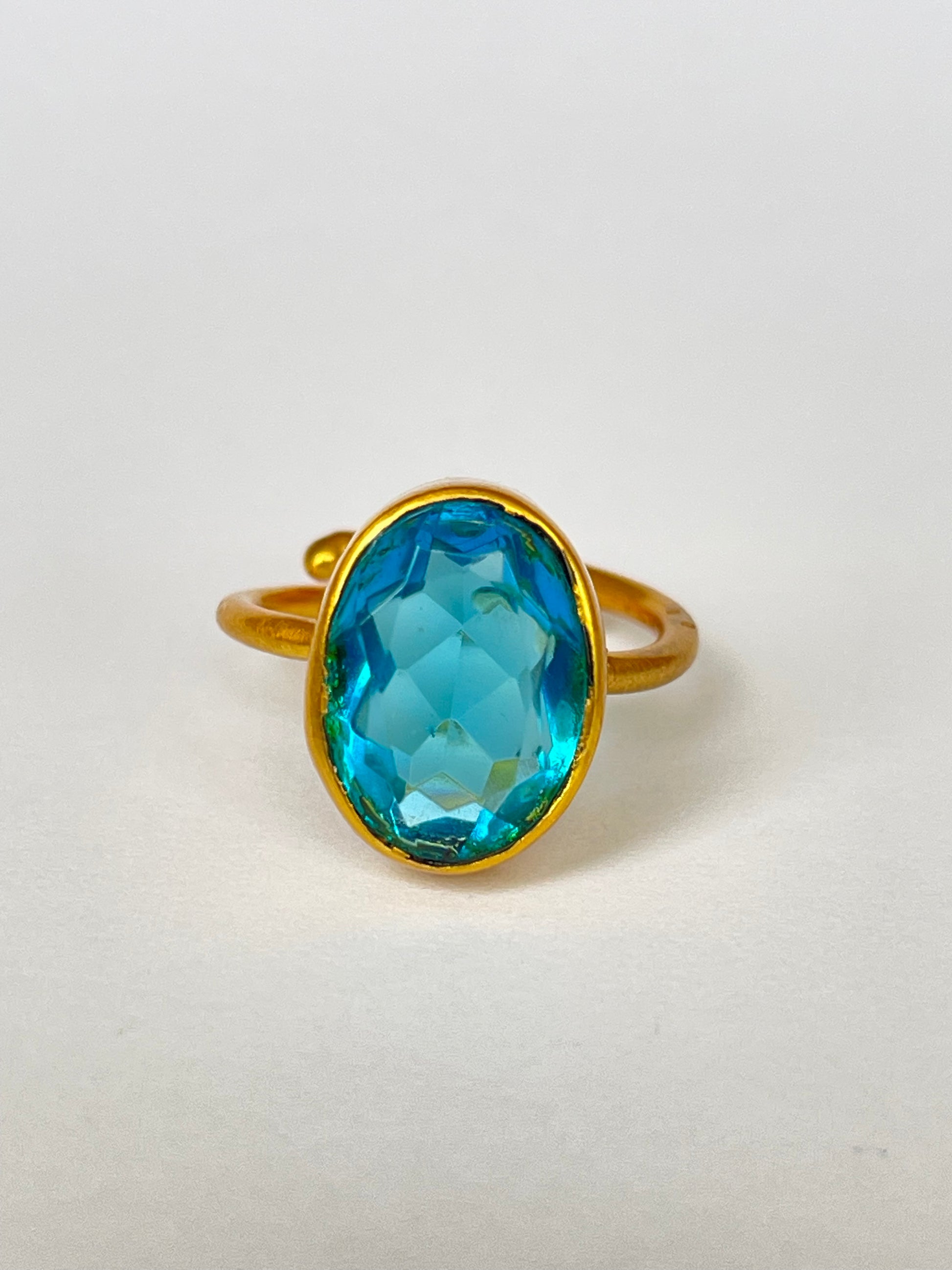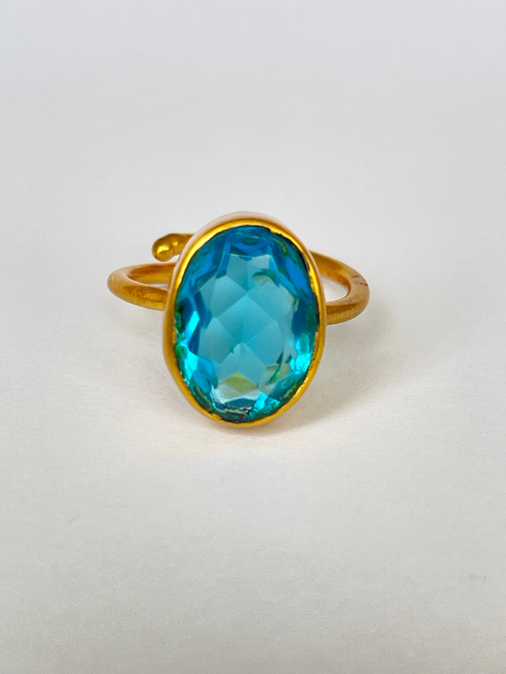 The Umikaze Ring captures the serene spirit of an ocean breeze. Its faceted blue topaz gemstone shimmers with crystalline clarity, set in an 18k gold-plated frame that reflects effortless elegance and tranquility. A piece that evokes freedom, calm, and quiet sophistication.