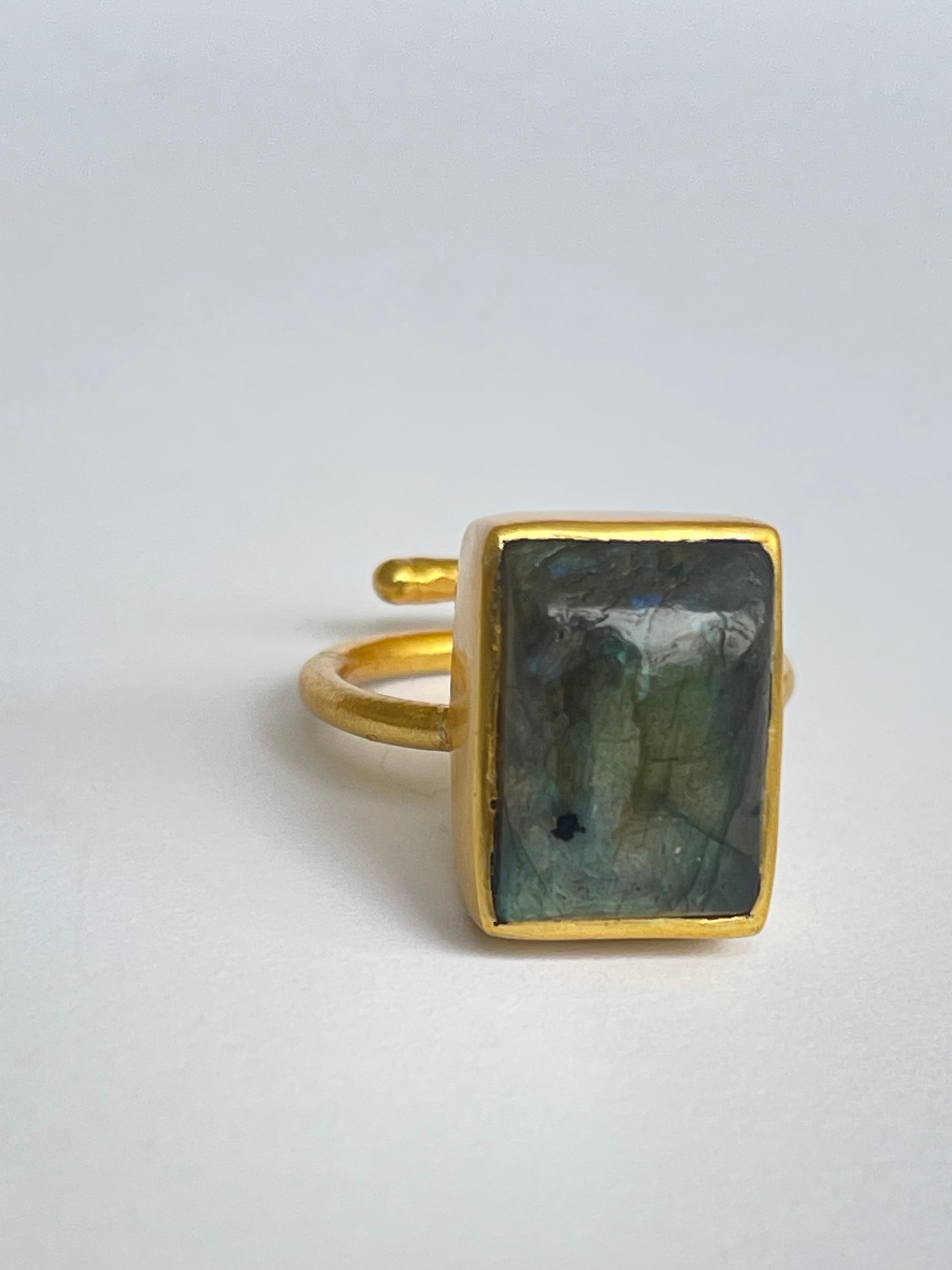The Kōei Ring captures the mysterious beauty of labradorite, a gemstone known for its shifting iridescent hues that reflect light in enchanting flashes of blue and green. Set in 18k gold-plated brass, the rectangular cut offers a refined, modern silhouette that highlights the stone’s natural depth.