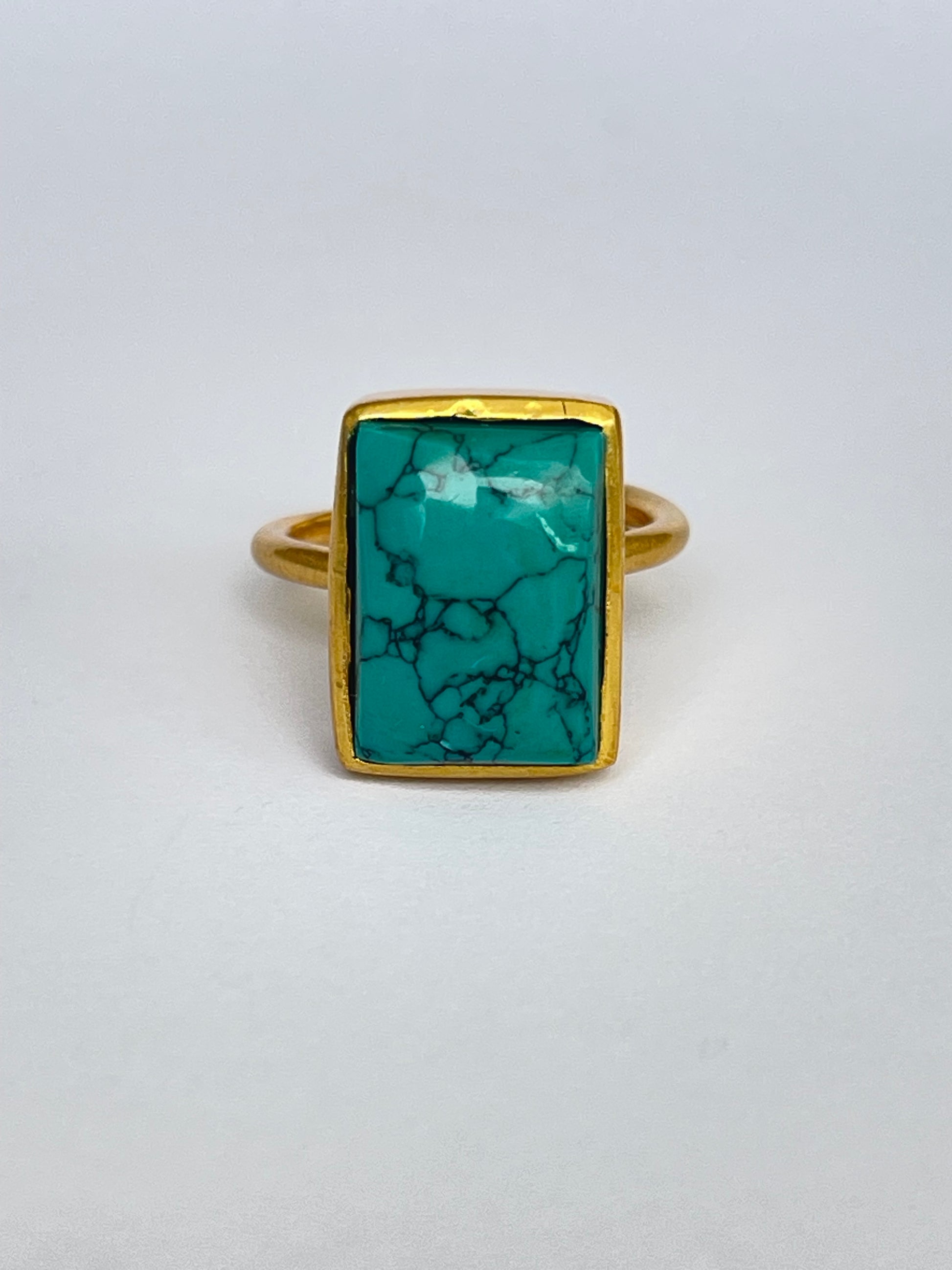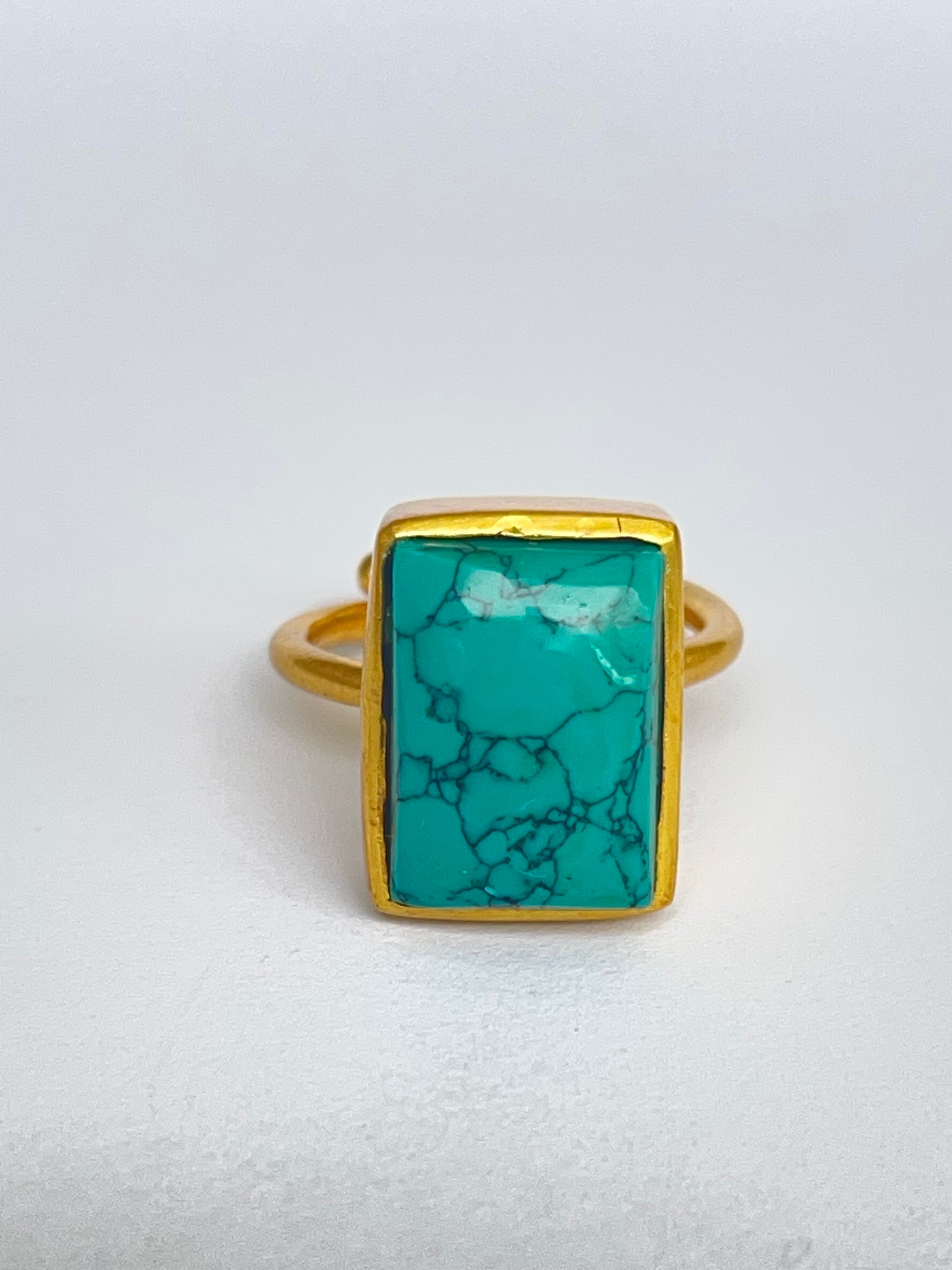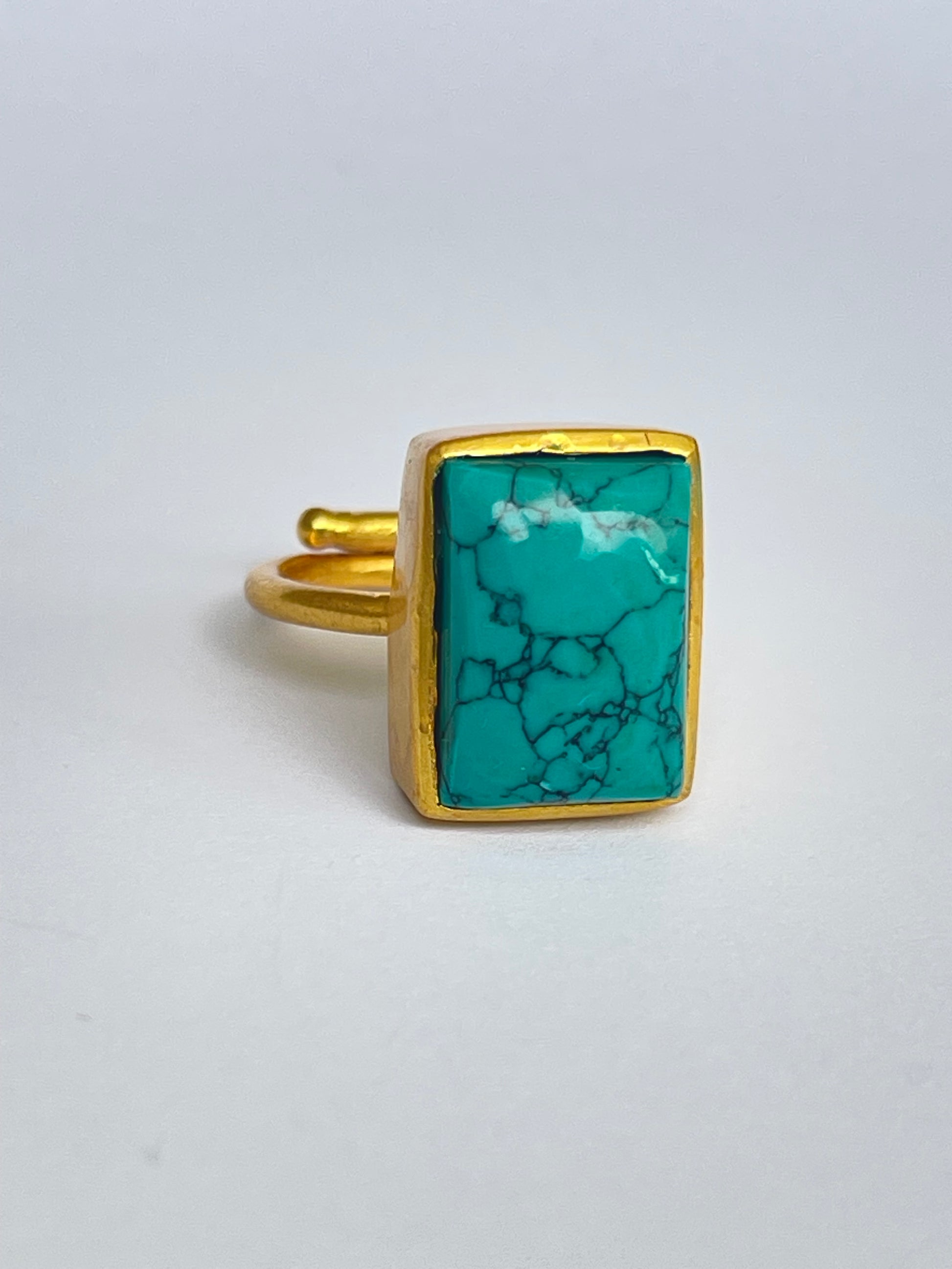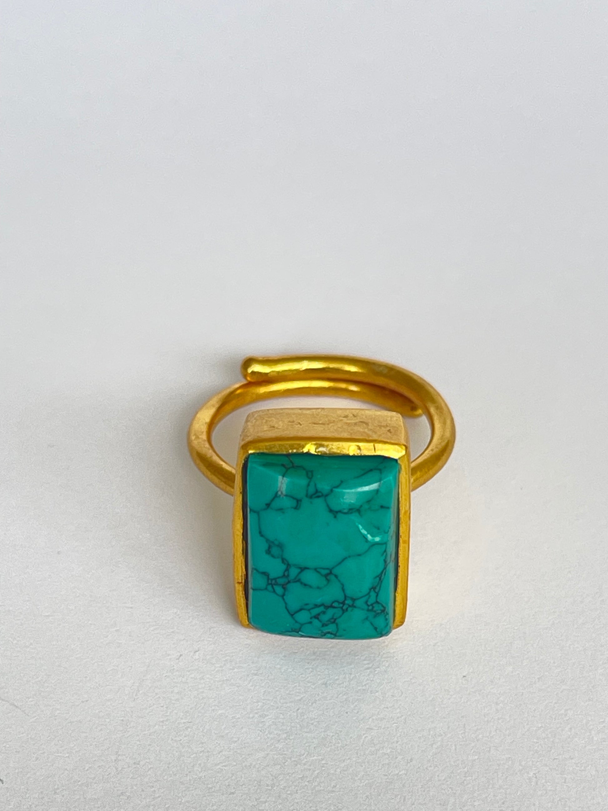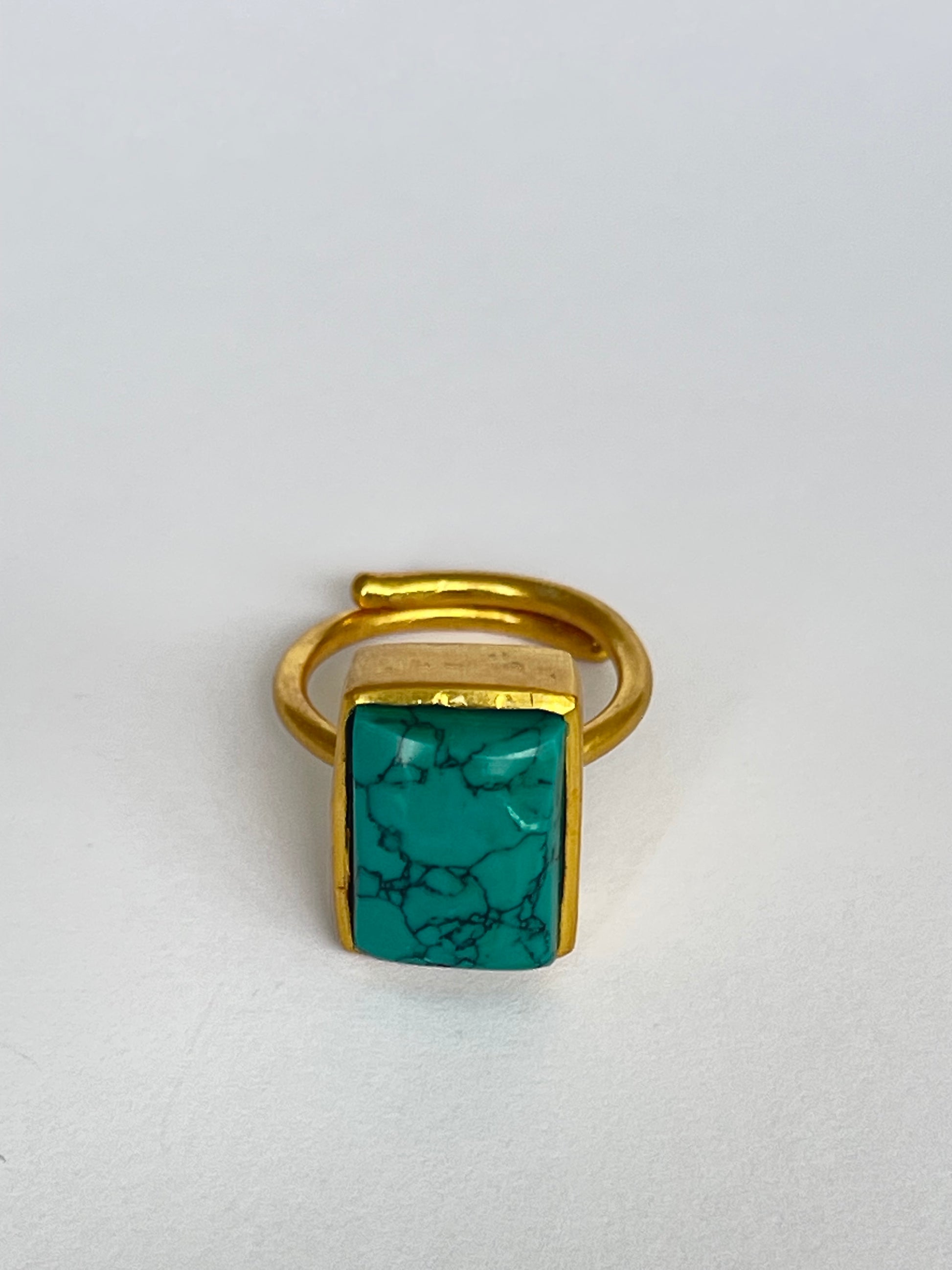 The Sōseki Ring embodies bold elegance with a polished rectangular-cut turquoise gemstone set in rich 18k gold-plated brass. Its vibrant blue-green surface with natural dark veining makes each piece entirely unique — a true statement of individuality.