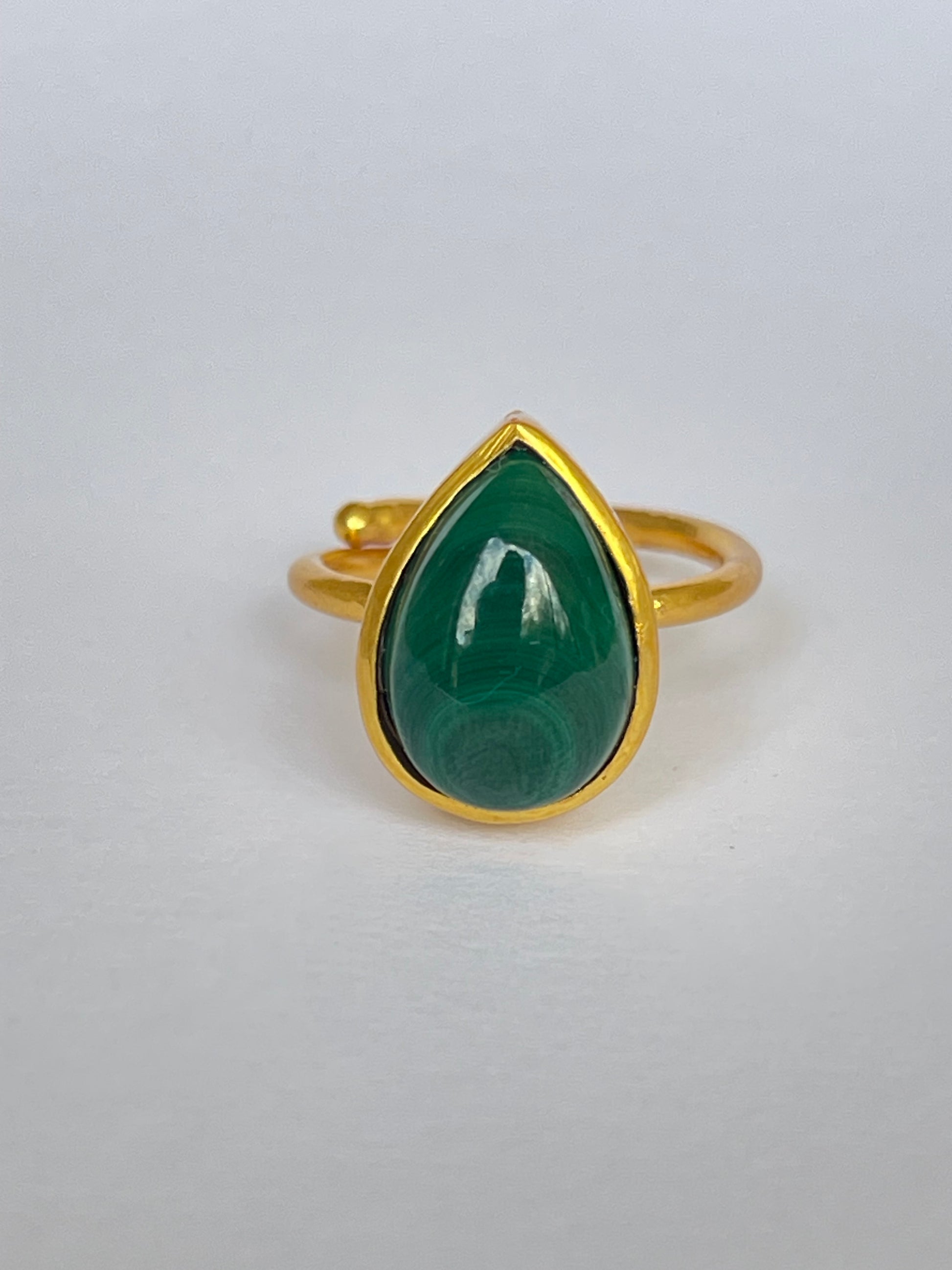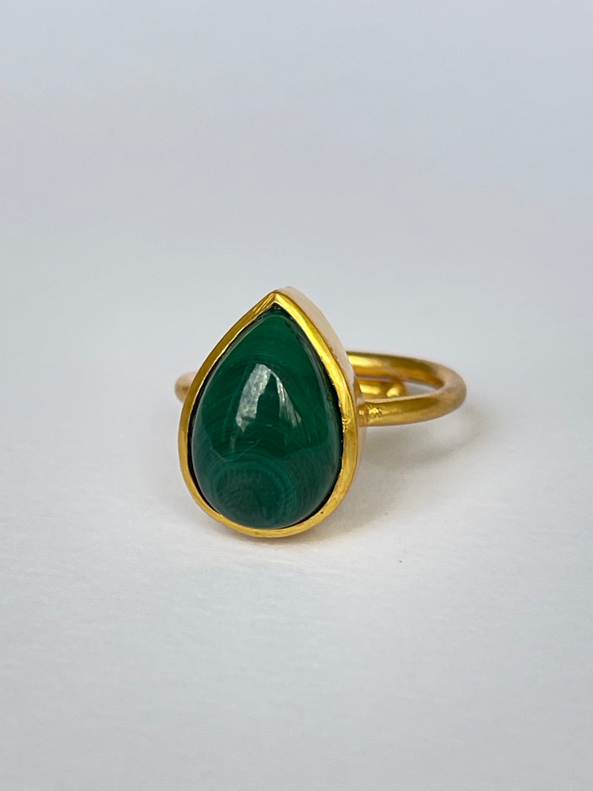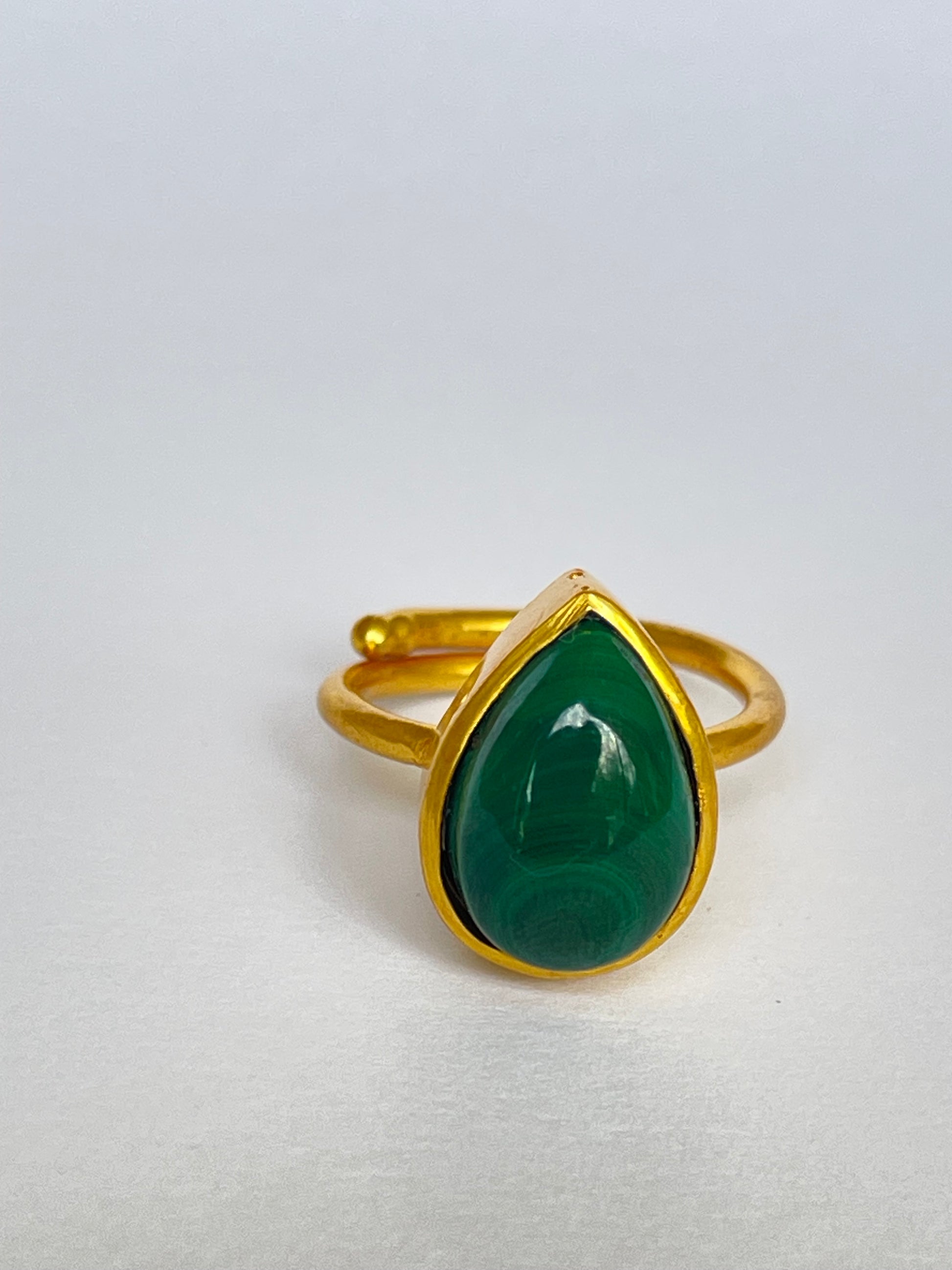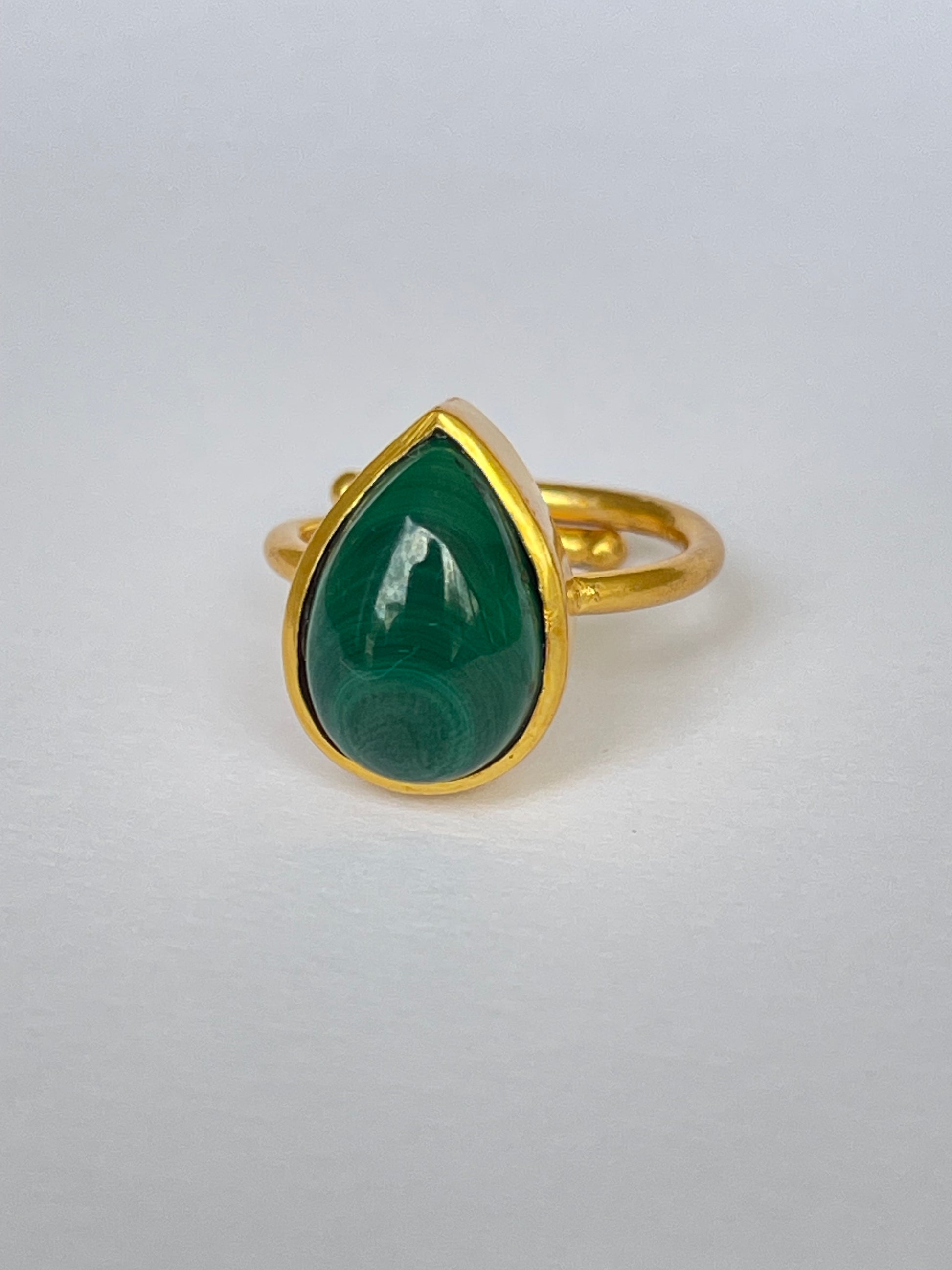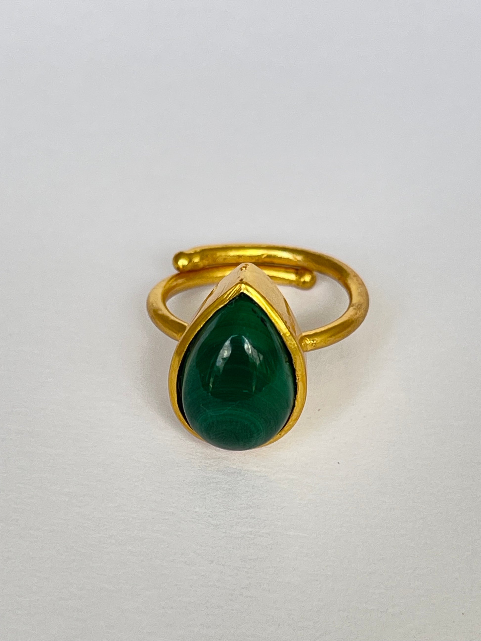 The Suiba Ring channels the serene rhythm of nature through its teardrop-shaped malachite gemstone. Set in 18k gold-plated brass, its rich green bands mirror the flow of rivers and the calm of deep forests — a perfect fusion of strength and serenity.