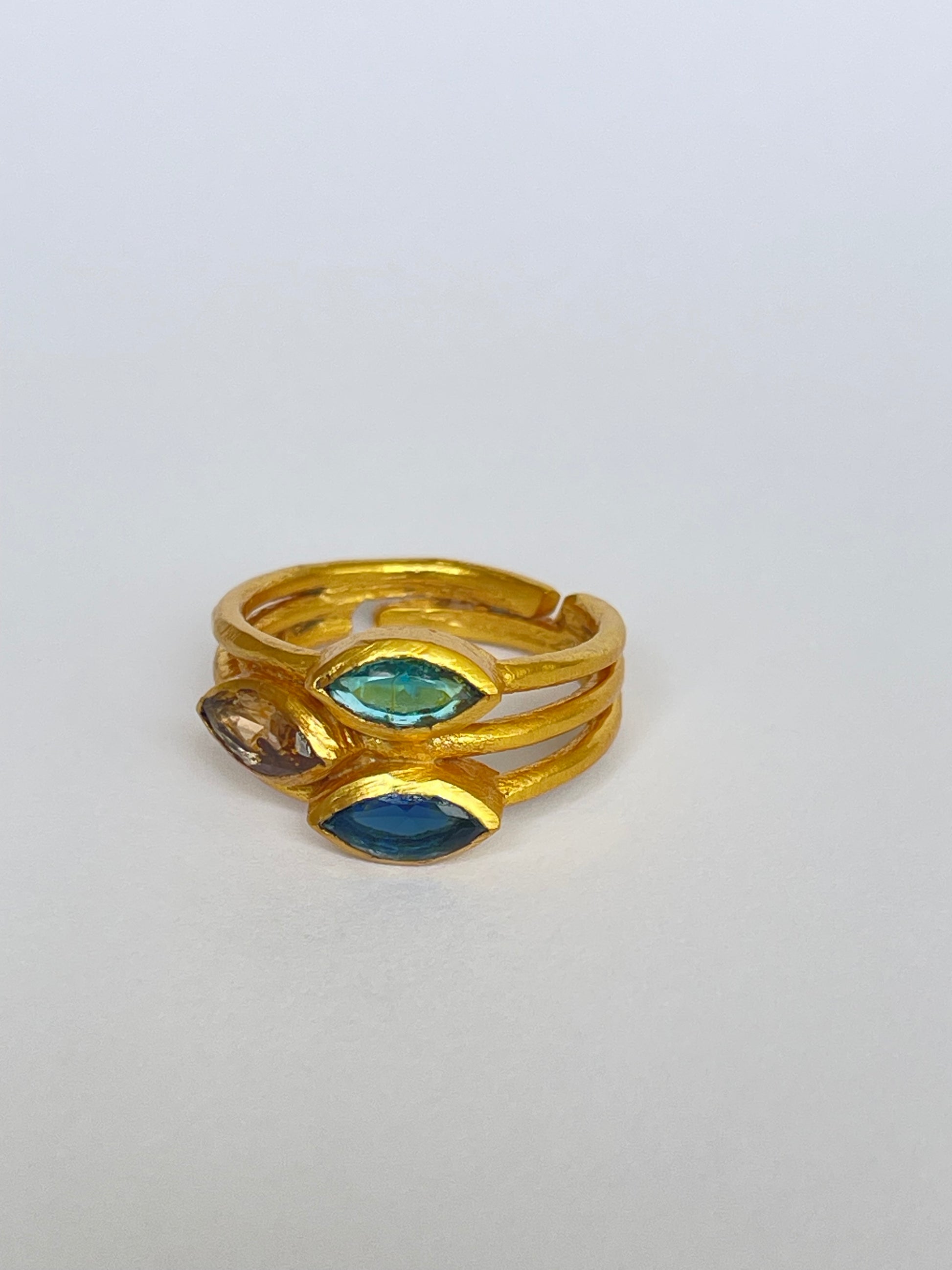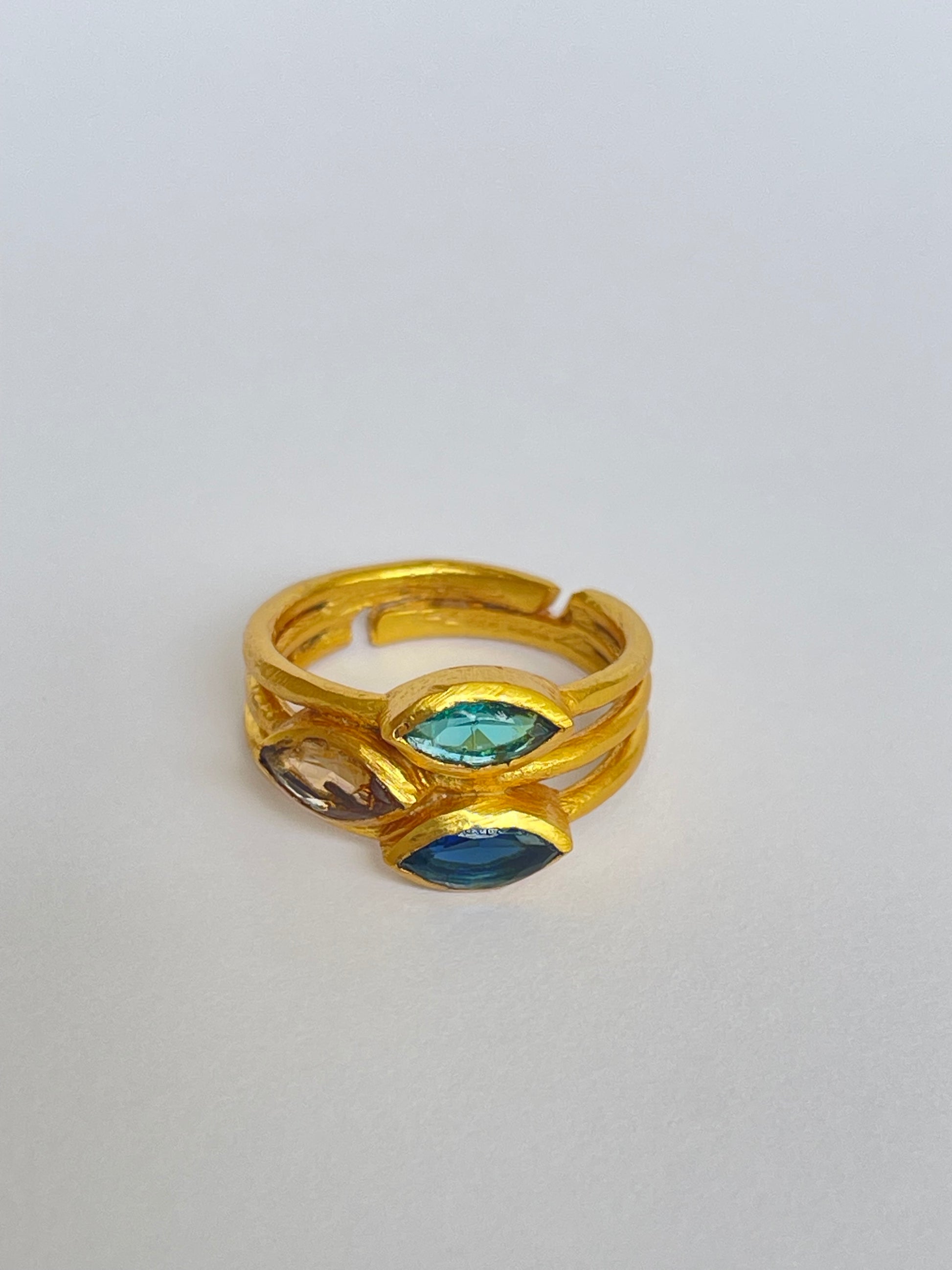The Mitsuba Ring features three faceted marquise-cut gemstones gracefully stacked on a golden band. The layered design makes it bold yet wearable, perfect for both everyday styling and special occasions. With its adjustable fit, it ensures comfort and versatility for every hand.