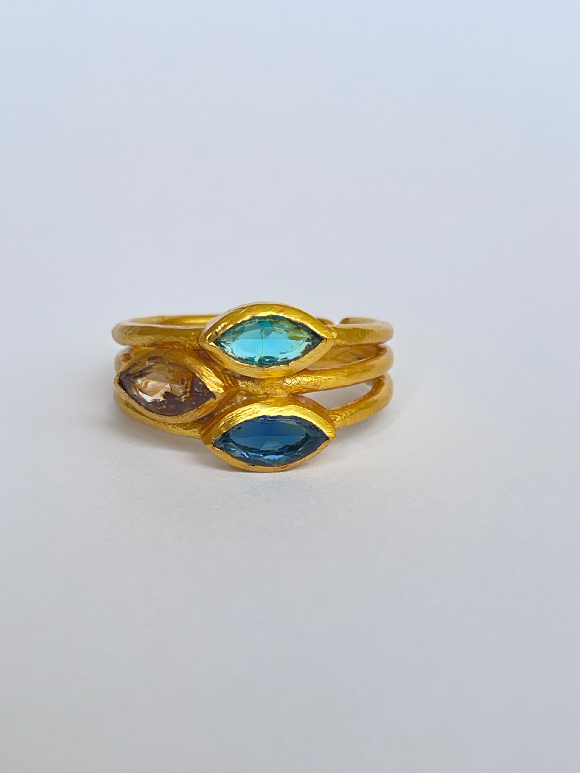 Elevate your look with the Mitsuba Ring, a stunning triple-stone design that combines elegance with meaning. Featuring three marquise-cut gemstones set in rich gold, this ring radiates balance, beauty, and sophistication.