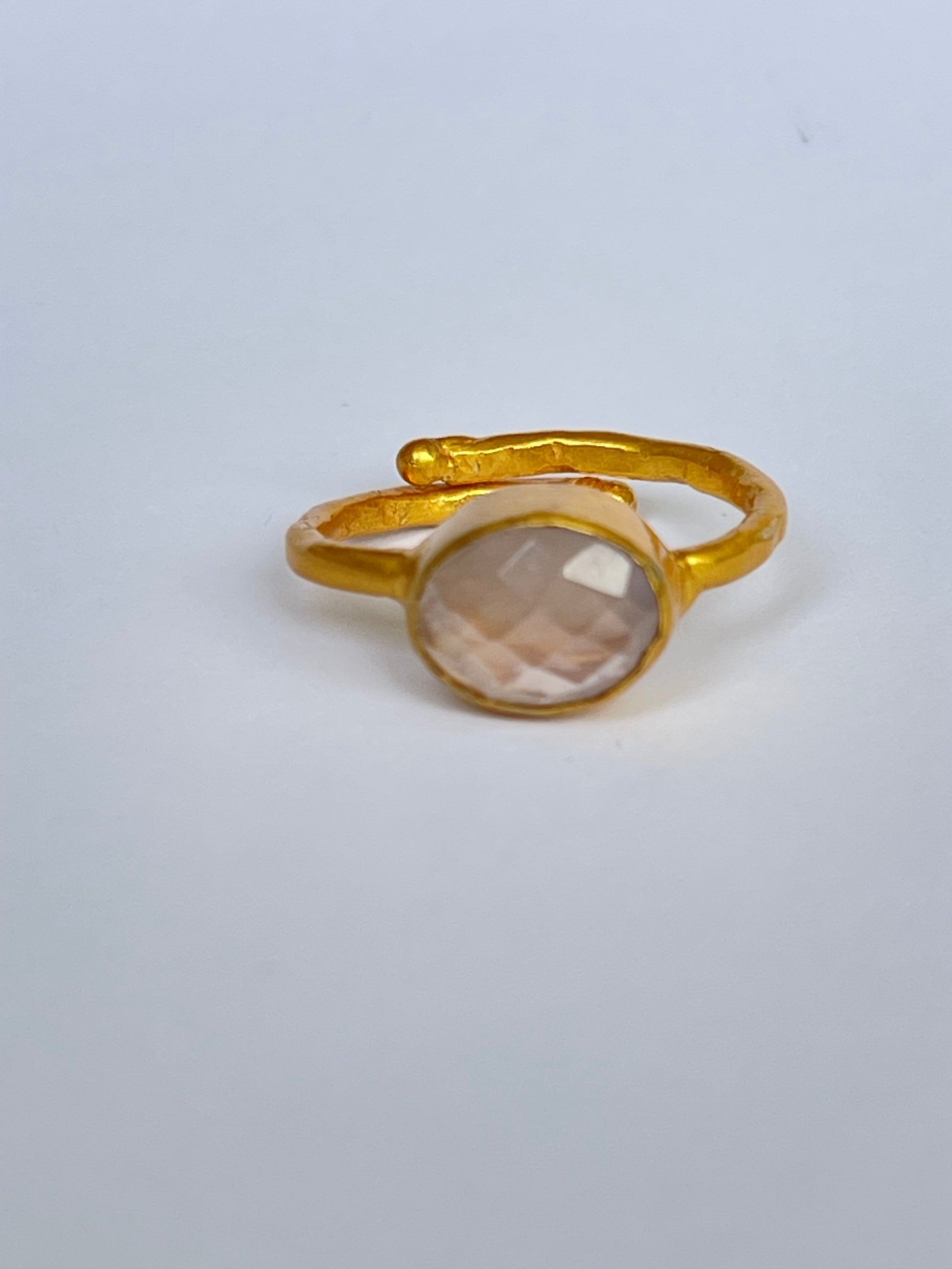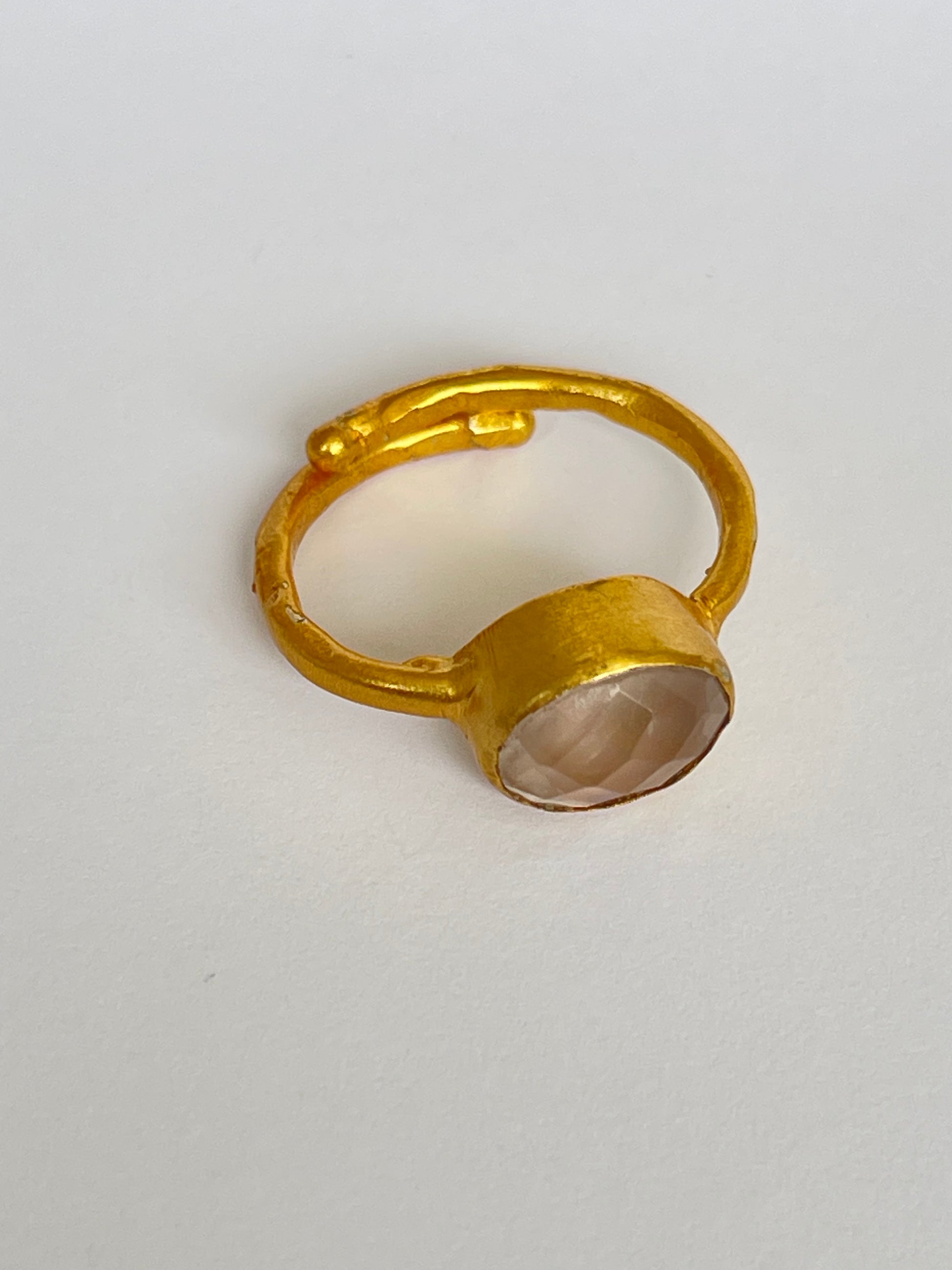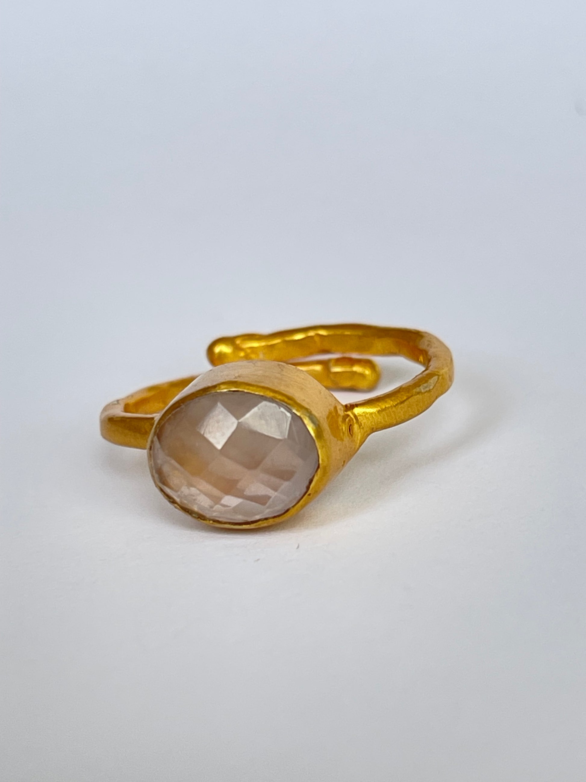 The Sakura-ishi Ring glows with soft femininity through its delicate rose quartz gemstone, elegantly faceted to reflect light with subtle grace. Set in 18k gold-plated brass, the ring blends timeless craftsmanship with a whisper of romance.
