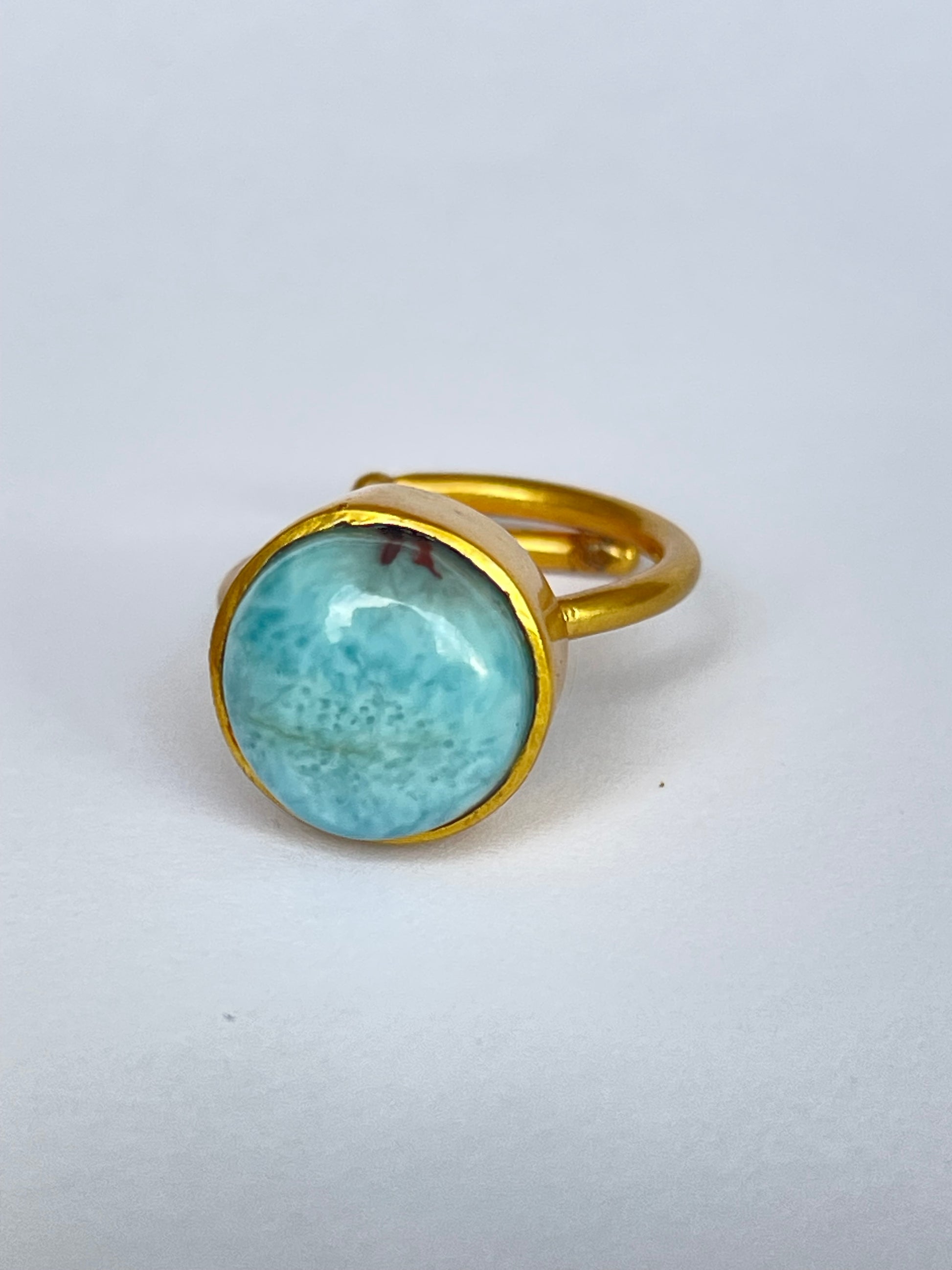 The Umisora Ring is crafted with a rare round Larimar gemstone, set in a luminous 18k gold-plated frame. Its dreamy blue marbling reflects the sea and sky, carrying a calm yet striking presence that feels both grounding and ethereal.