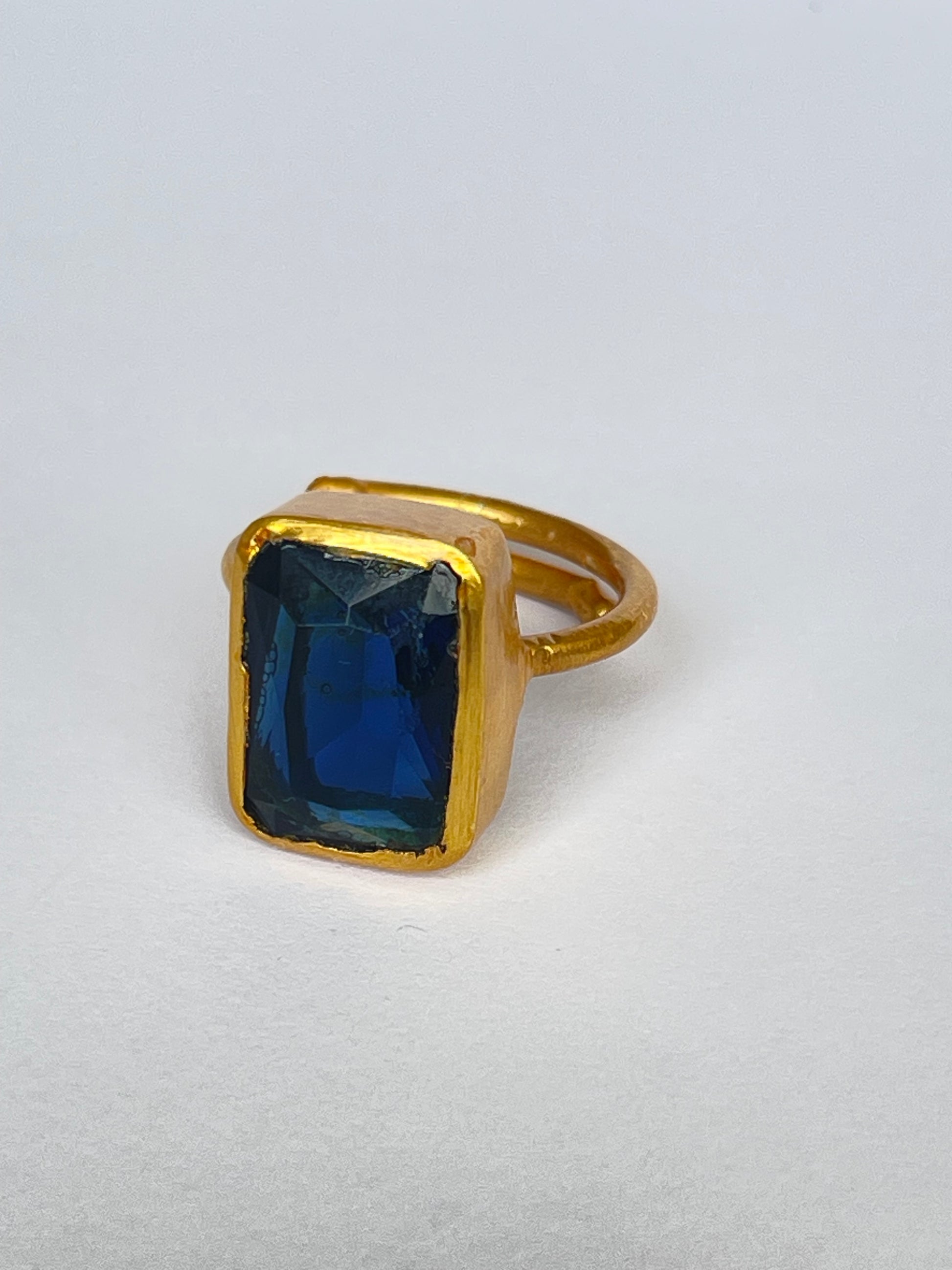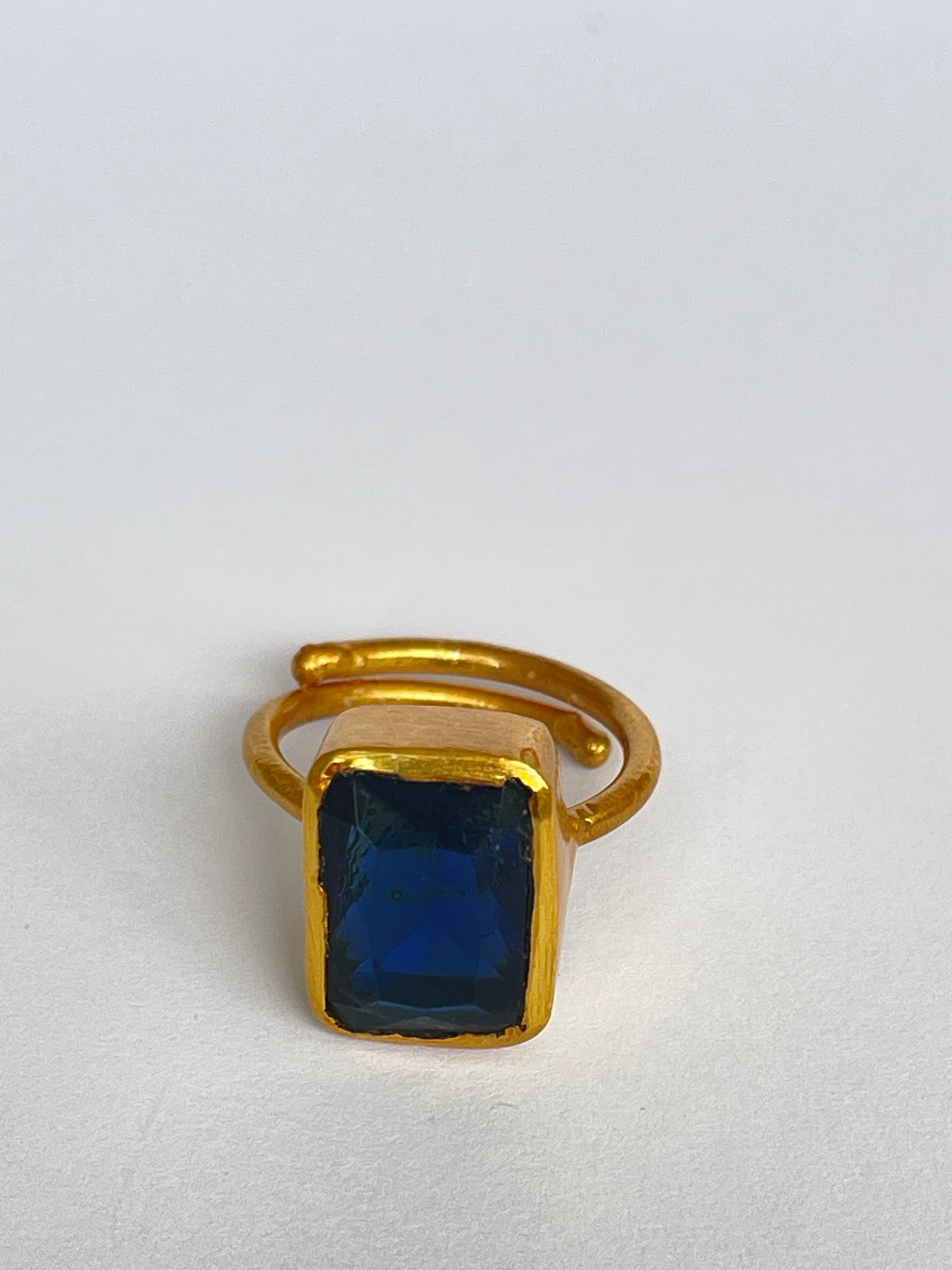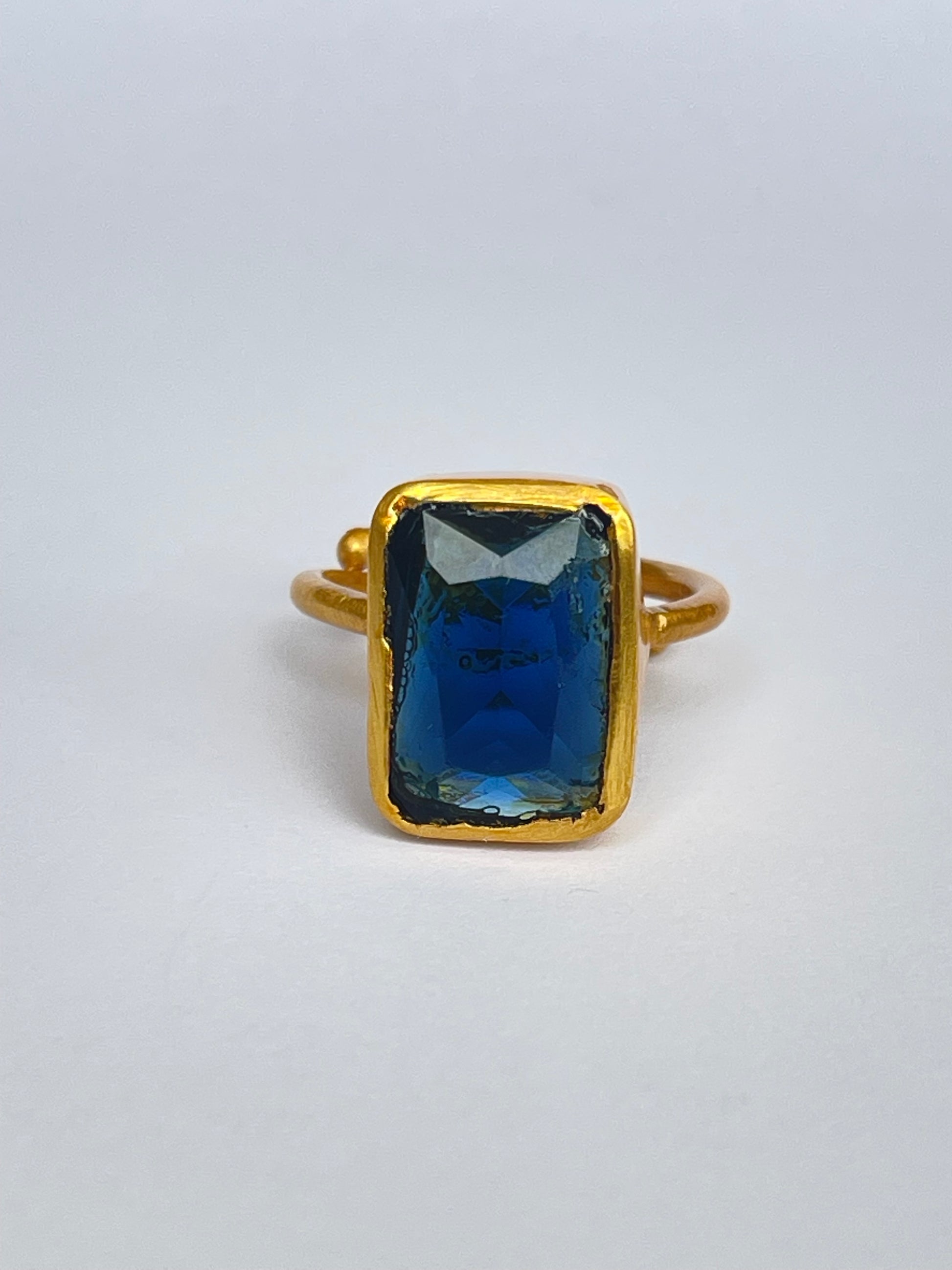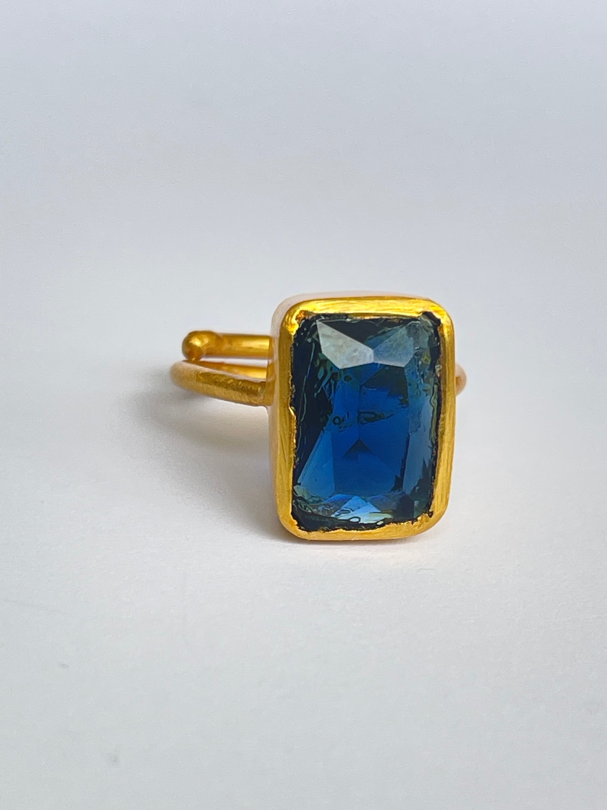 The Sōkai Ring evokes the serenity and strength of the deep ocean. Featuring a striking rectangular-cut blue topaz, its rich azure hue radiates calm elegance, while the 18k gold-plated brass setting enhances its timeless luxury.
