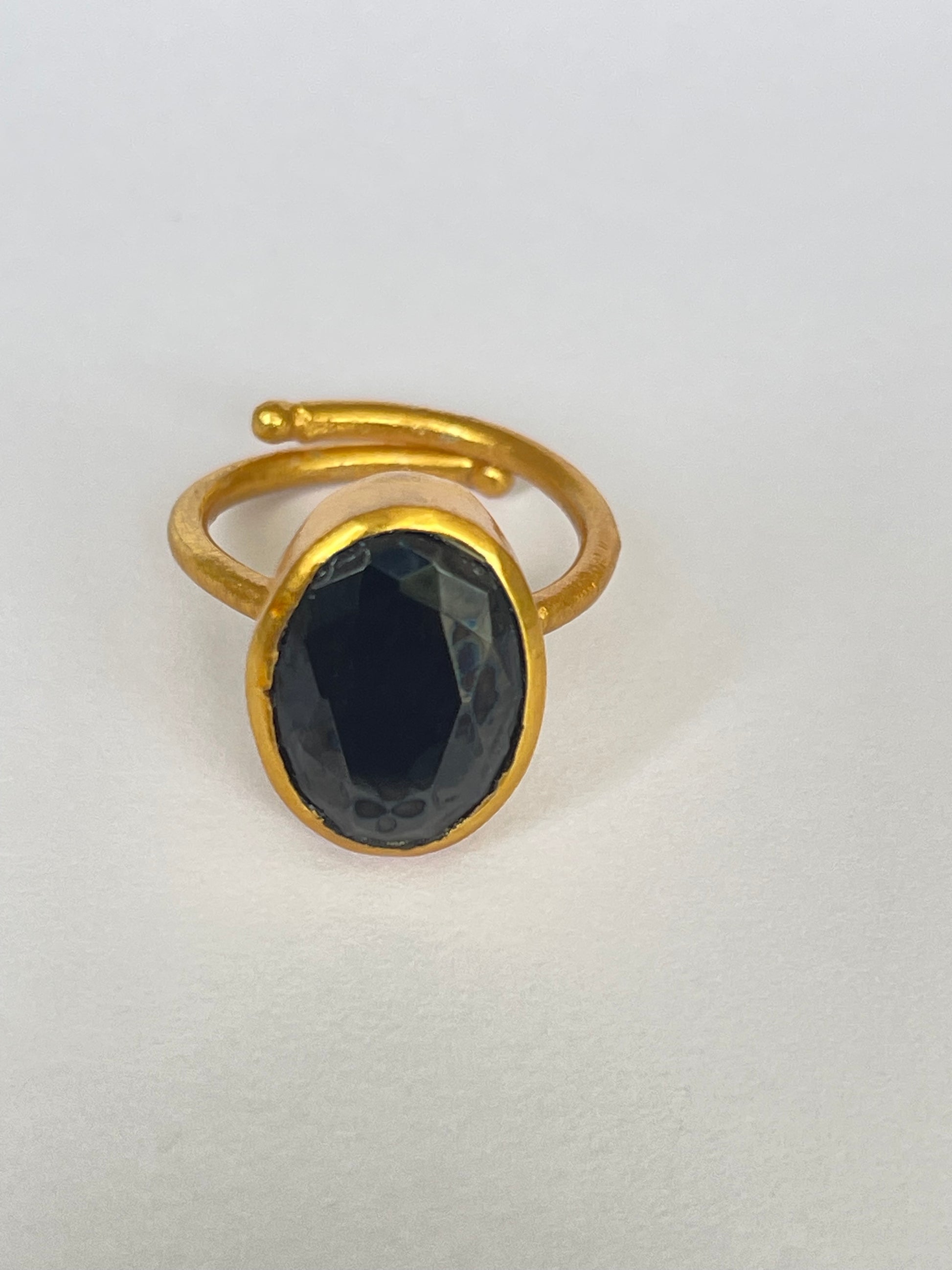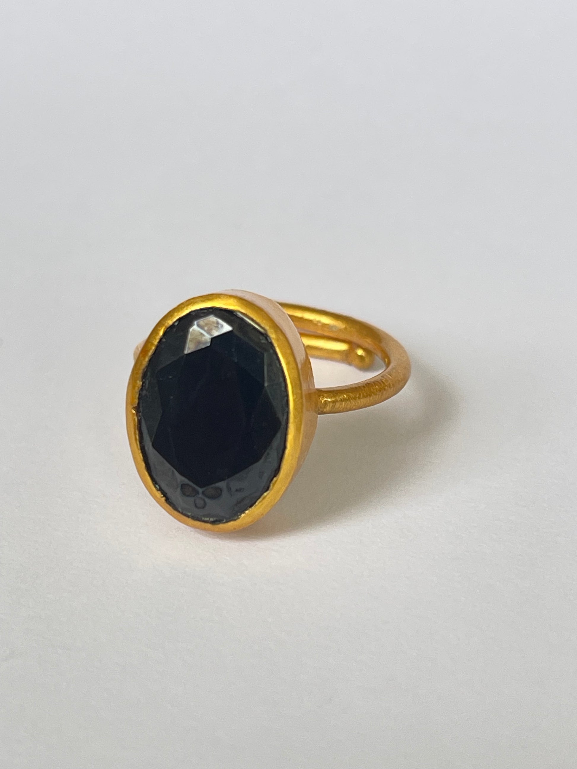 The Tsukikage Ring channels the quiet strength of moonlight against a dark sky. Its faceted black onyx gemstone, framed in 18k gold-plated brass, exudes subtle drama and grounded sophistication — a modern symbol of elegance with depth.