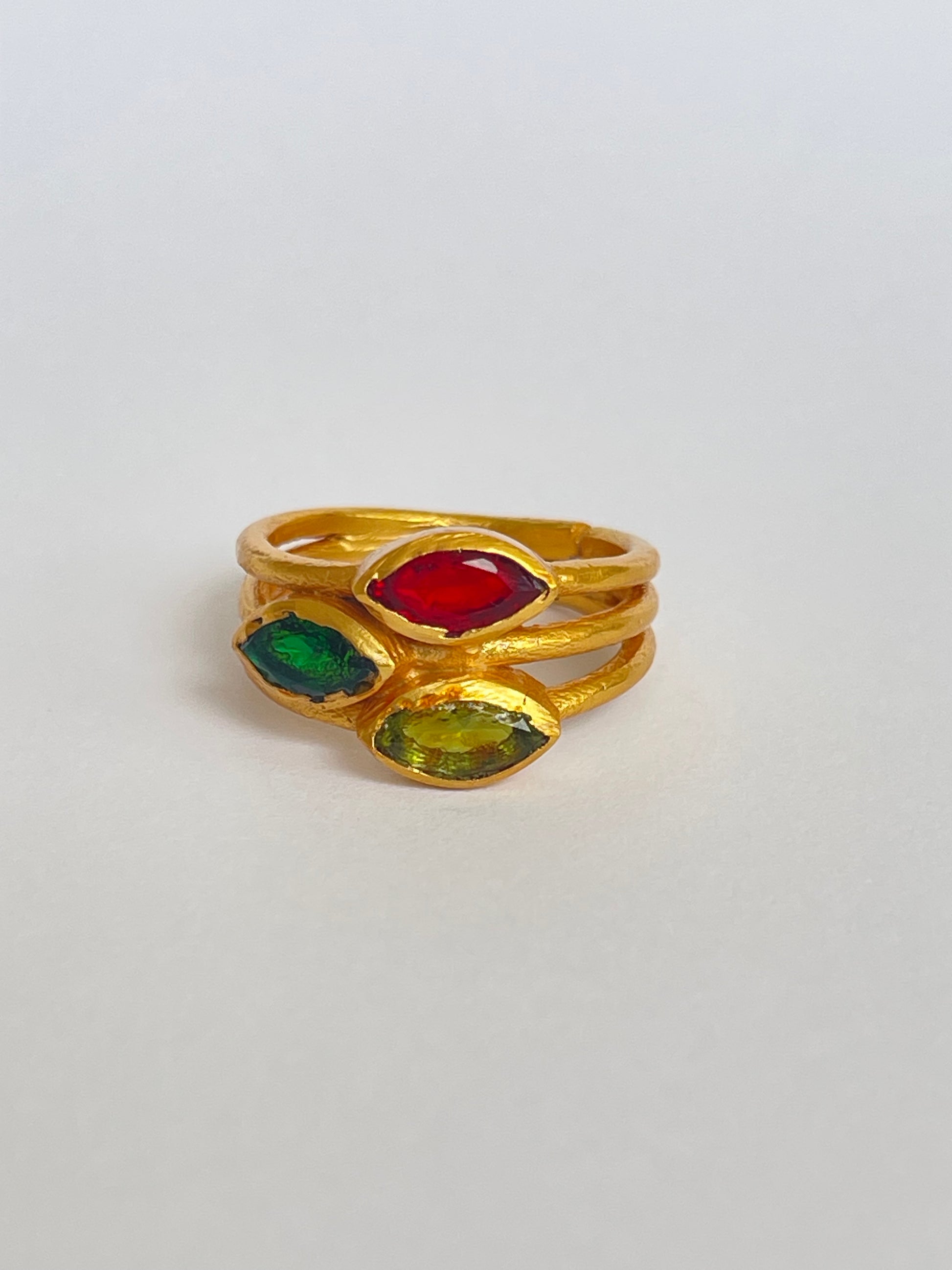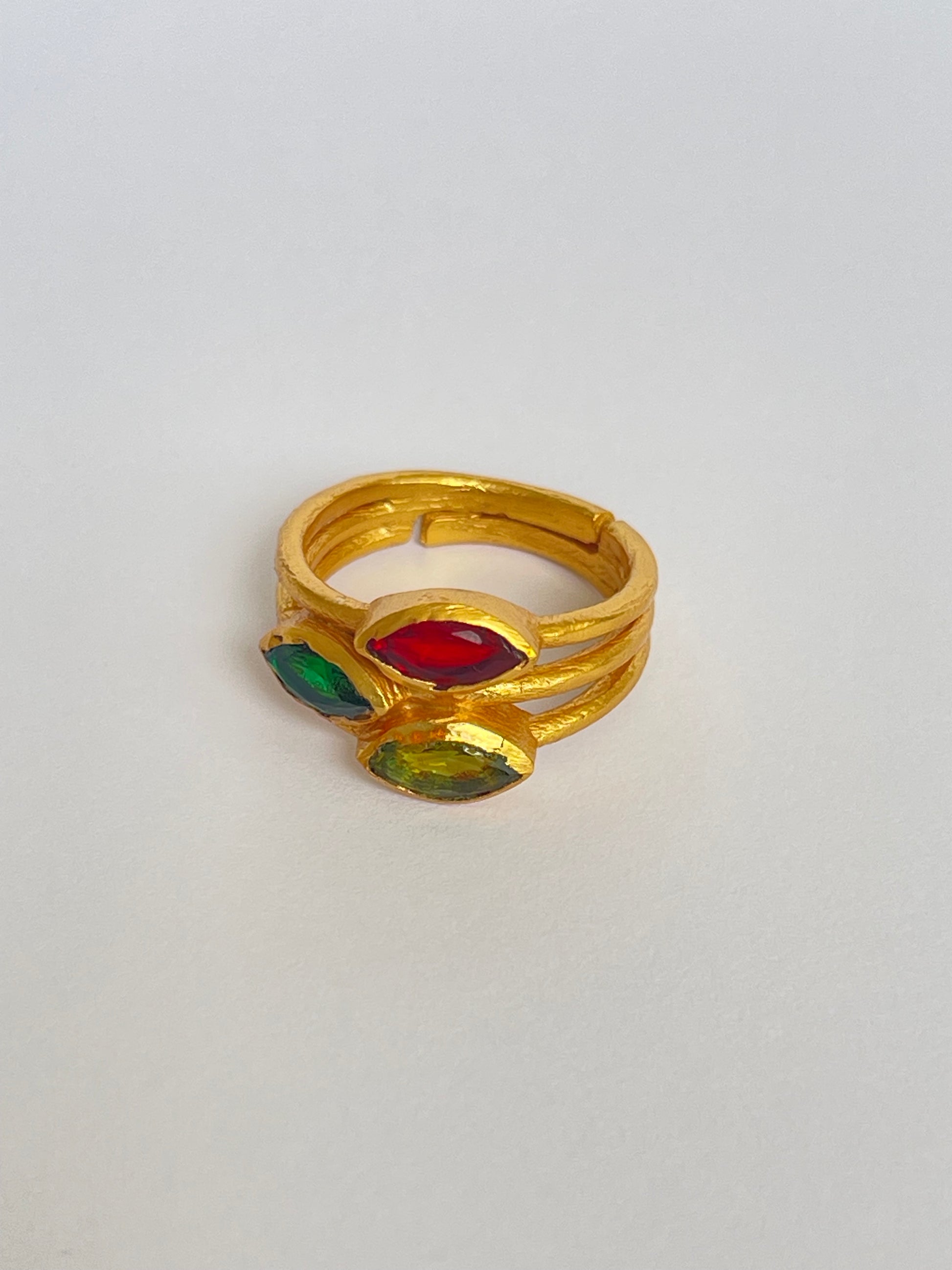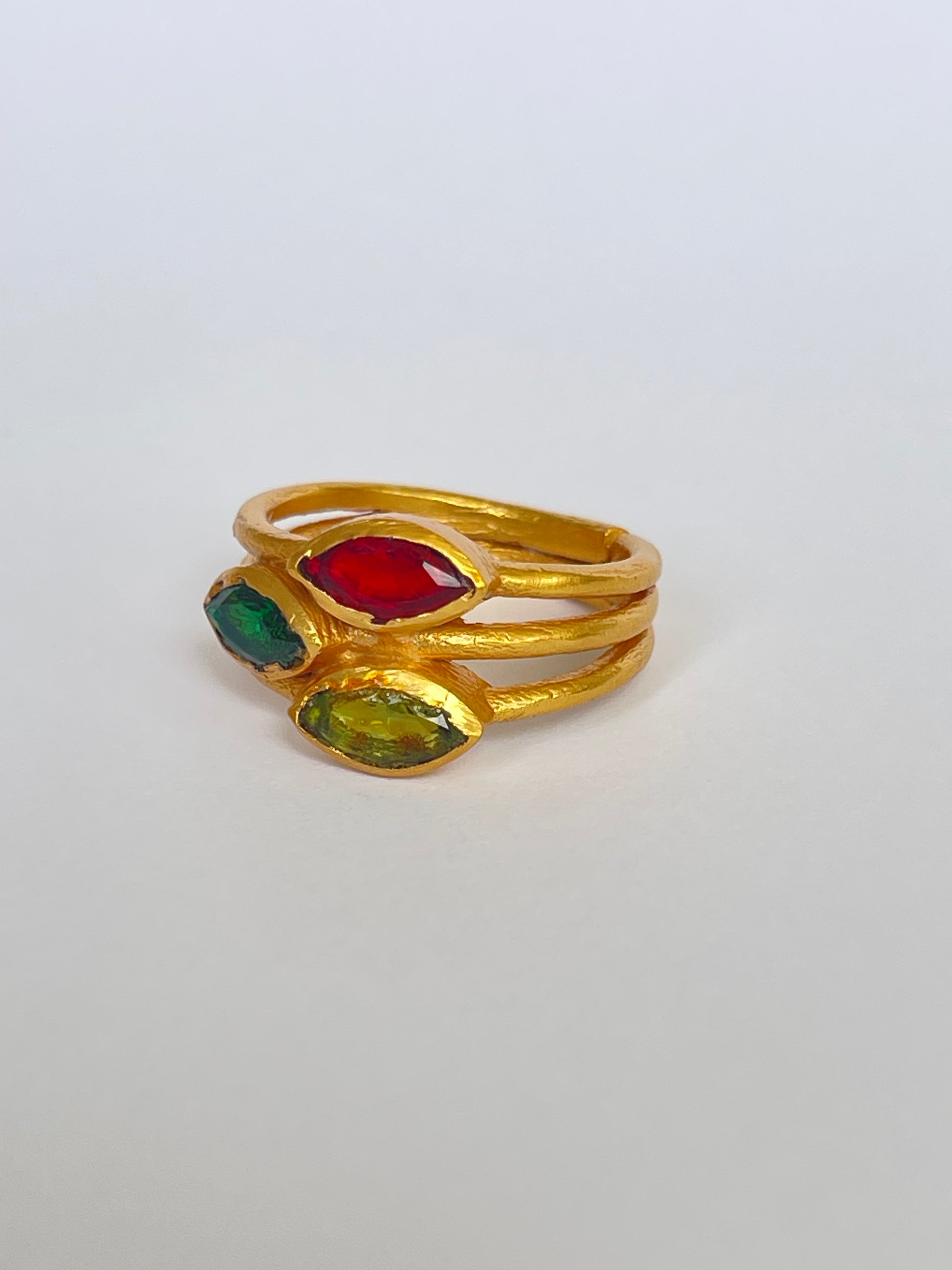 The Mitsuba Ring features three faceted marquise-cut gemstones gracefully stacked on a golden band. The layered design makes it bold yet wearable, perfect for both everyday styling and special occasions. With its adjustable fit, it ensures comfort and versatility for every hand.