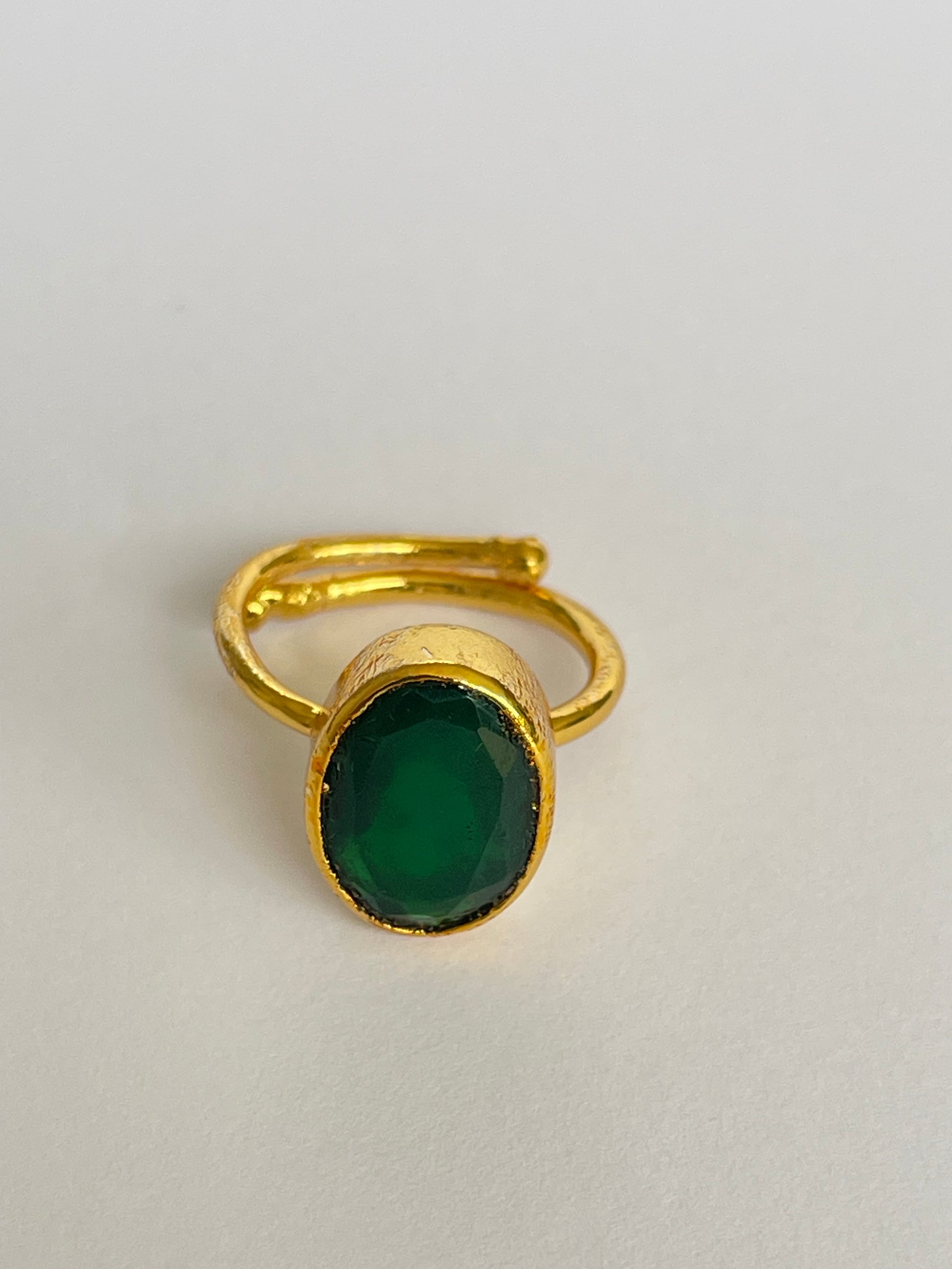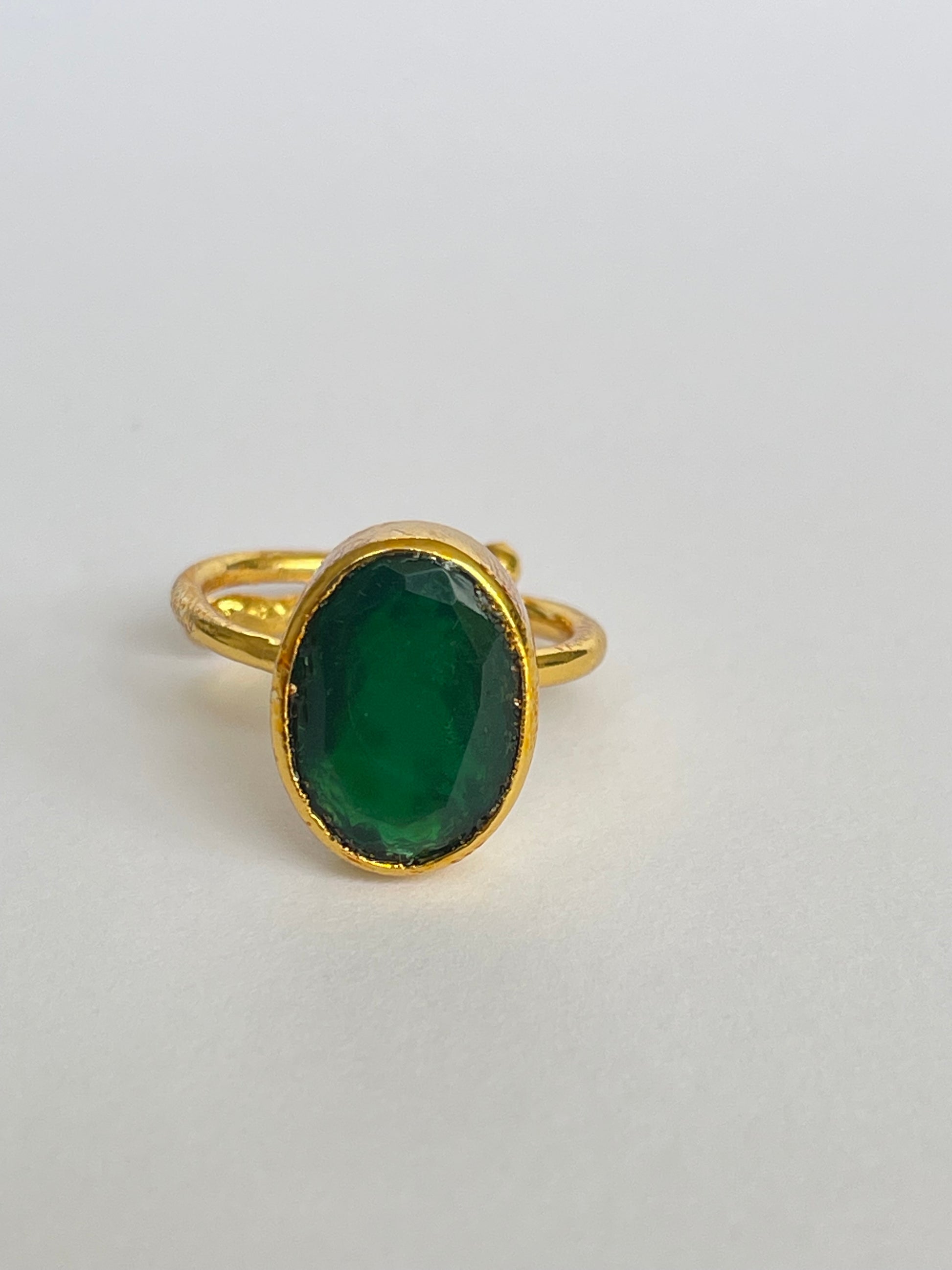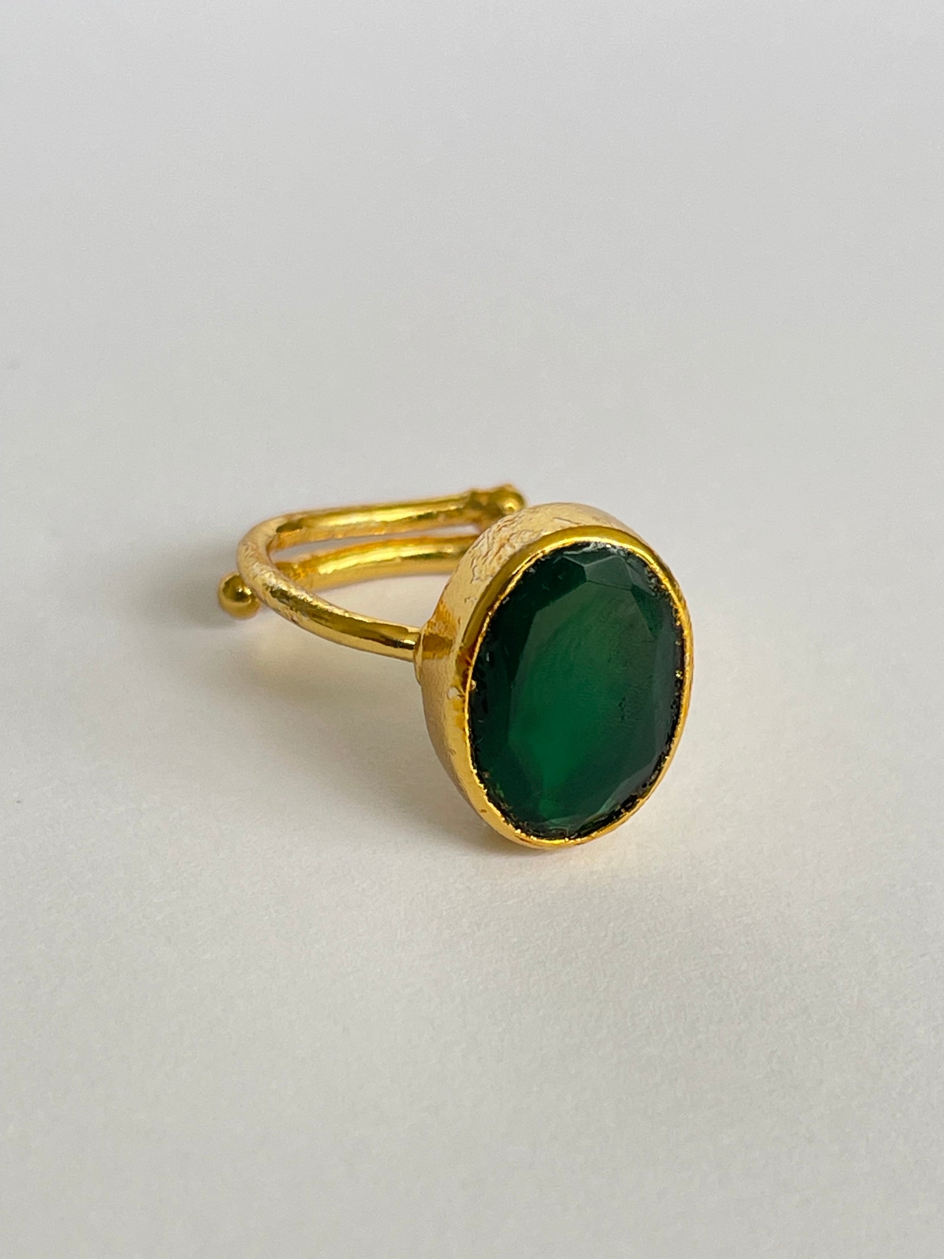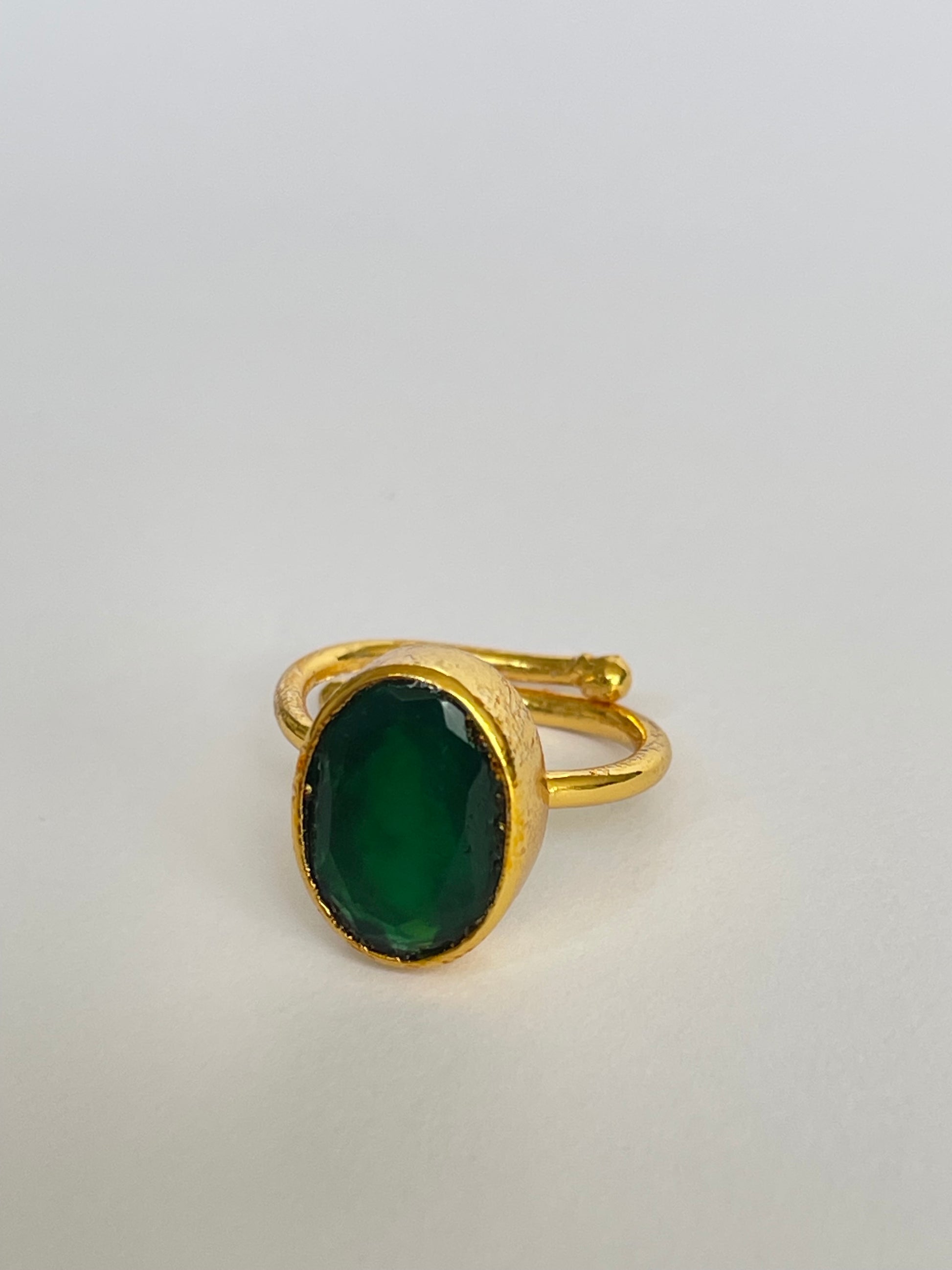 The Ryokukō Ring radiates an aura of refined confidence — its deep green gemstone glimmers like sunlight through forest canopies. Set in 18k gold-plated brass, this design captures timeless sophistication with a contemporary silhouette.