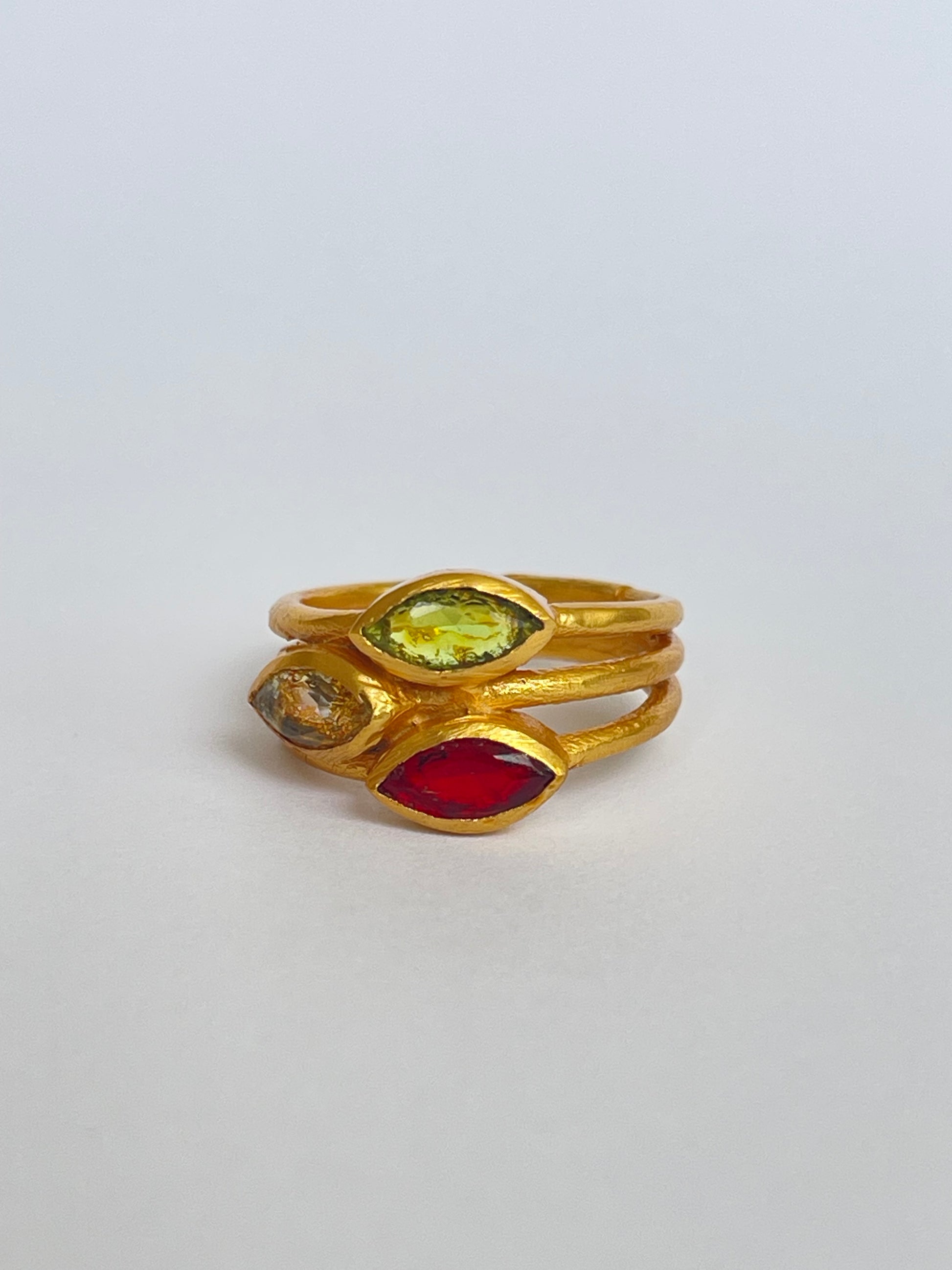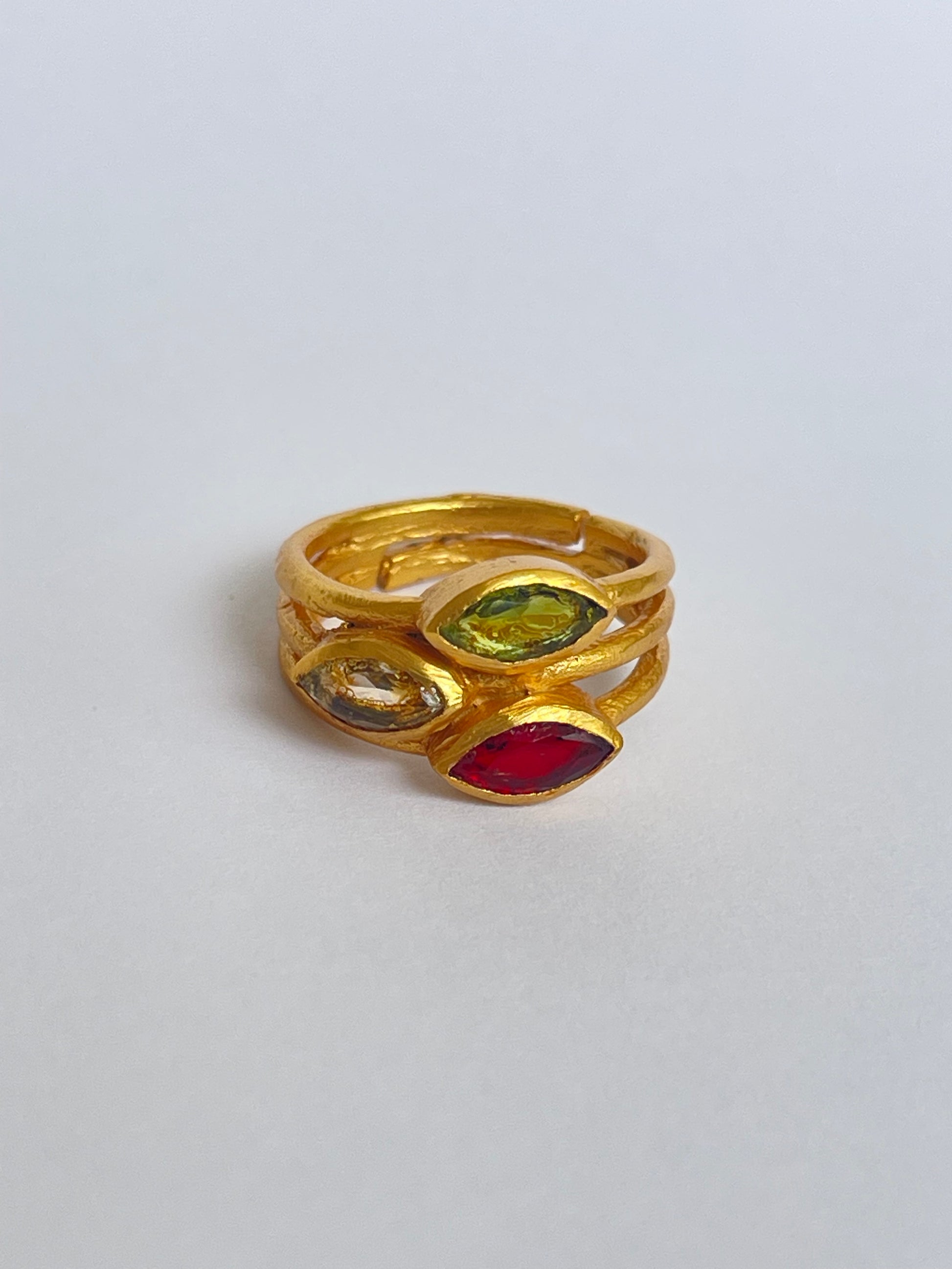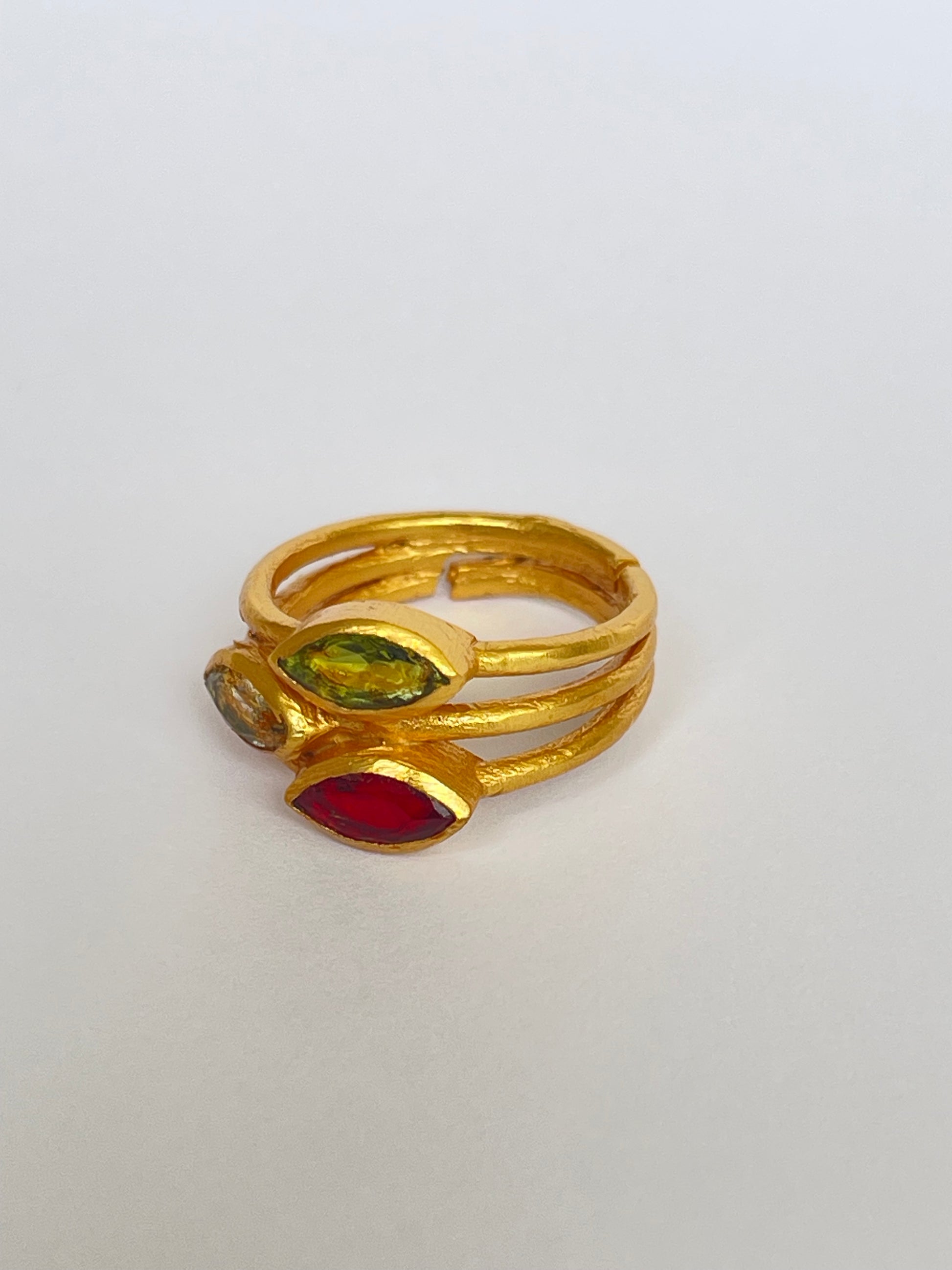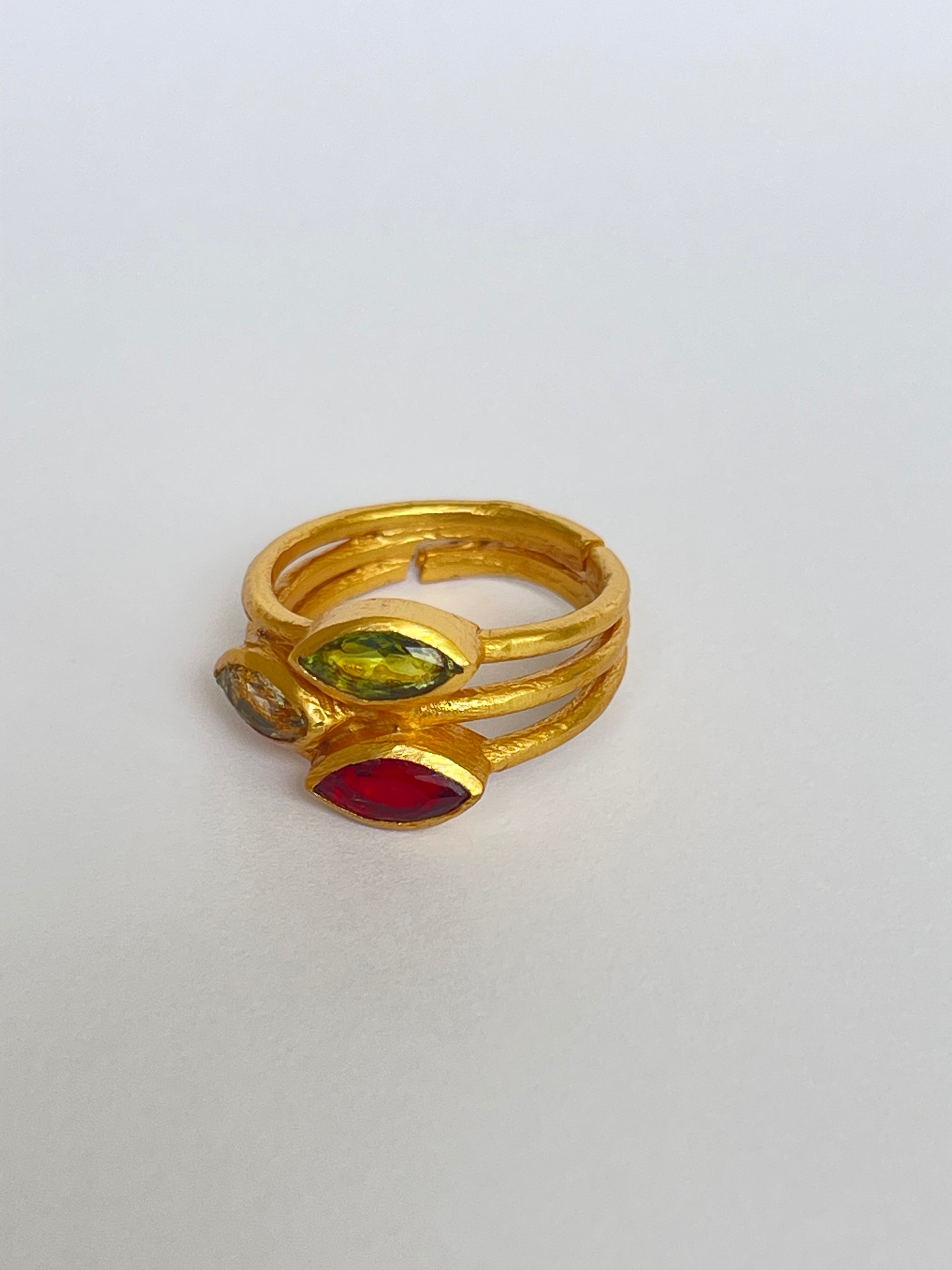 The Mitsuba Ring features three faceted marquise-cut gemstones gracefully stacked on a golden band. The layered design makes it bold yet wearable, perfect for both everyday styling and special occasions. With its adjustable fit, it ensures comfort and versatility for every hand.