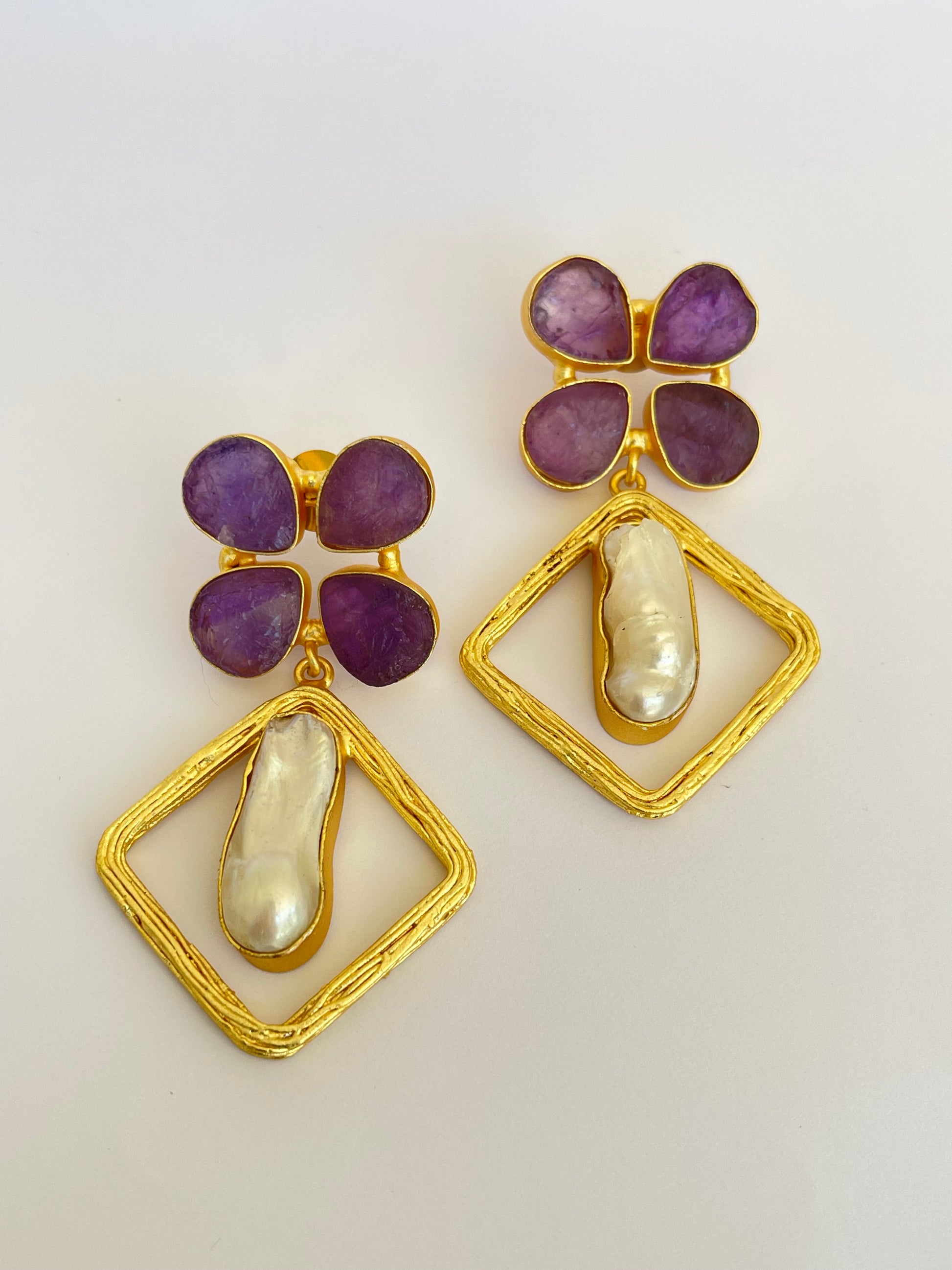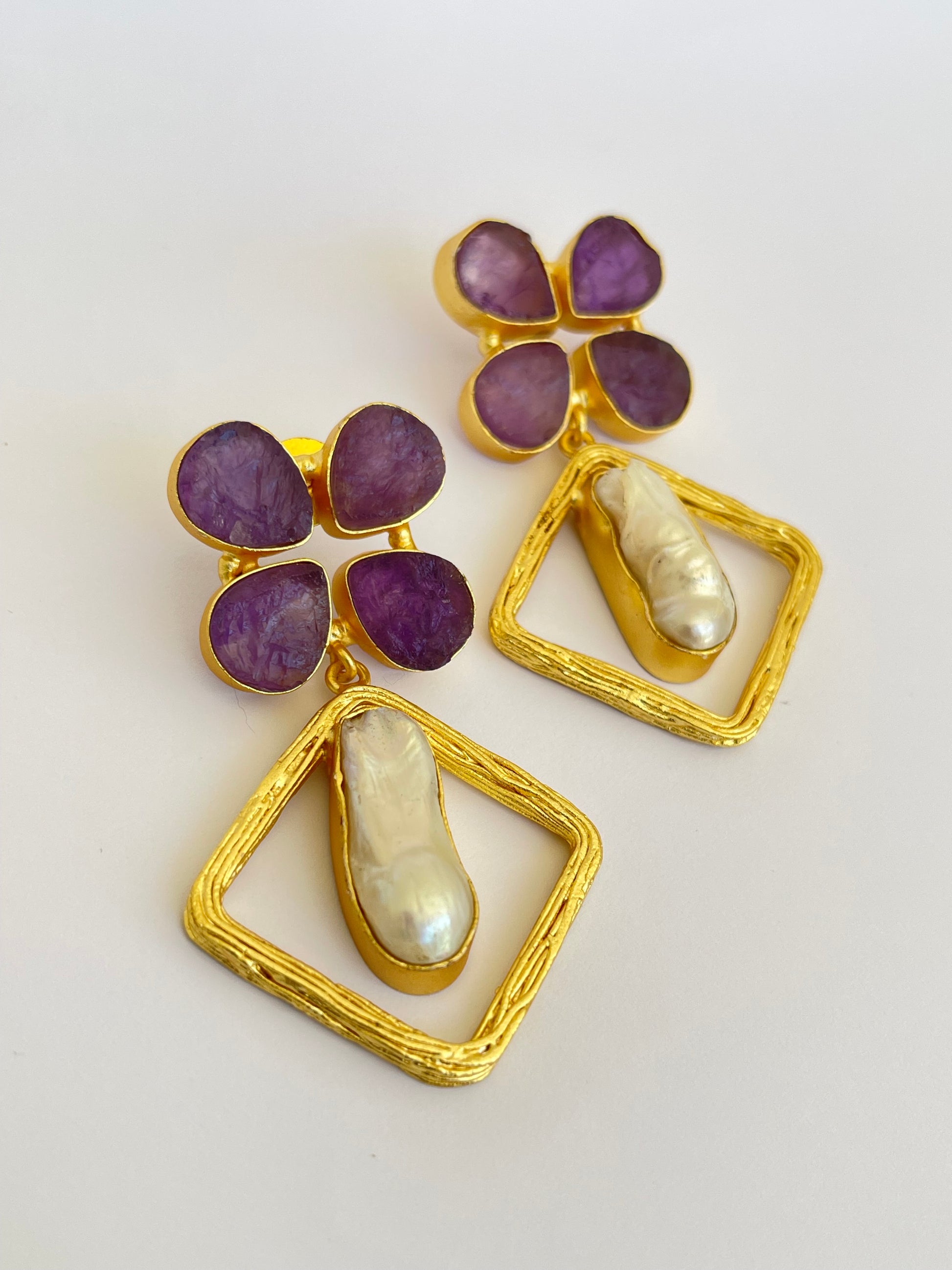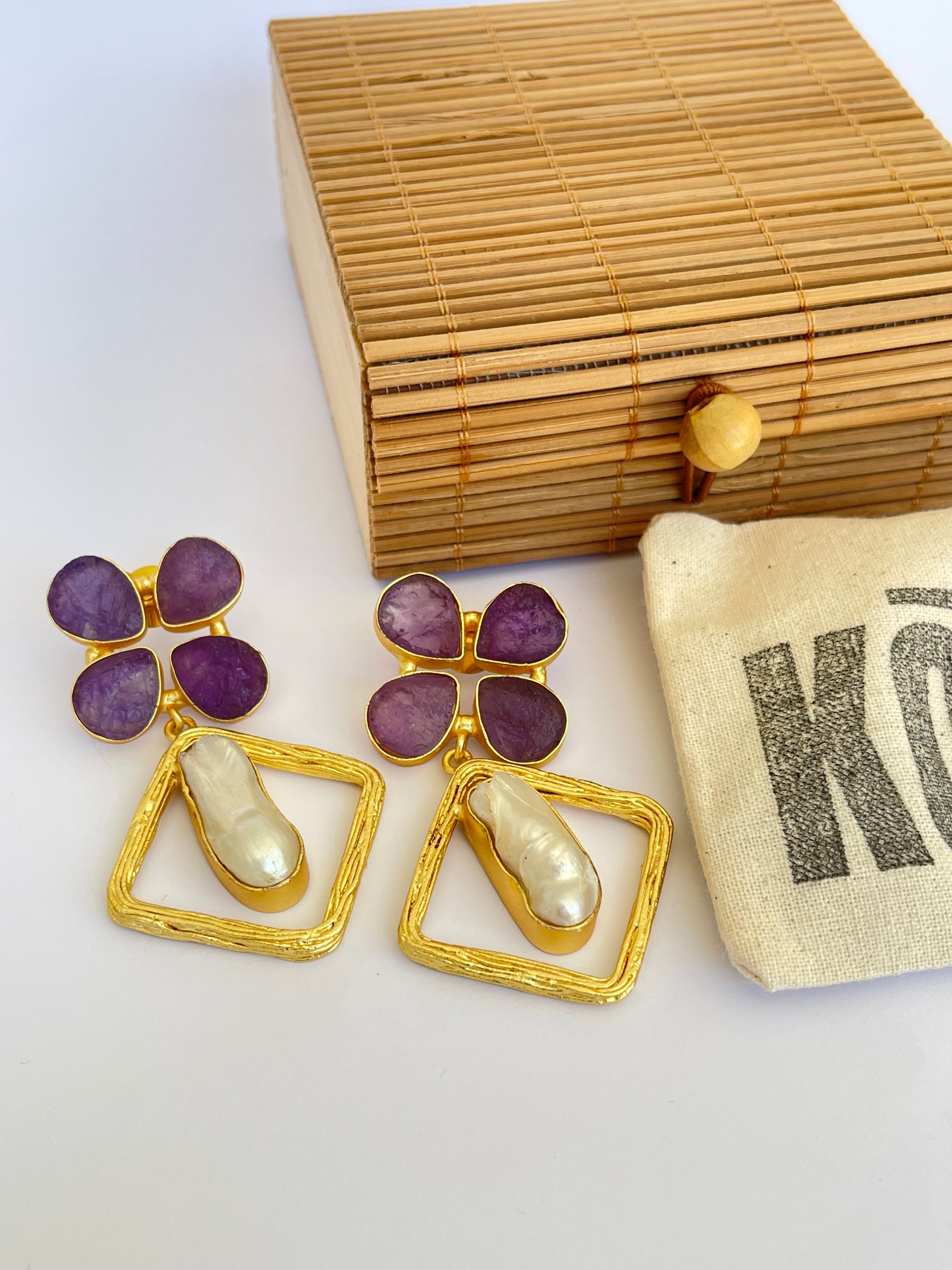 The Shifū Earrings embody ethereal movement and luminous contrast. Faceted amethyst petals form a delicate floral silhouette, gracefully anchored by baroque pearls framed in hand-textured gold. Sculptural yet fluid, this design celebrates the balance between strength and femininity.