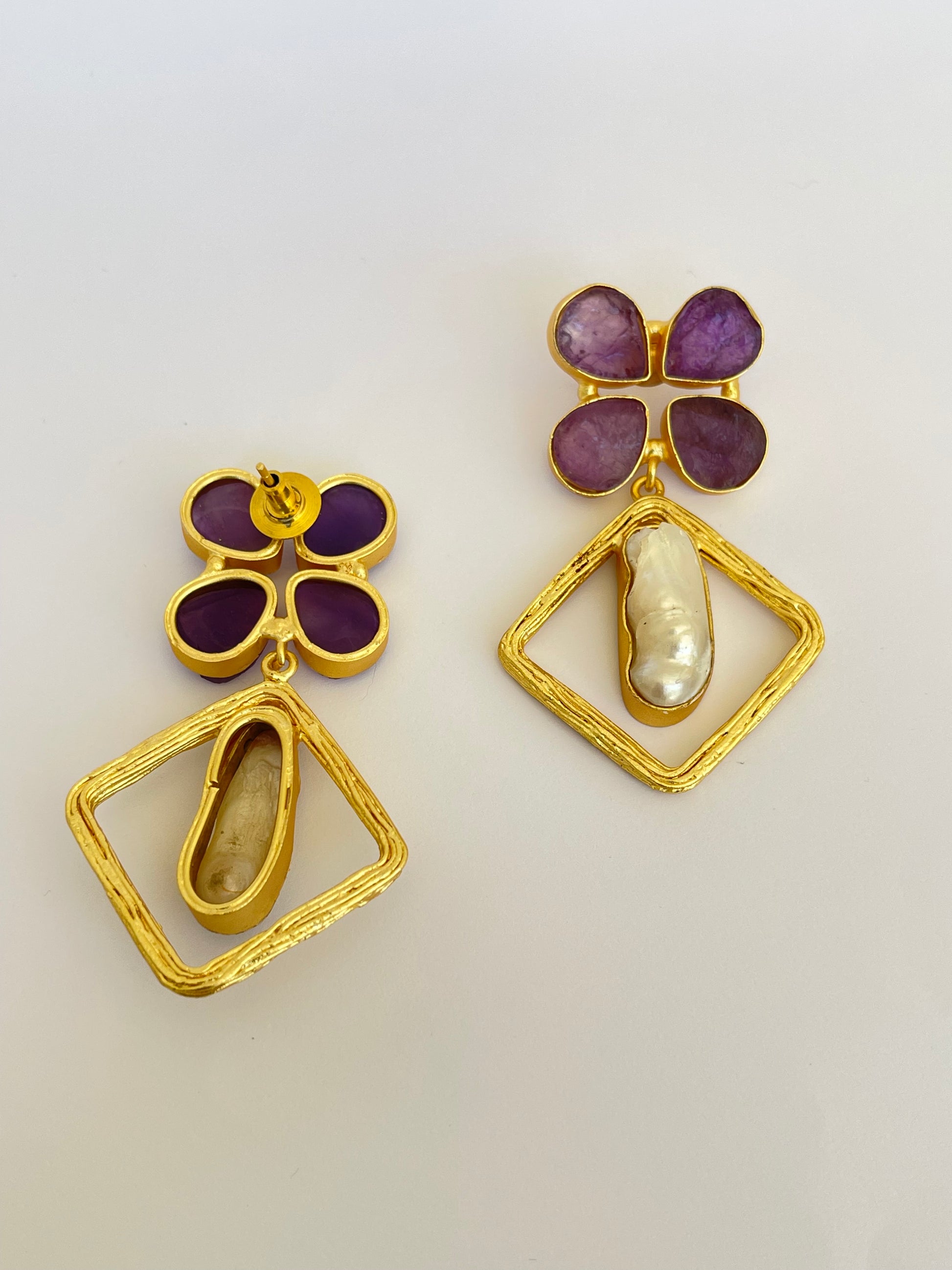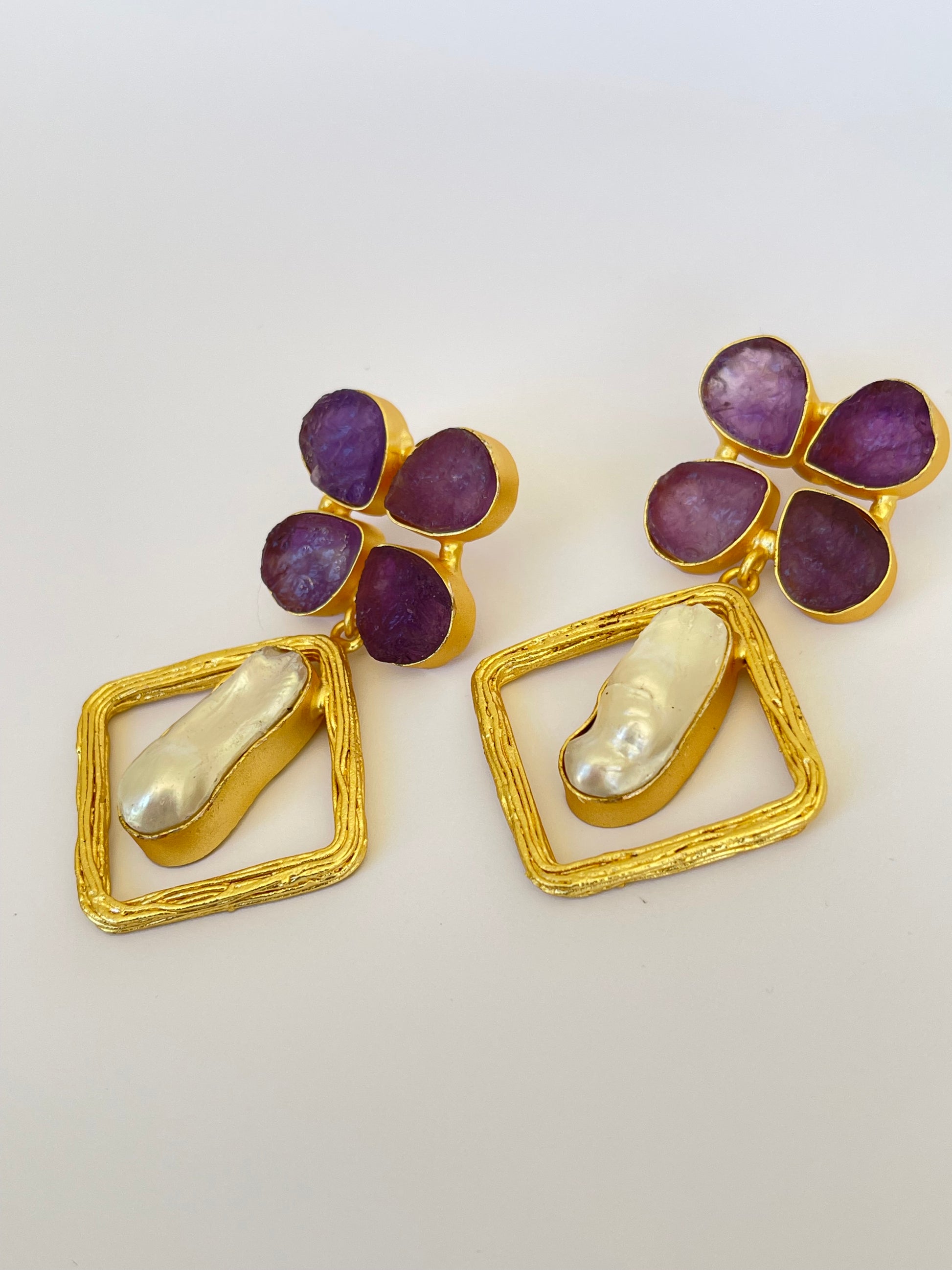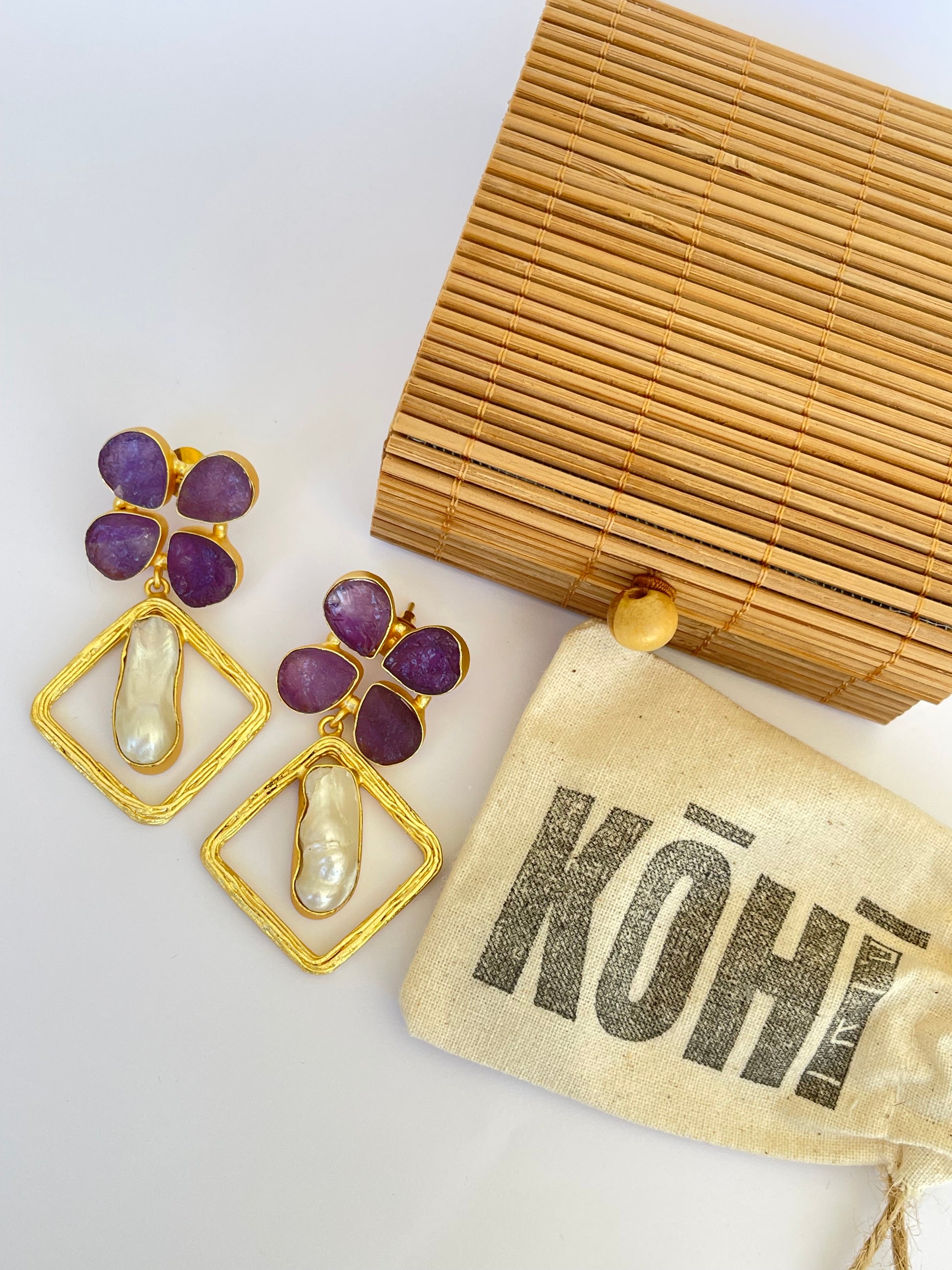 The Shifū Earrings embody ethereal movement and luminous contrast. Faceted amethyst petals form a delicate floral silhouette, gracefully anchored by baroque pearls framed in hand-textured gold. Sculptural yet fluid, this design celebrates the balance between strength and femininity.