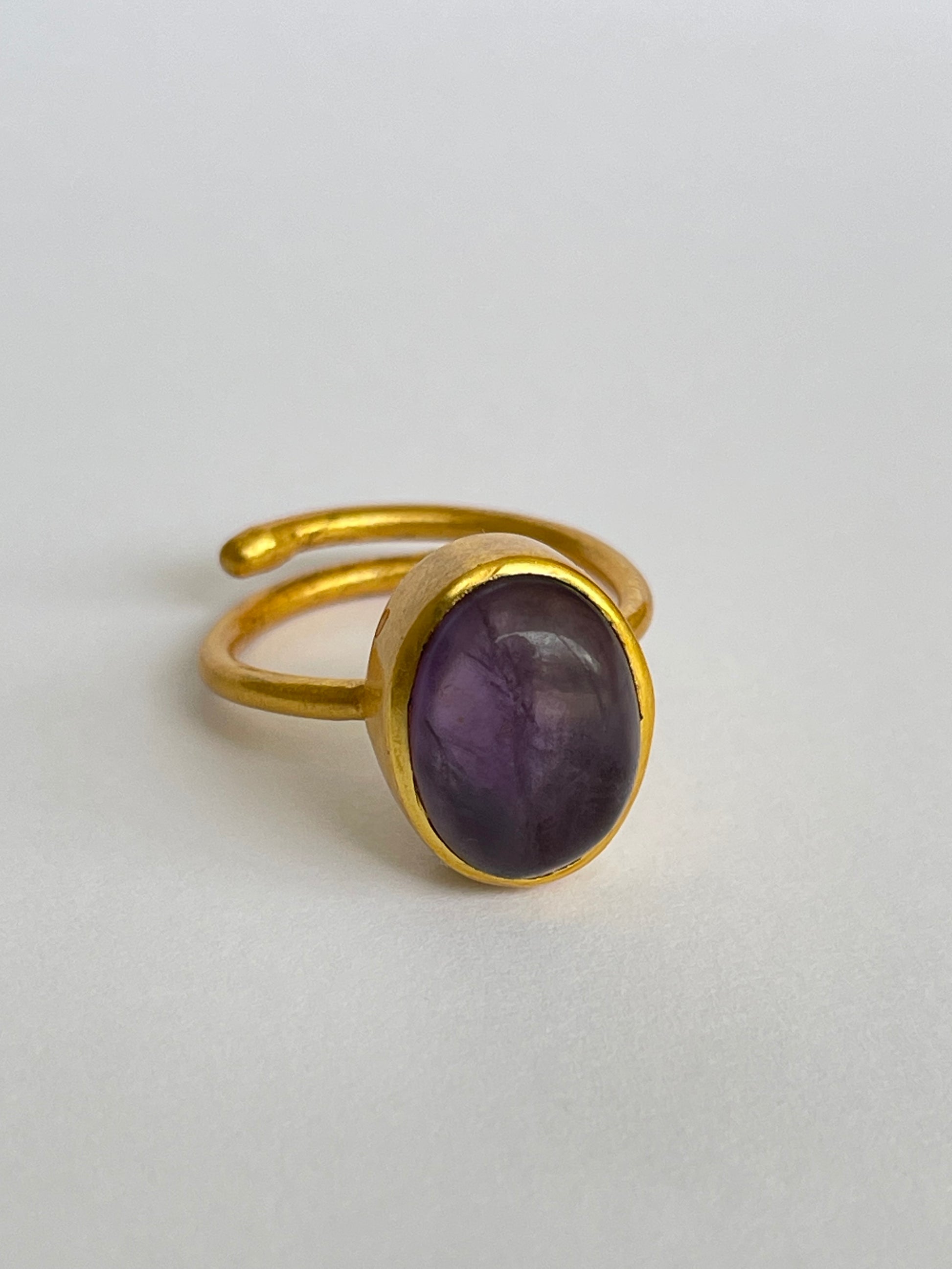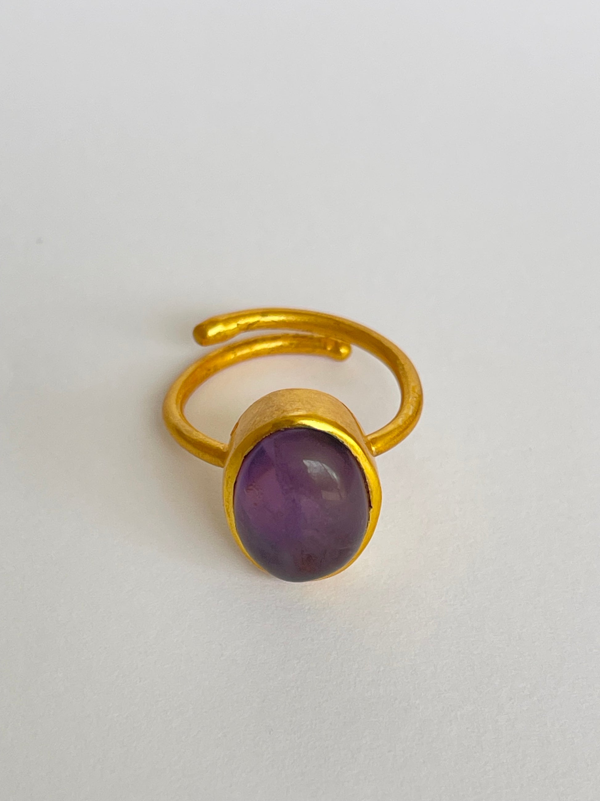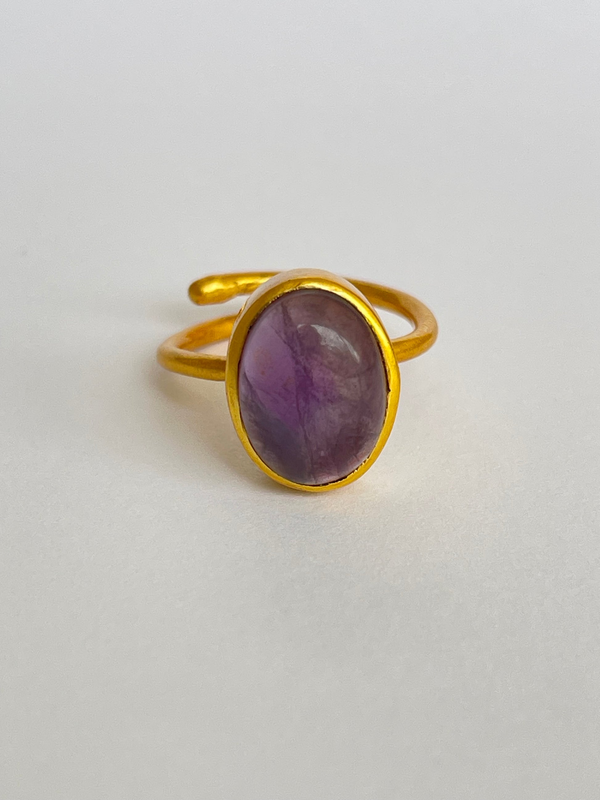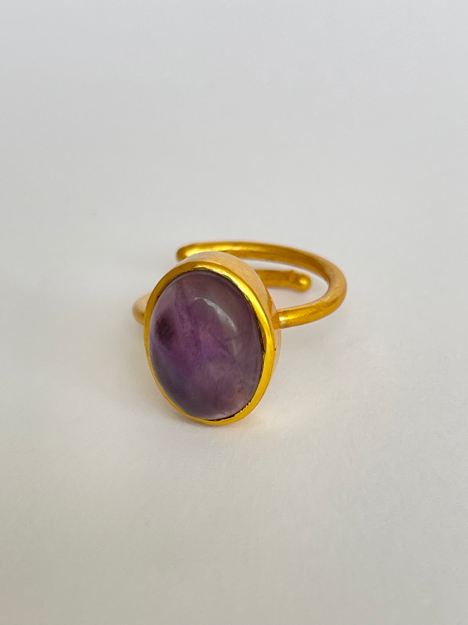 The Shion Ring glows with quiet grace — an oval amethyst nestled in luminous 18k gold-plated brass. Its soft violet hue carries a sense of calm and spiritual depth, like twilight meeting gold.