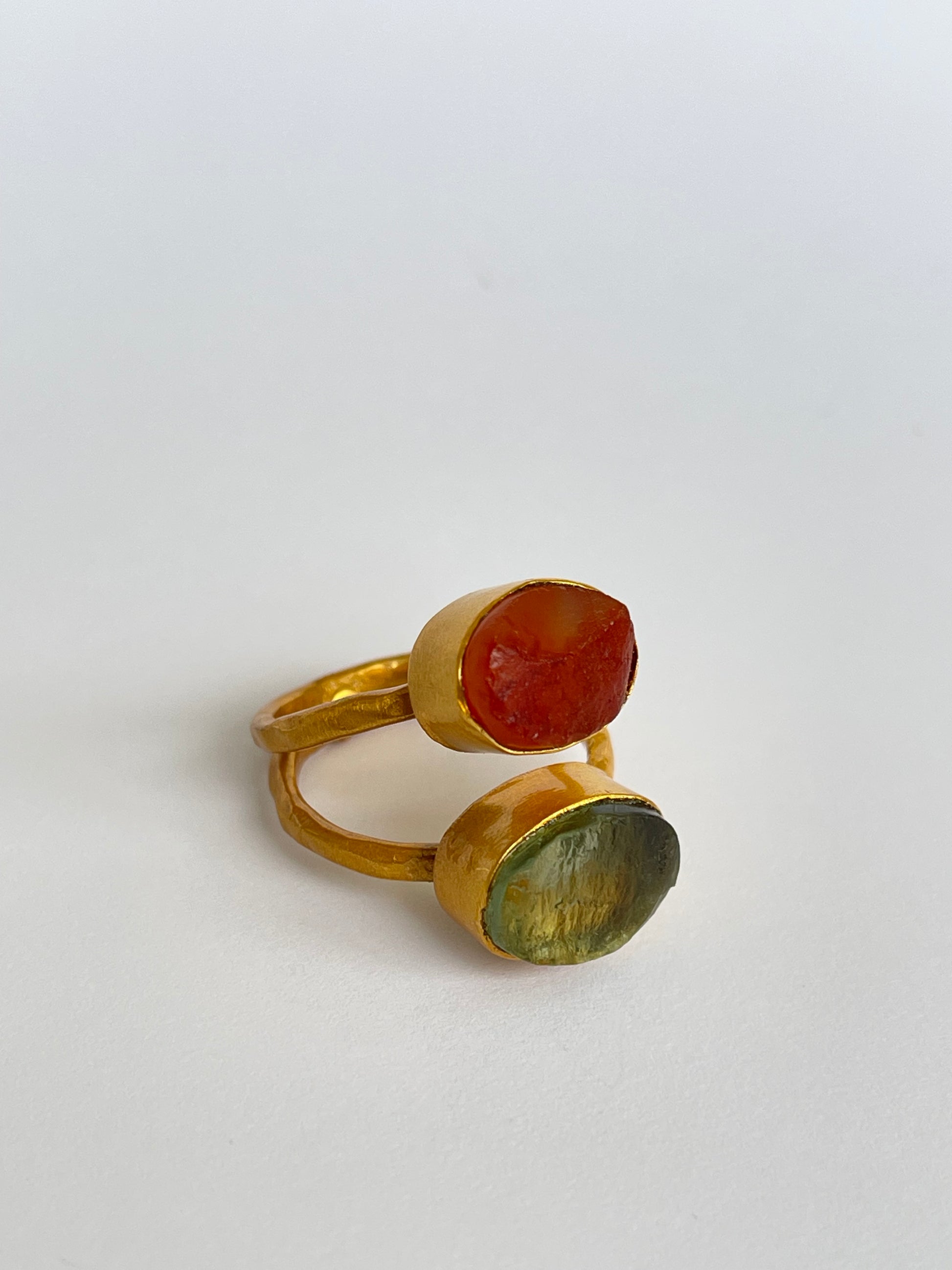 The Kōyō Ring is a striking dual-gemstone design, featuring a warm red carnelian and an earthy green prehnite. Set side by side in 18k gold-plated brass, the pairing creates a natural harmony inspired by the changing hues of autumn.