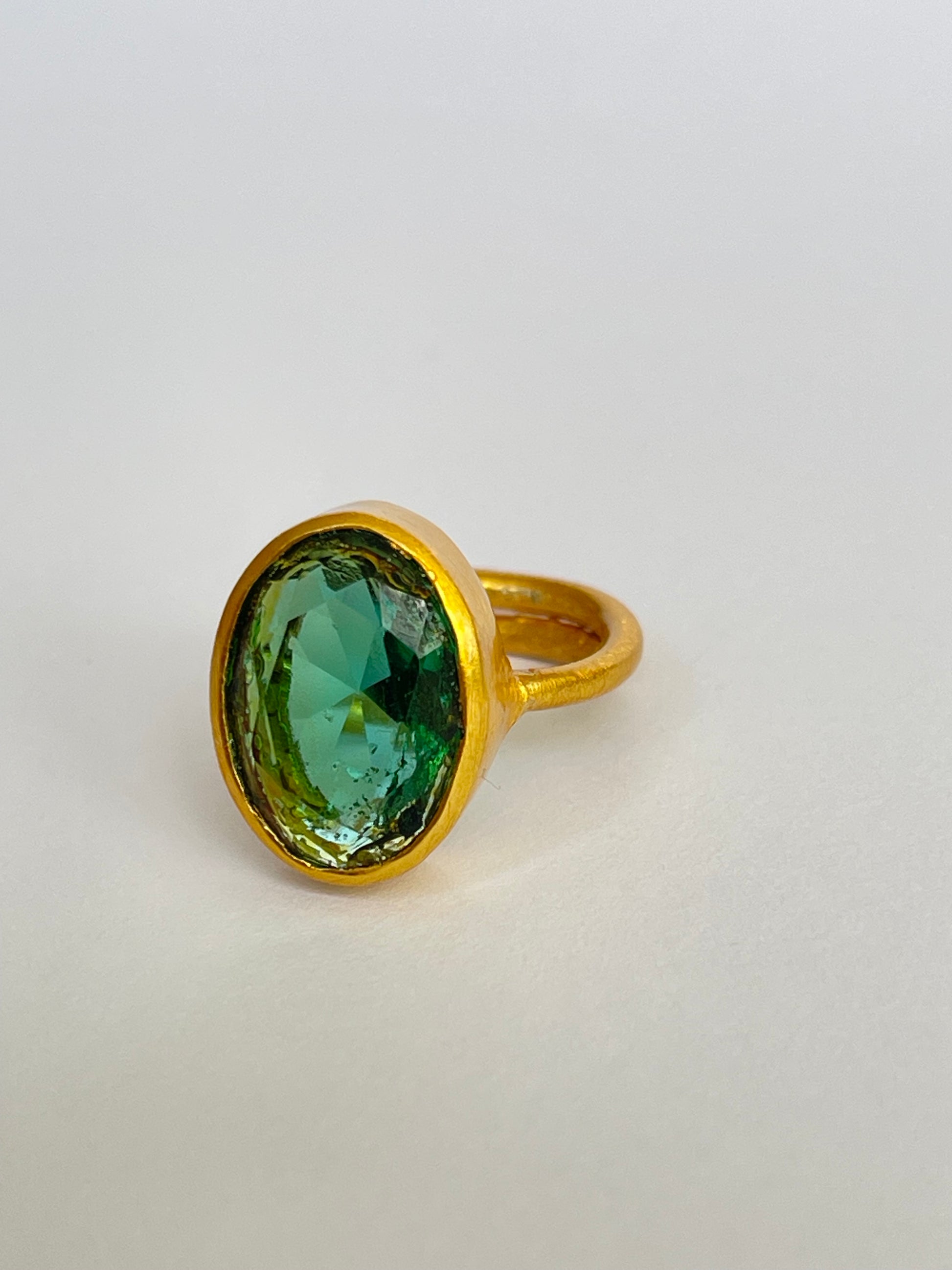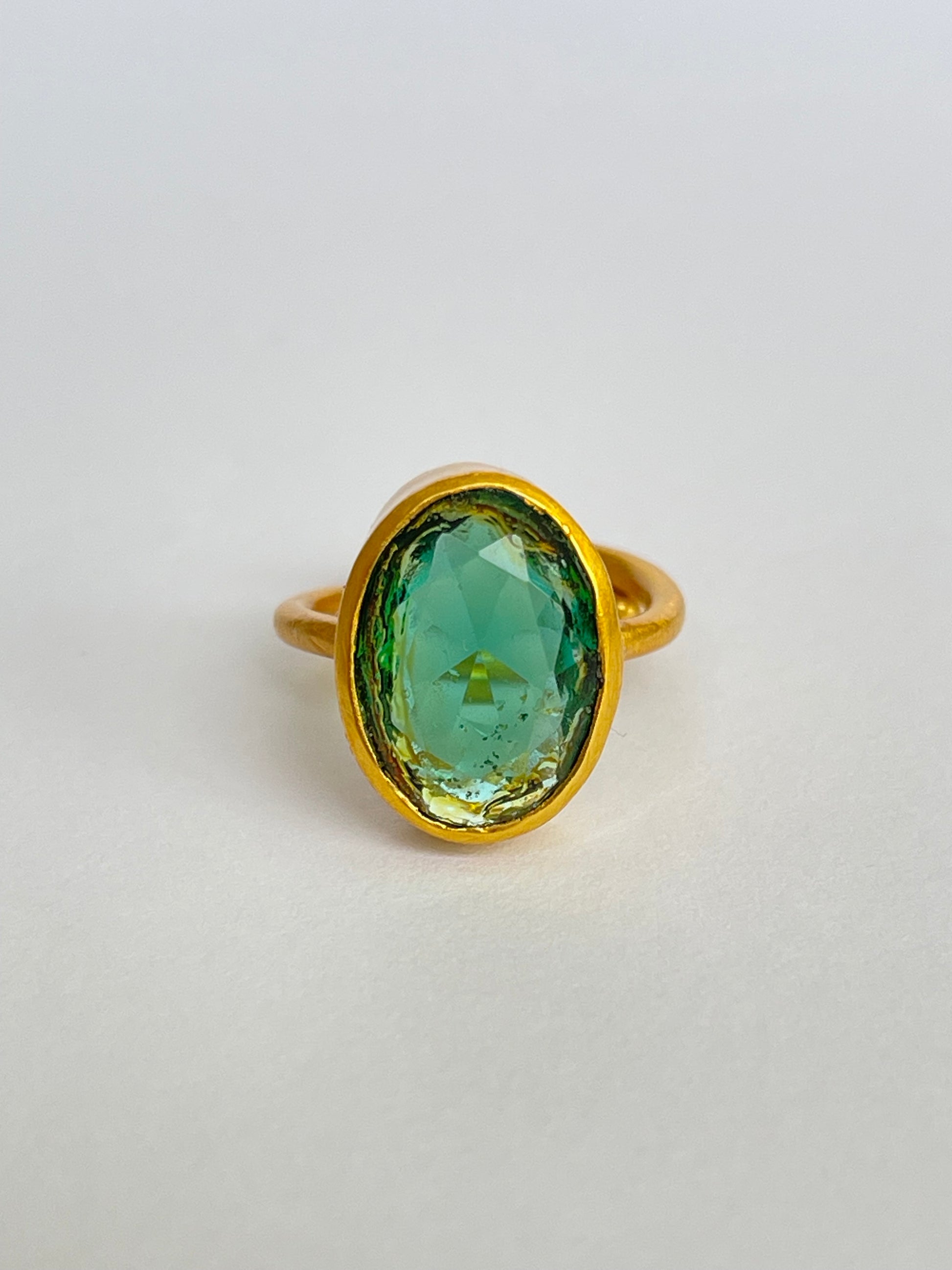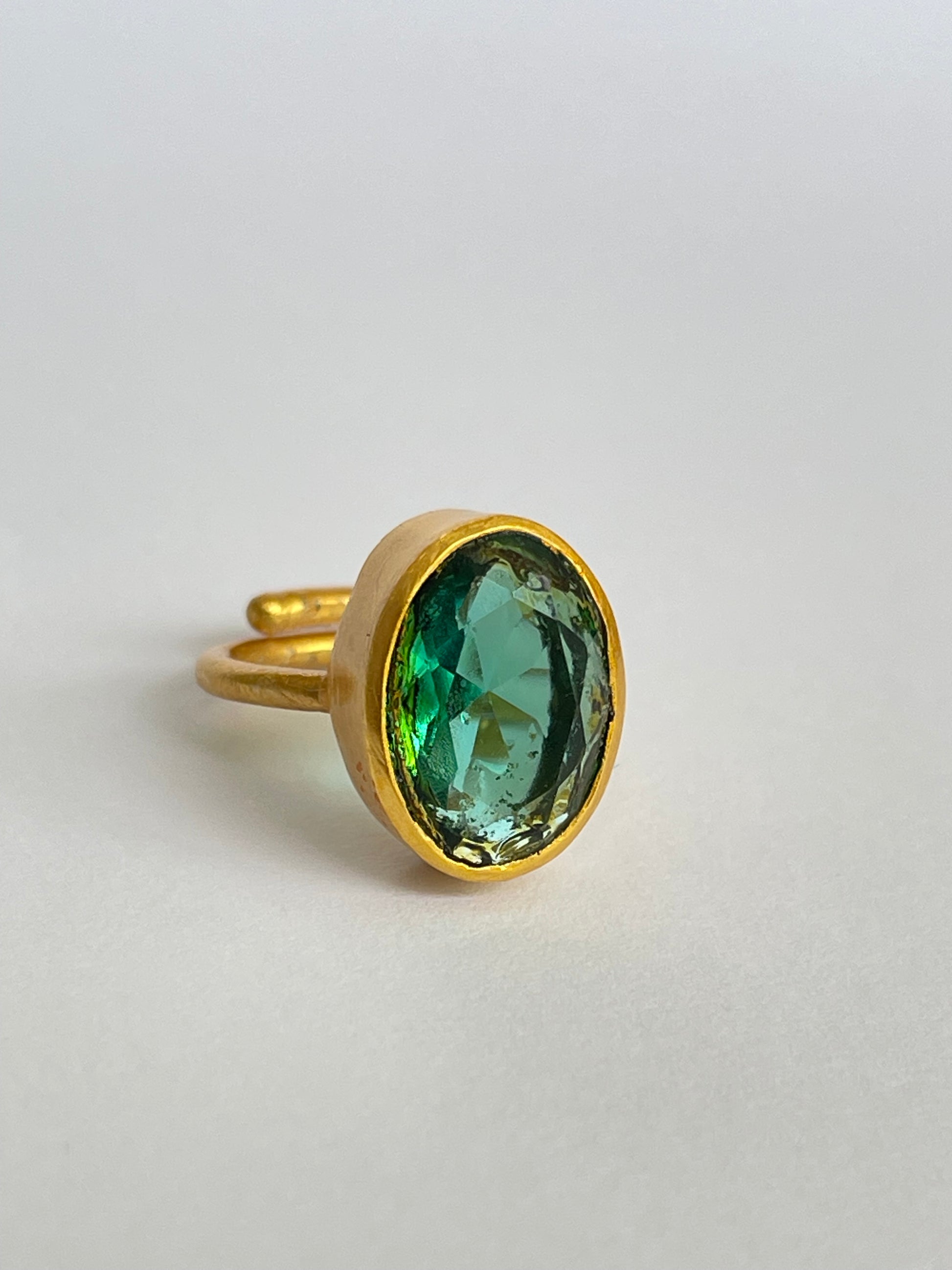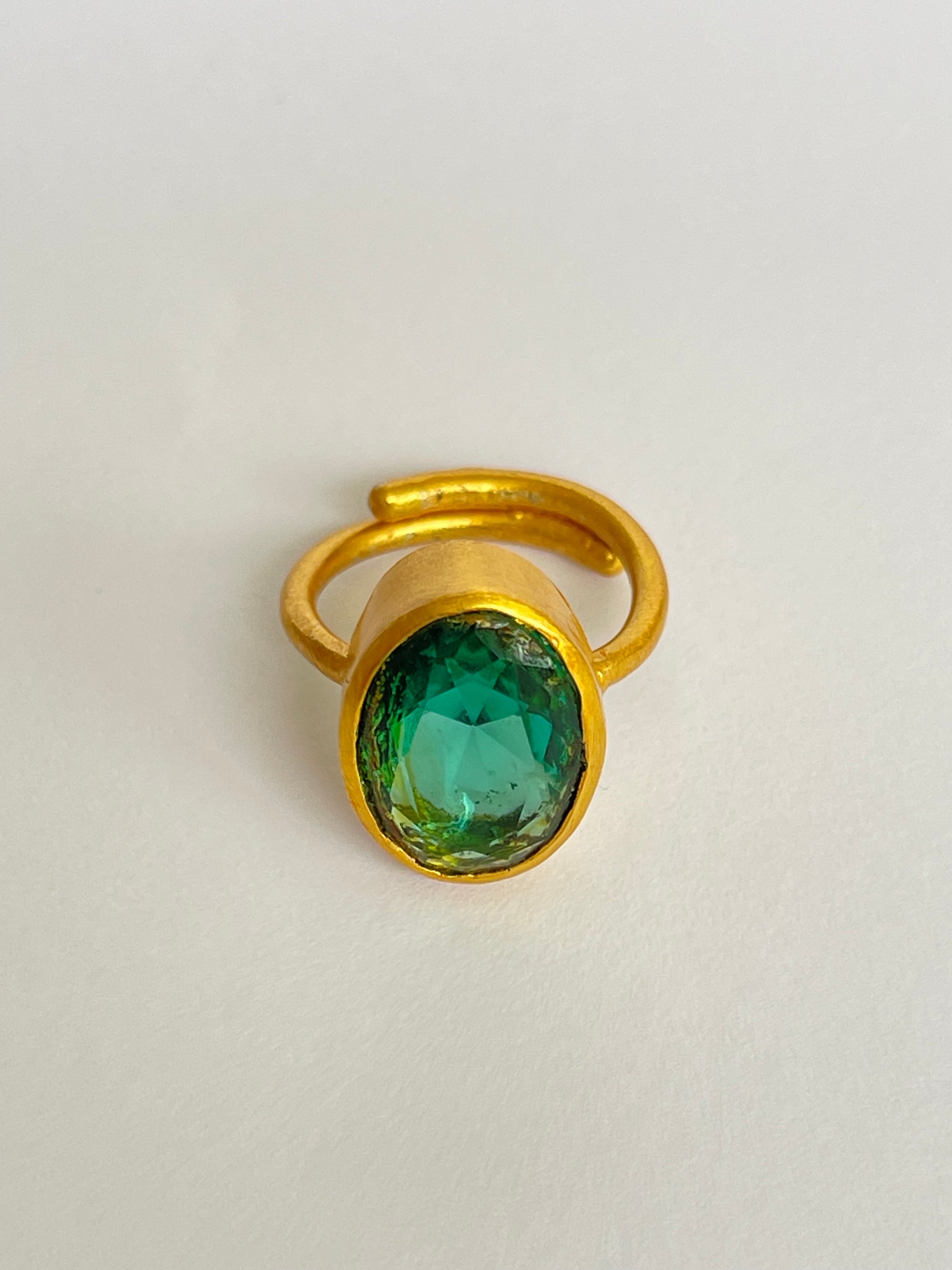 The Suiha Ring shimmers with fluid elegance — a gemstone that catches the light like ripples of jade on clear water. Its soft green tones and faceted brilliance meet the warmth of 18k gold-plated brass, creating an effortless harmony between color and form.