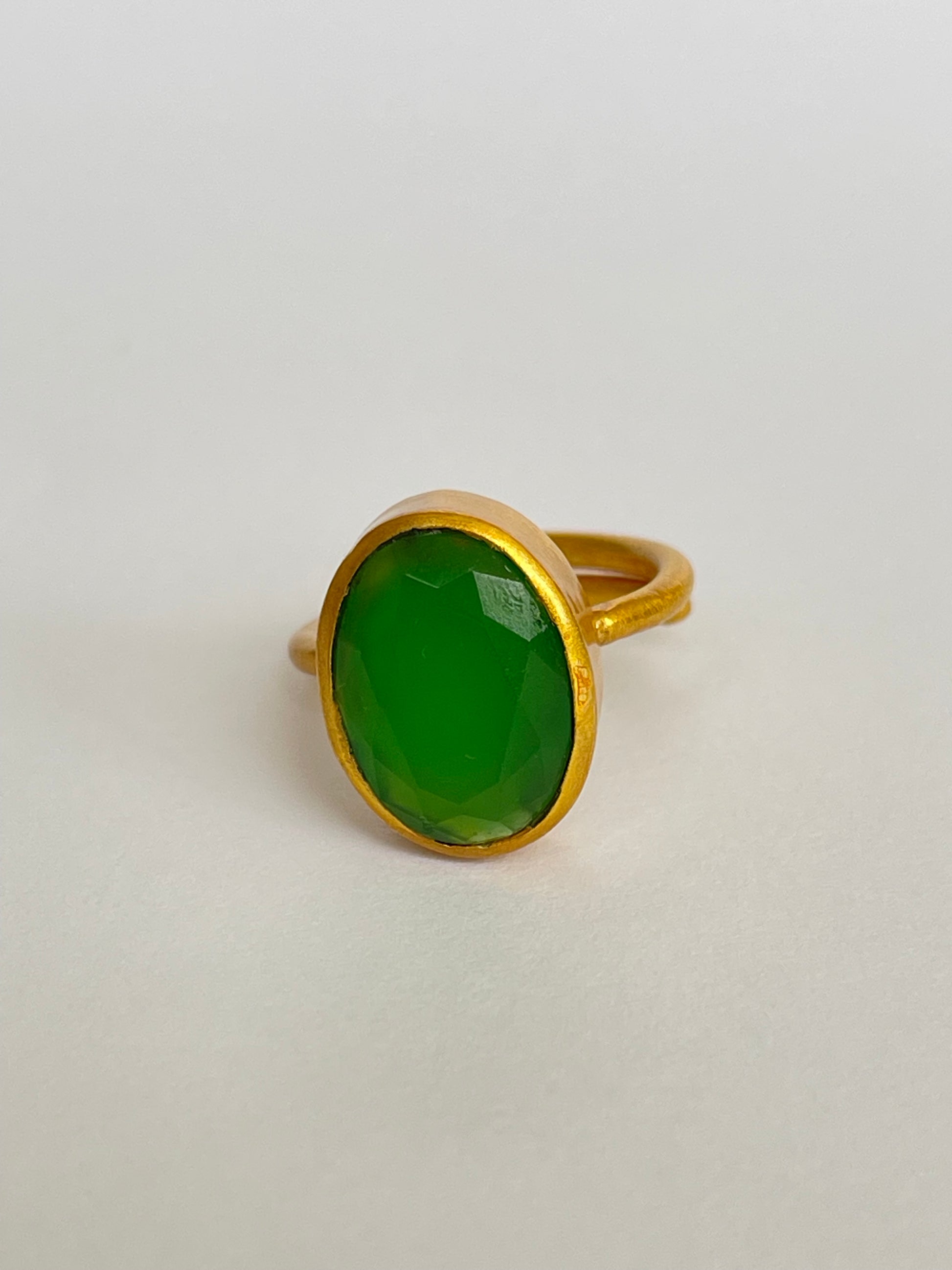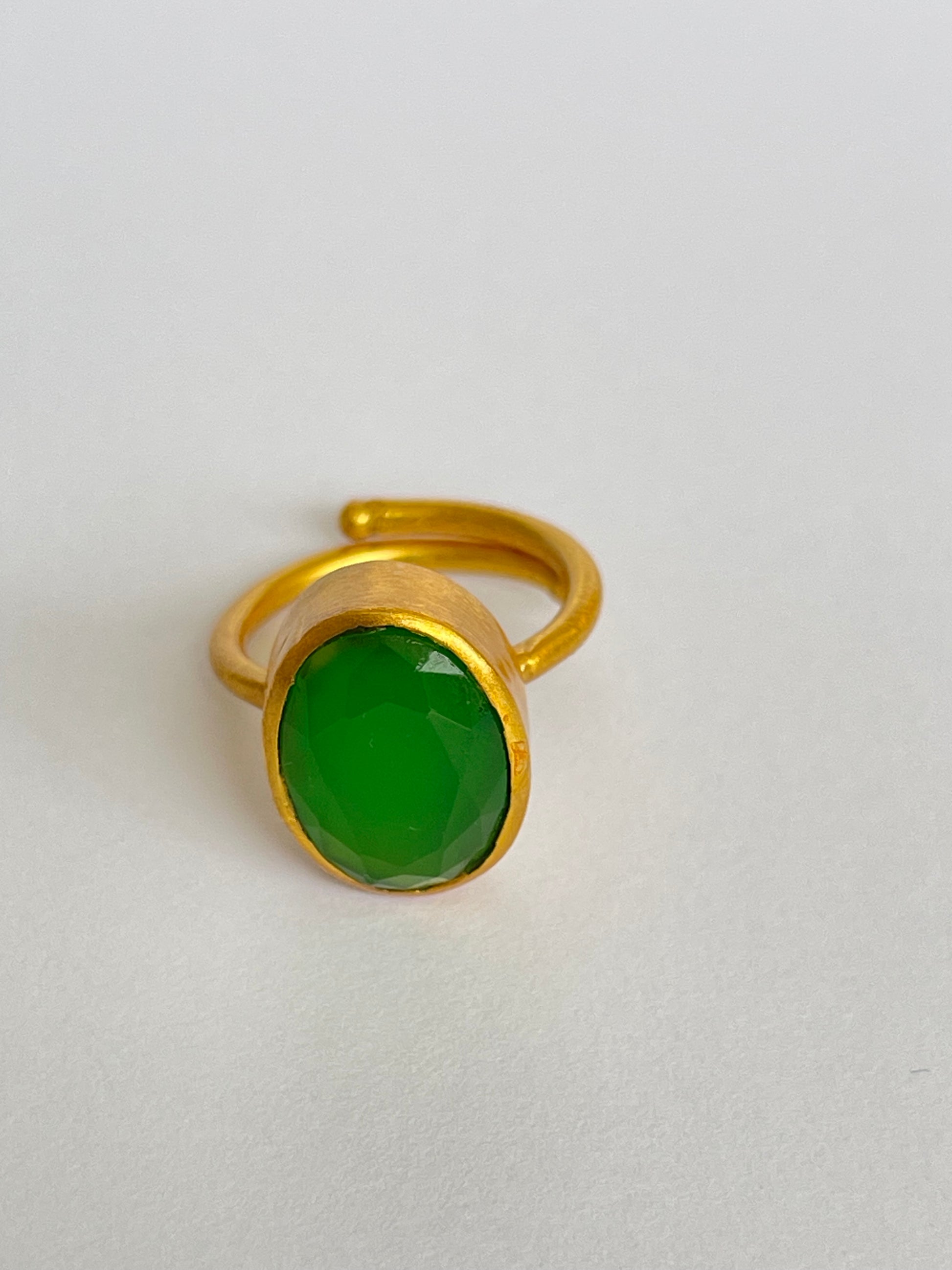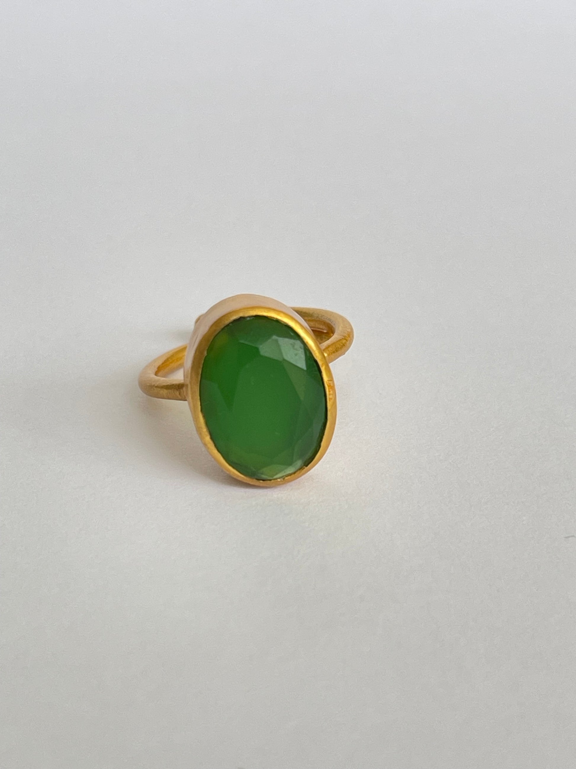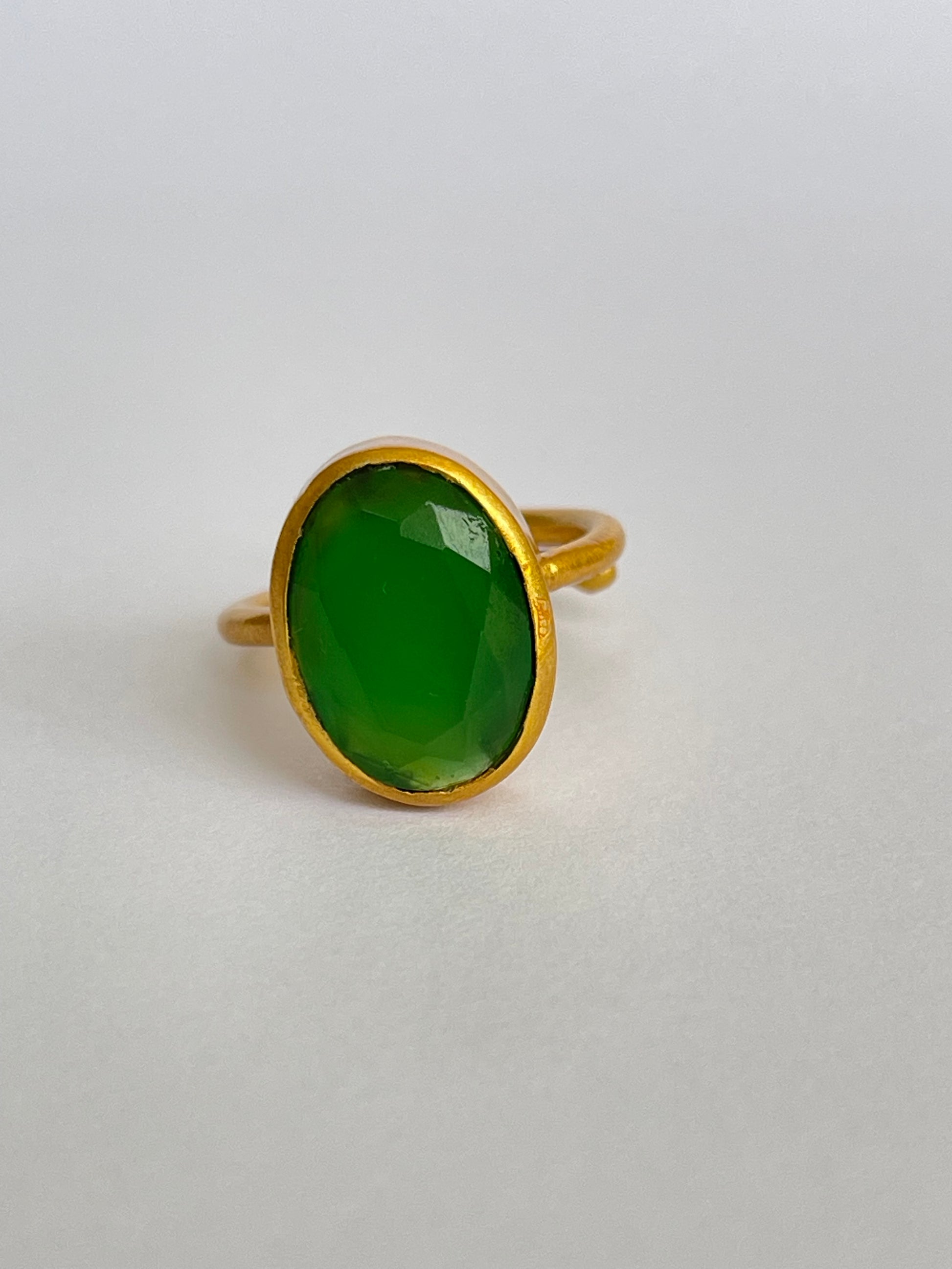 The Suikaze Ring embodies the freshness of a spring breeze through emerald leaves — radiant, light, and full of renewal. The vivid green Chalcedony, framed in 18k gold-plated brass, glows with quiet vitality and timeless grace.