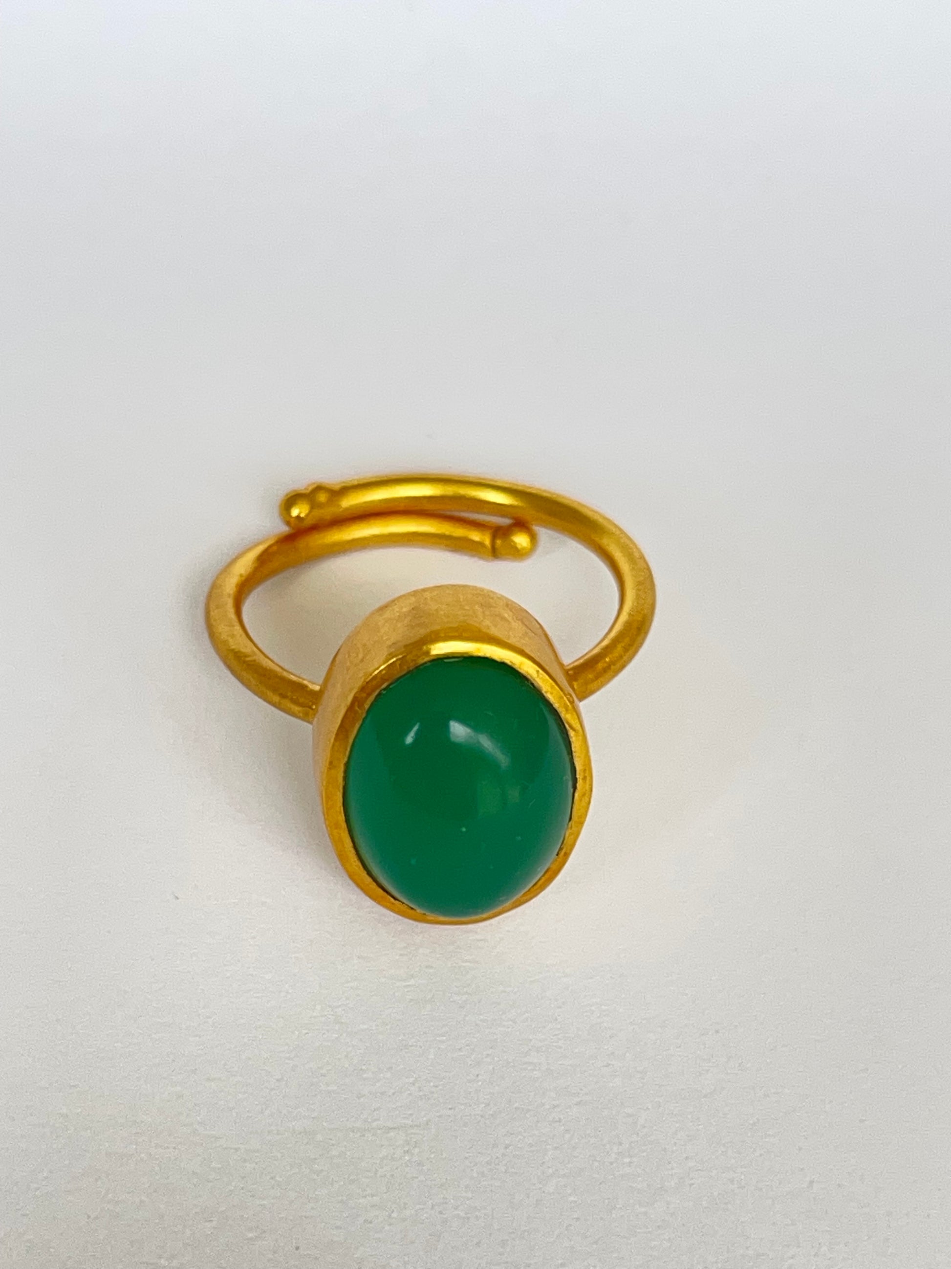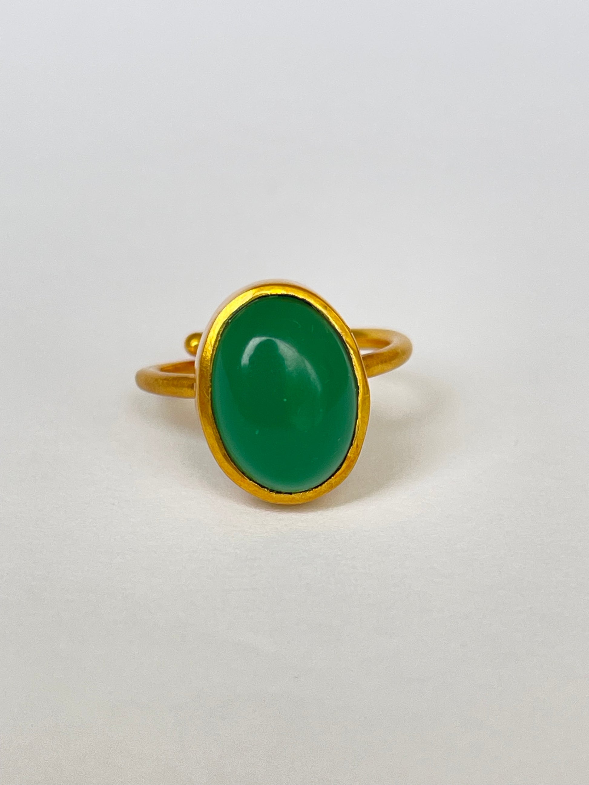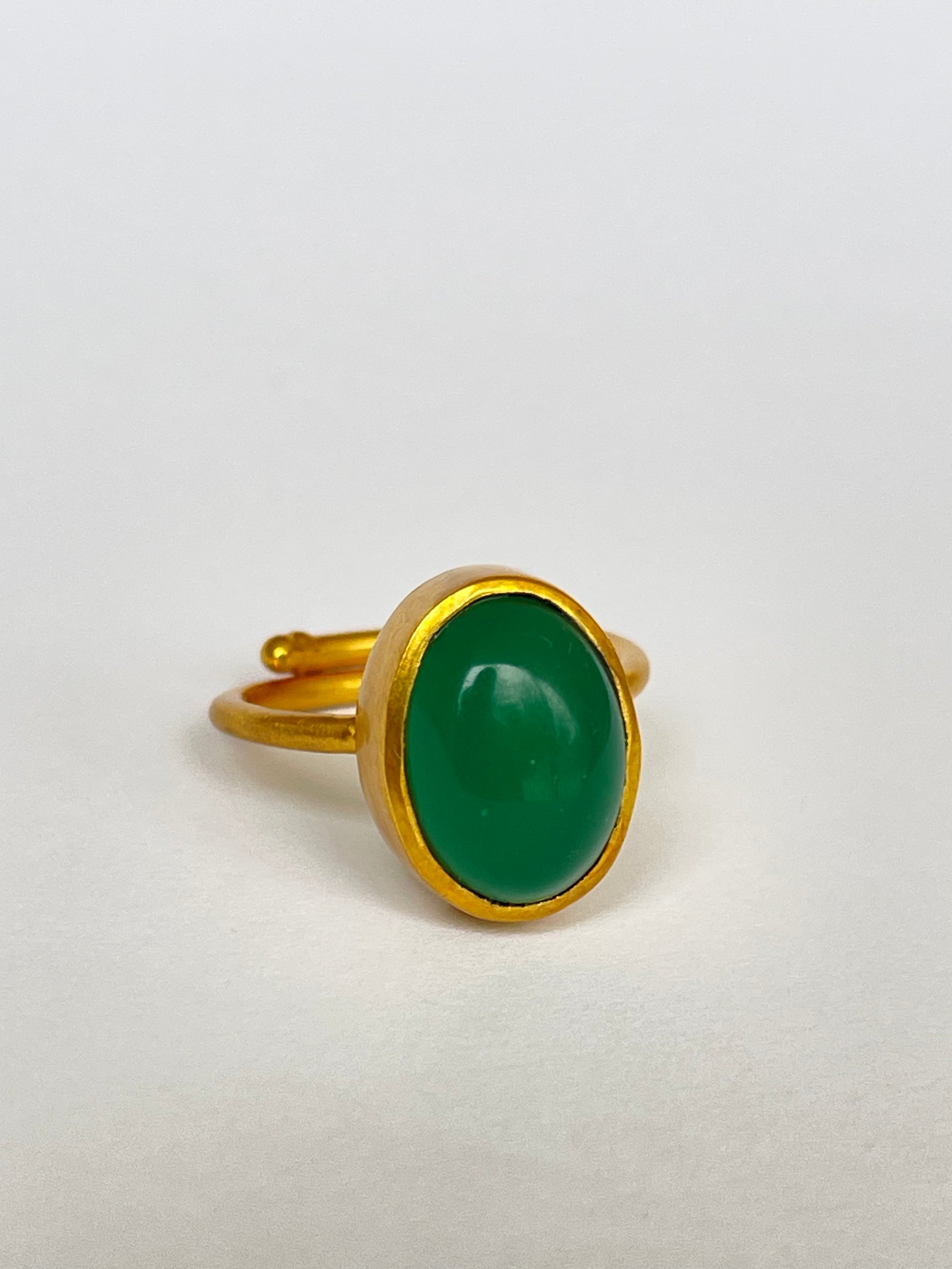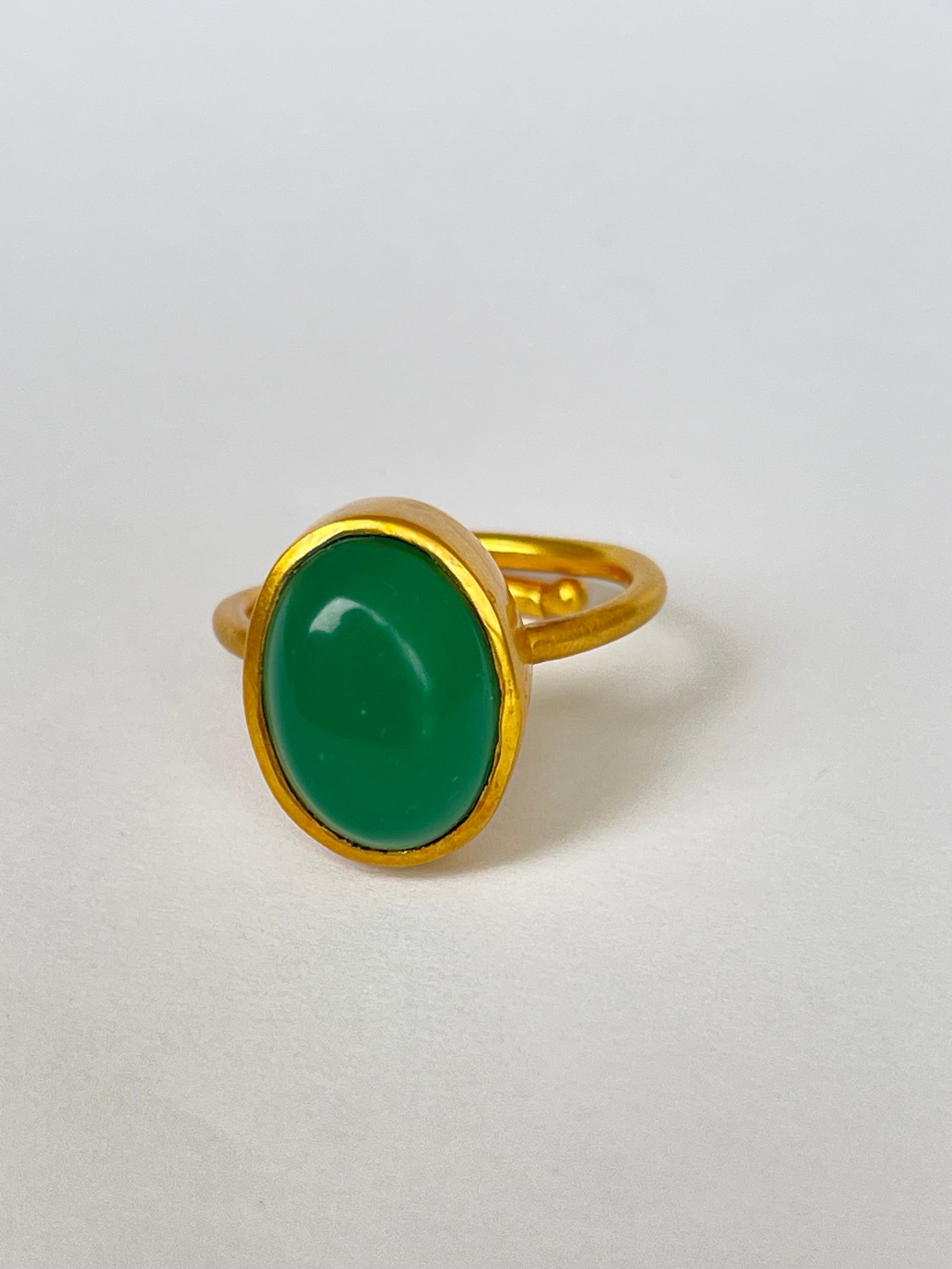 The Suion Ring embodies quiet strength and refined vibrancy. Its polished green onyx gemstone, cradled in 18k gold-plated brass, evokes renewal and vitality — a perfect harmony of nature’s richness and minimalist elegance.
