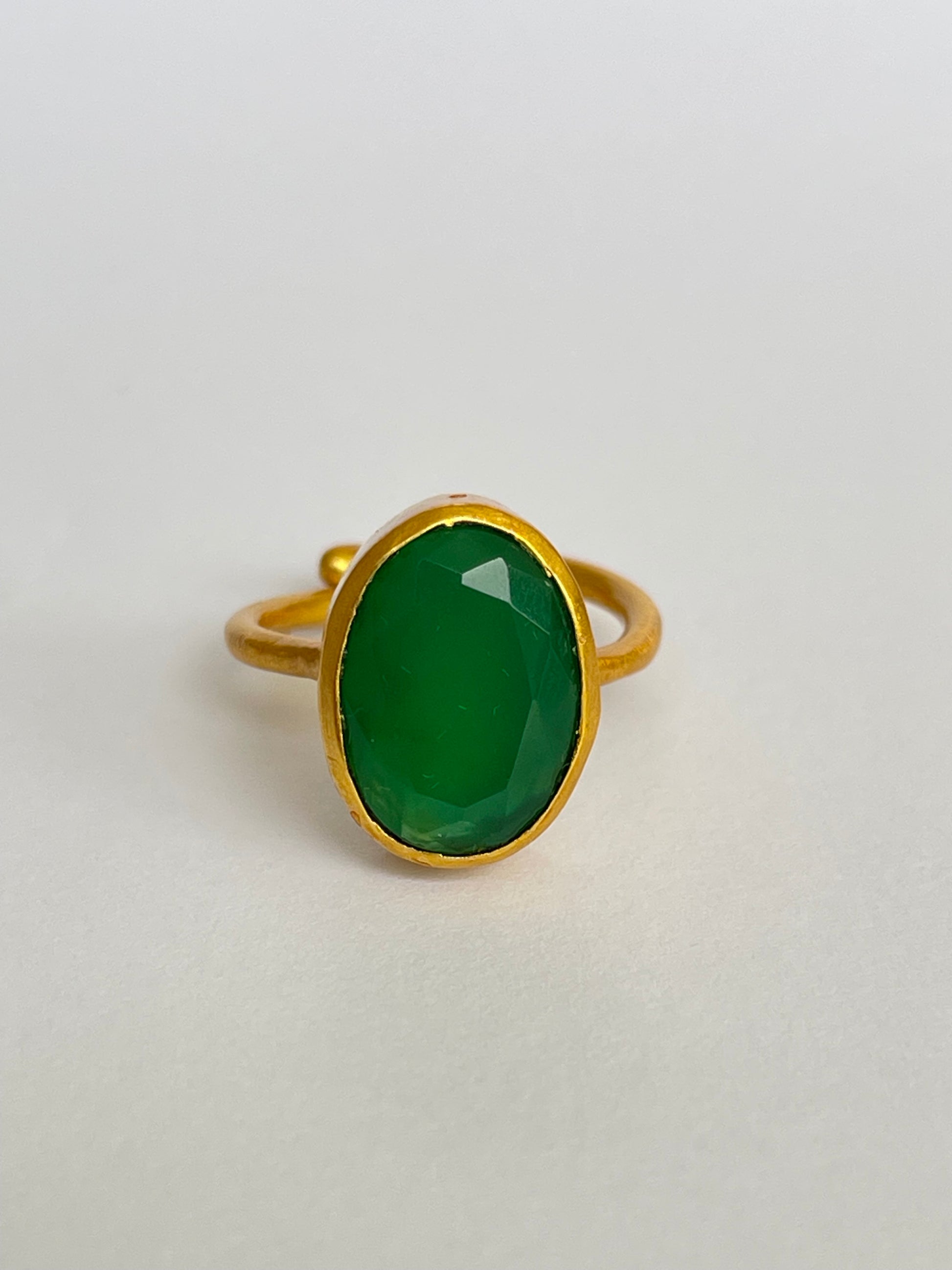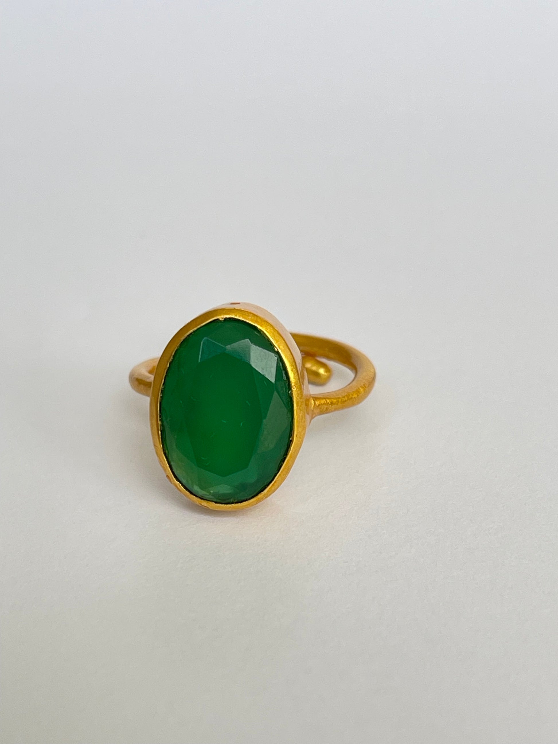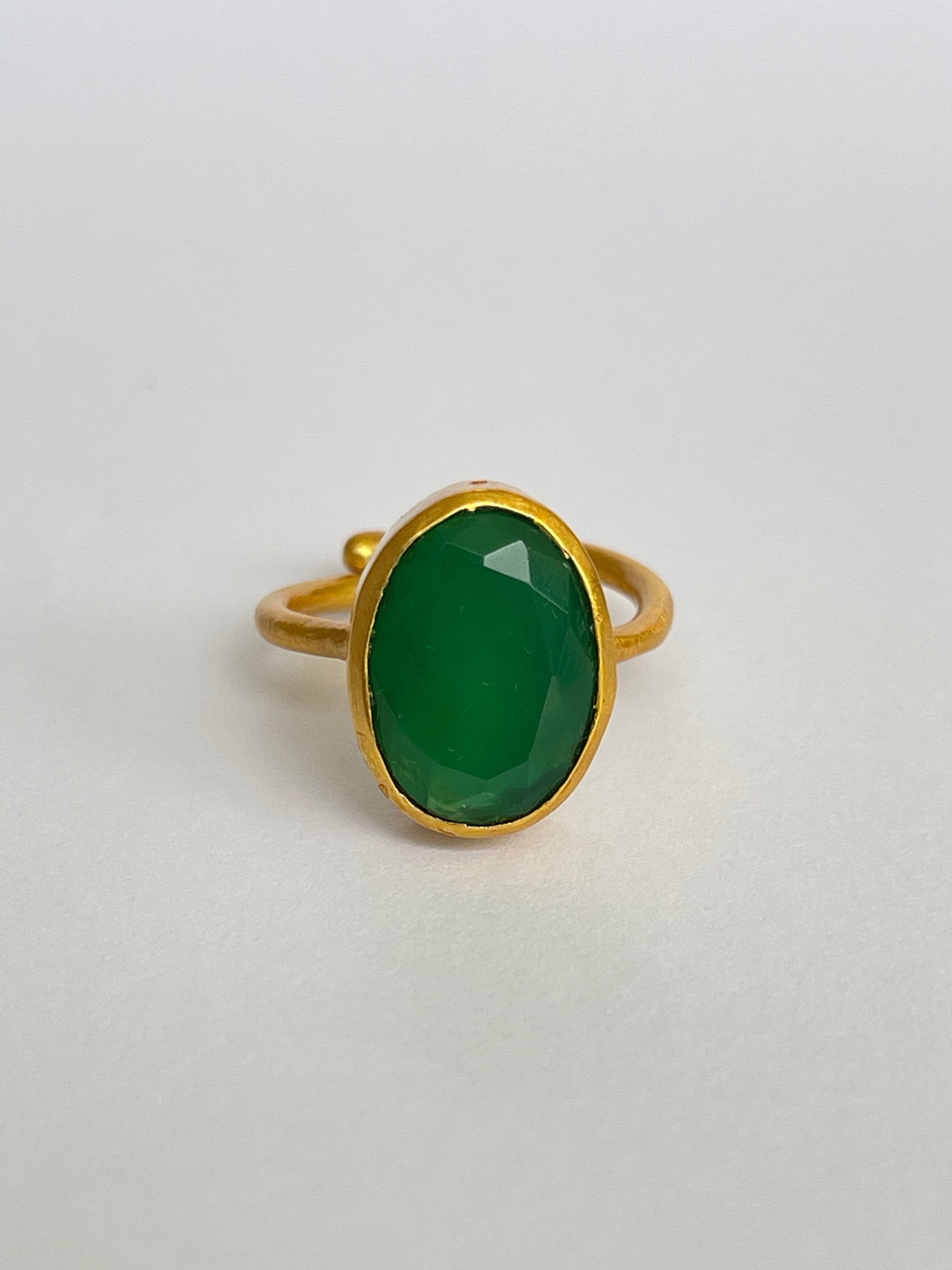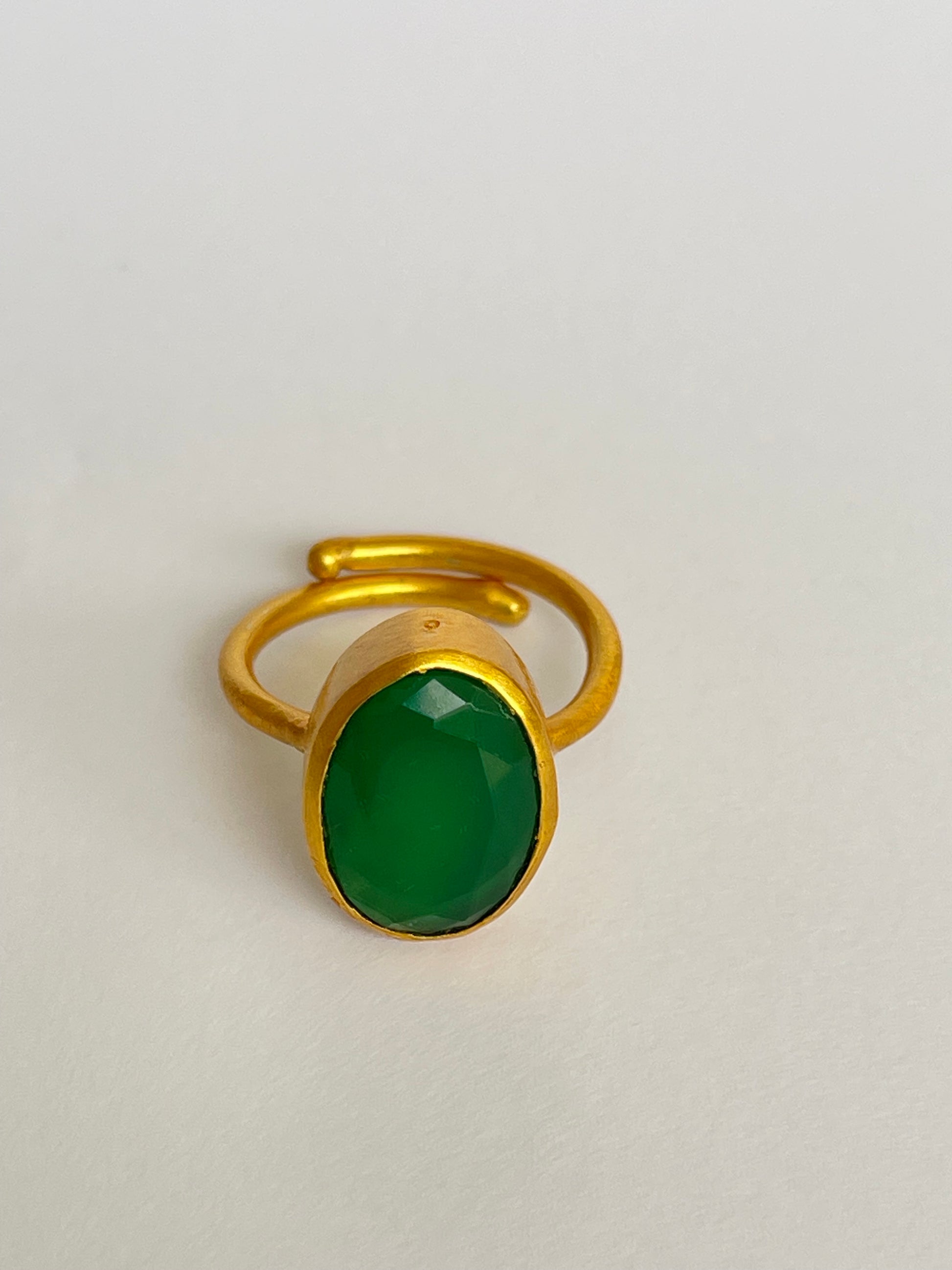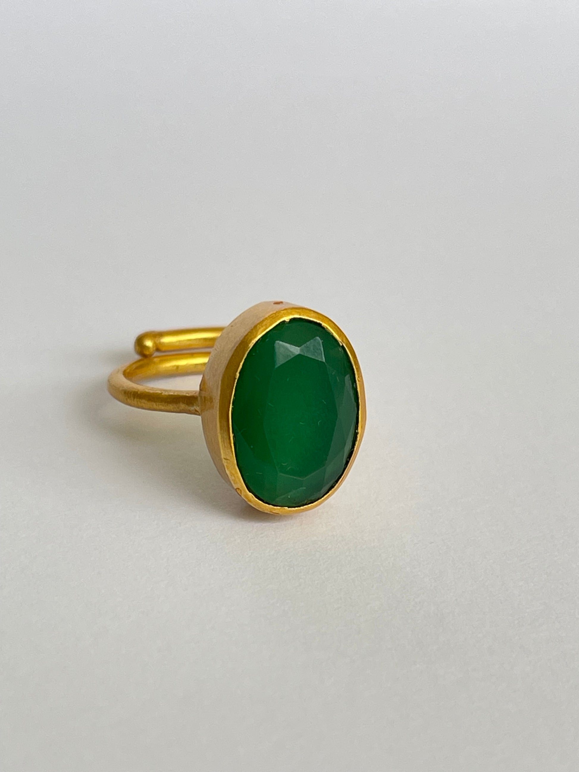 The Suion Ring captures the quiet rhythm of nature — a deep green gemstone that hums with vitality and grace. Its faceted Green Chalcedony reflects light like ripples on a tranquil pond, encased in 18k gold-plated brass for a timeless finish.