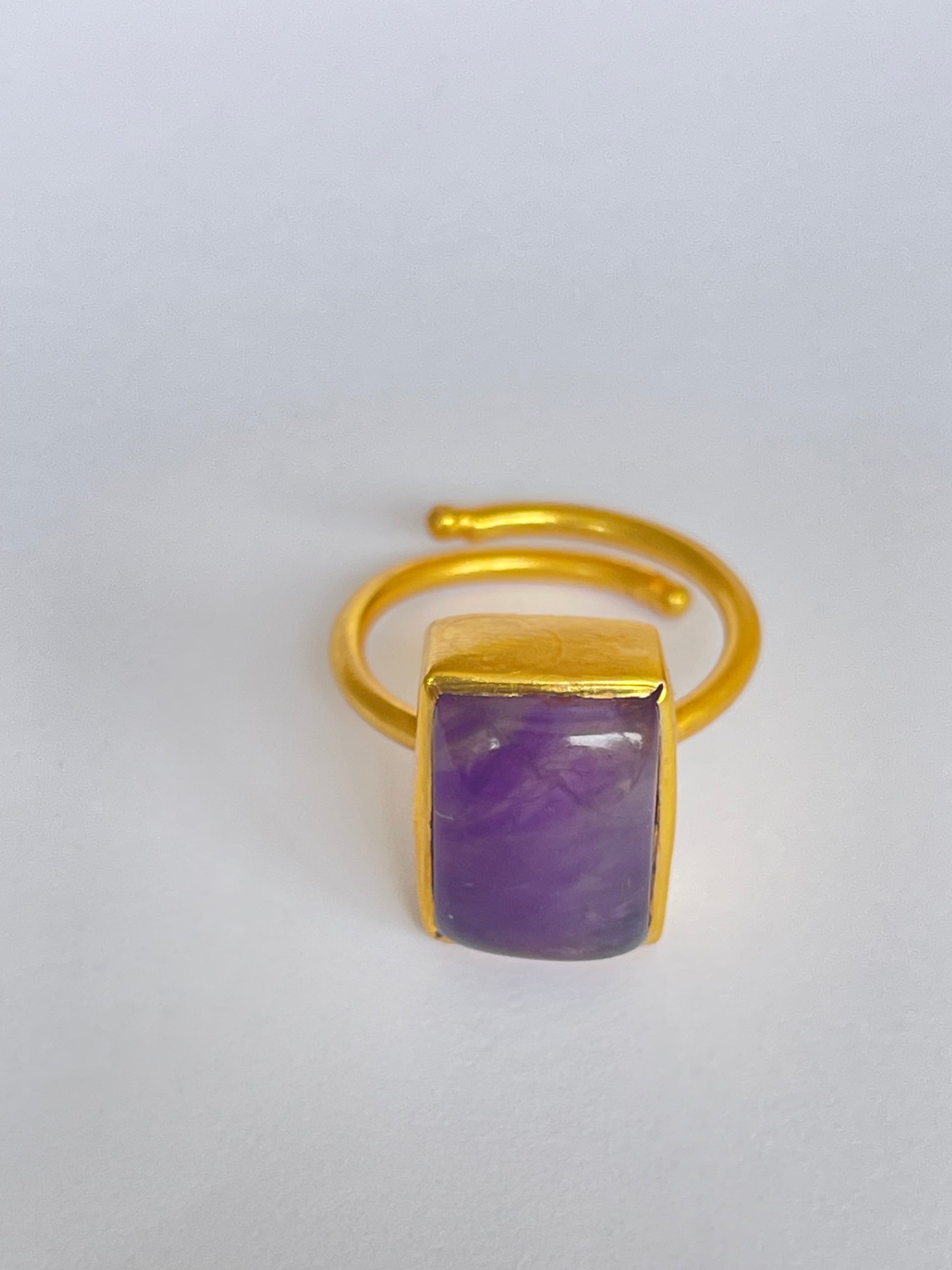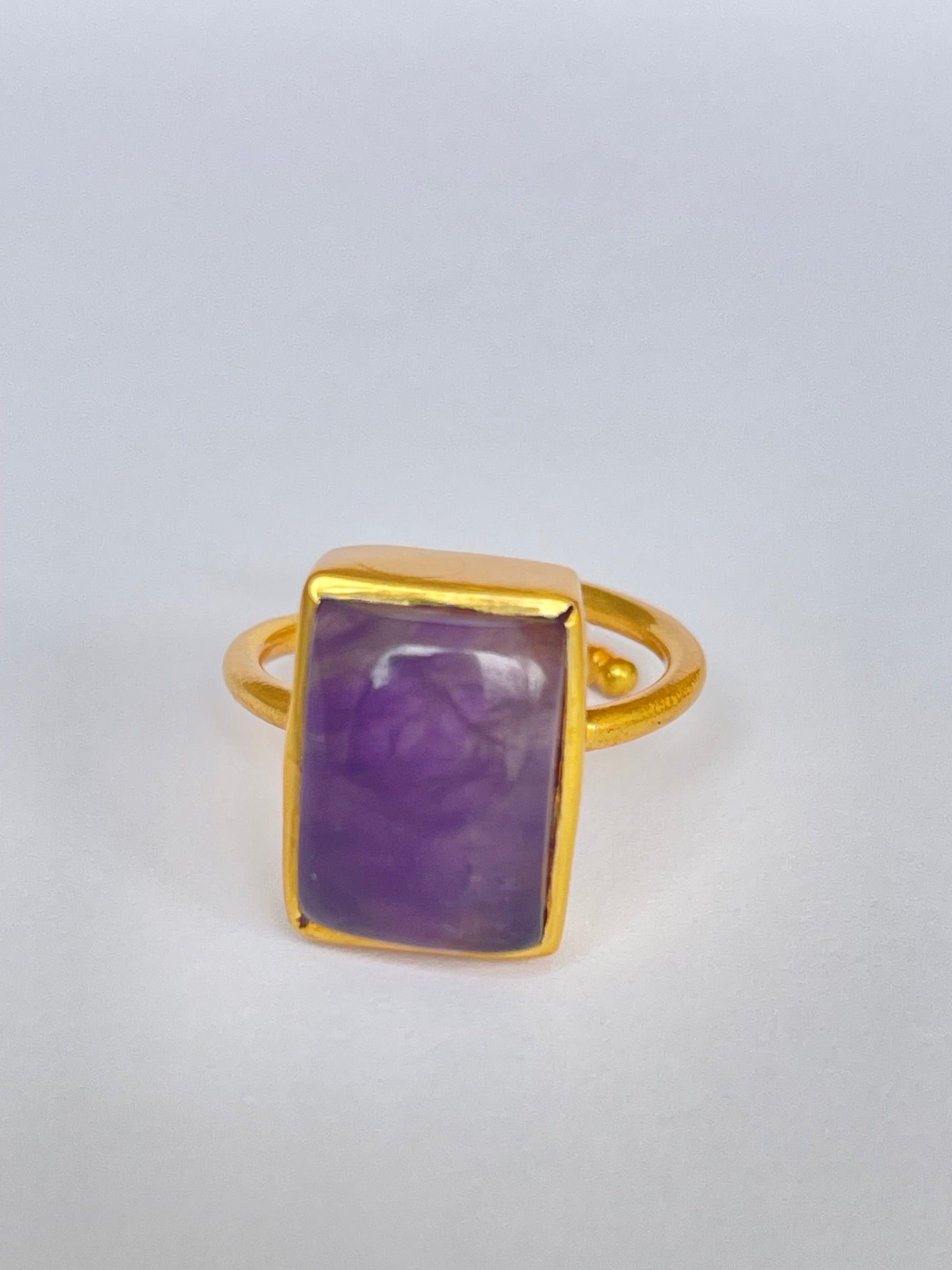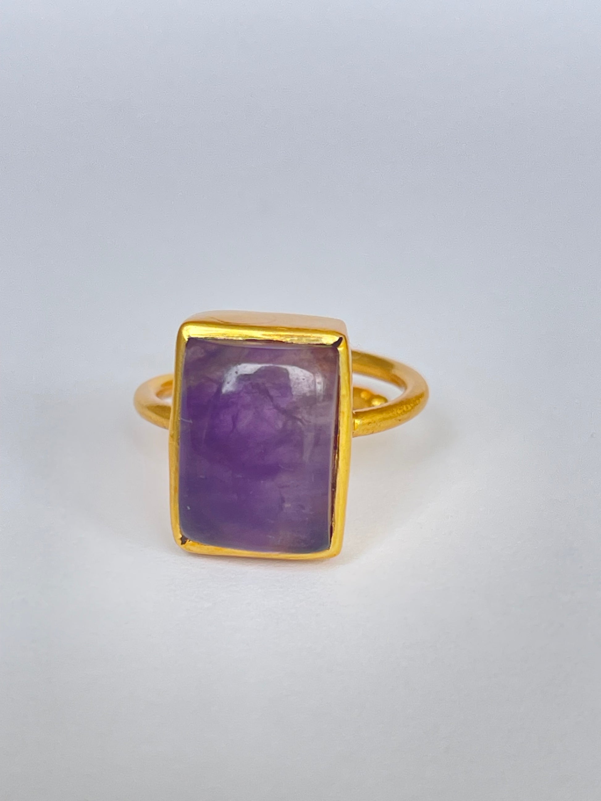 The Shimu Ring is a graceful expression of serenity, featuring a polished rectangular-cut amethyst gemstone set in radiant 18k gold-plated brass. Its bold silhouette contrasts with the gemstone’s soft, ethereal marbling, making it a timeless piece that balances strength and tranquility.