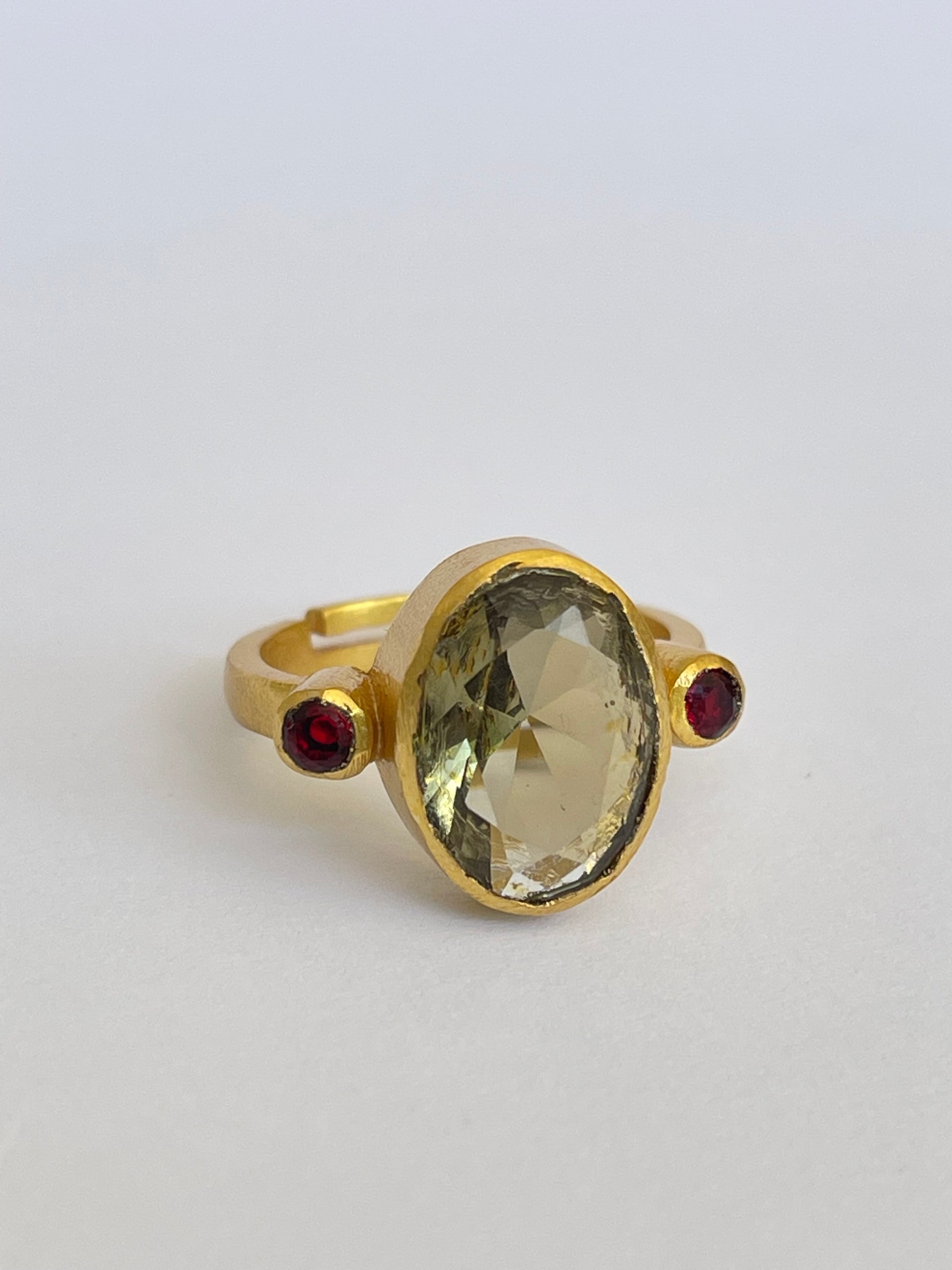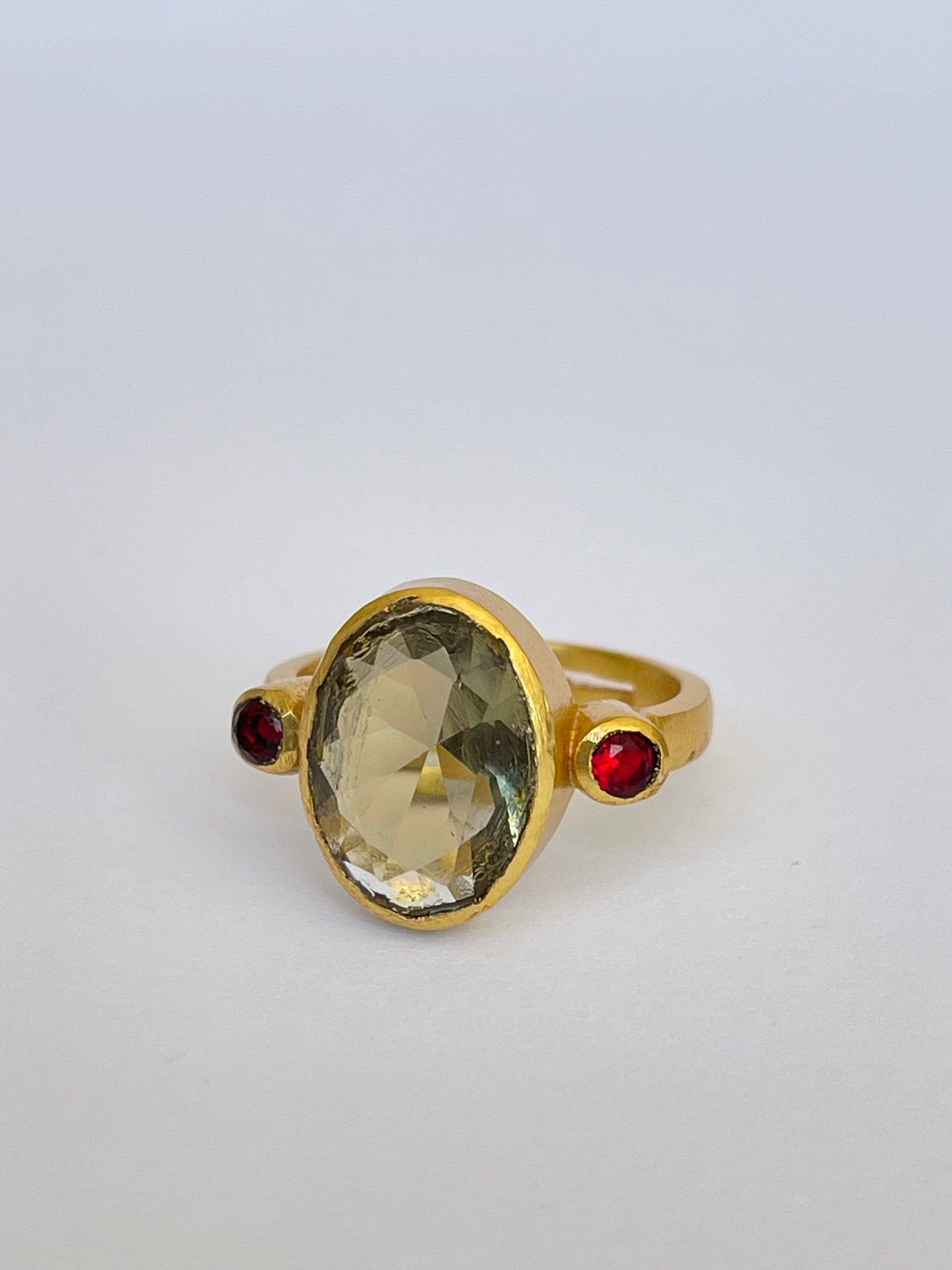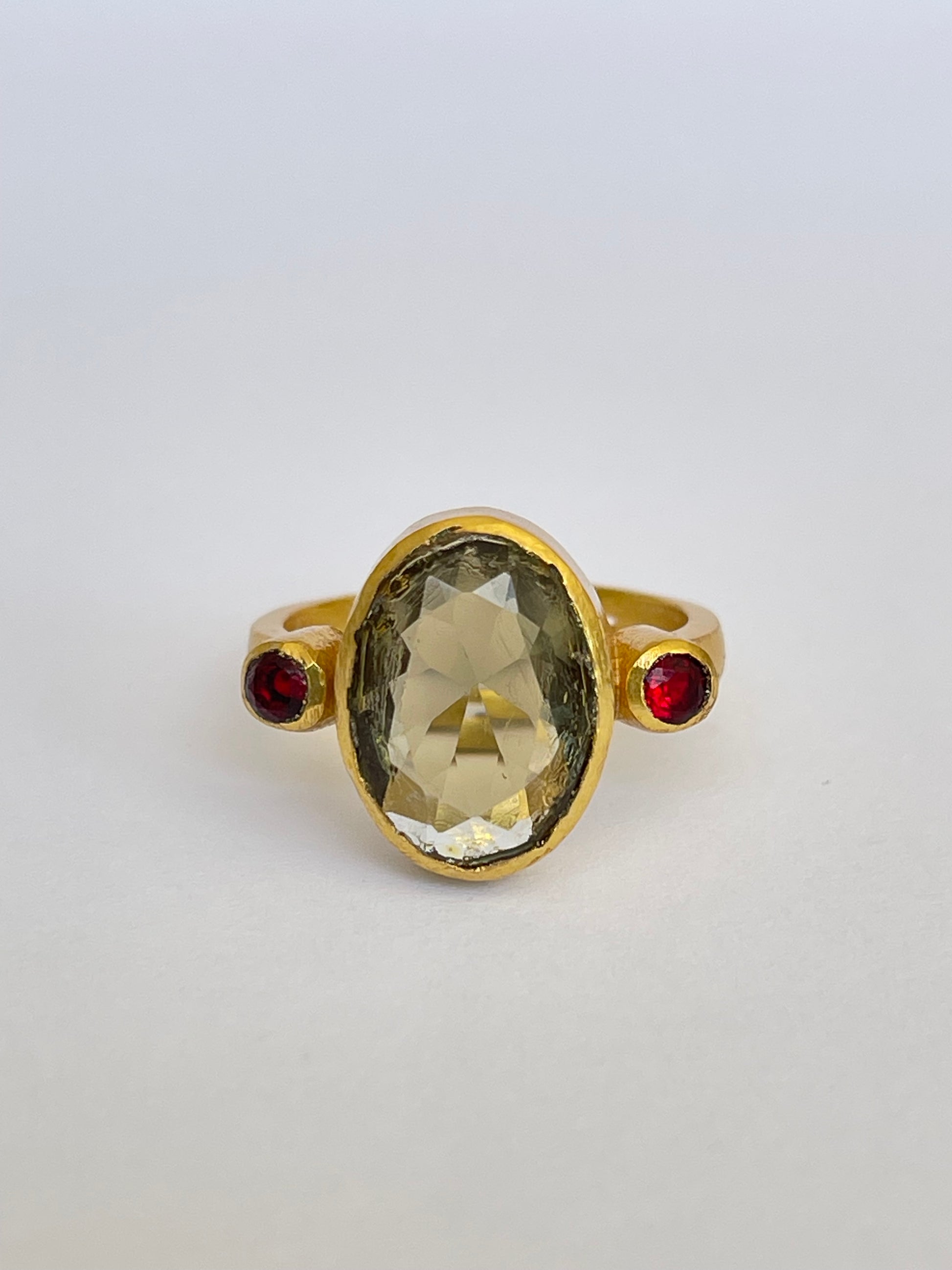 A radiant oval citrine takes center stage, framed by two deep green emeralds set in a rich, gold-plated band. Designed for the woman who treasures individuality, this handcrafted ring is a celebration of color, craftsmanship, and character.