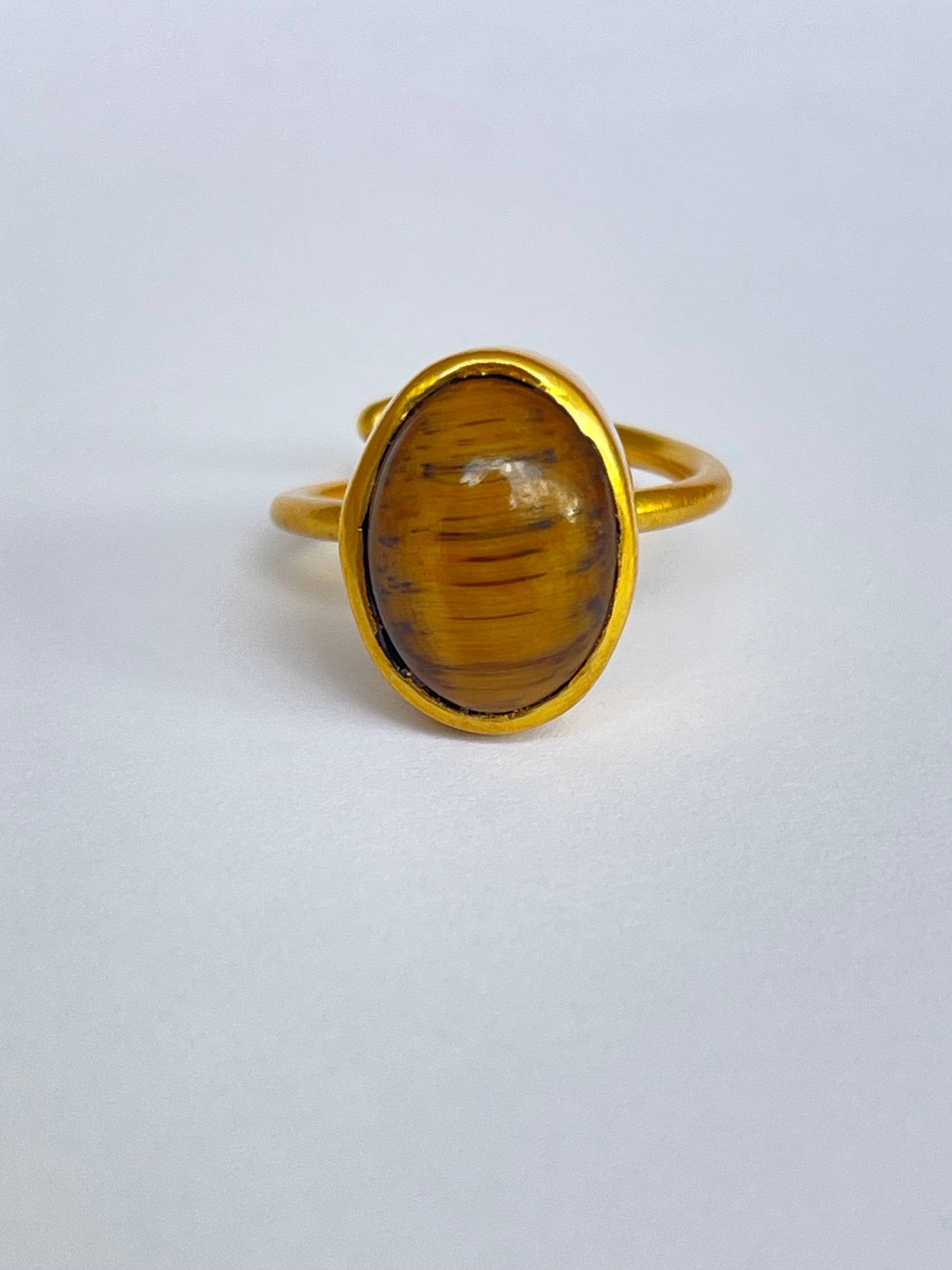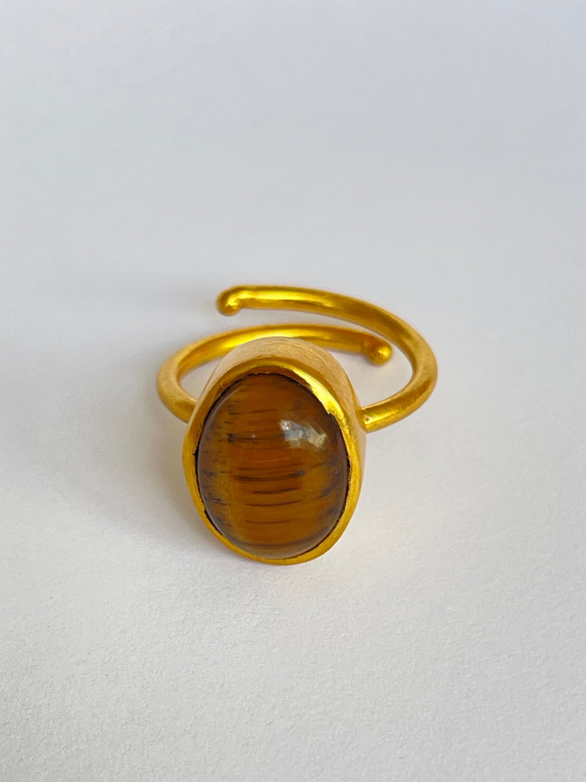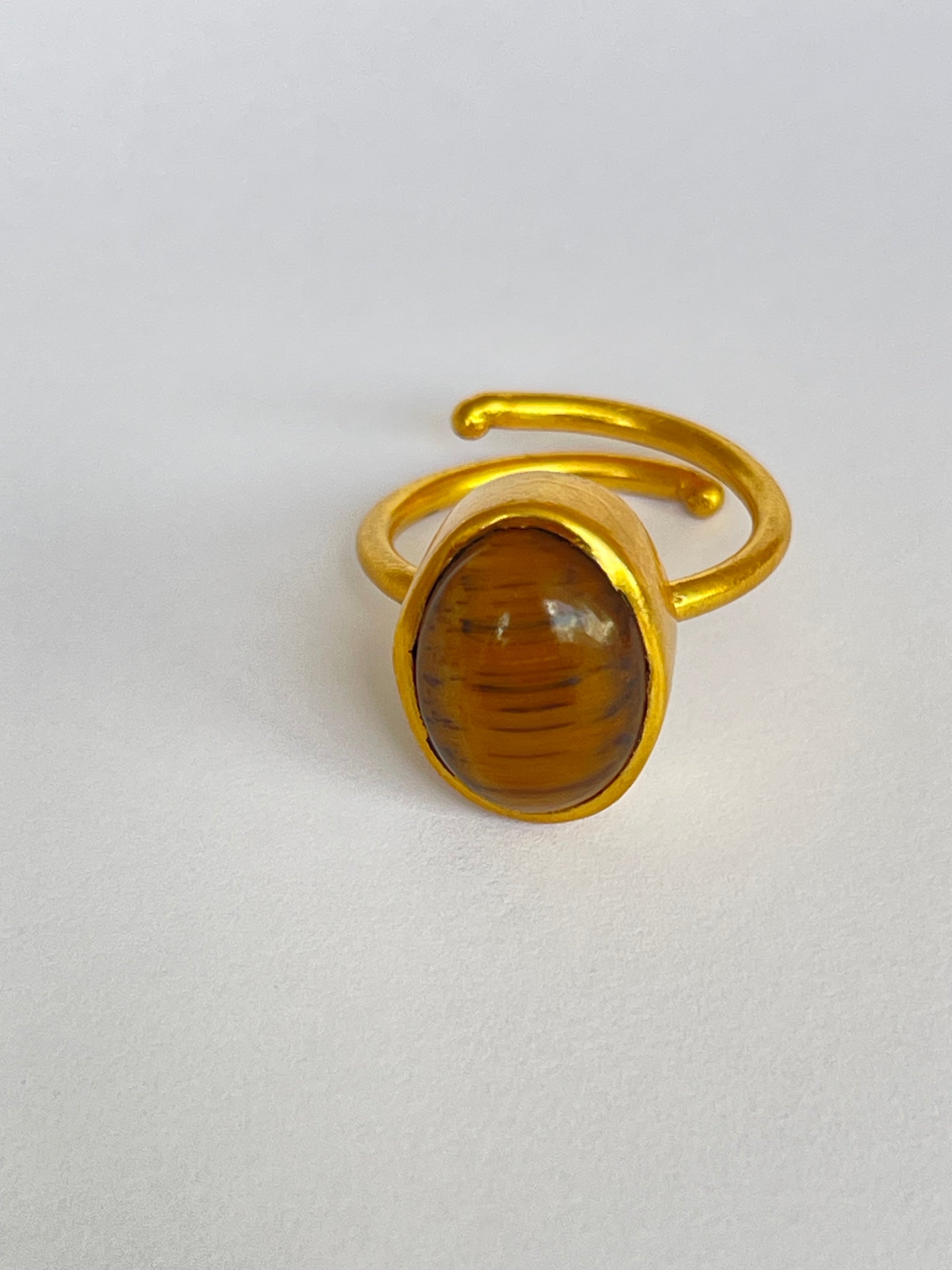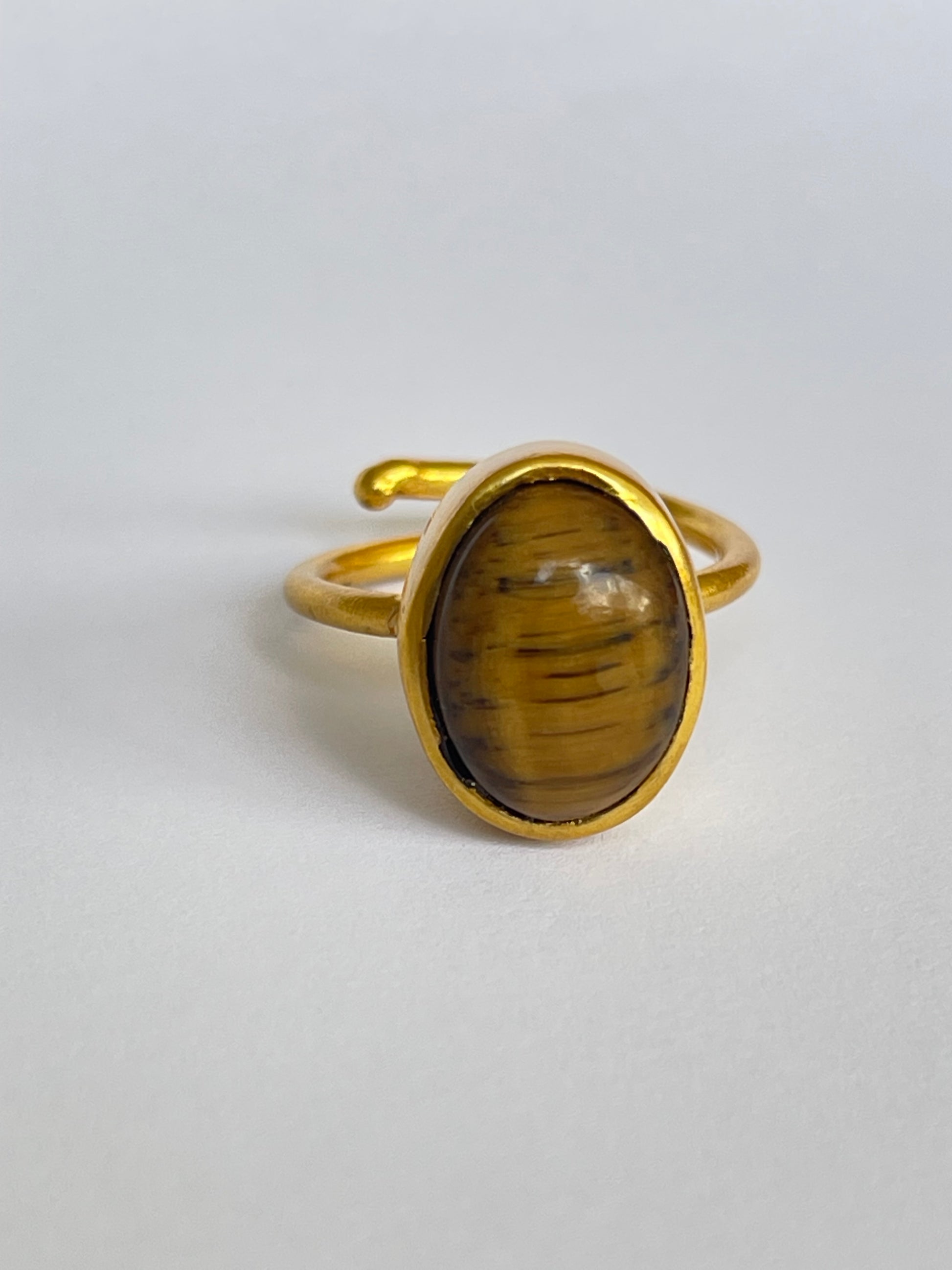 The Toranome Ring embodies confidence and grounded strength. Its golden-brown Tiger’s Eye gemstone glows with shifting light, reflecting the calm focus of a watchful spirit. Set in 18k gold-plated brass, it carries both warmth and quiet power.
