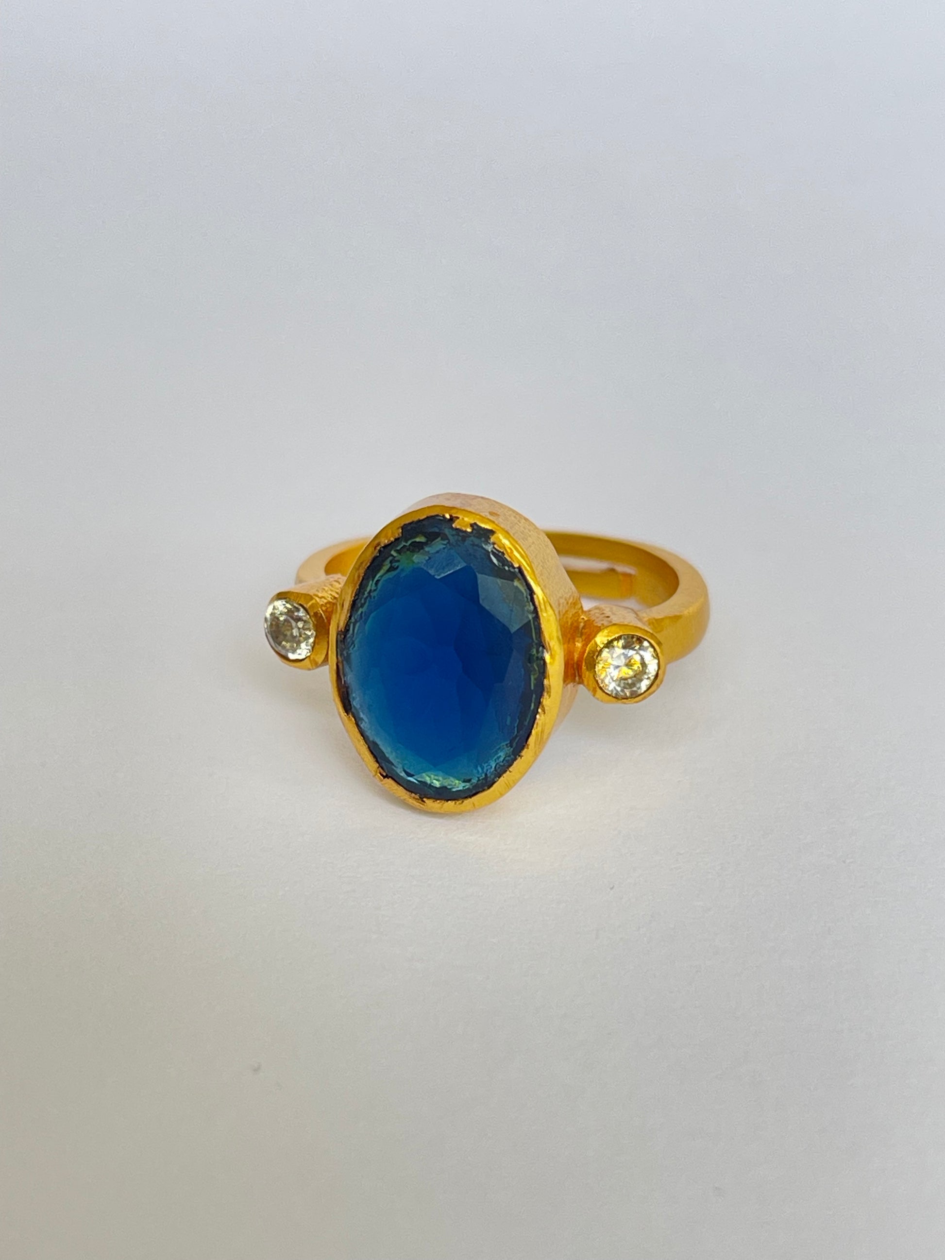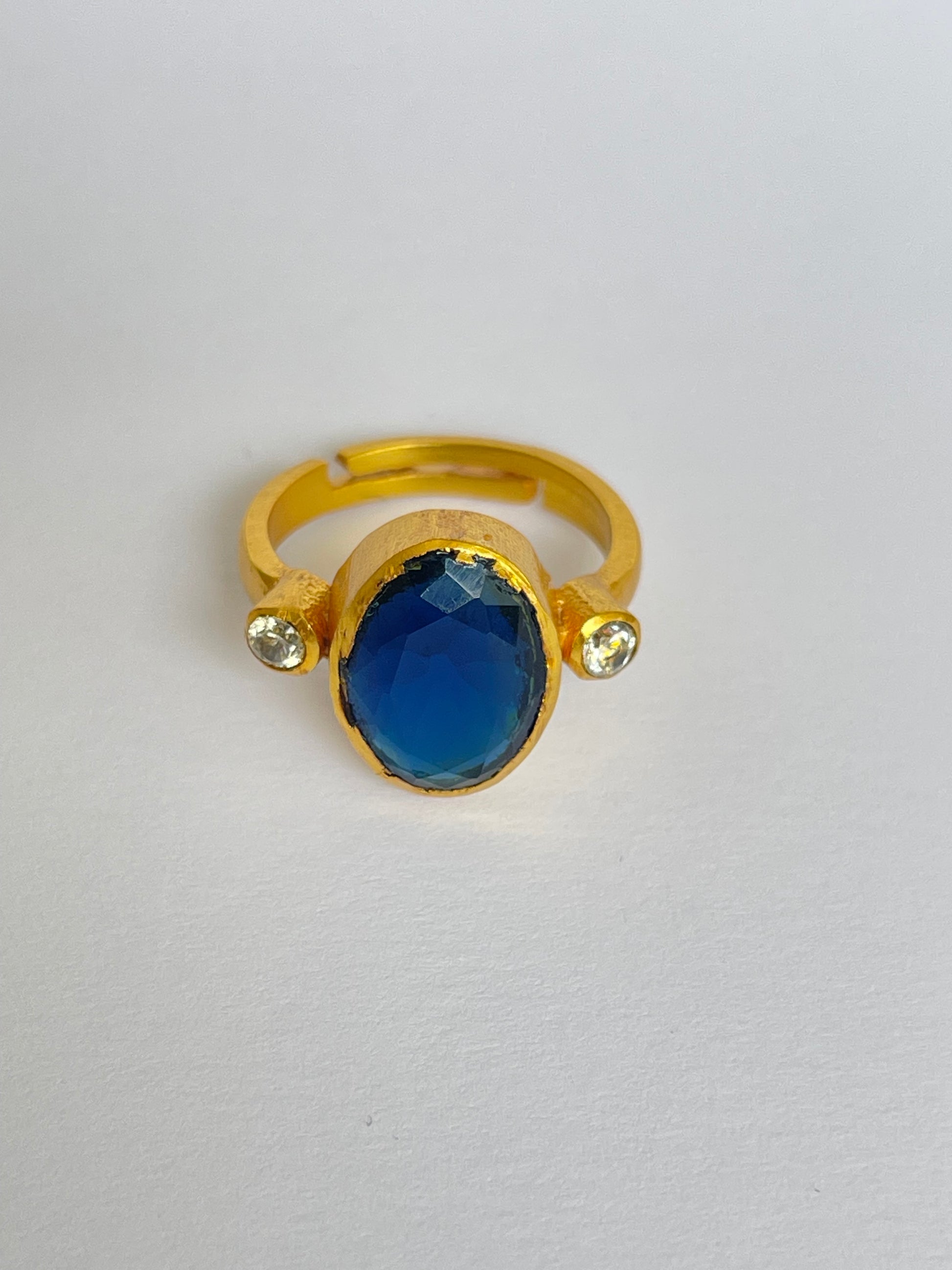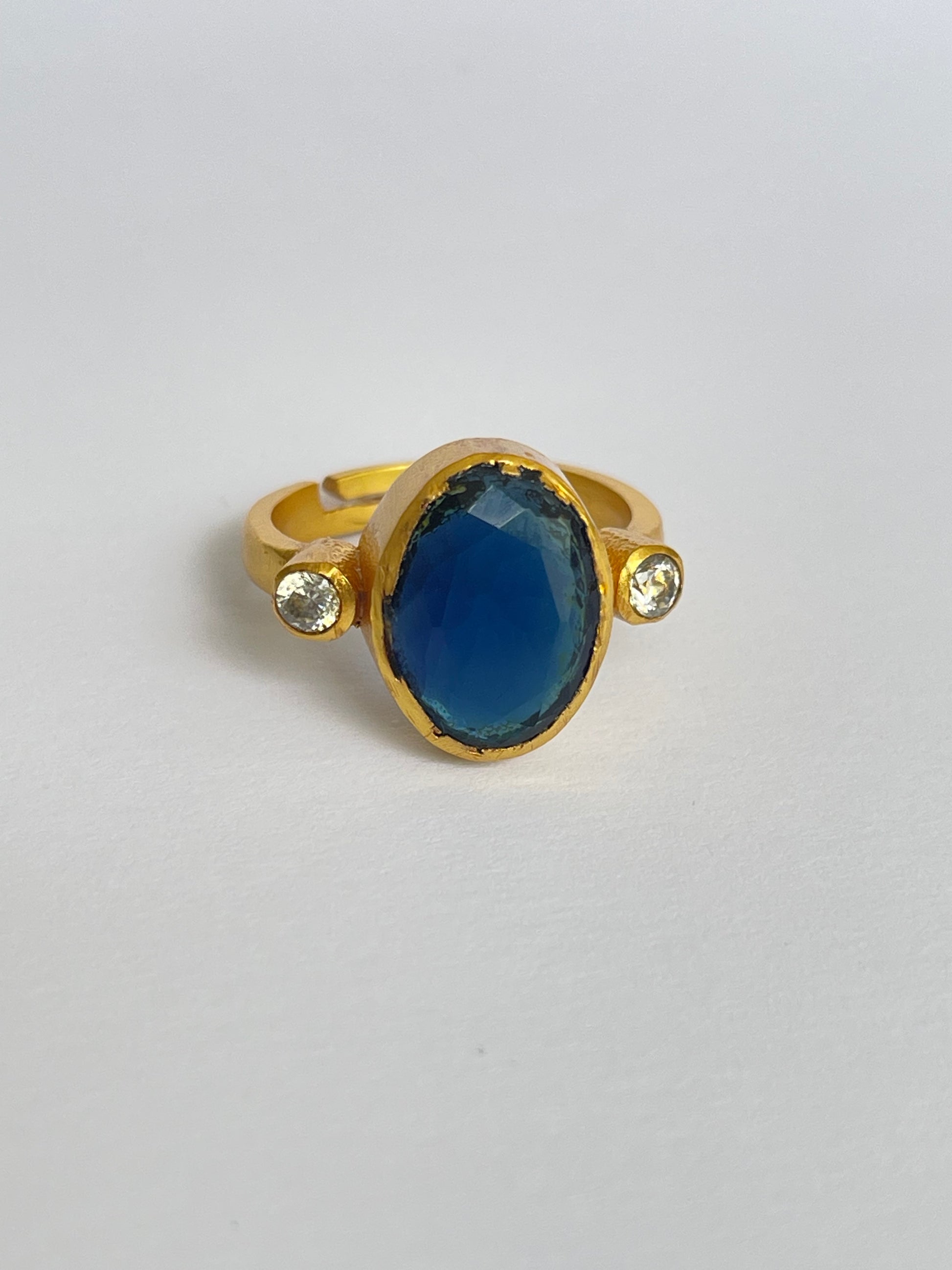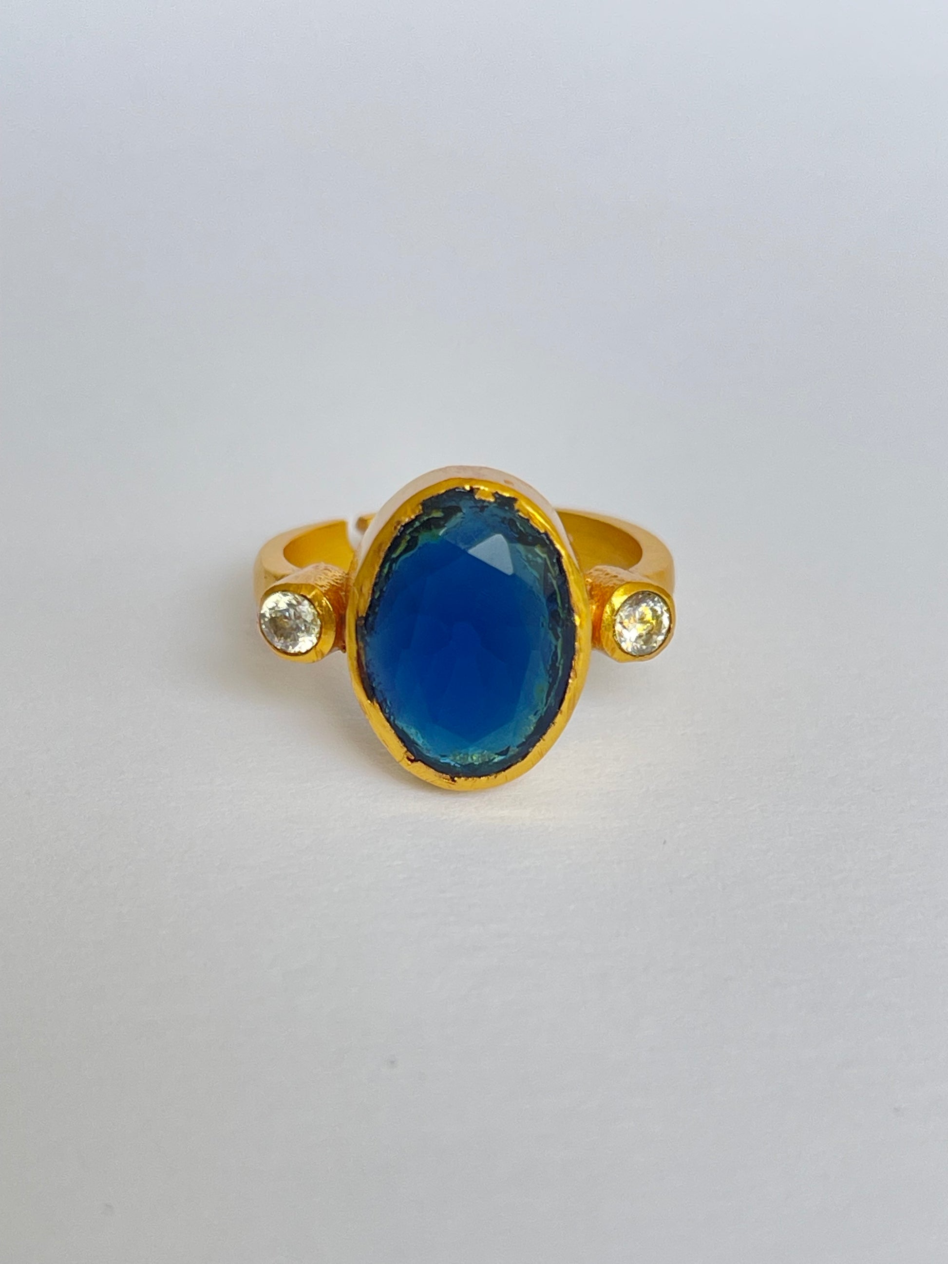 The Miyabi Ring showcases an oval-cut gemstone flanked by two smaller round gems, all set in a warm golden frame. Its symmetrical composition makes it both striking and refined, while the adjustable fit ensures it’s comfortable and versatile for everyday wear.