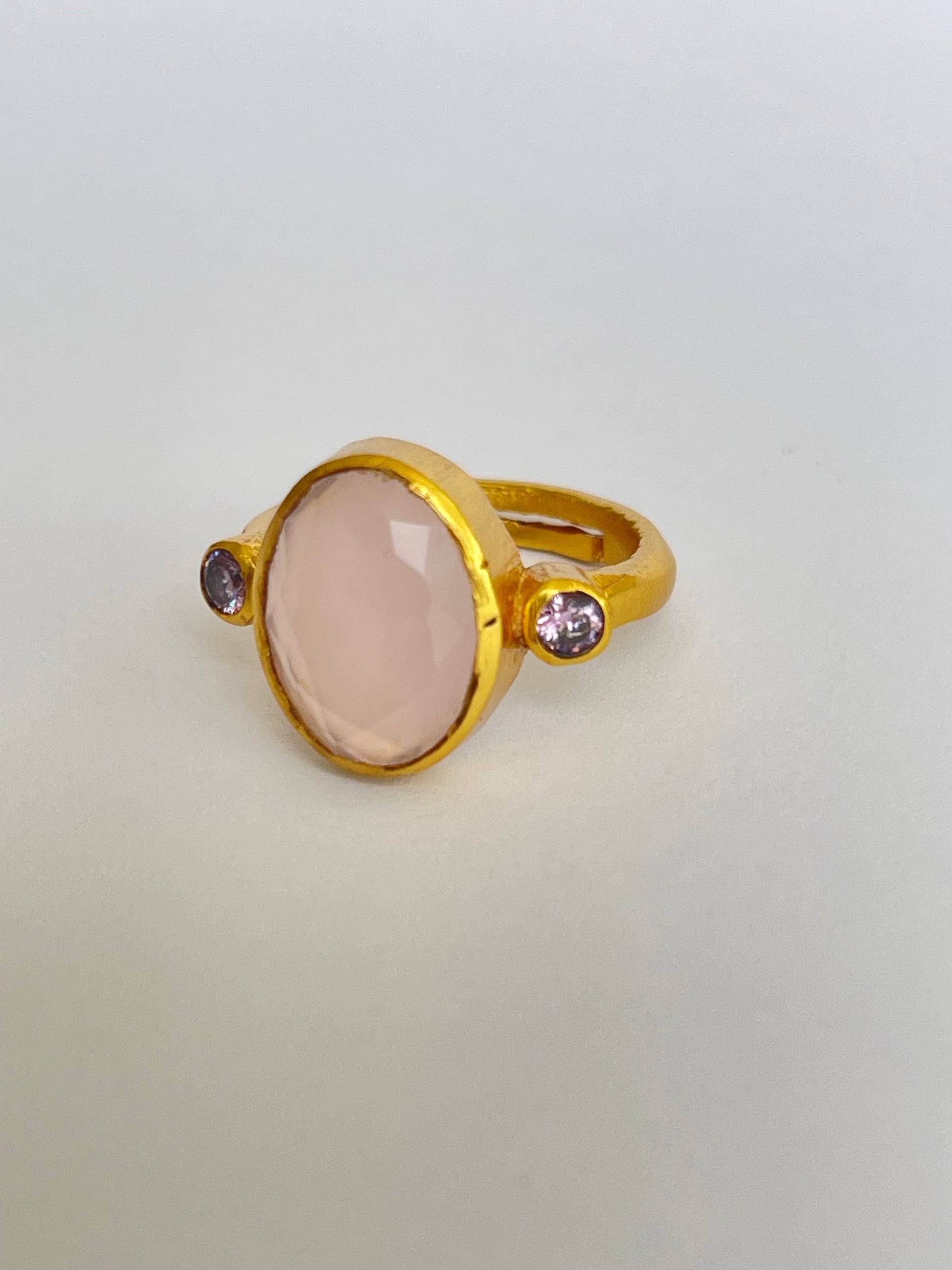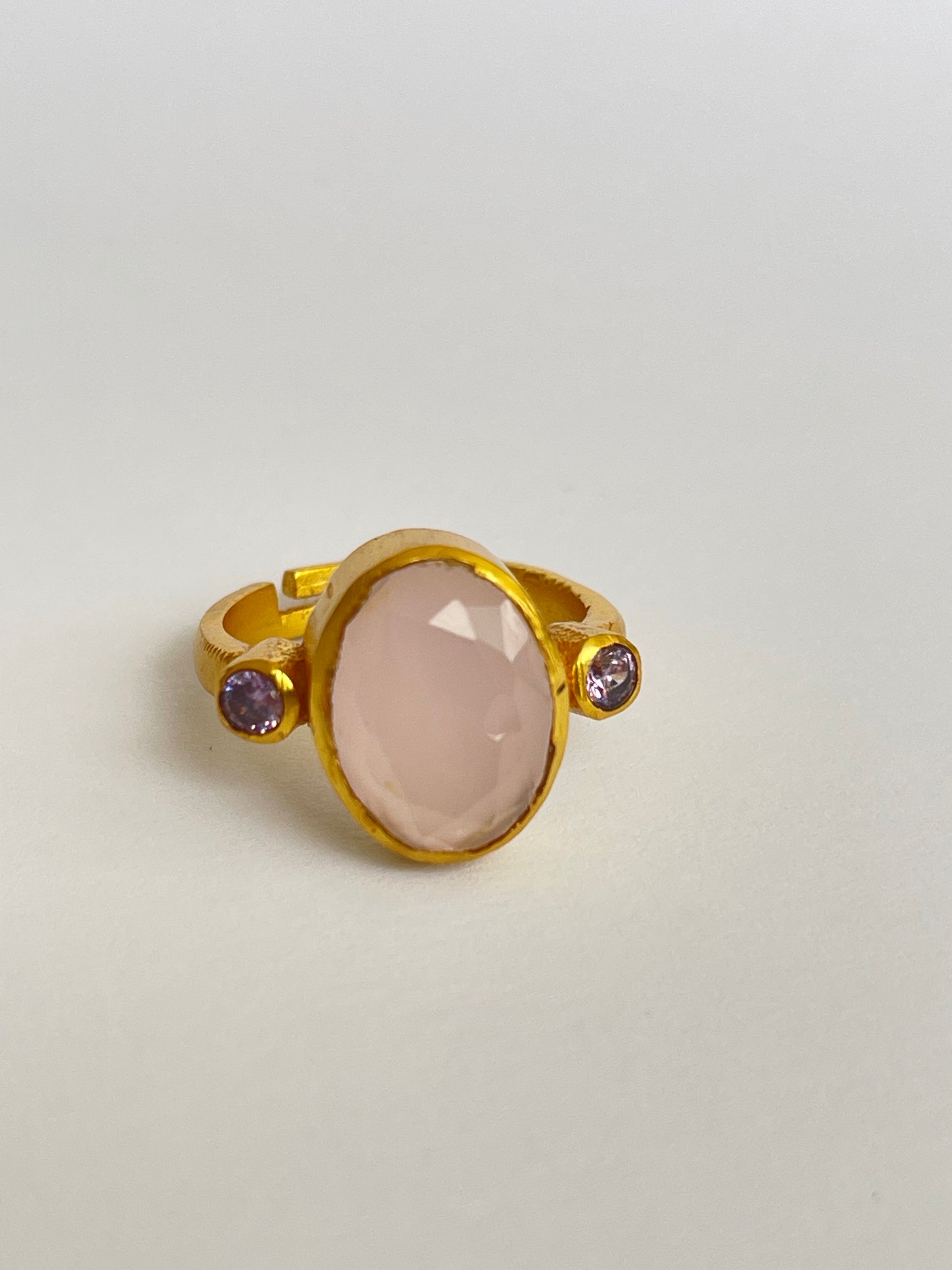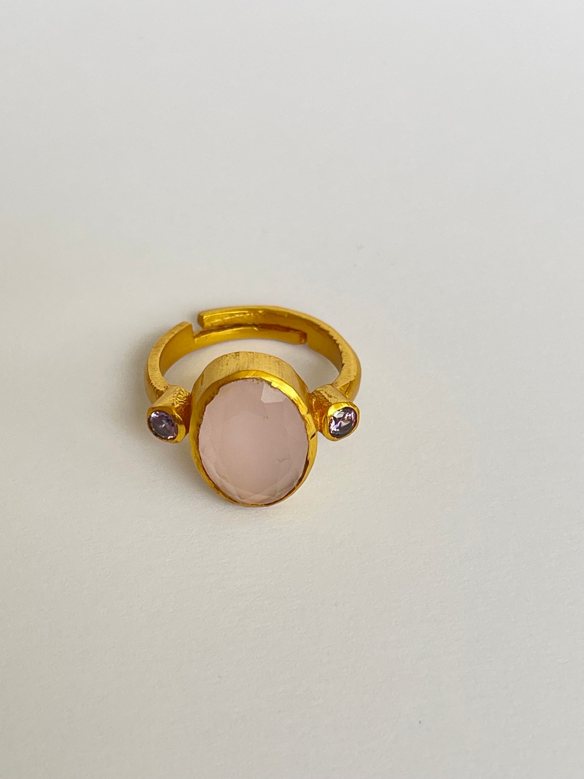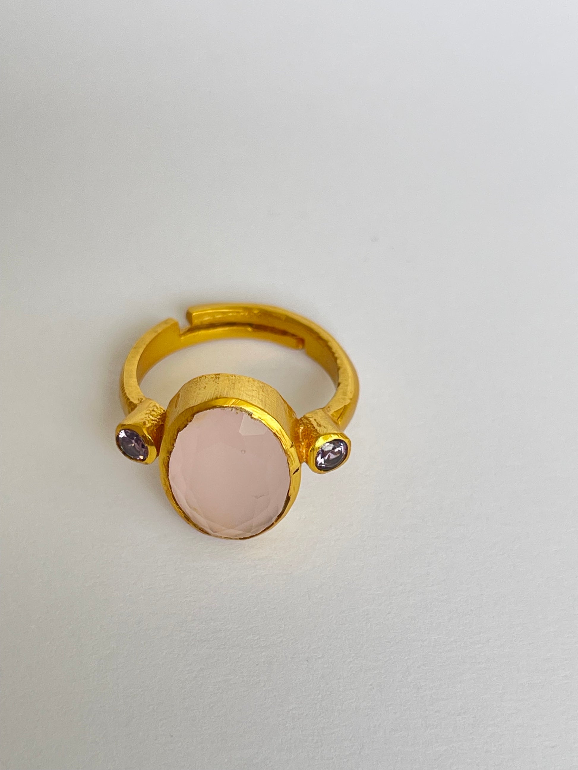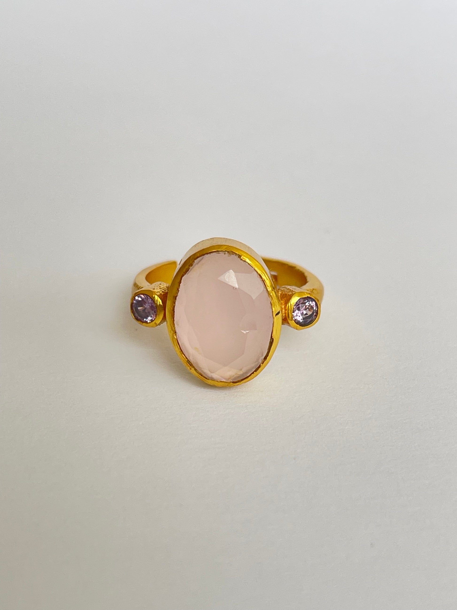 The Miyabi Ring showcases an oval-cut gemstone flanked by two smaller round gems, all set in a warm golden frame. Its symmetrical composition makes it both striking and refined, while the adjustable fit ensures it’s comfortable and versatile for everyday wear.