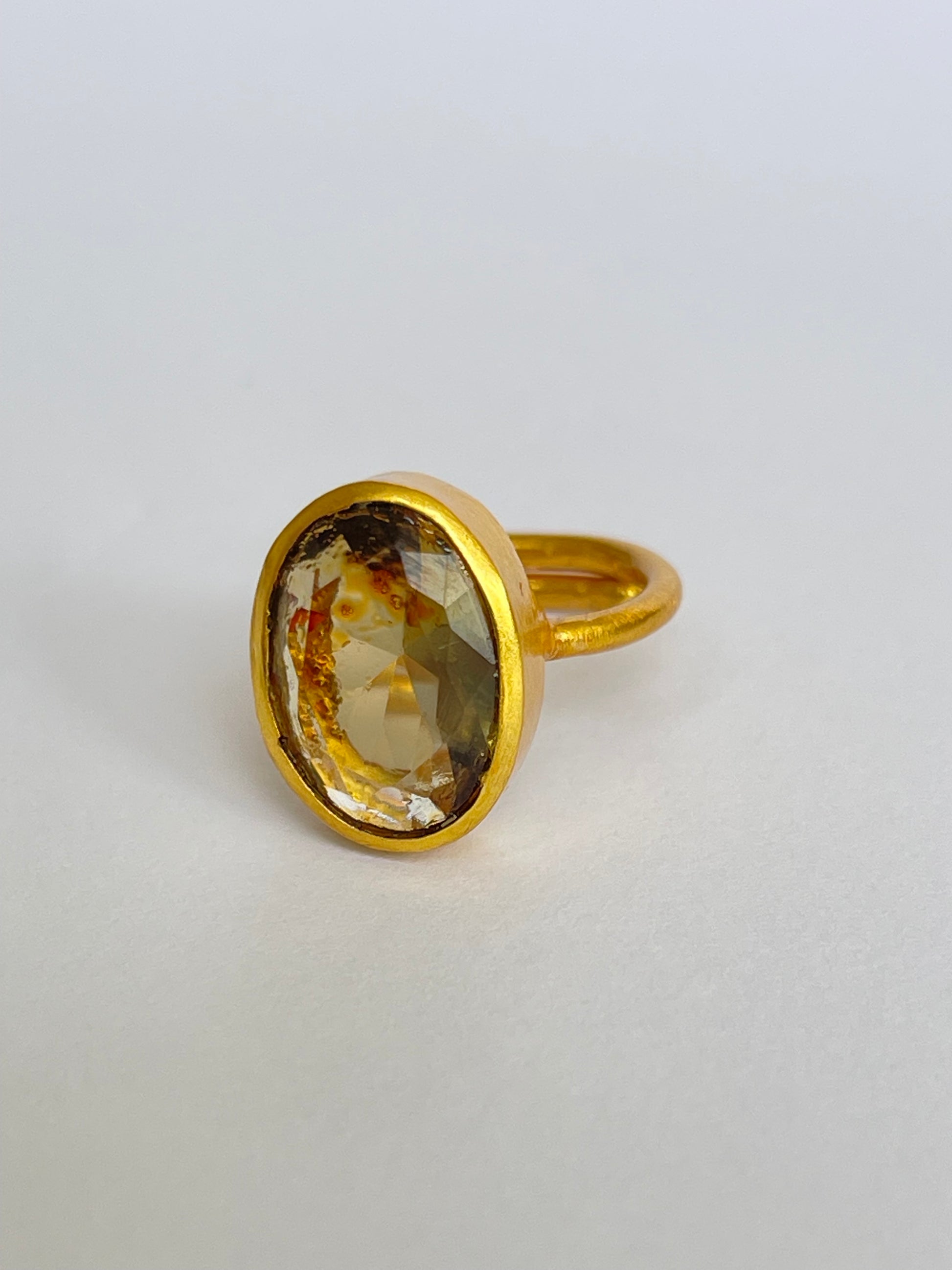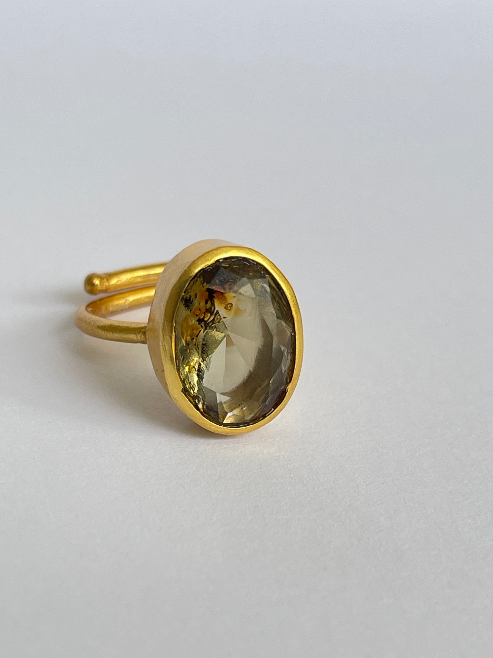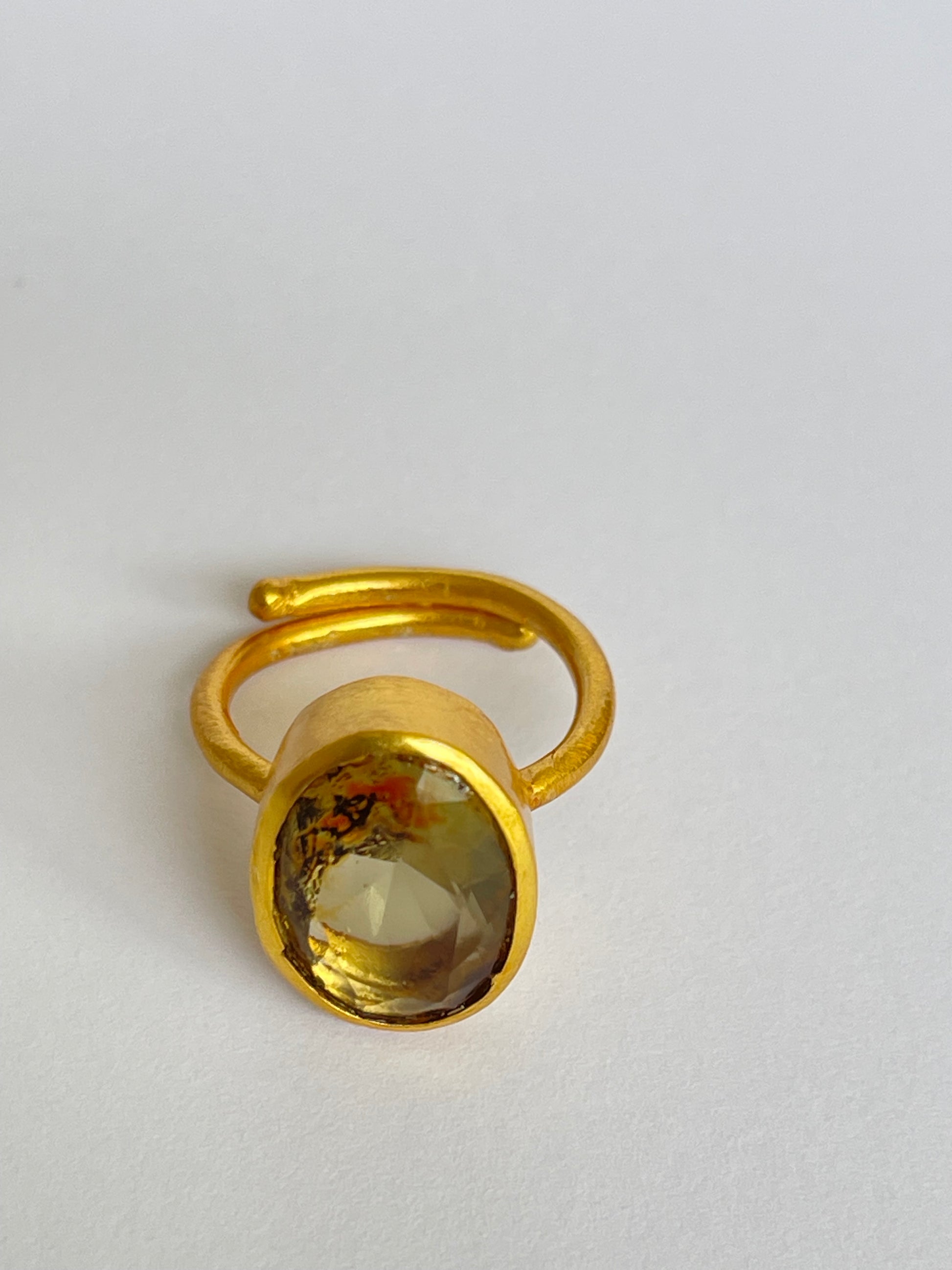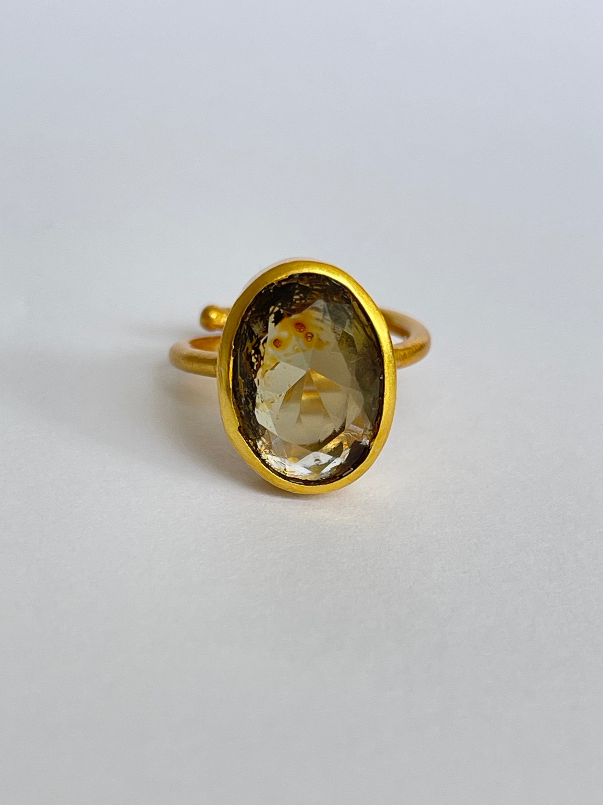 The Tsukikage Ring shimmers with quiet sophistication — a translucent smoky quartz that catches light like moonlight through mist. Set in 18k gold-plated brass, its oval silhouette reflects timeless grace and a subtle, mysterious allure.