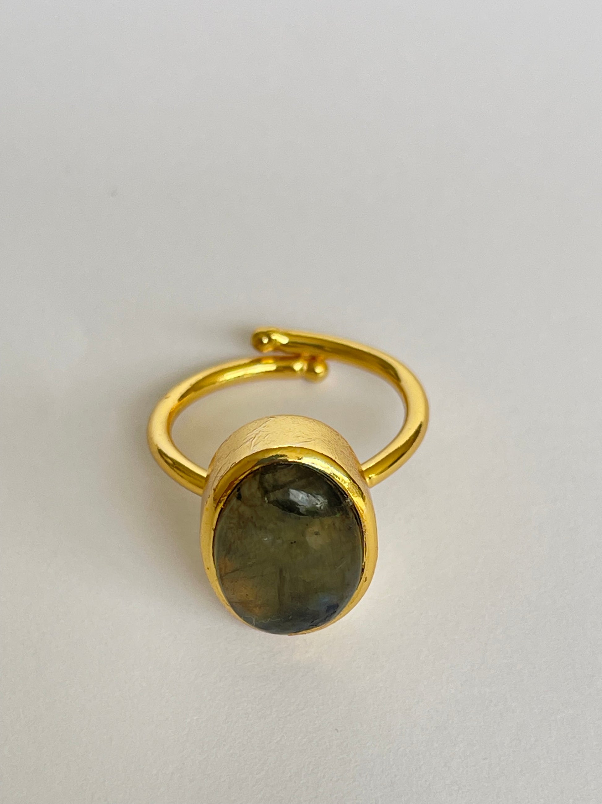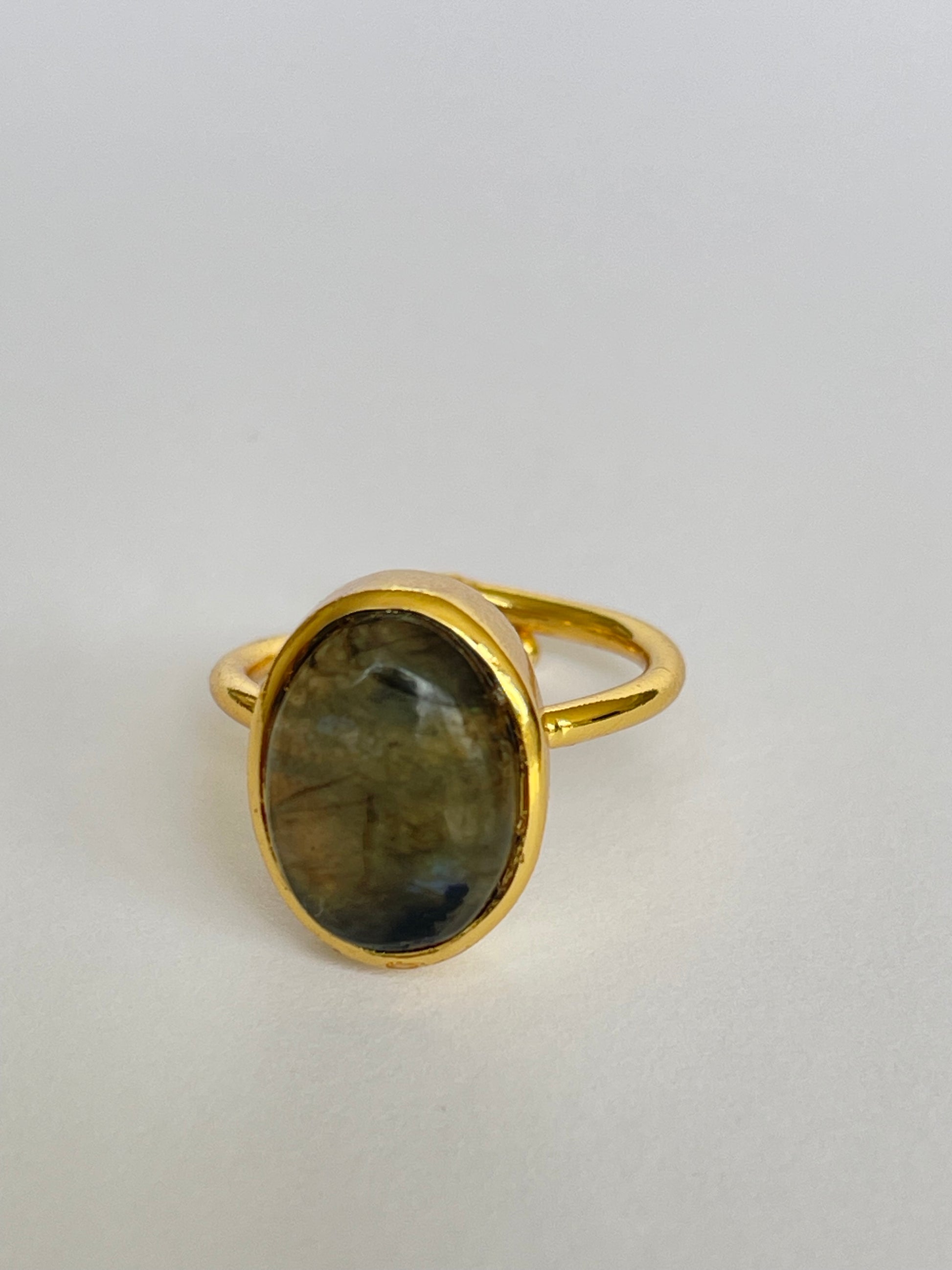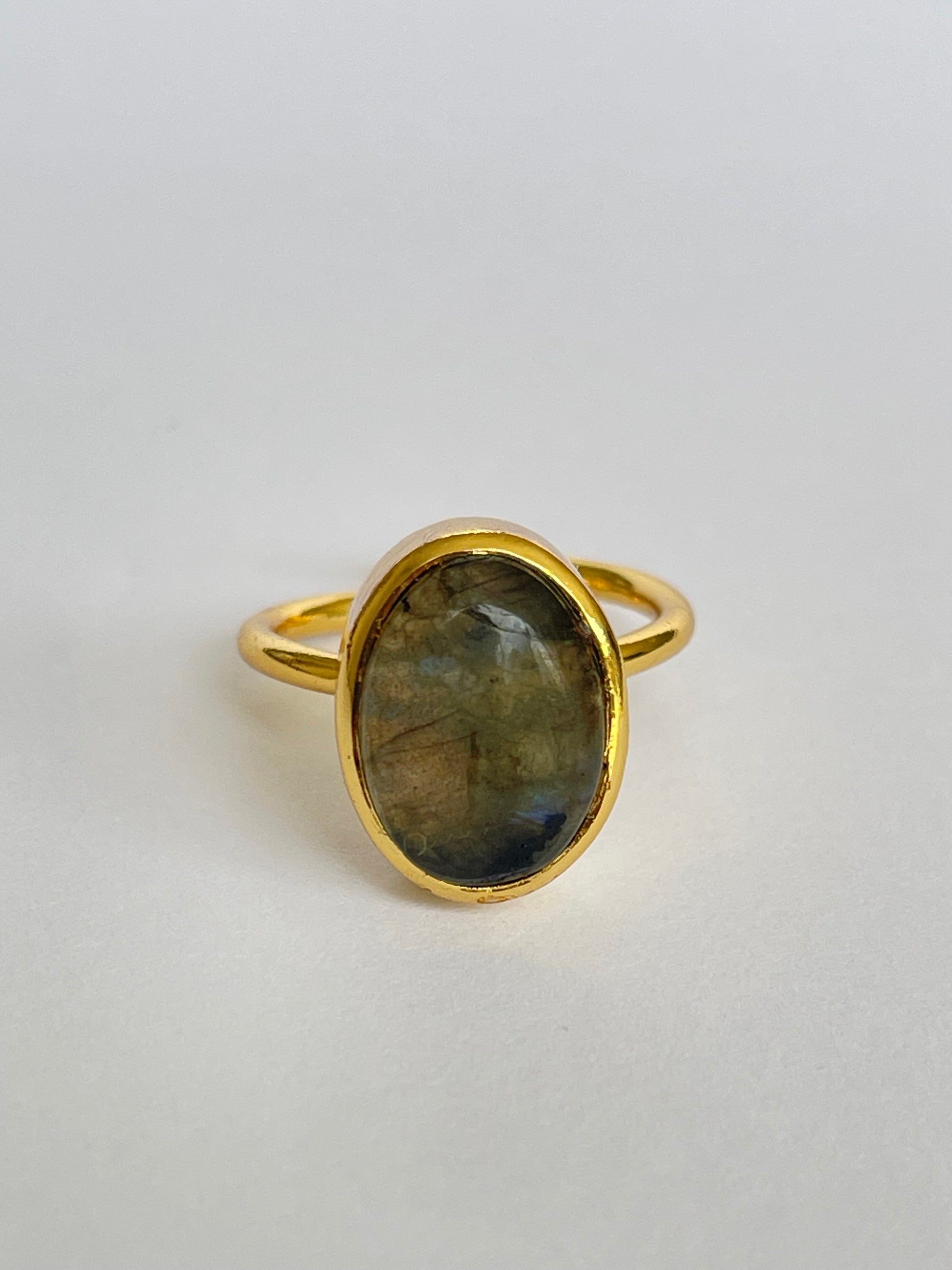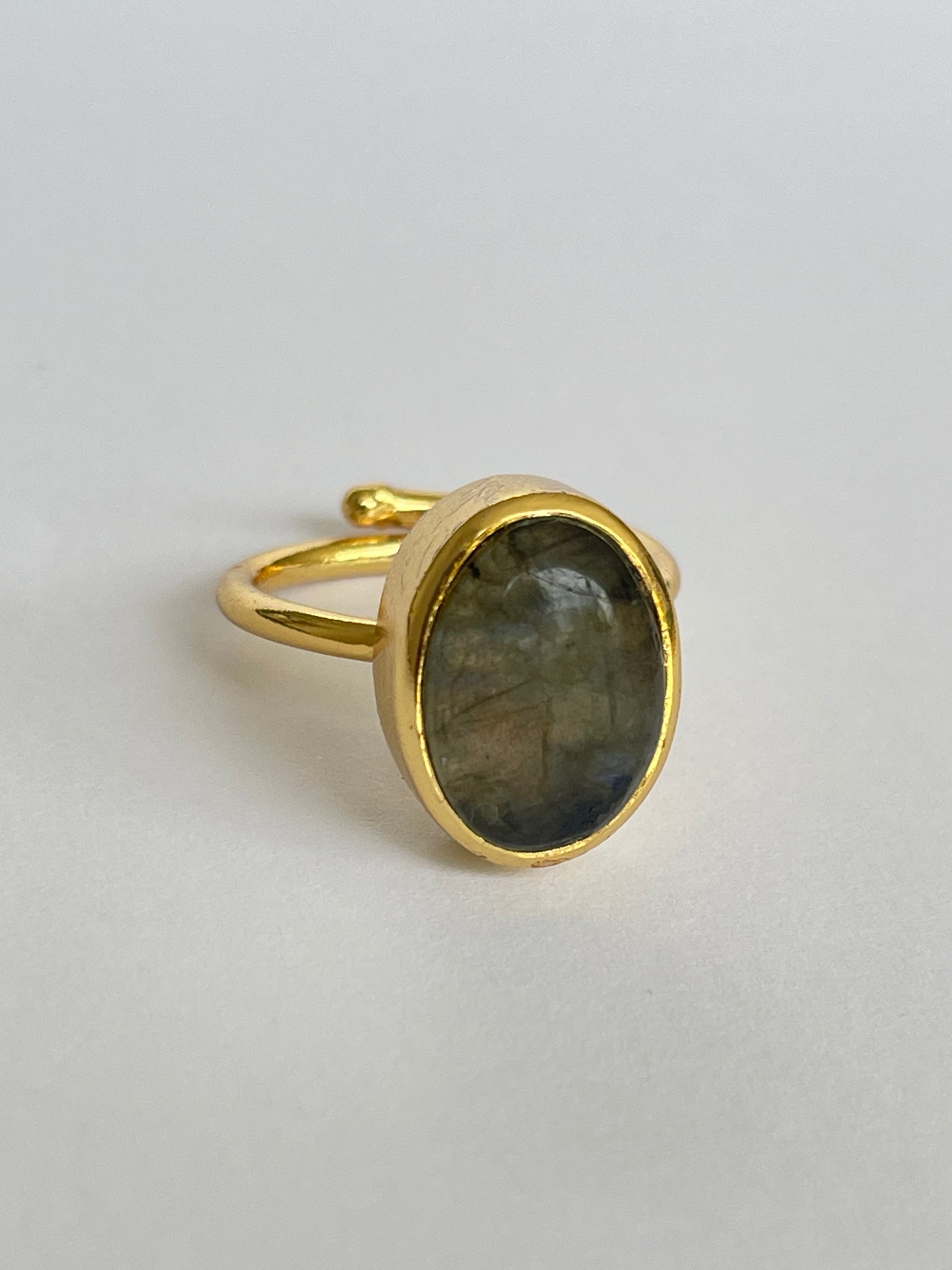The Tsukikage Ring captures the quiet mystery of moonlight — an oval labradorite framed in glowing 18k gold-plated brass. Its shifting hues of grey, blue, and green shimmer like light on water, revealing new beauty with every movement.