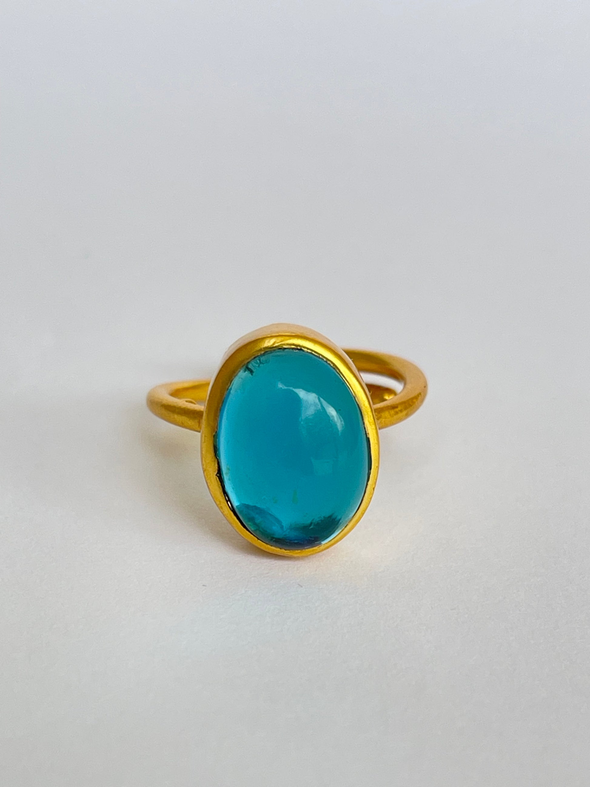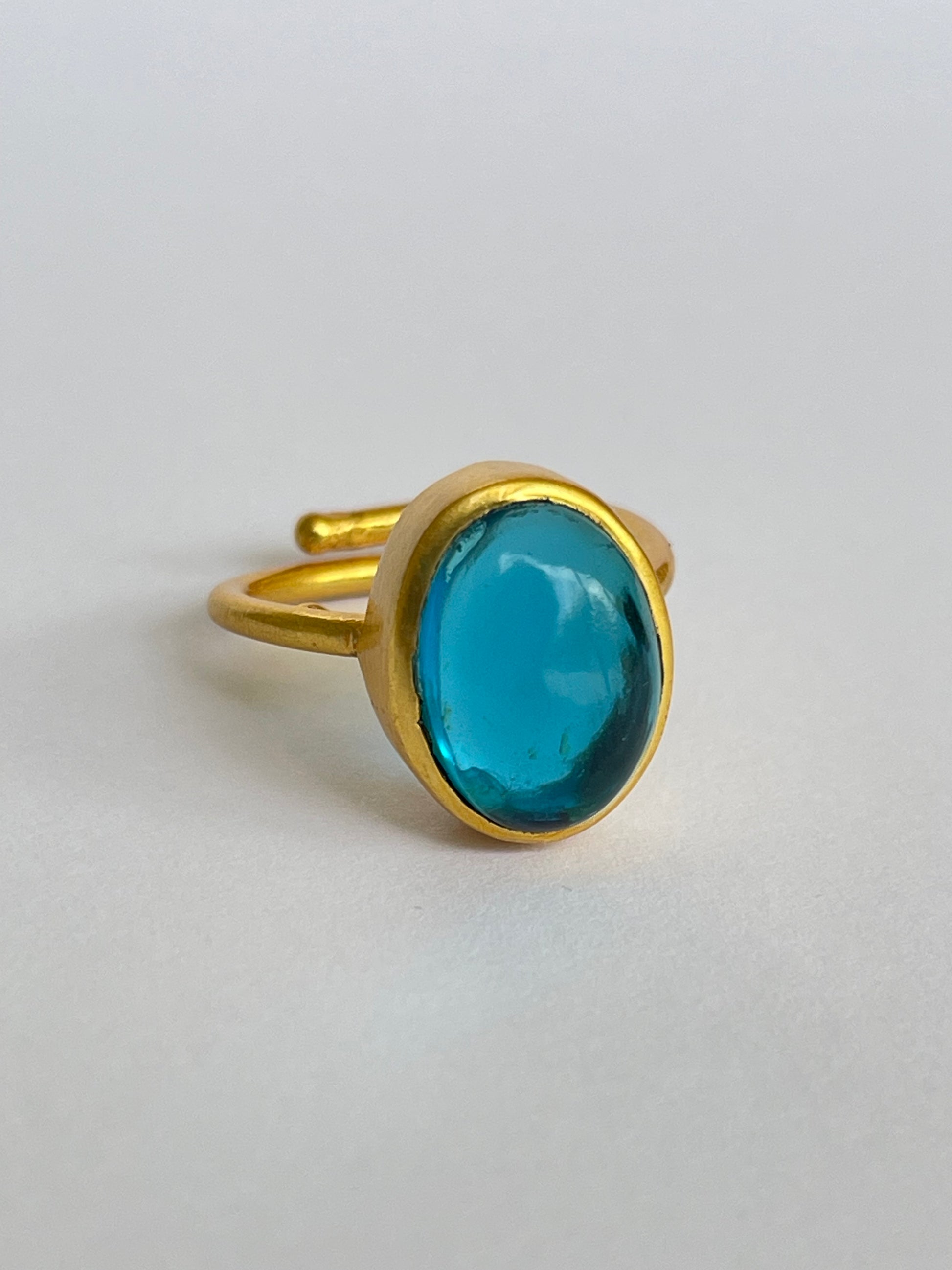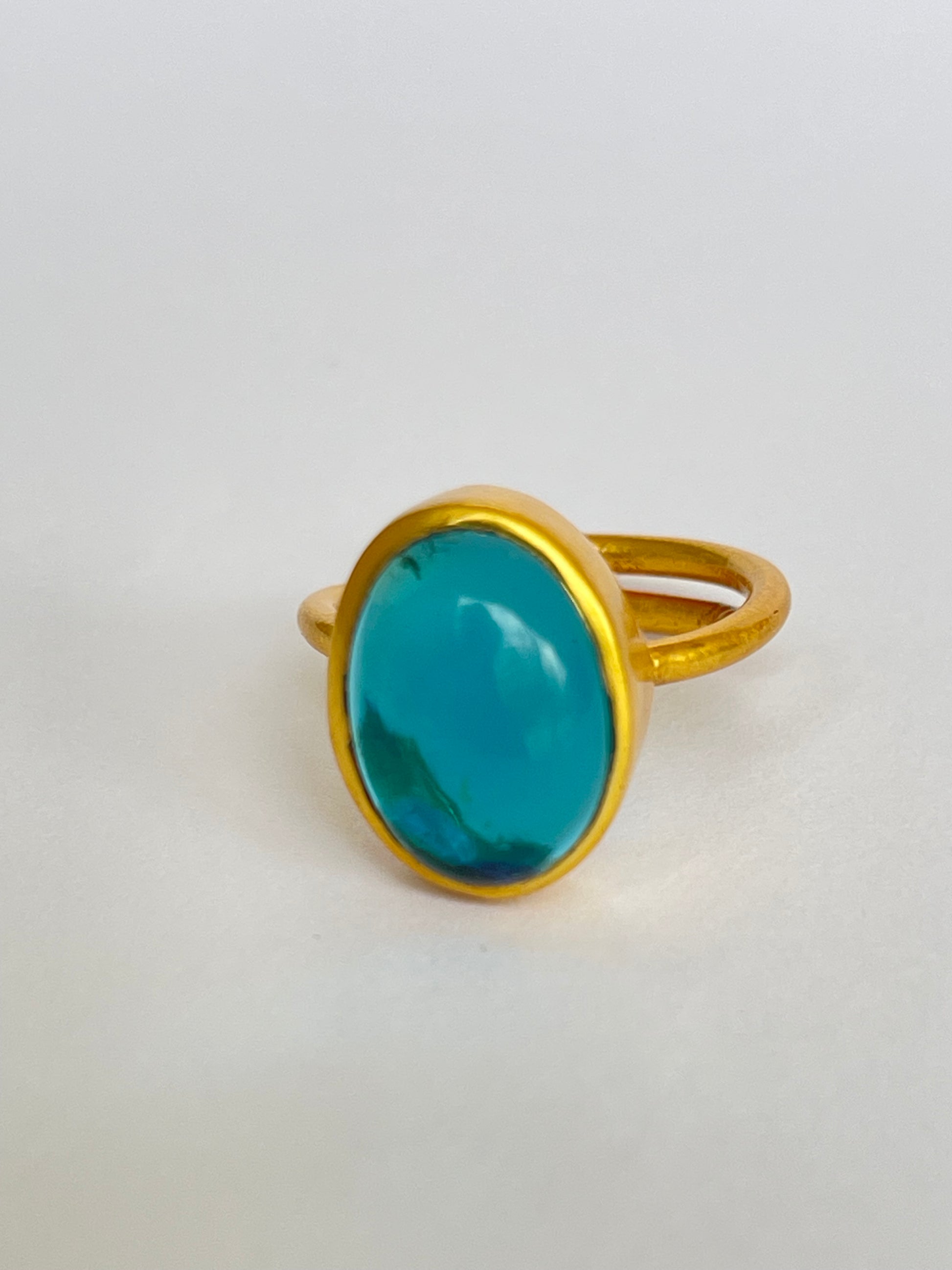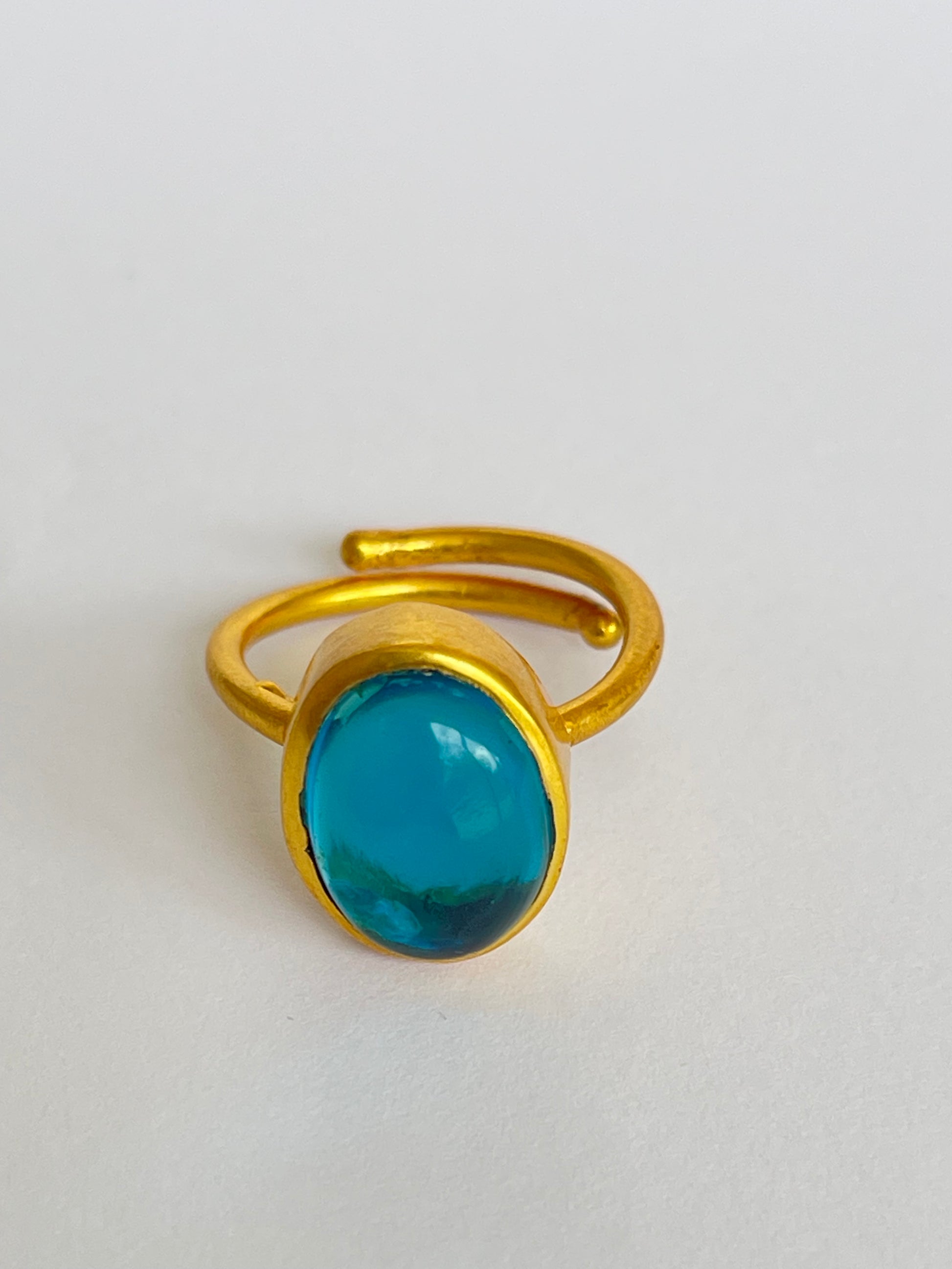 The Uminé Ring radiates the calm rhythm of the sea — a smooth turquoise cabochon embraced by warm 18k gold-plated brass. Its serene hue evokes waves under sunlight, carrying whispers of distant shores and timeless tranquility.